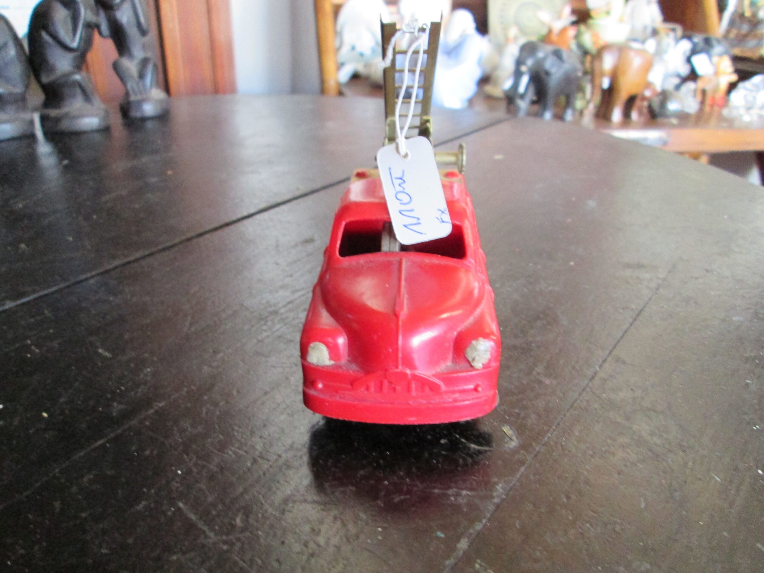 Stara zabawka ,auto straży pożarnej wykonane na Węgrzech w latach 50-tych ubiegłego wieku przez firmę E.Flumlemez . Długość 12 cm , szerokość 4.5 cm , wysokość 6 cm. Wykonane częściowo z metalu i częściowo z plastiku.