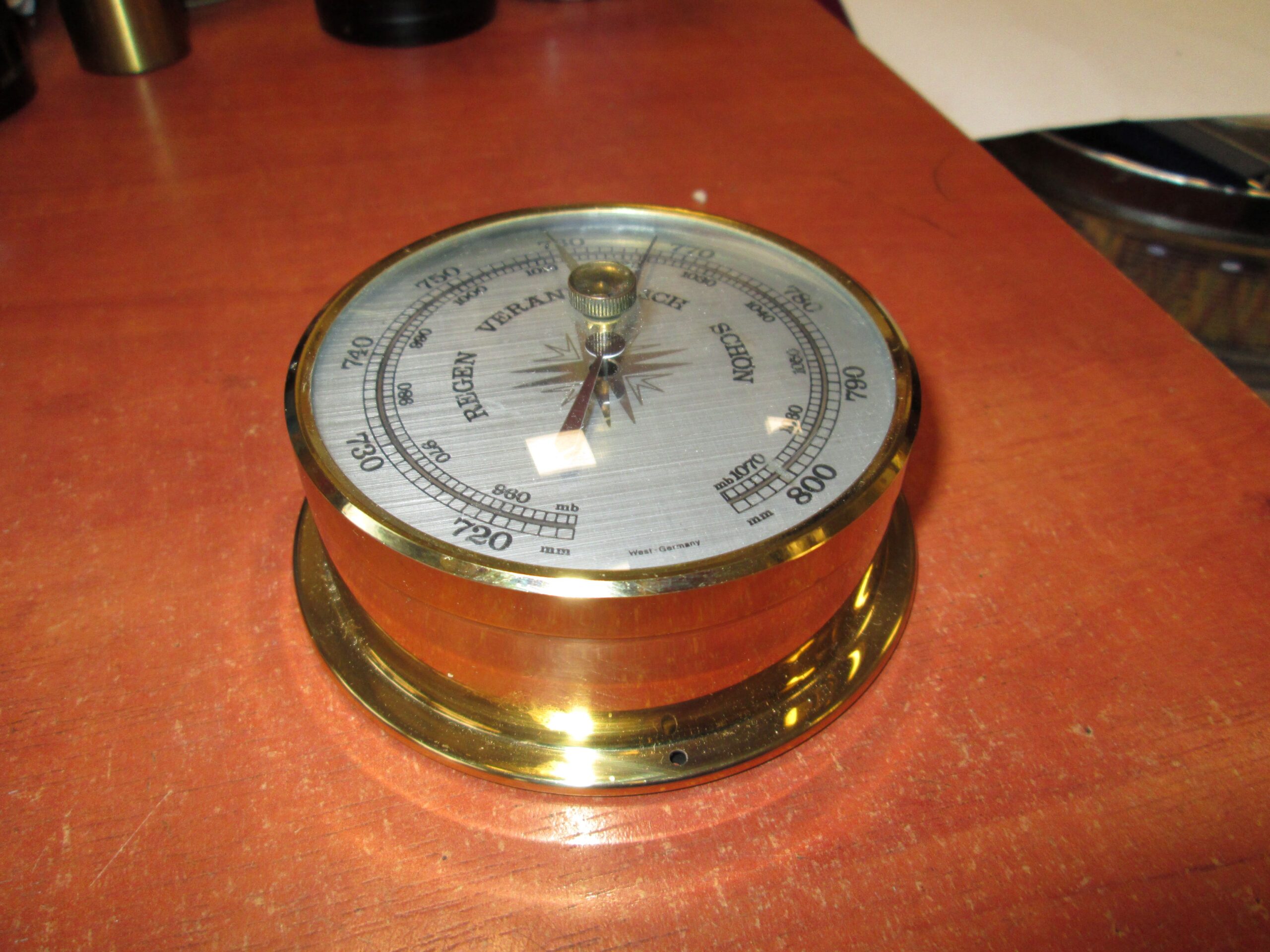 Niemiecki barometr z lat 80-tych ubiegłego wieku. Obudowa z mosiądzu polerowanego. W pełni sprawny. Średnica 9.5 cm , wysokość 4 cm. Stan bardzo dobry.