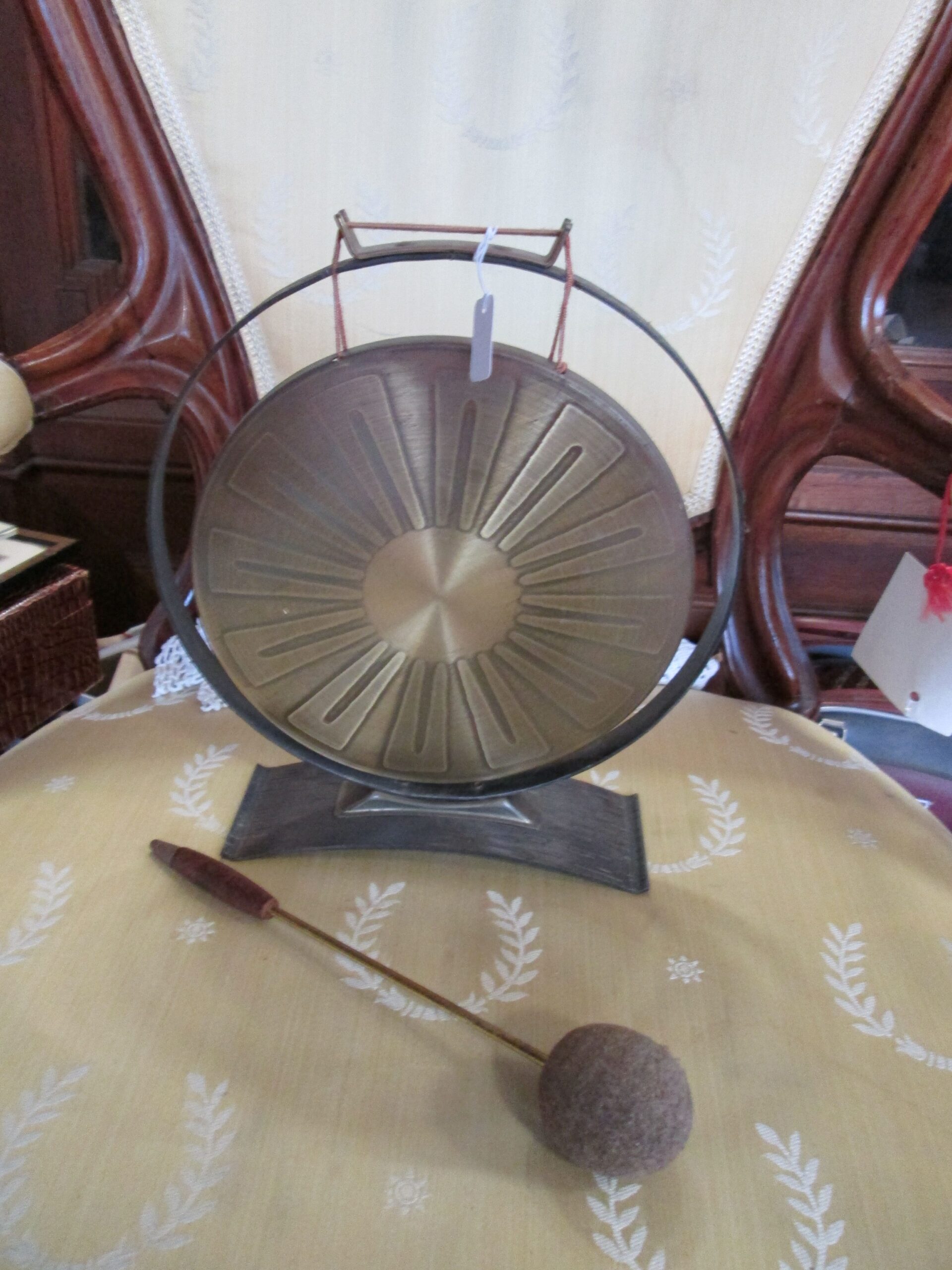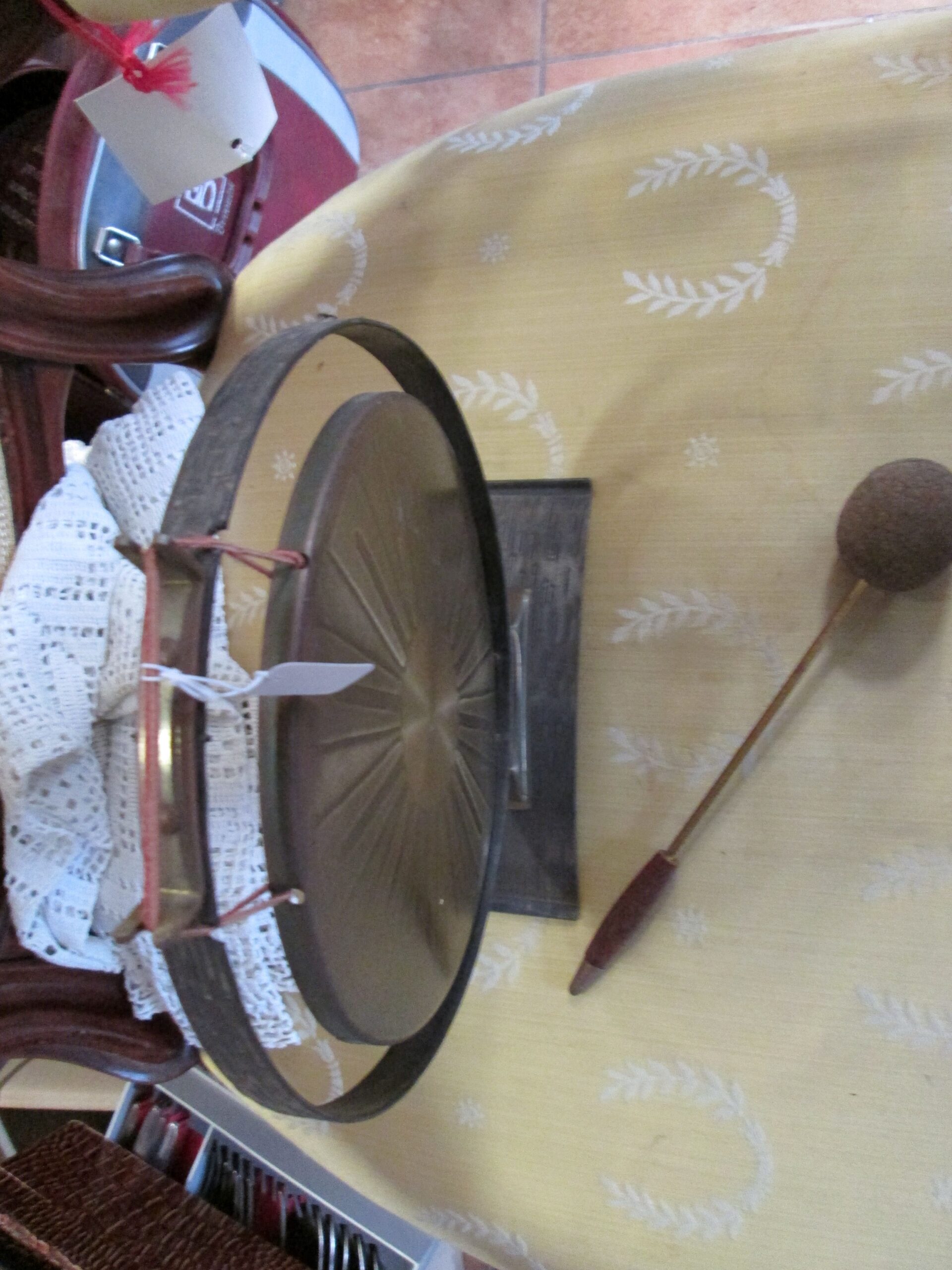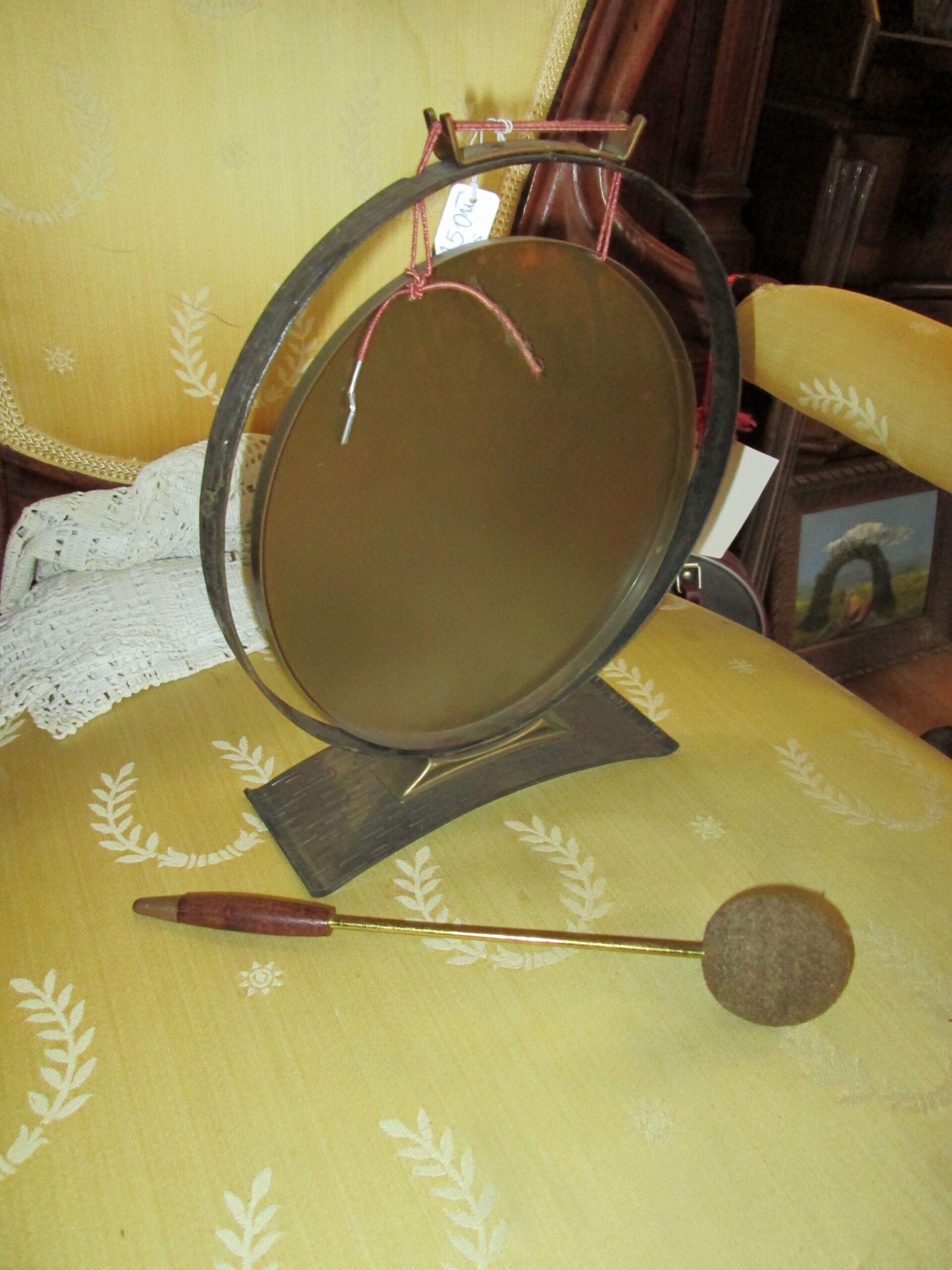 Chiński gong wykonany z blachy mosiężnej. Podstawa mosiężna zdobiona . W komplecie pałka z końcówką z filcu i drewnianą rączką. Wysokość 25 cm , szerokość 21 cm , długość pałeczki 22 cm. Po uderzeniu piękny głęboki dźwięk. Eleganckie uzupełnienie wystroju zgodnego z Feng Shui.