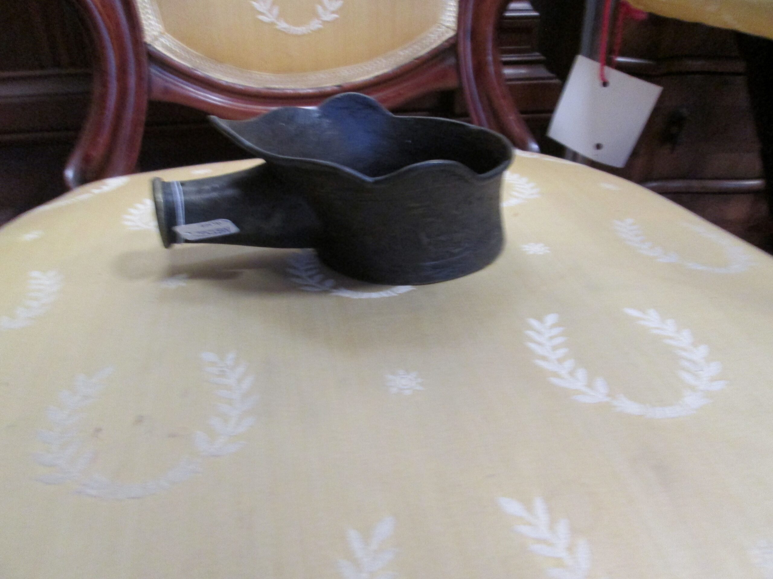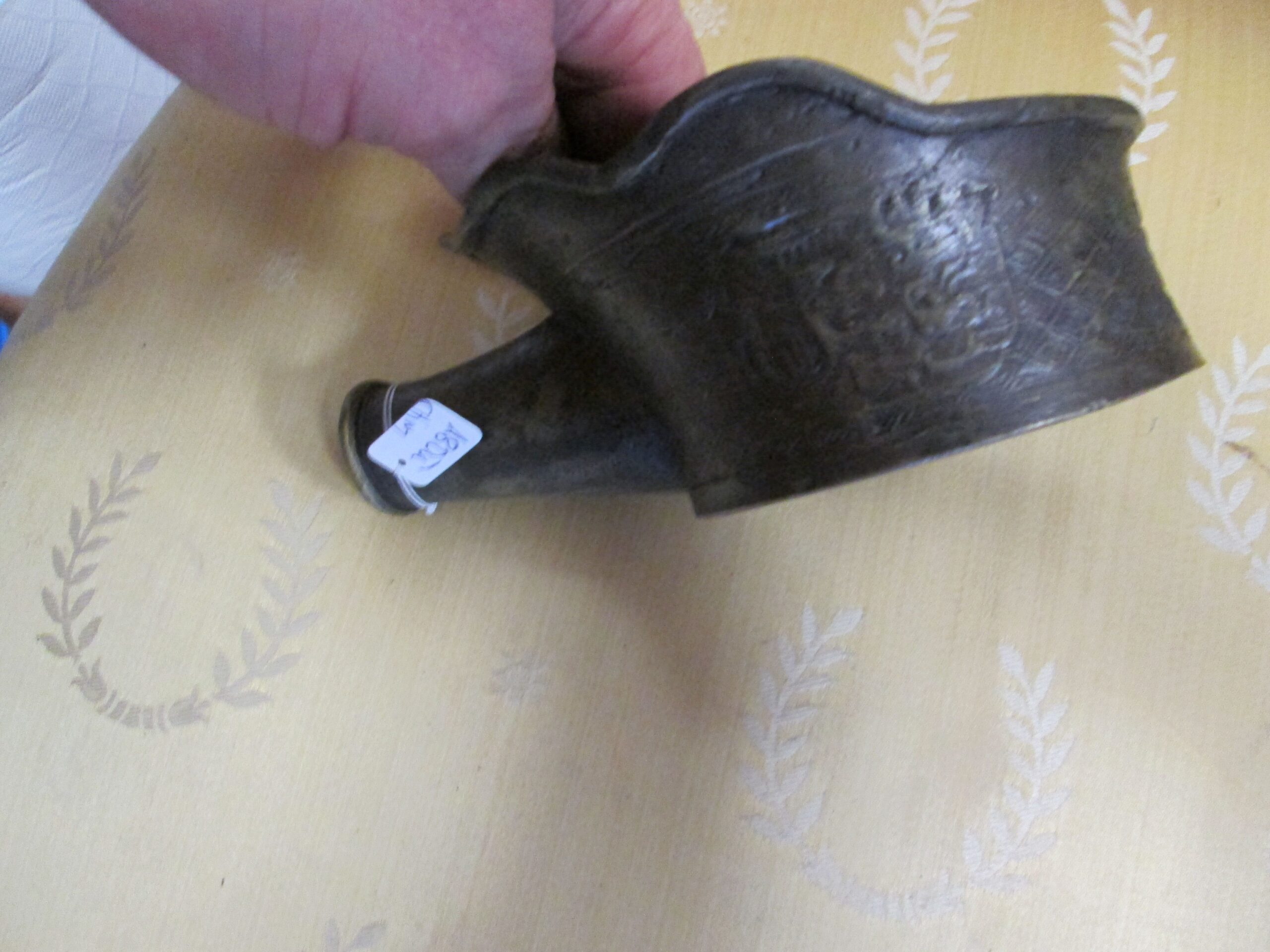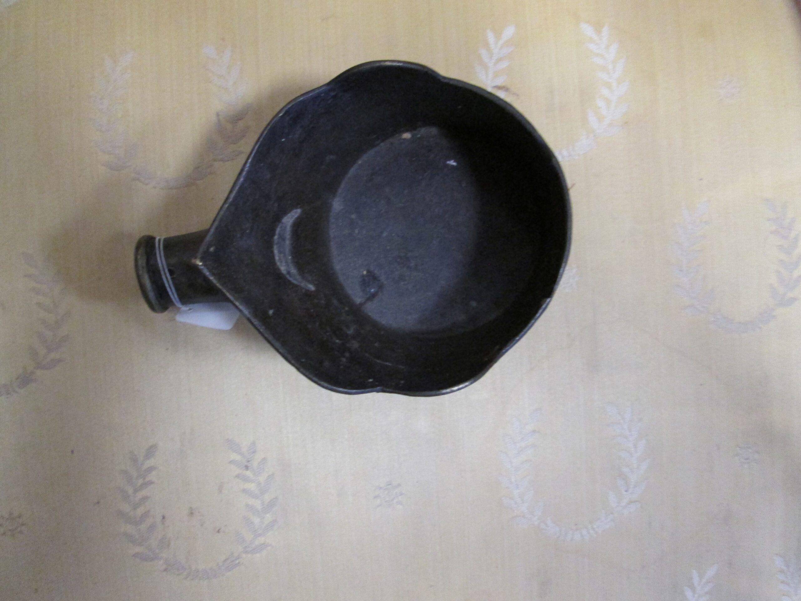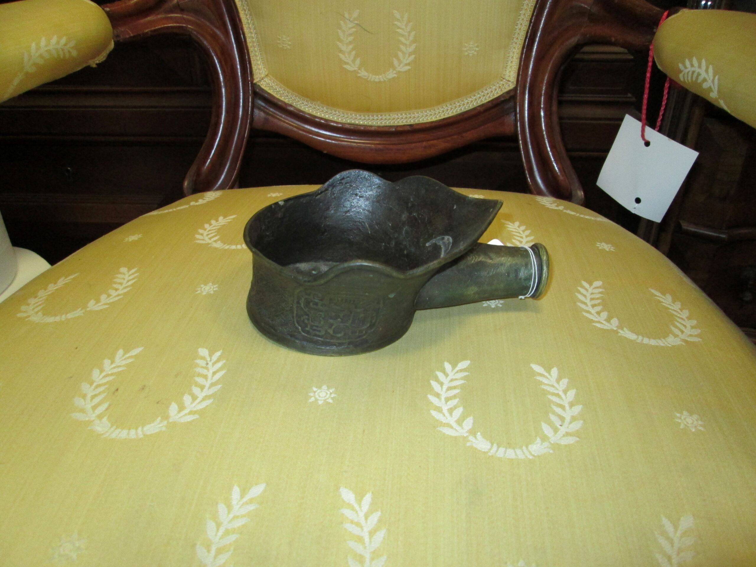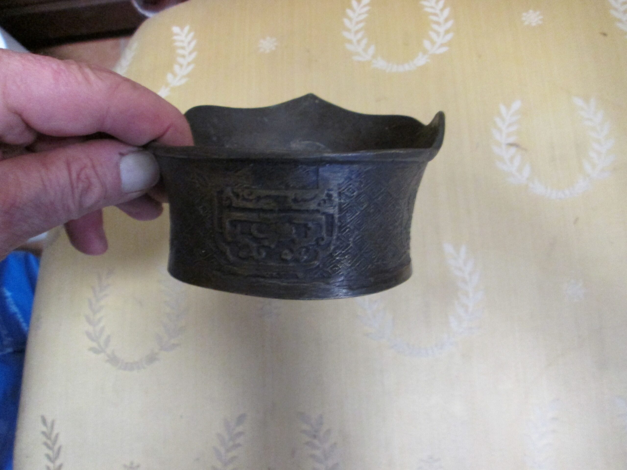 Ciekawostka na naszym rynku antykwarycznym. Czarka do nalewania wody , wykonana z brązu w Chinach w XIX wieku. O czym świadczą reliefy na naczyniu. Średnica ok 11 cm , wysokość 5 cm , możliwość przedłużenia uchwytu montując drewnianą rączkę . Stan bardzo dobry.