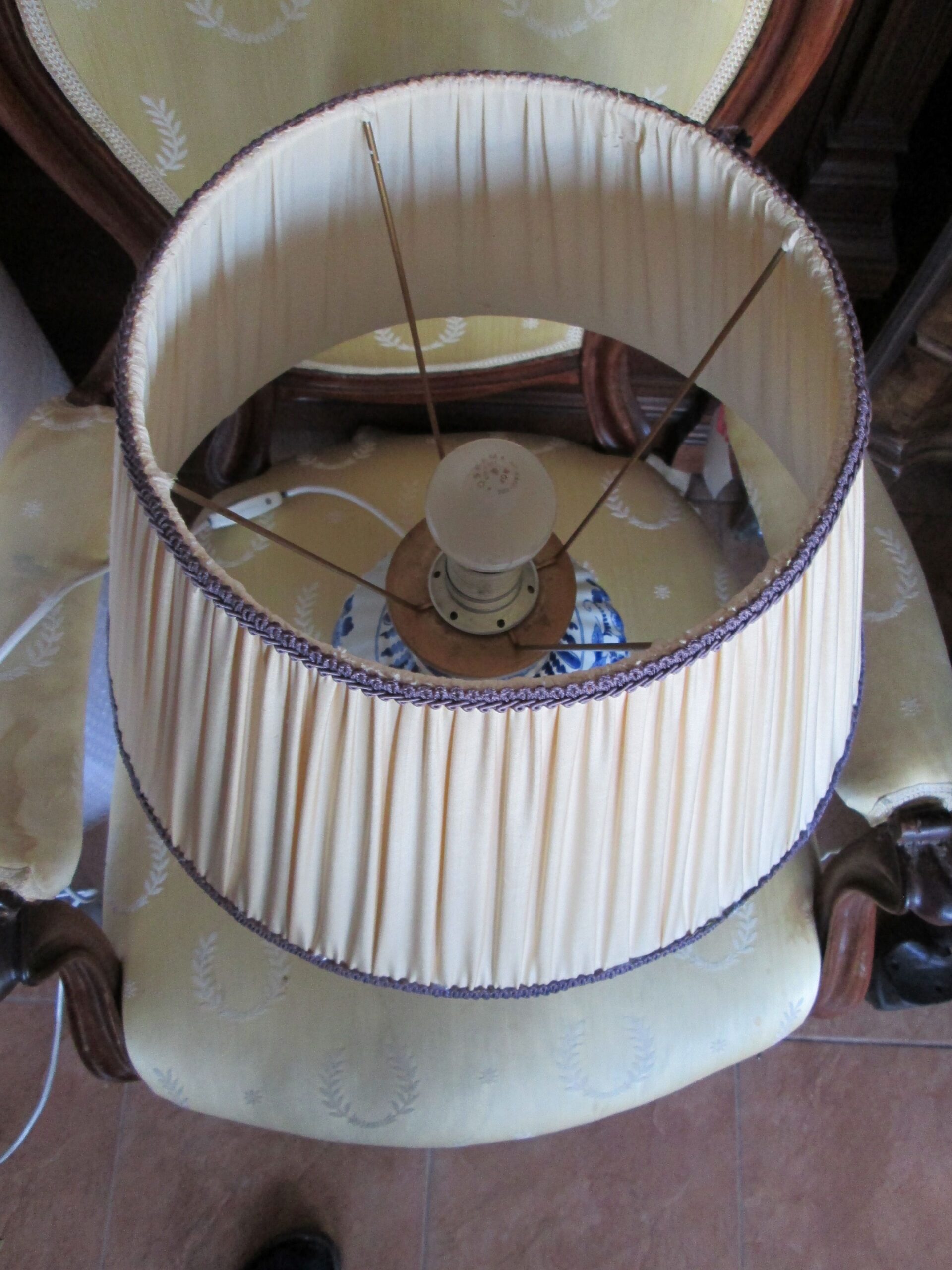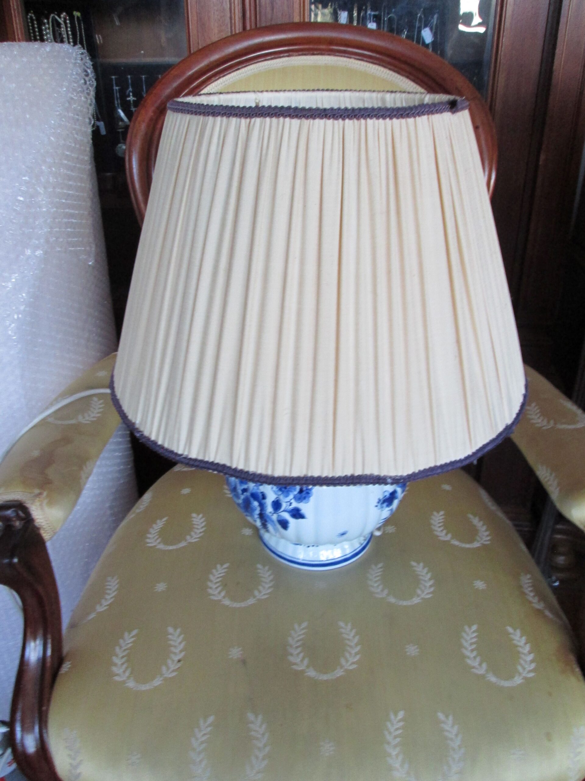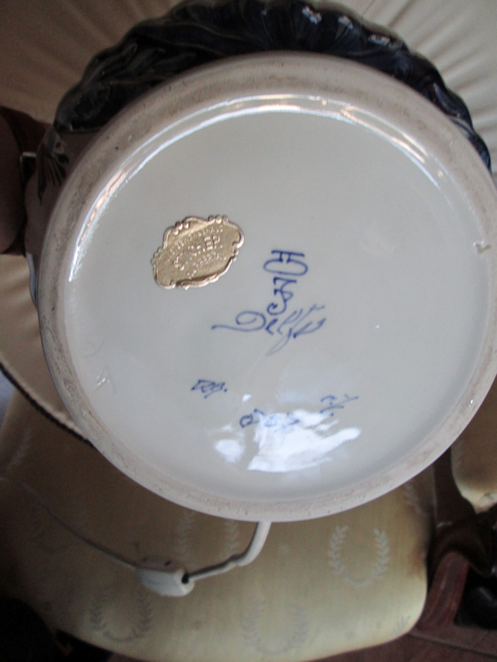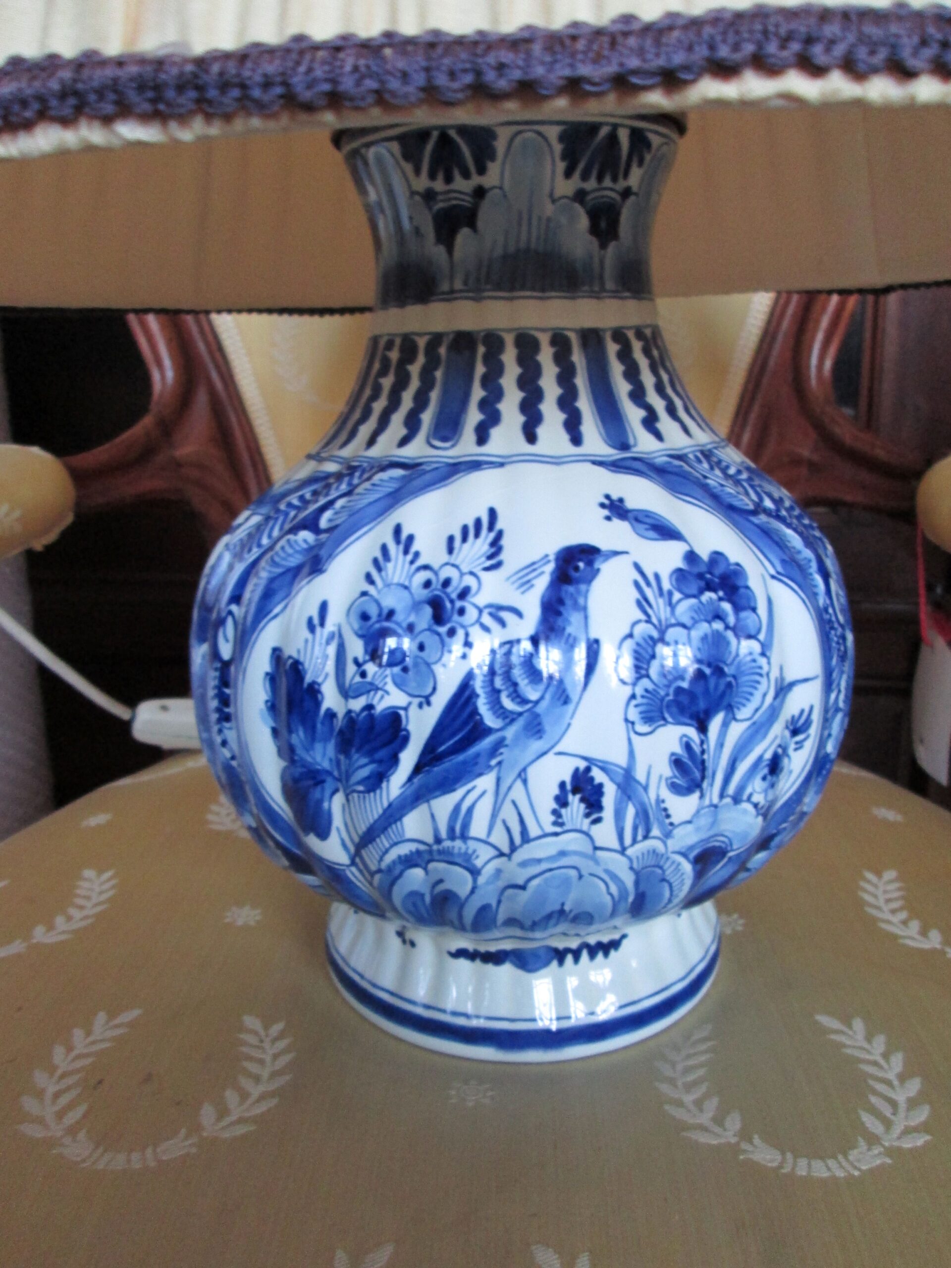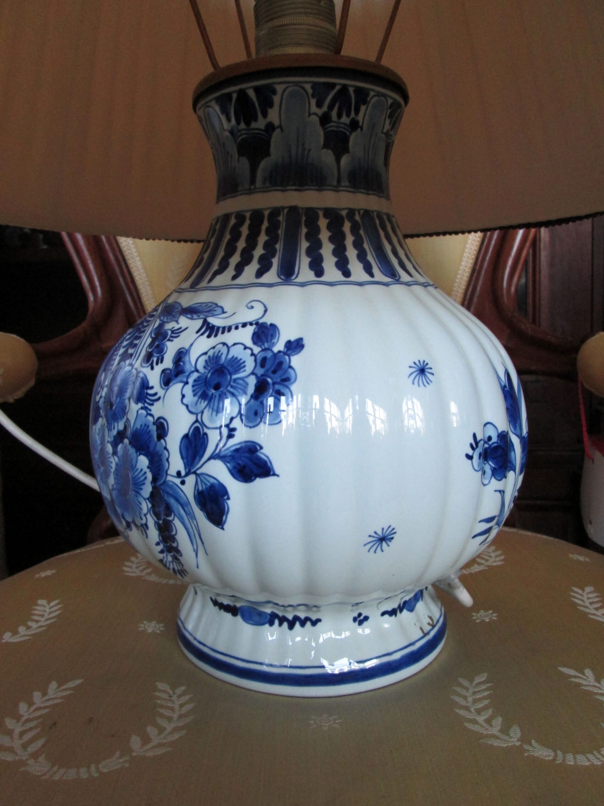 Piękna duża lampa stołowa. Podstawa wykonana z porcelany ręcznie malowanej w holenderskiej firmie Delft.Średnica nogi 20 cm , średnica klosza 45 cm , wysokość całej lampy 50 cm. Sprawna działająca.