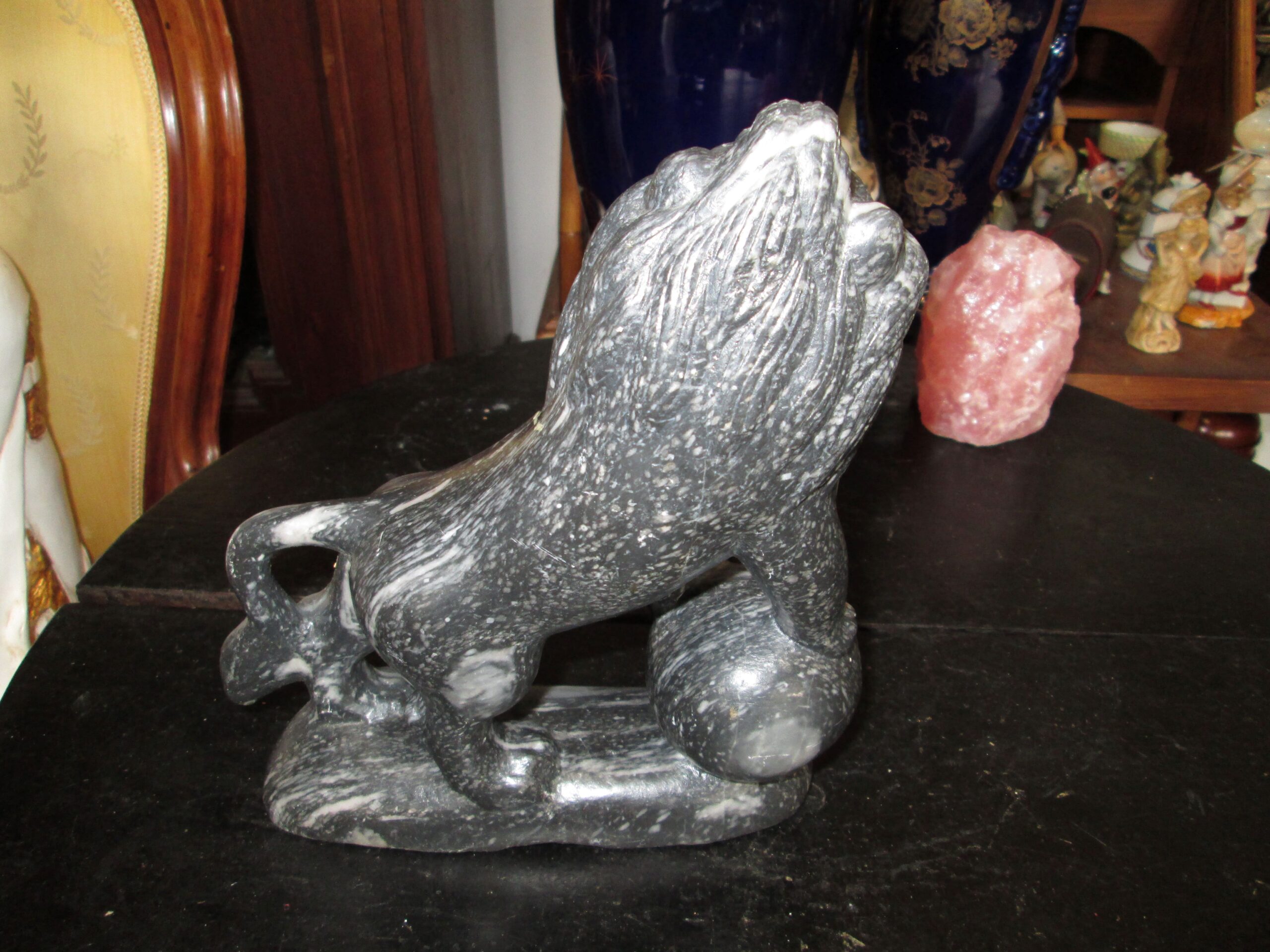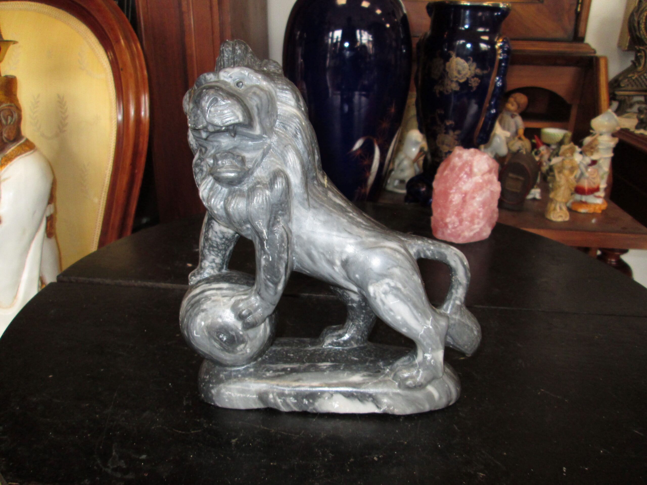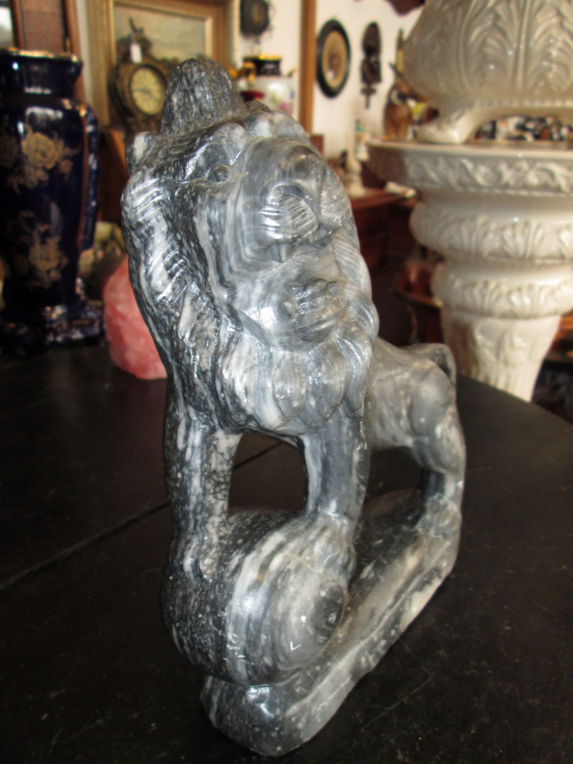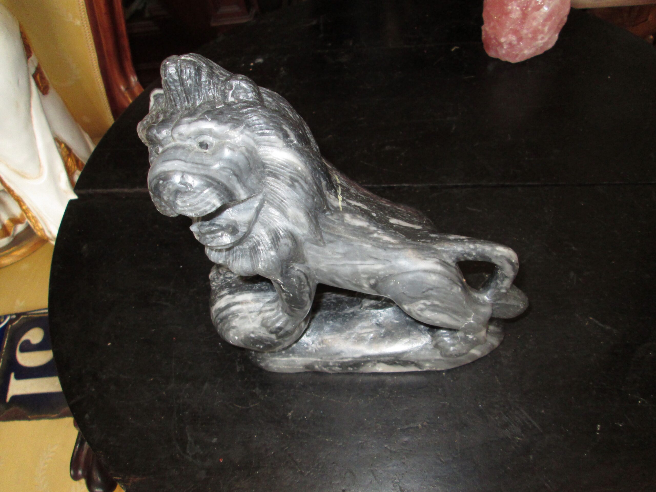 Figurka Lwa wykonana z szarego marmuru. Zachowane proporcje i pokazane wszystkie detale. Długość ok 20 cm , wysokość 22 cm , głębokość 7 cm. Idealny prezent dla kogoś z pod znaku Lwa. Stan bardzo dobry.