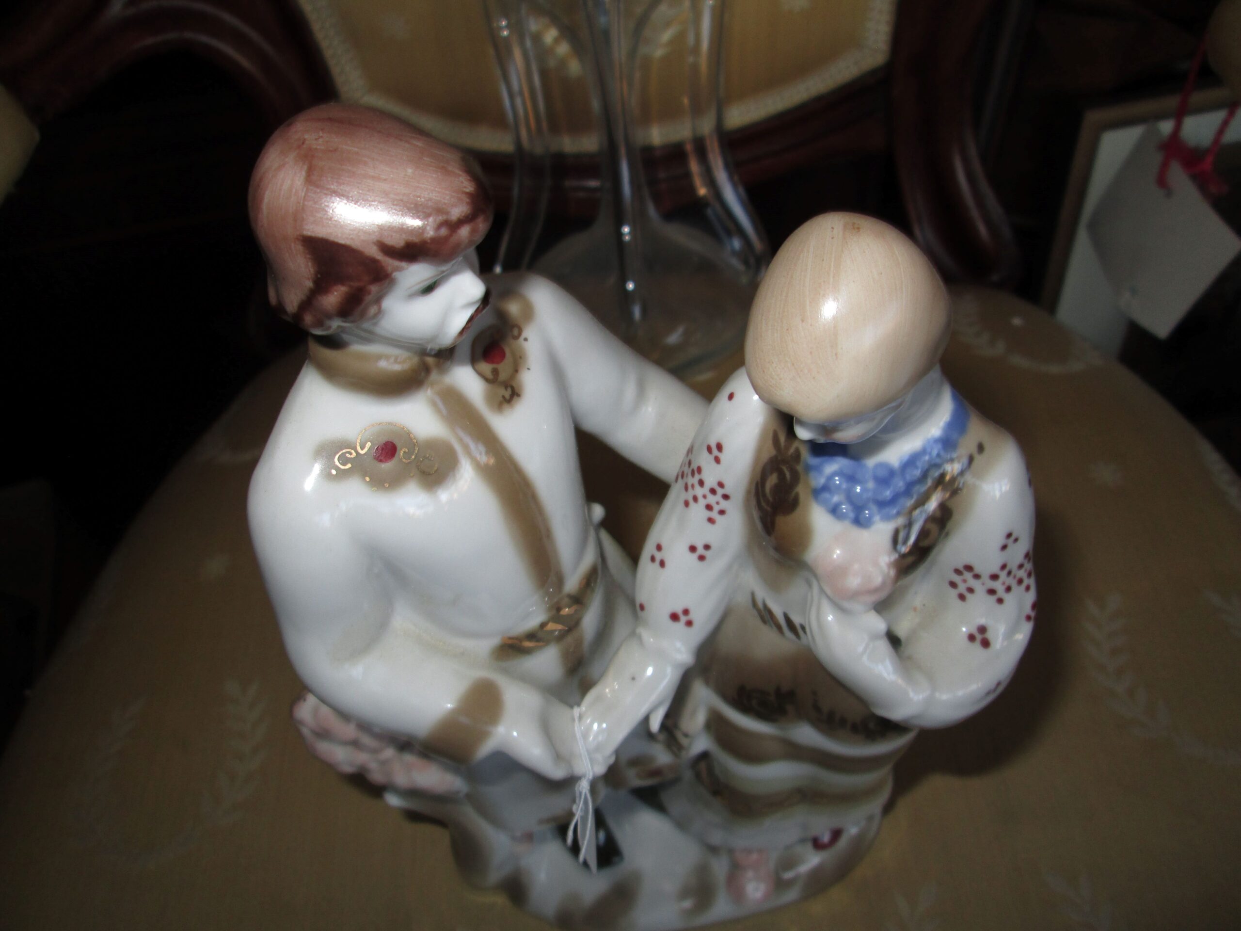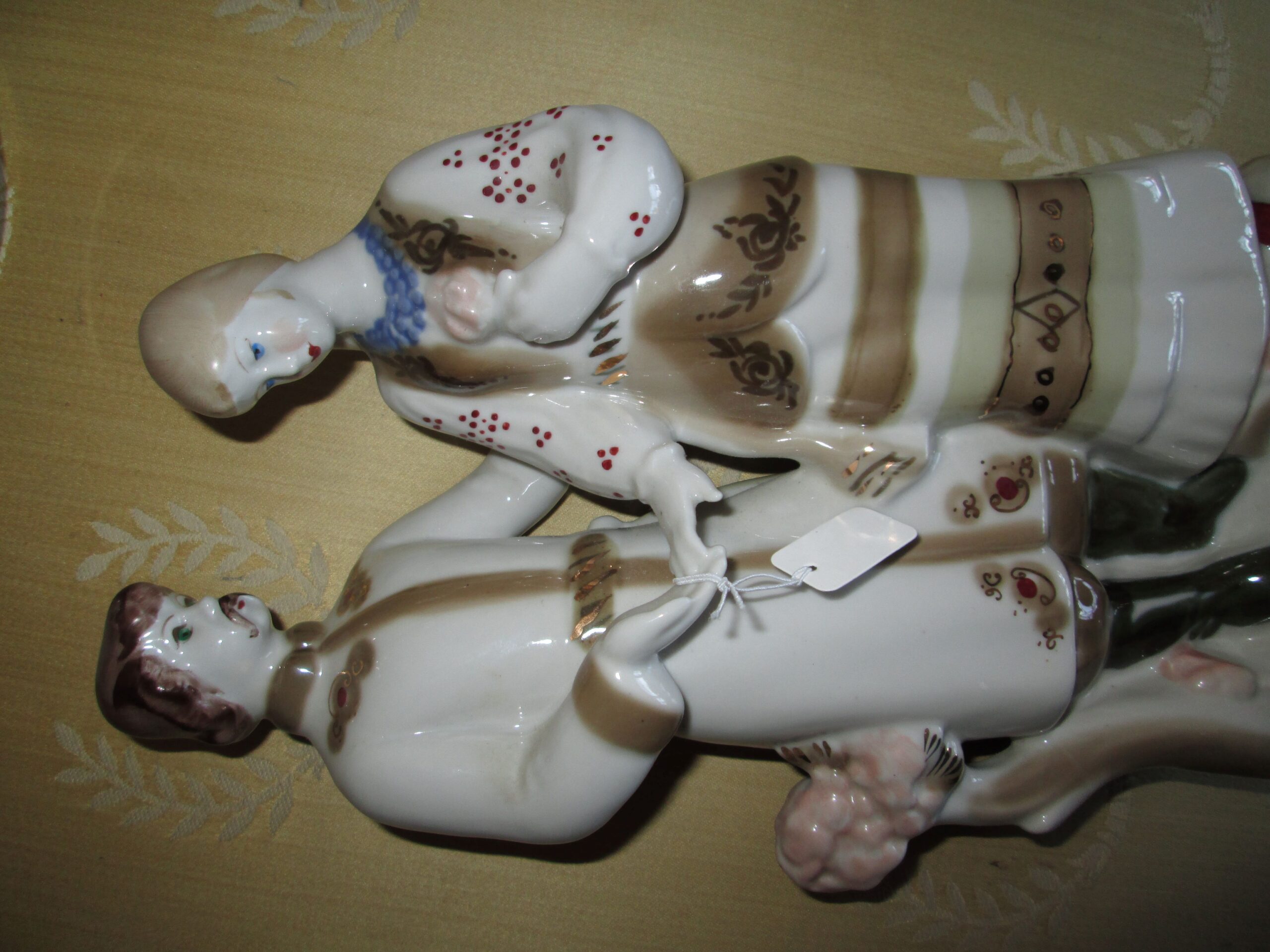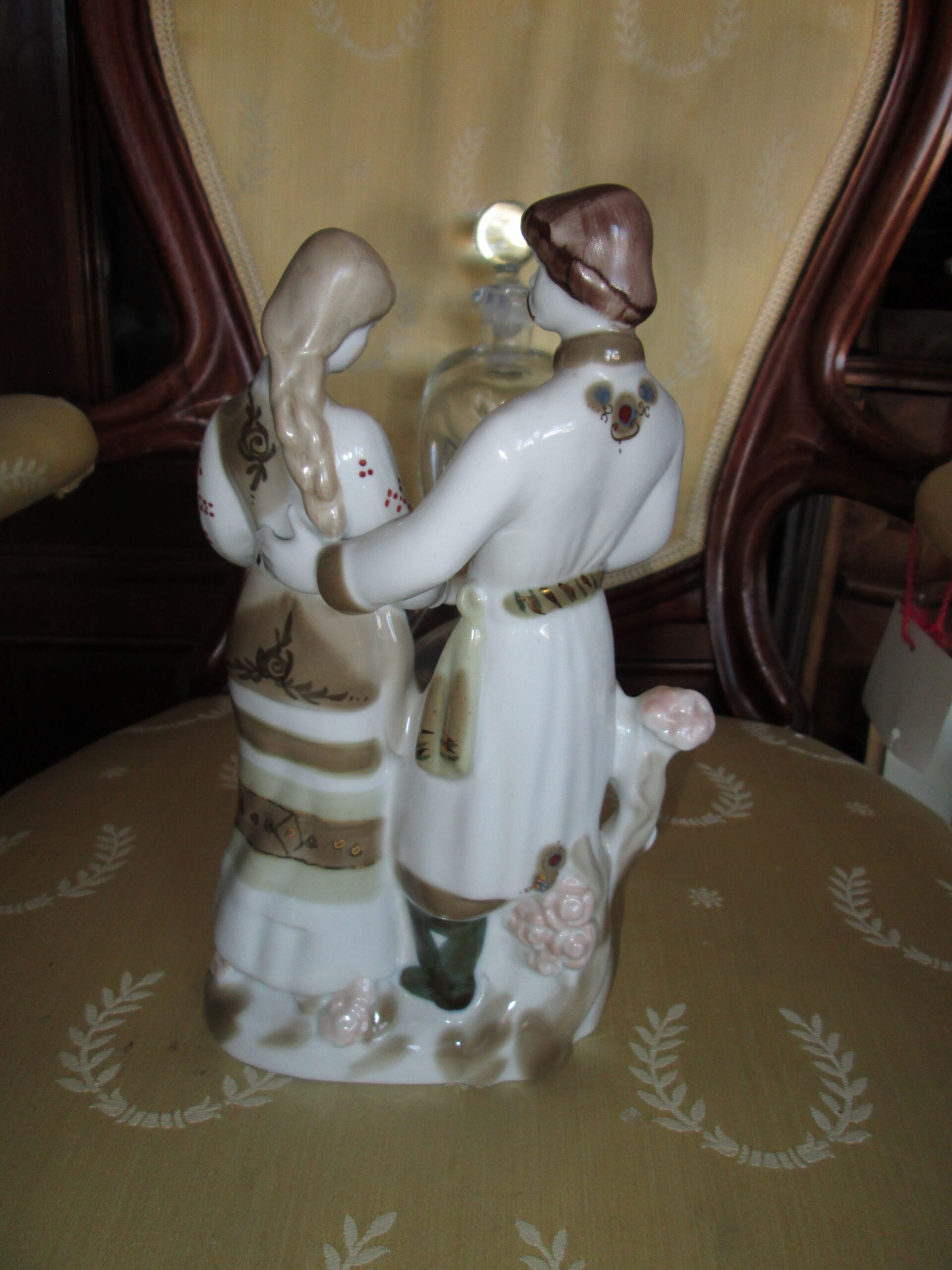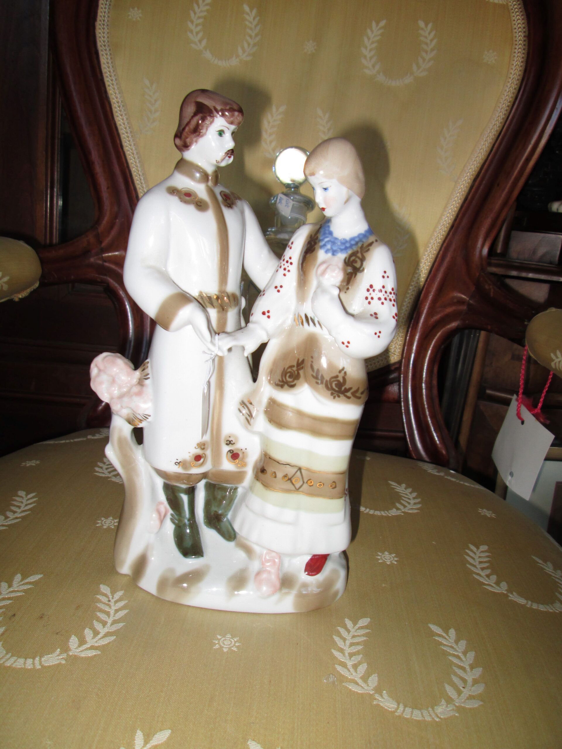 Porcelanowa figurka przedstawia parę w ludowych strojach ludowych. Wykonana w latach 70-80 w fabryce Połonne na Ukrainie. Stan bardzo dobry.