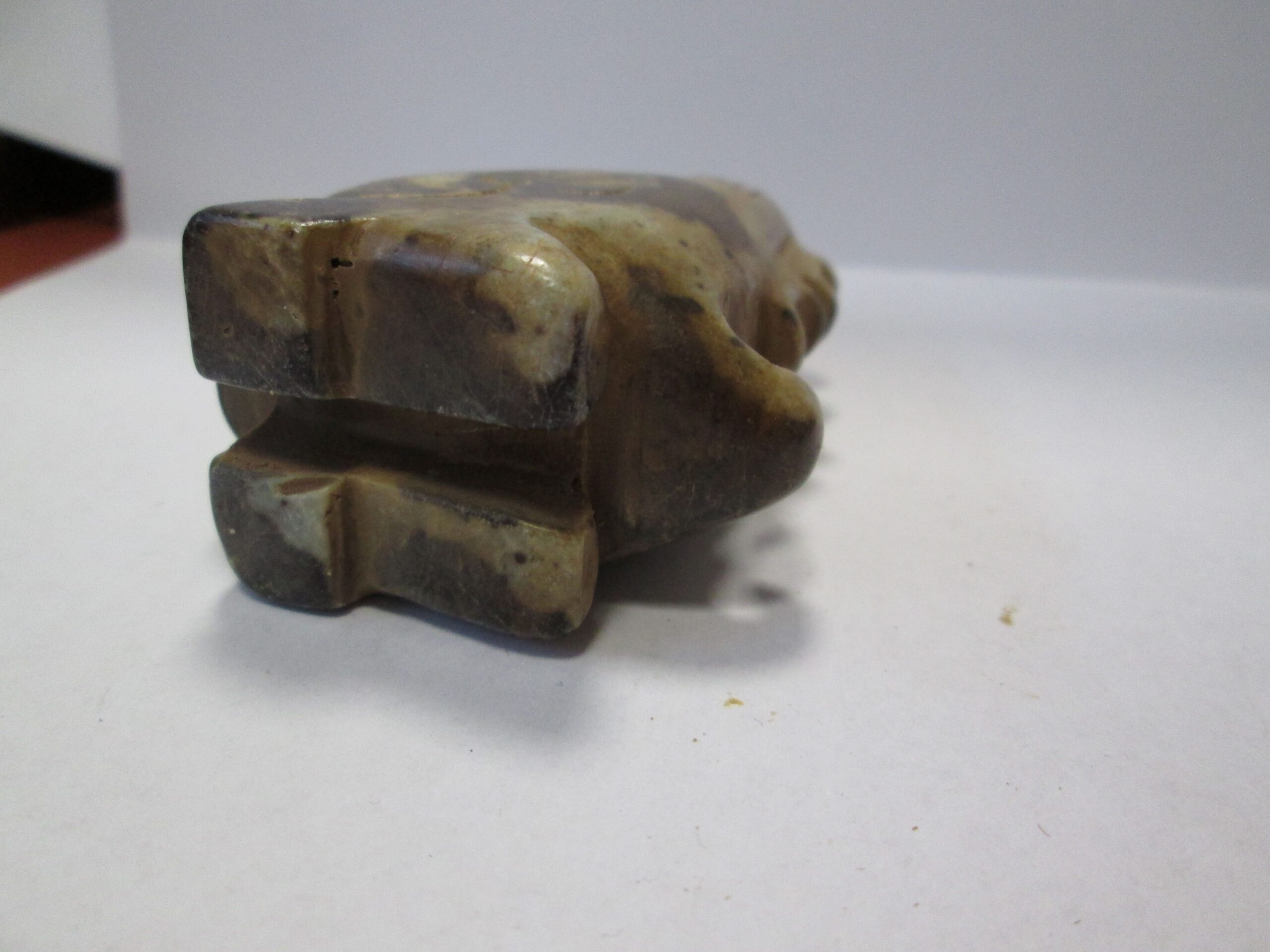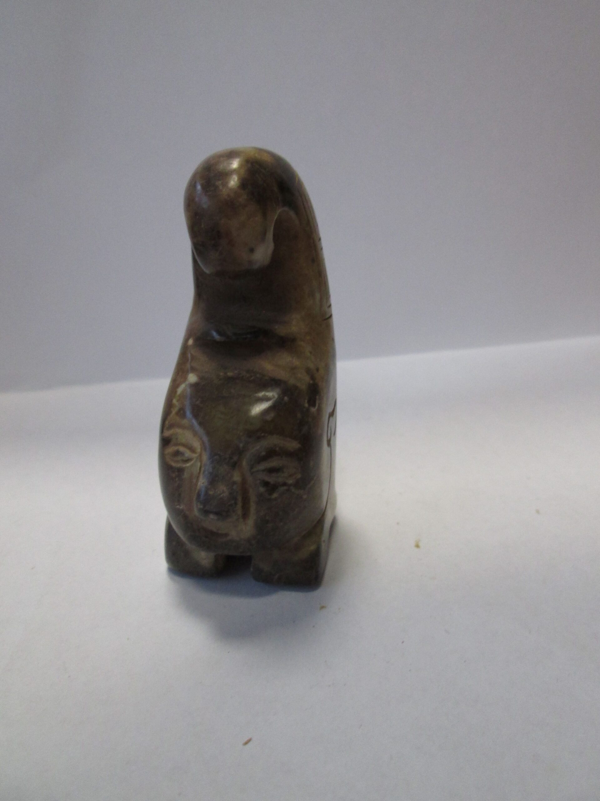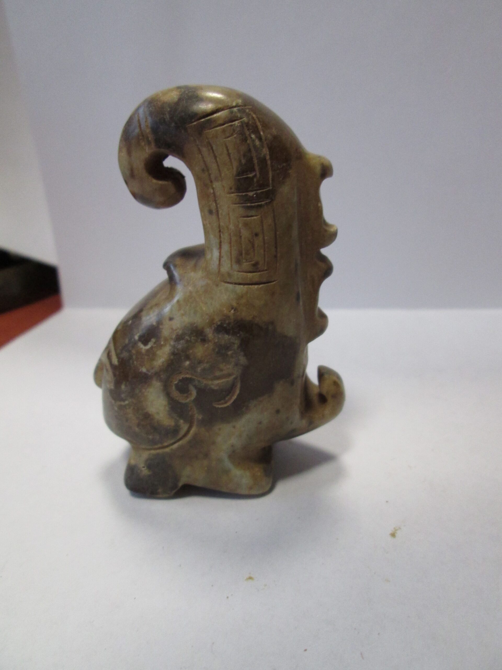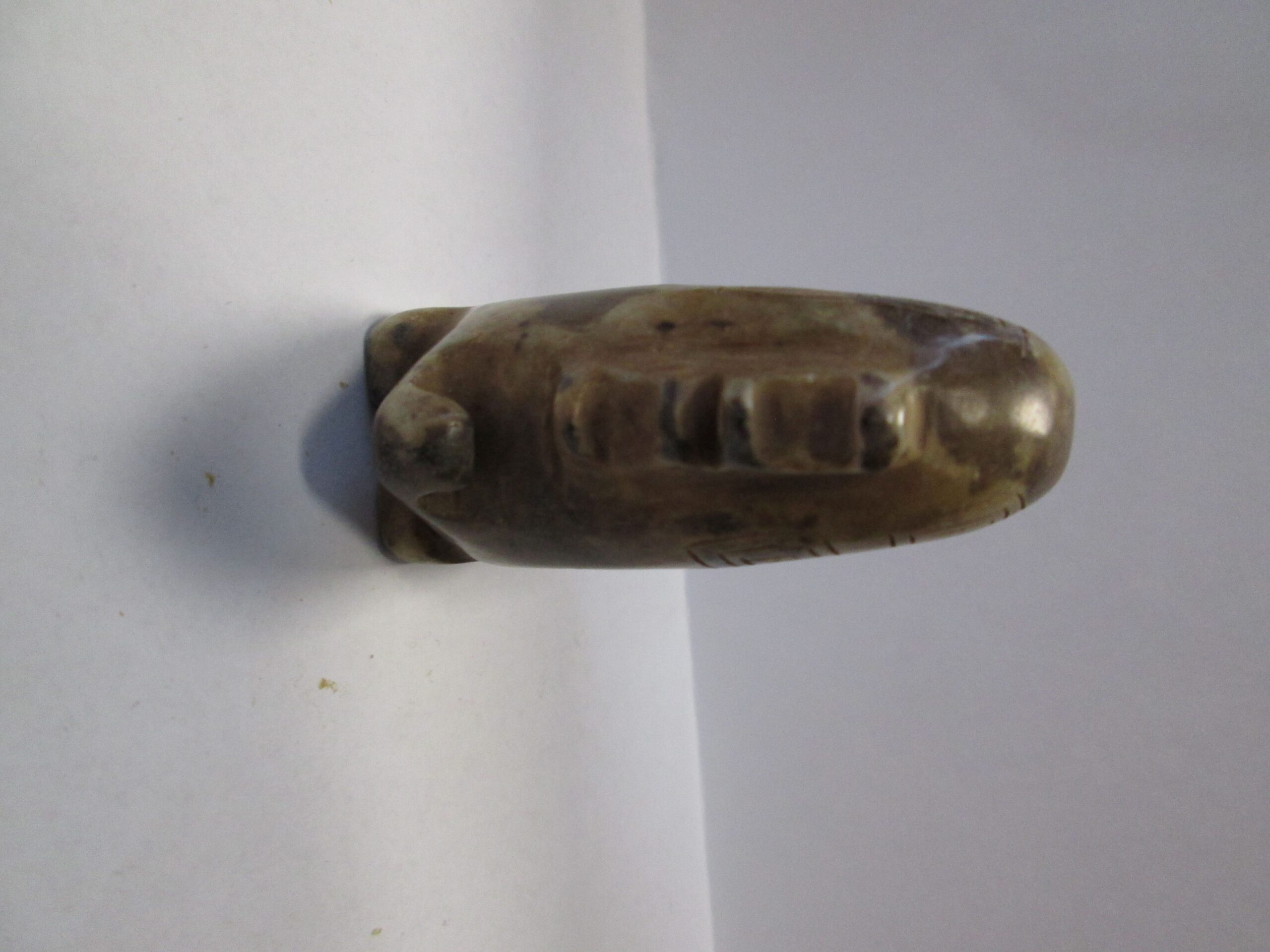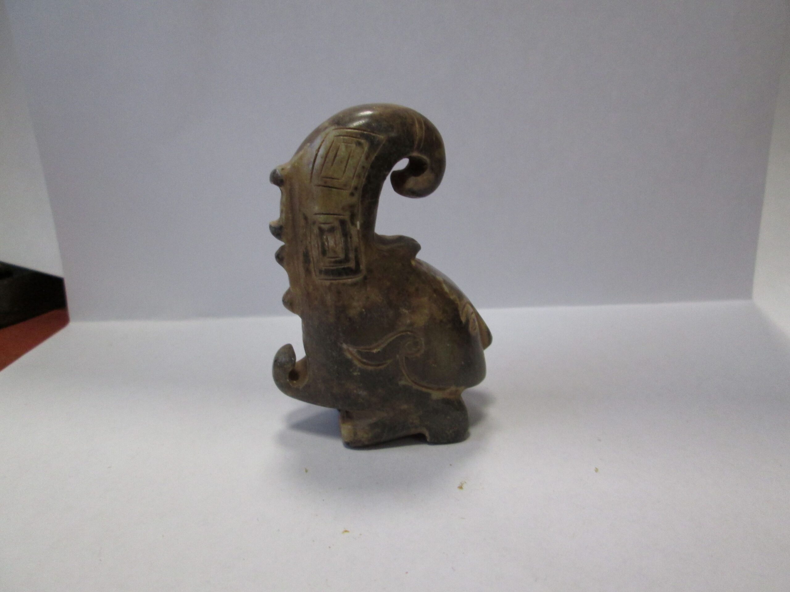 Figurka z kamienia naturalnego. Pochodzi z Ameryki Południowej (Peru). Przedstawia mityczne zwierze z okresu panowania Inków lub Azteków. Figurka ręcznie wykonana. Rzadki przedmiot na naszym rynku antykwarycznym.Wysokość 7 cm , szerokość 2.5 cm. Stan bardzo dobry.