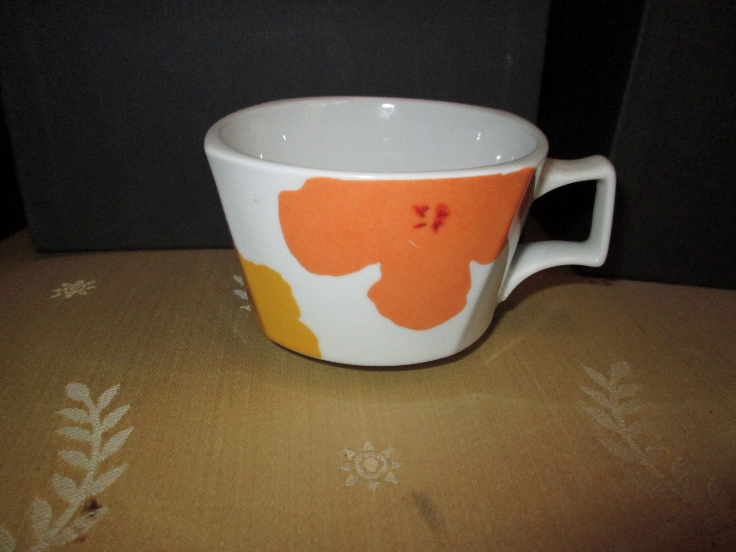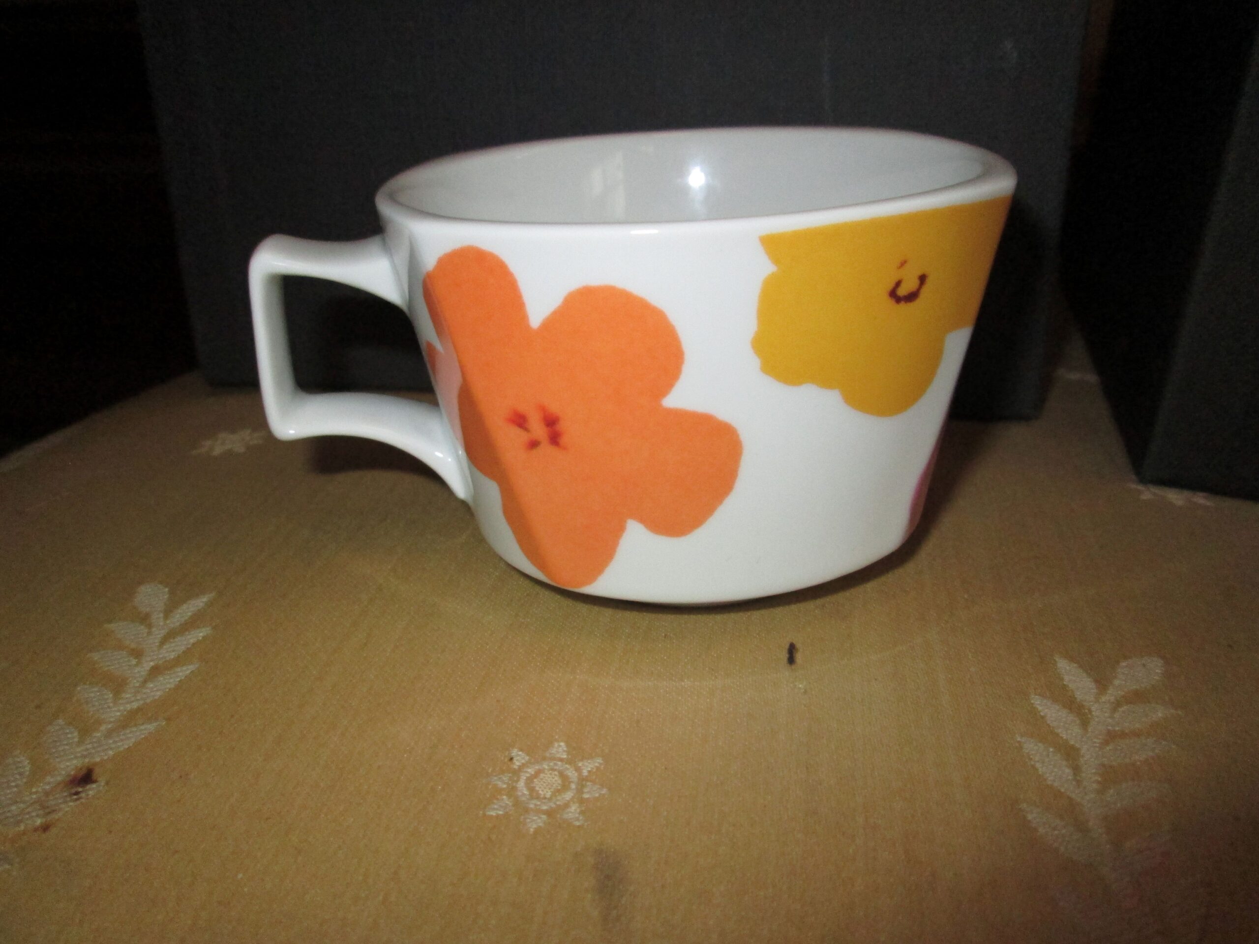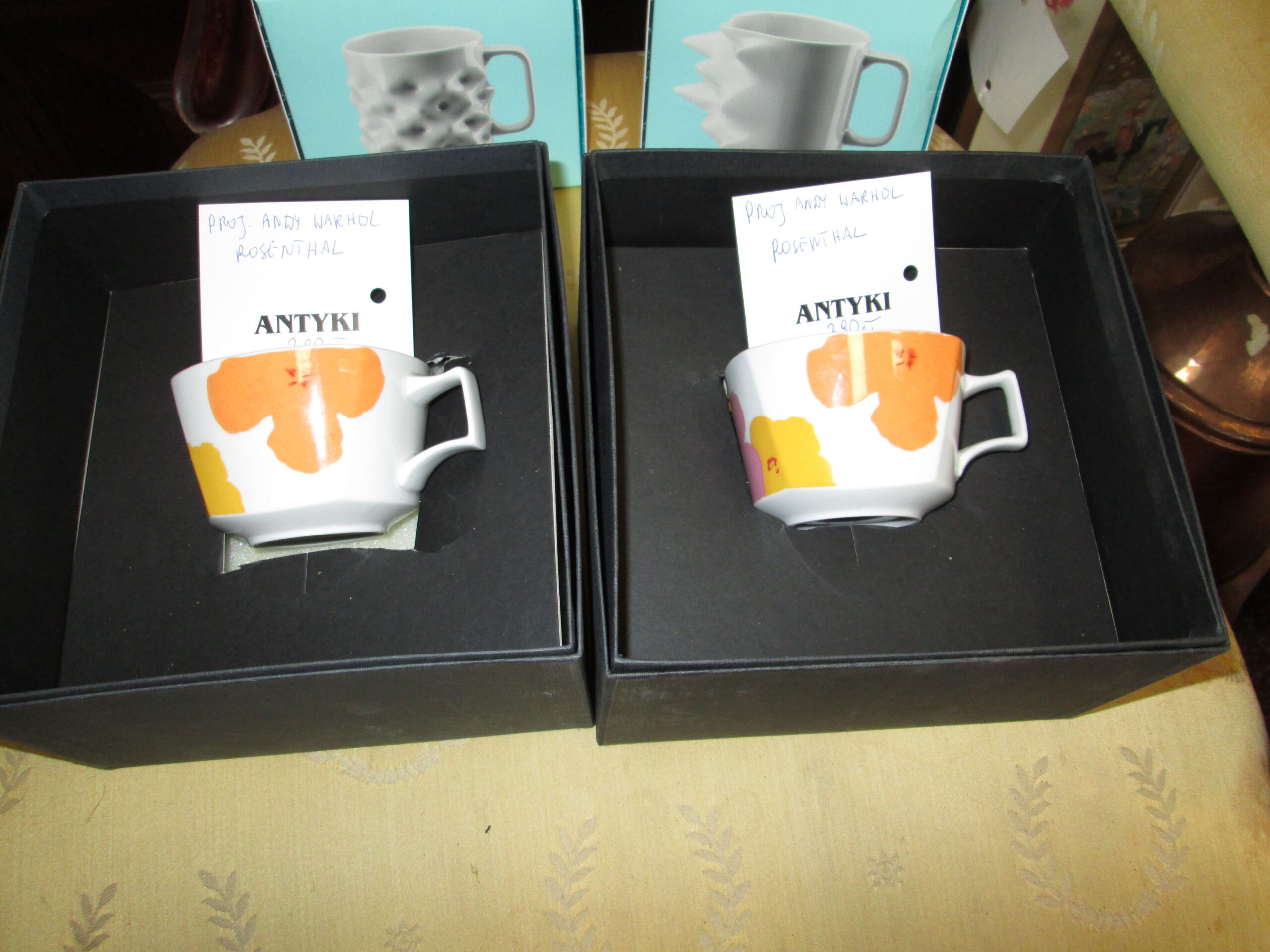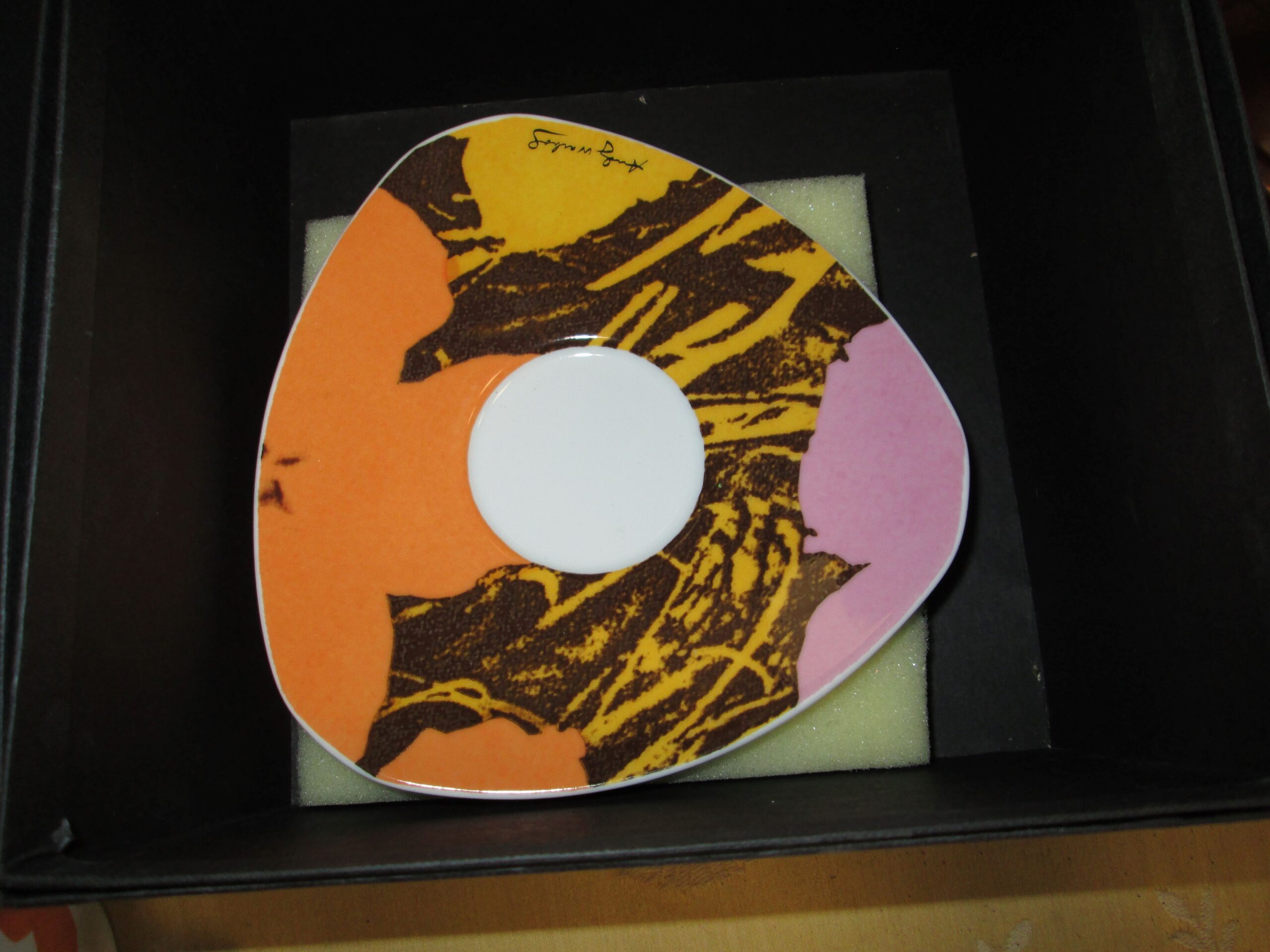 Filiżanka z talerzykiem do kawy , wykonana przez firmę Rosenthal. Projekt dekoracji wykonała Andy Warhol , słynny artysta Pop Artu. Oryginalne pudełko. Seria limitowana. Średnica filiżanki 8.5 cm , wysokość 6 cm. Talerzyk w kształcie trójkąta z zaokrąglonymi rogami . Średnica ok 16 cm. Stan idealny.