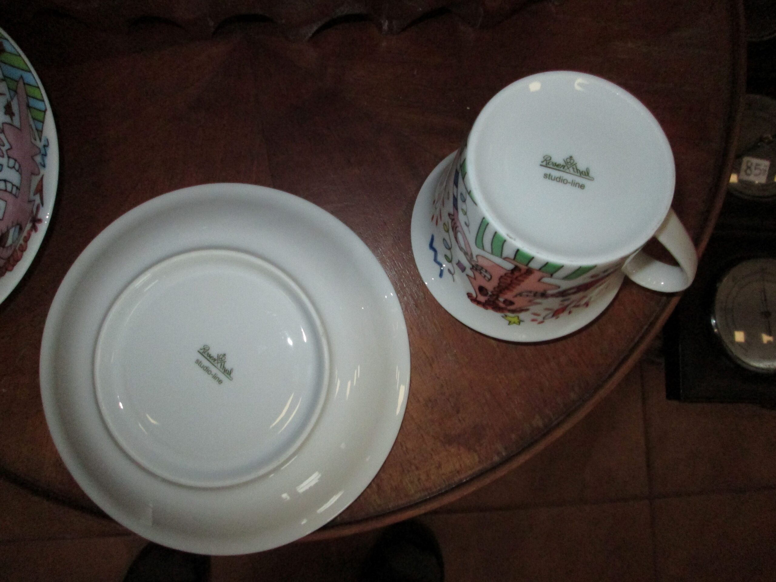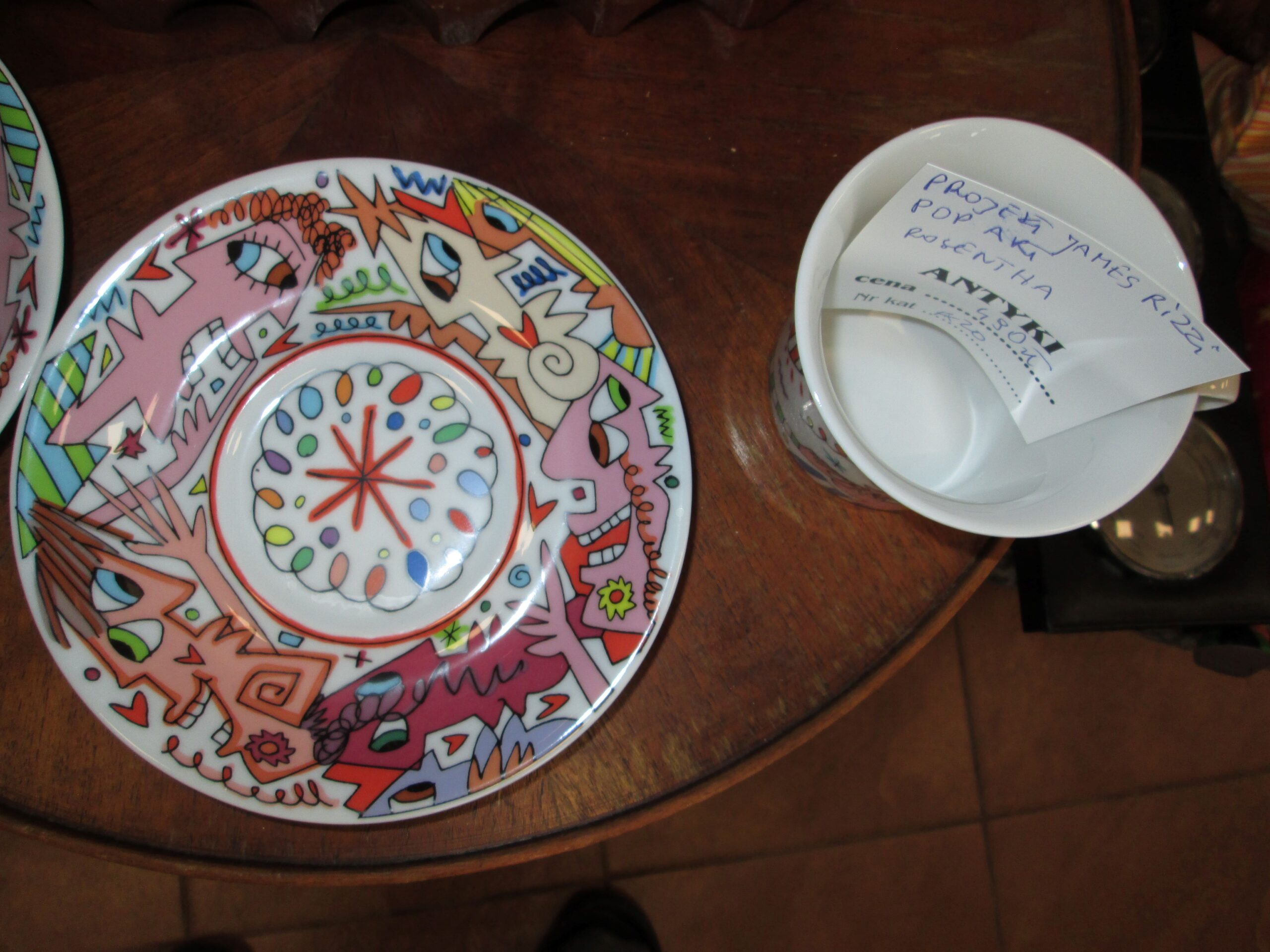 Filiżanka z talerzykiem seria limitowana . Wykonana  w firmie Rosenthal. Zdobienia wykonane przez słynnego artystę Pop Artu Jamesa Rizzi.  Średnica 9 cm , wysokość 7 cm , Talerzyk średnica 16 cm. Prawdziwy rarytas kolekcjonerski. Stan witrynowy. Mamy na stanie 2 sztuki. Cena dotyczy 1 sztuki.