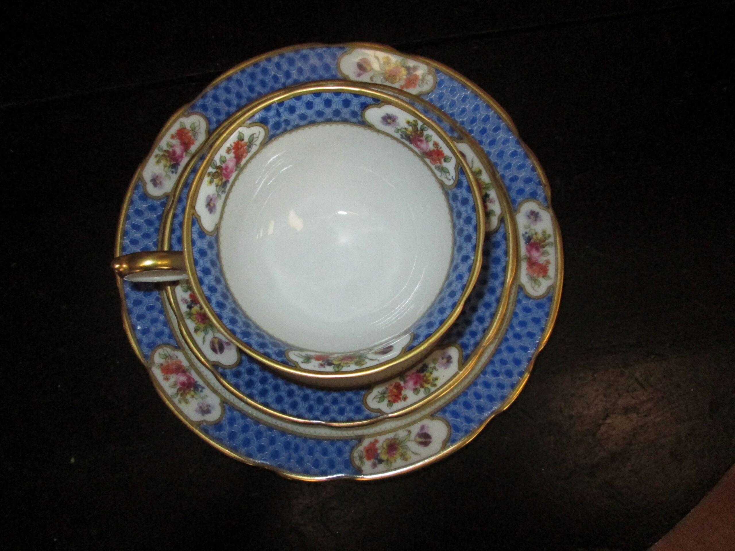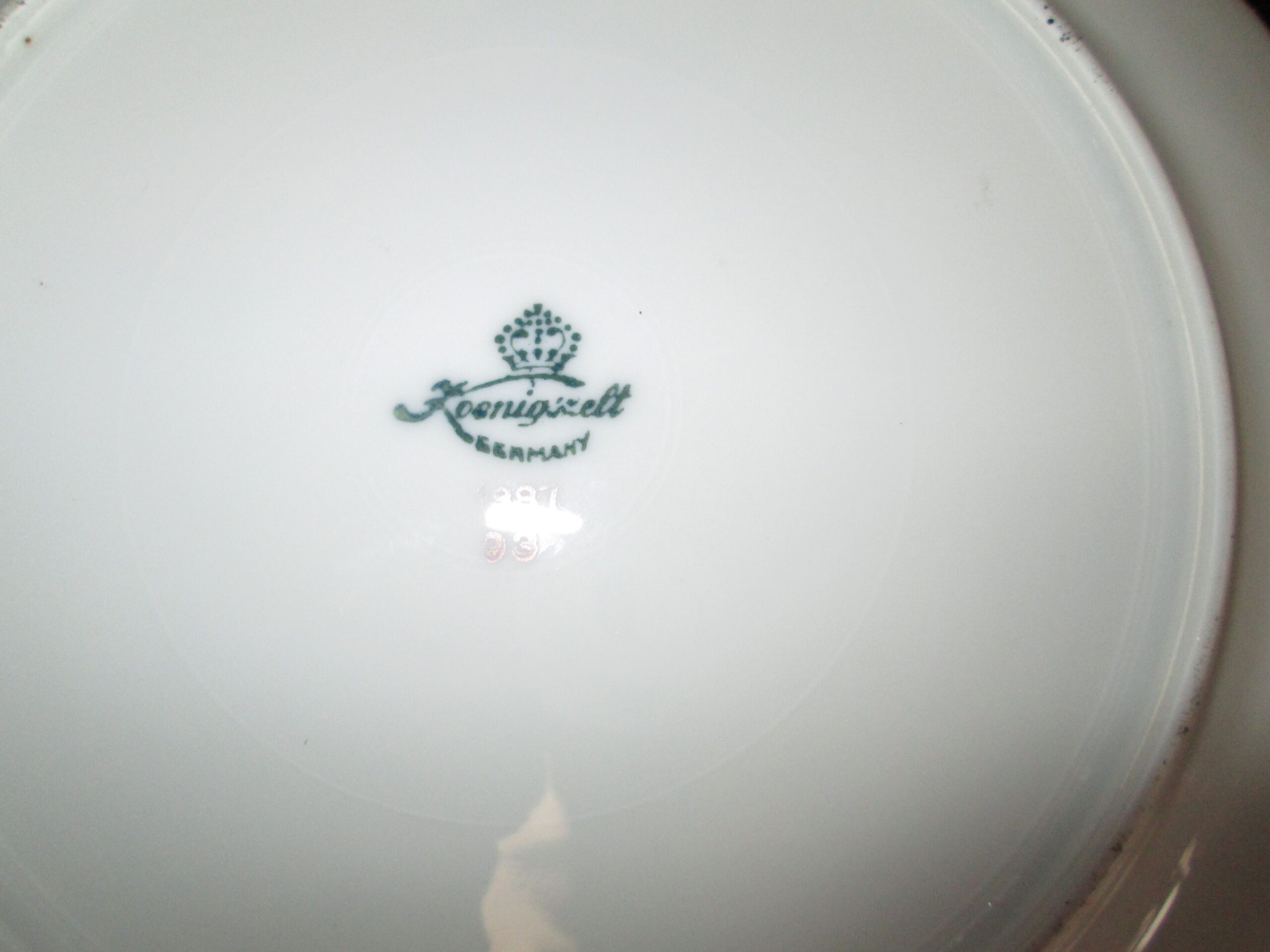 Prawdziwa gratka dla kolekcjonerów dawnej polskiej porcelany. Trio z przedwojennej fabryki w Jaworzynie Śląskiej .Sygnowana Koenigszeld Germany co oznacza że powstała w okresie 1920-1945. Brzegi złocone , stan witrynowy bez przetarć i uszczerbków. Średnica talerzyka deserowego 18 cm , podstawki 14 cm ,filiżanki 10 cm.