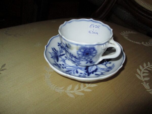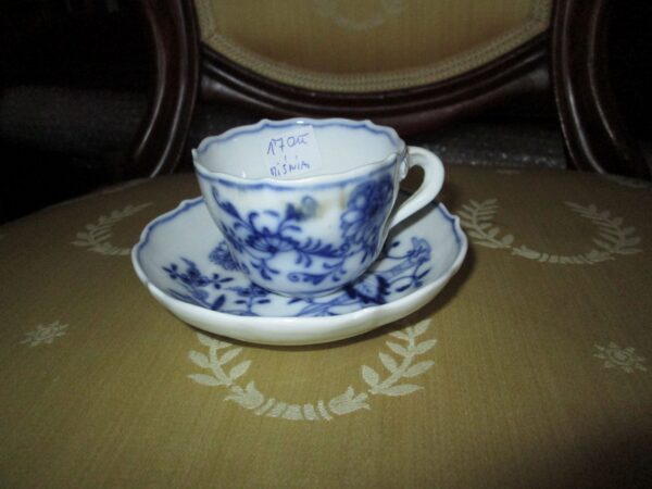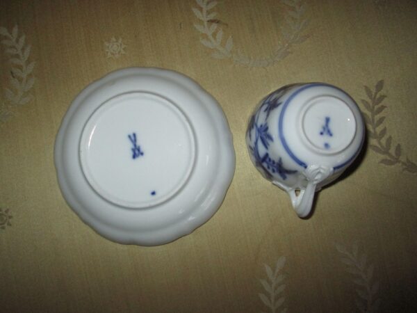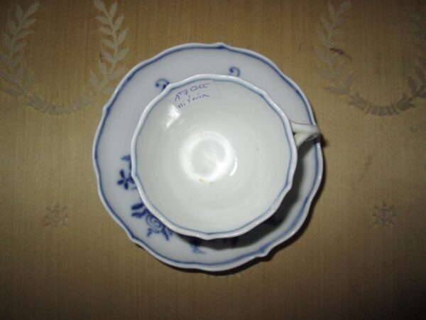 Porcelanowa filiżanka ze spodkiem wykonana w Miśni w drugiej połowie XX wieku.Klasyczny wzór cebulowy.Filiżanka średnica 6.5 cm , wysokość 5 cm. Podstawka średnica 10.5 cm , wysokość ok 2.5 cm. Na stanie mamy 2 komplety.