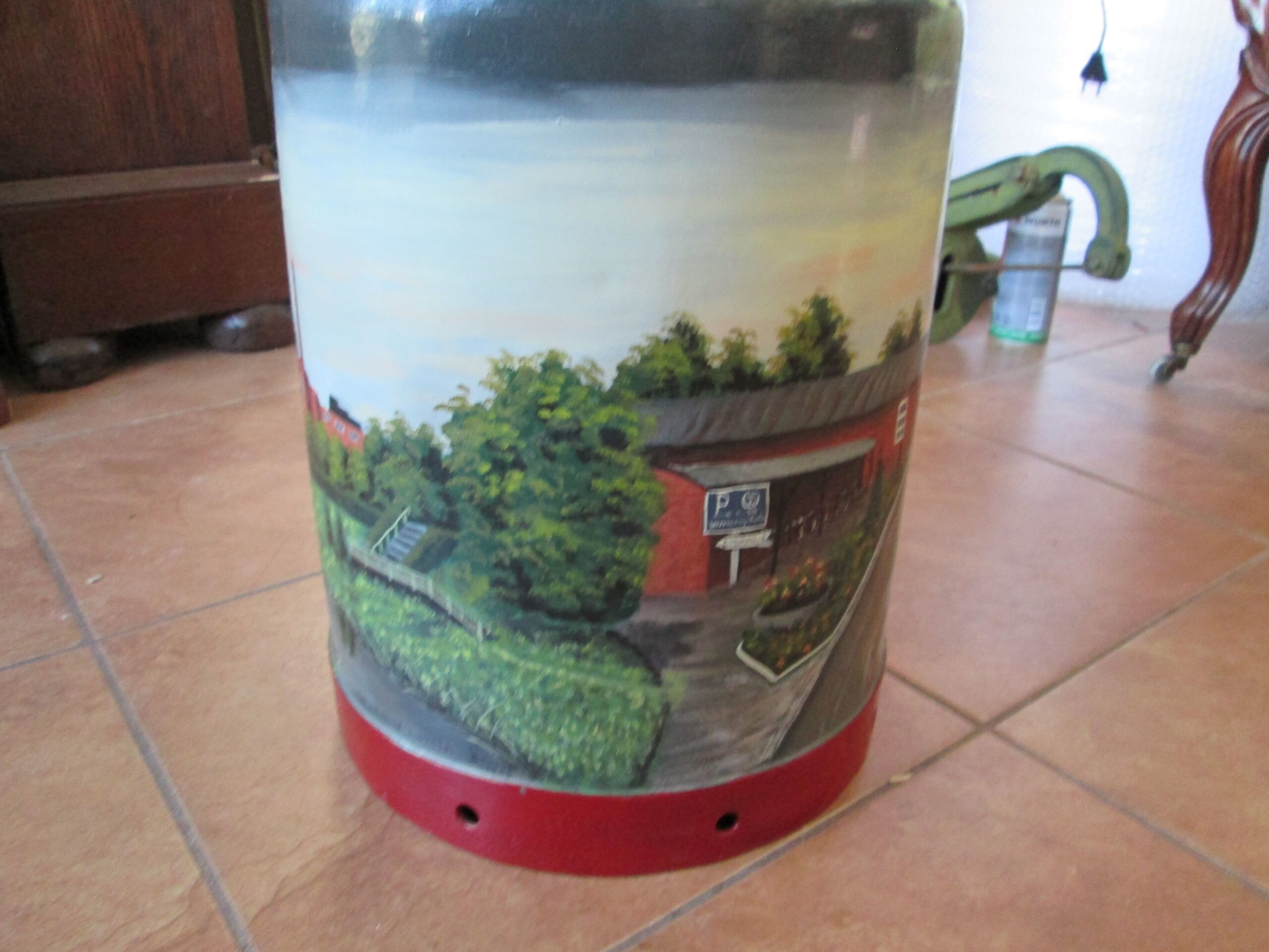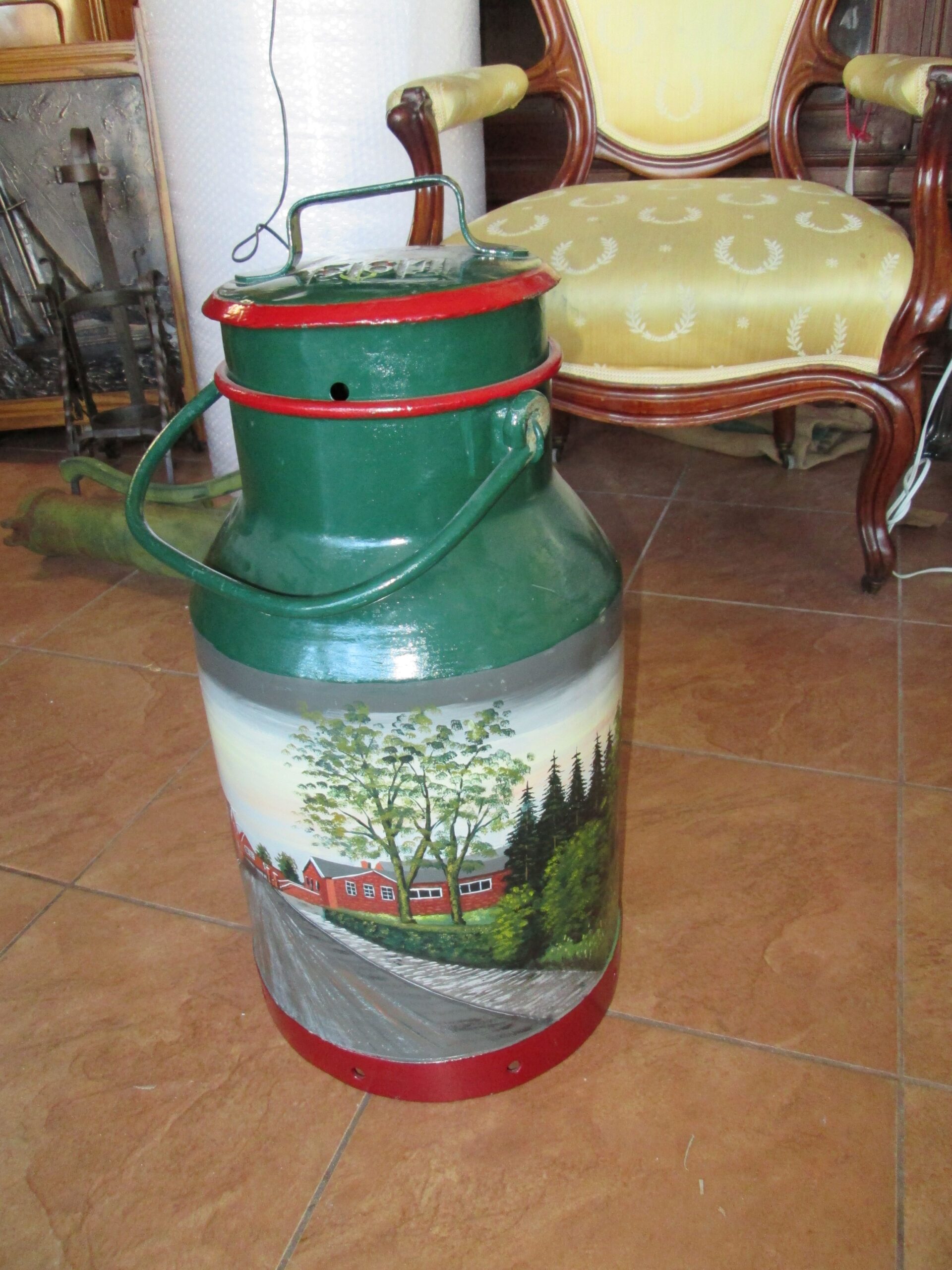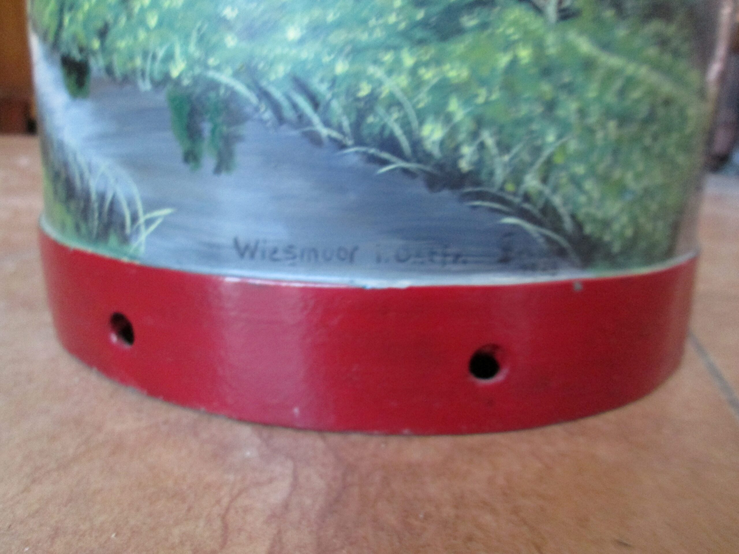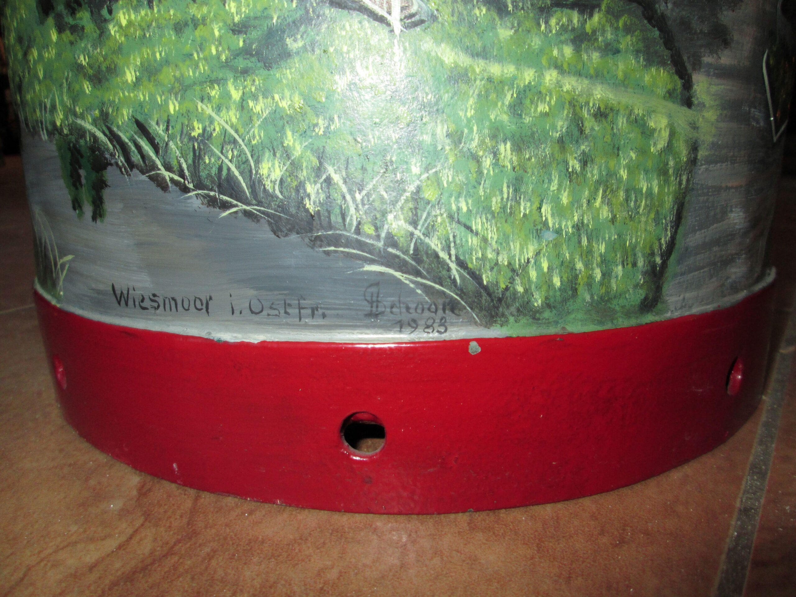 Duża kanka na mleko ręcznie malowana . Podpisana Wiesmoor i. Ostfr. i podpis malującego Schogin 1983 r.Wysokośc 52 cm , średnica 24 cm. Piękna ozdoba do ogrodu lub na parasole.