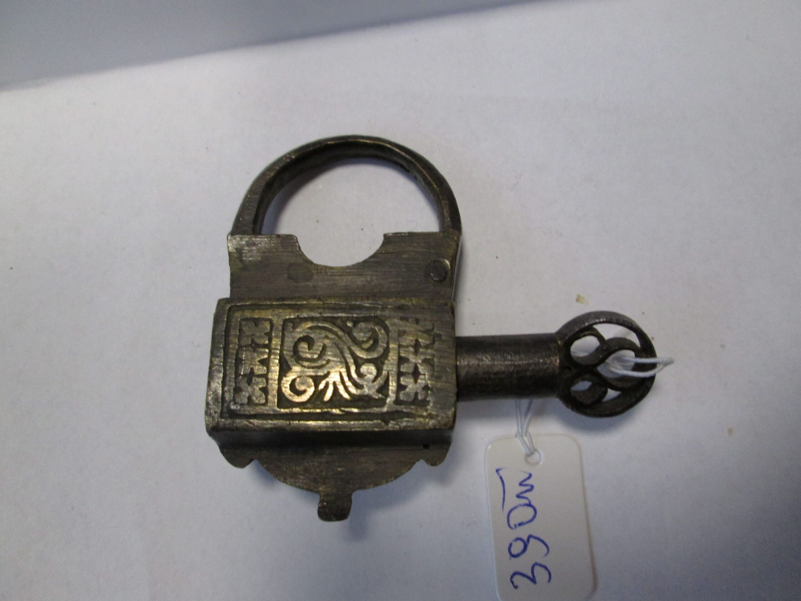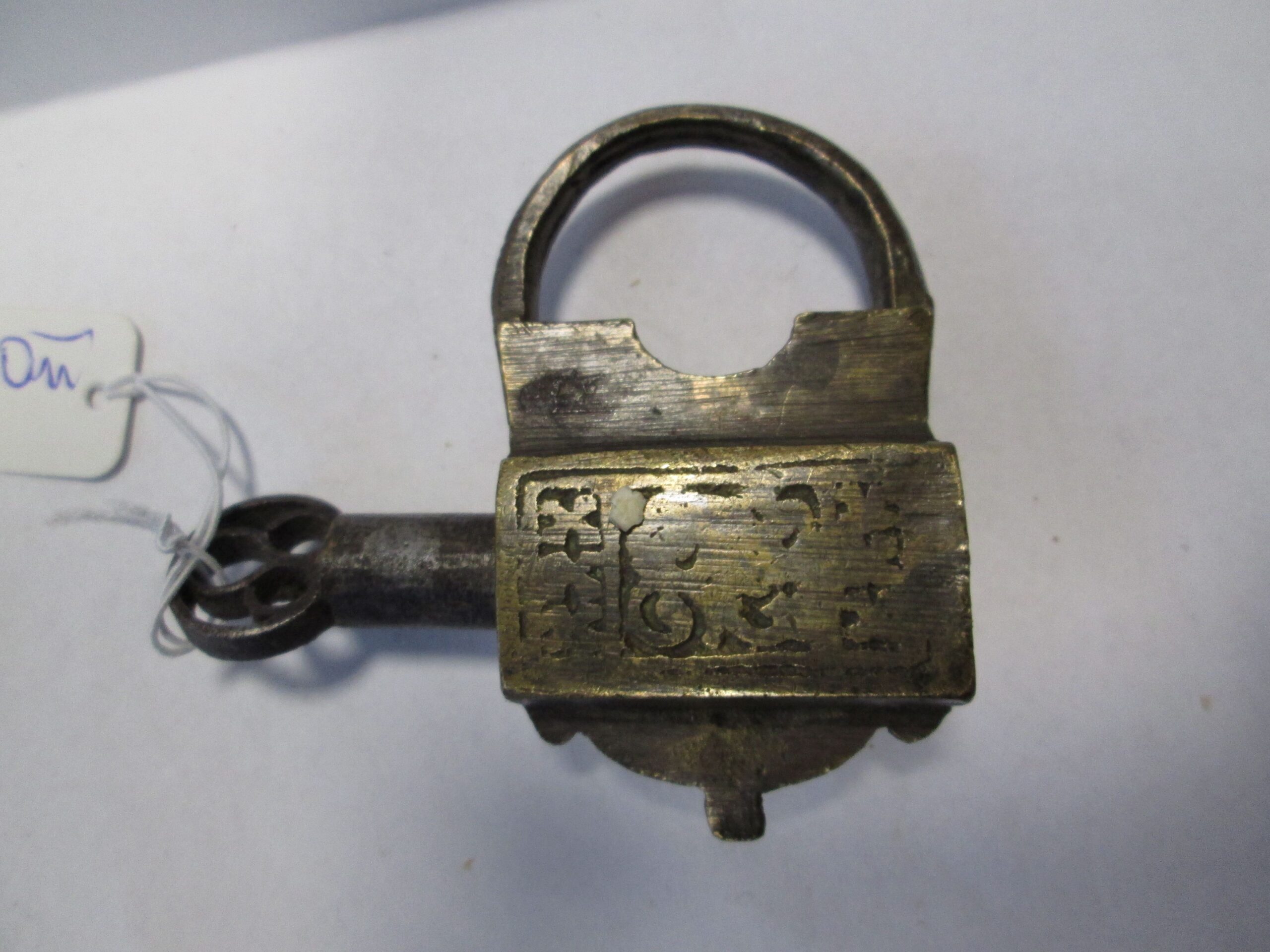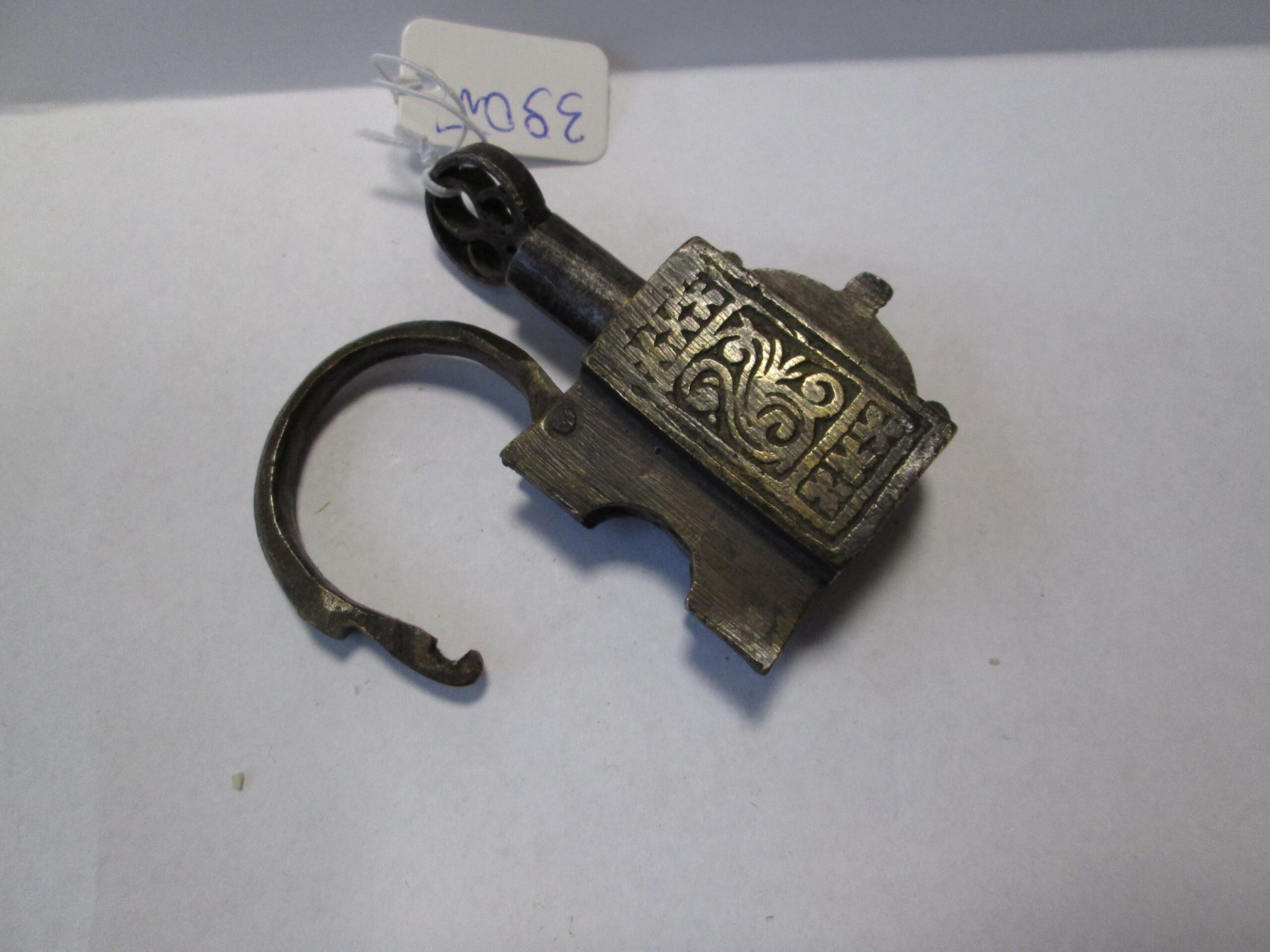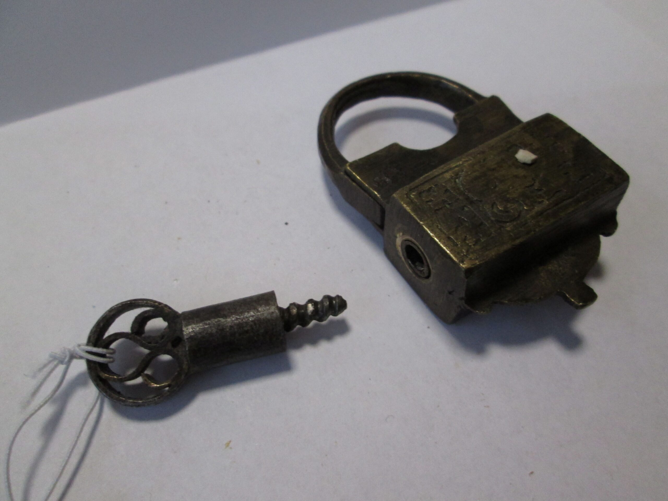 Kłódka wykonana w pierwszej połowie XIX wieku. Wykonana z mosiądzu ,klucz wykonany ze stali. Końcówka klucza w kształcie spiralnym. Kłódka w pełni sprawna działająca. Bez klucza wymiary. Szerokość 3.5 cm , wysokość 6 cm,grubość 17 mm. Gratka dla kolekcjonerów.