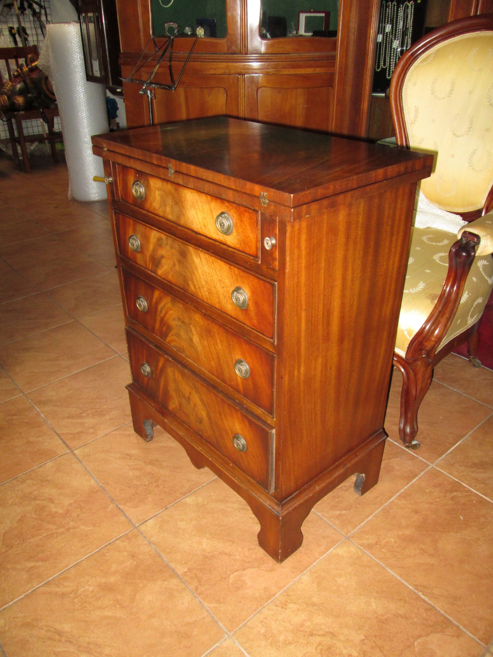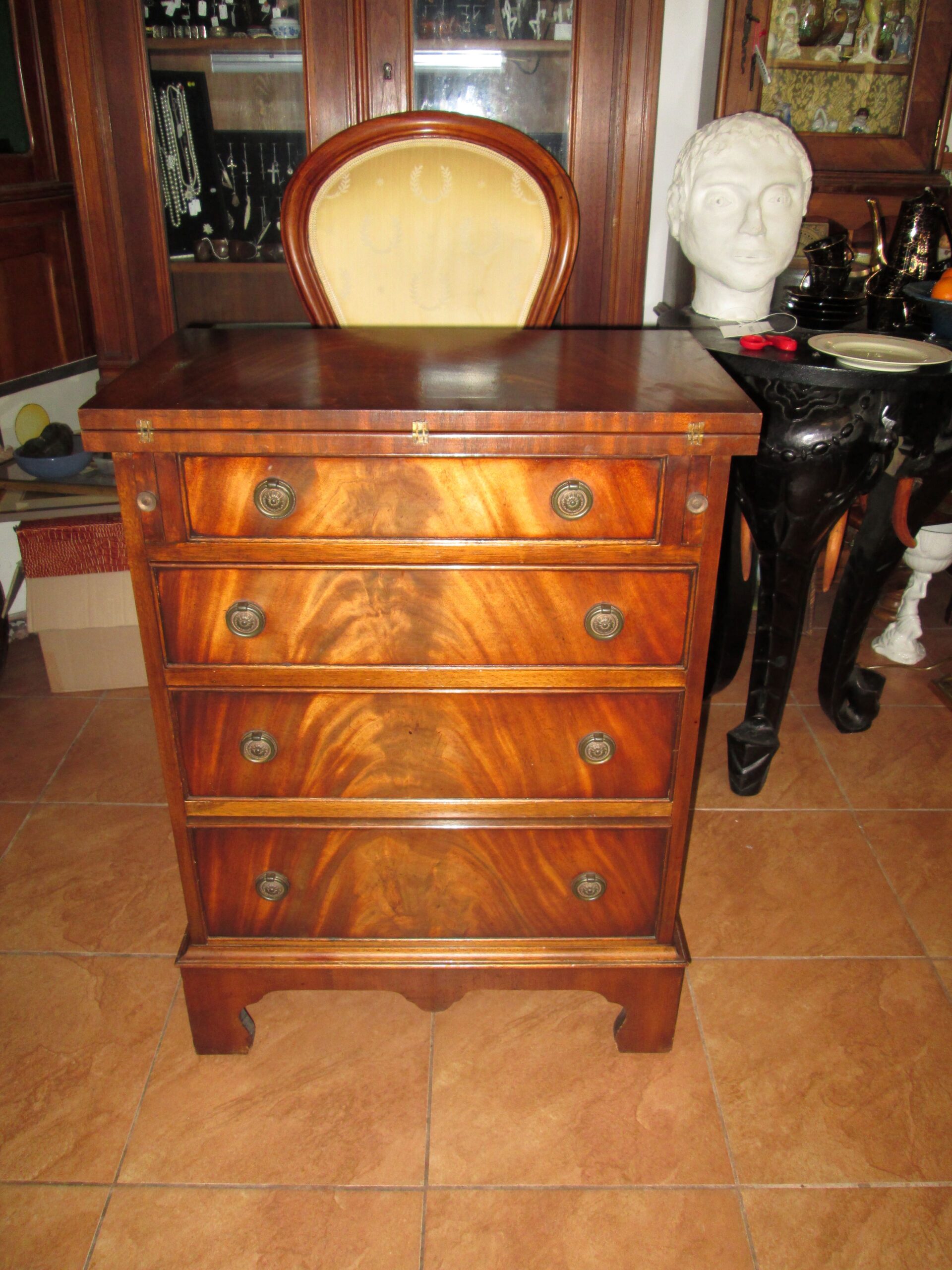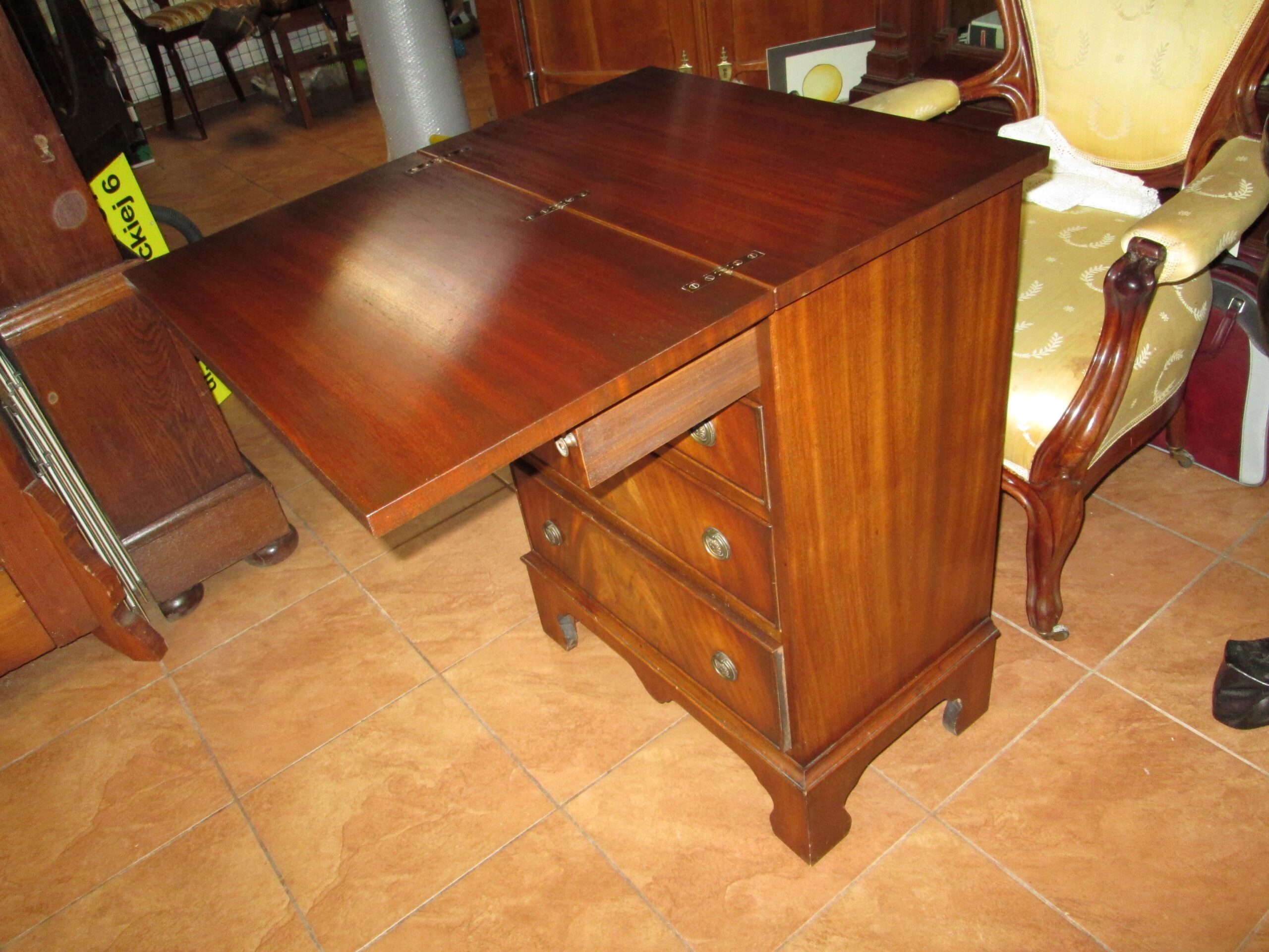 |Ładna komoda wyprodukowana w Anglii w latach 40-tych ubiegłego wieku. Blat składany na 2 części co umożliwia pracę na nim tak jak przy biurku. Wysokość 80 cm , szerokość 60 cm , głębokość 35 cm , po rozłożeniu 70 cm. Stan bardzo dobry minus. Ciekawy dwu funkcyjny mebel.