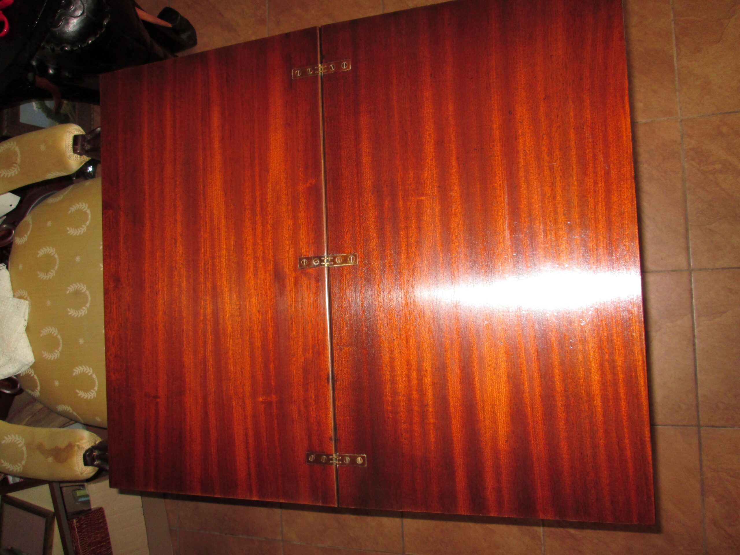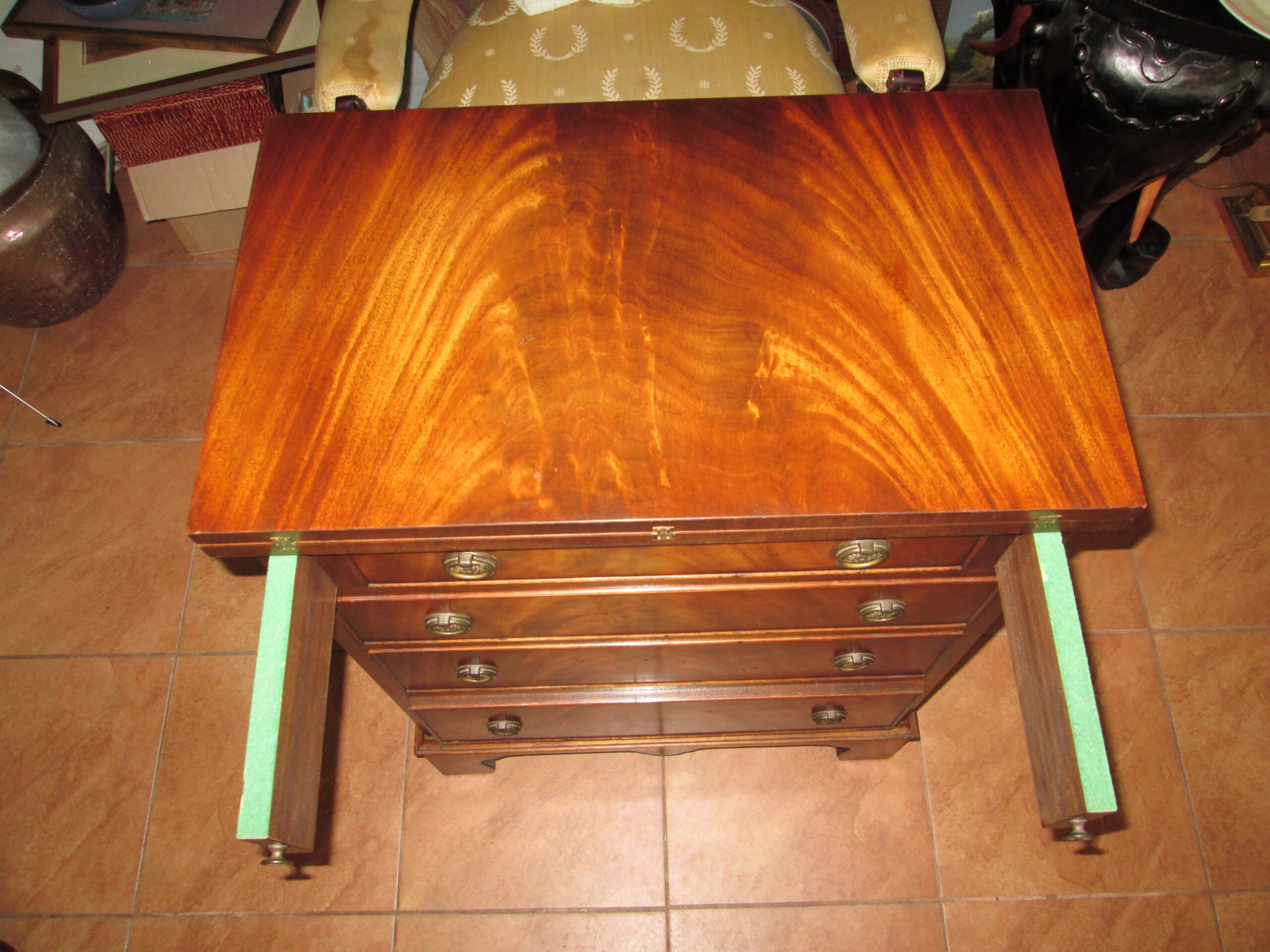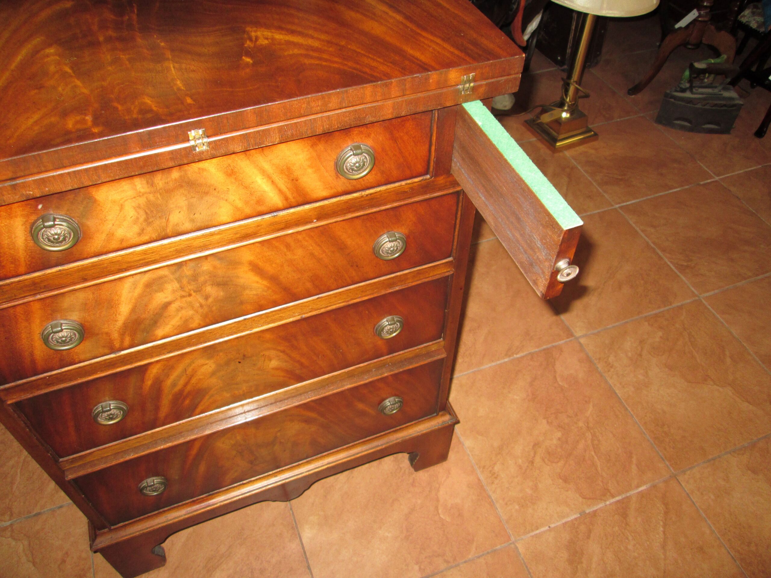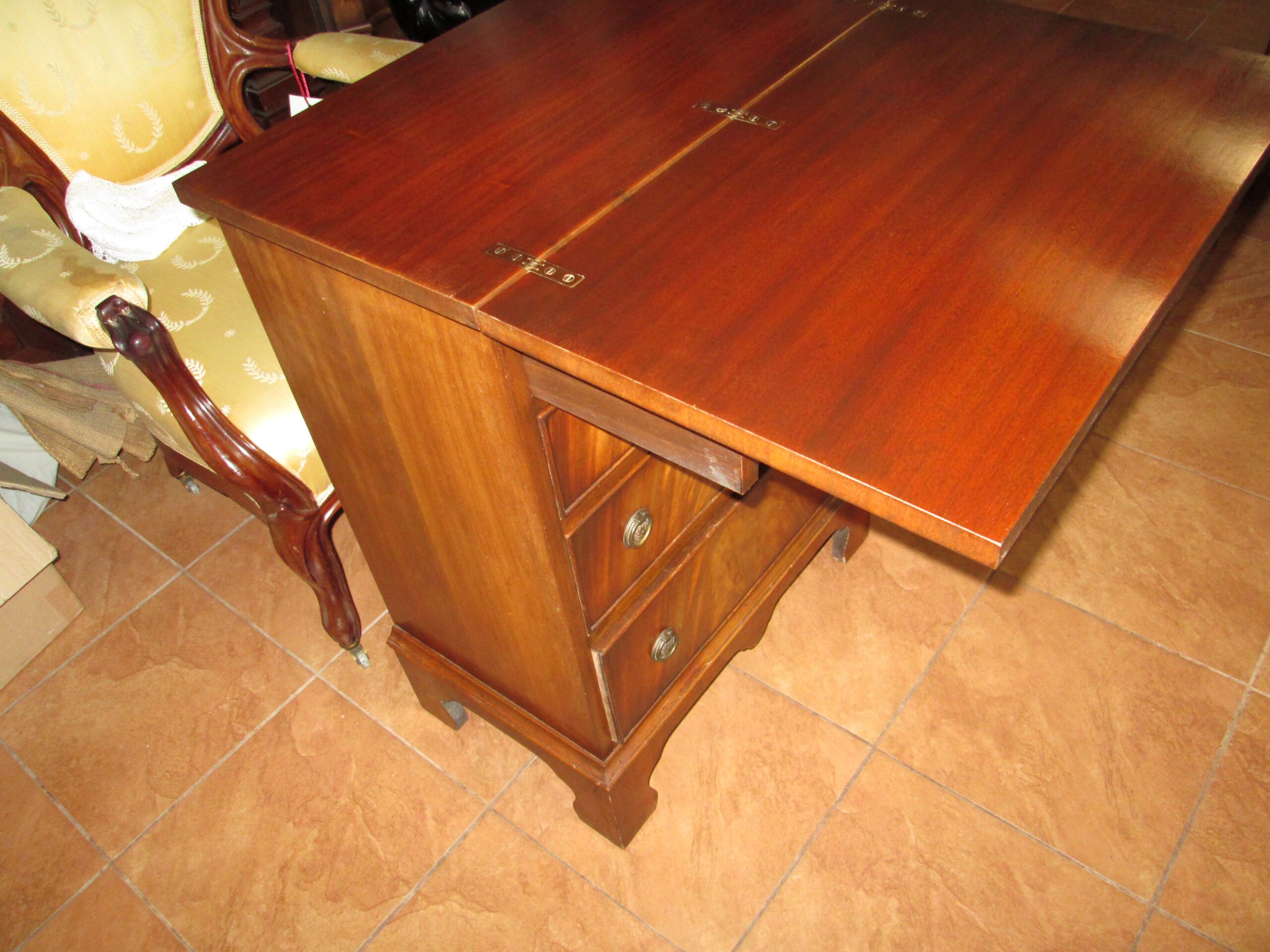 |Ładna komoda wyprodukowana w Anglii w latach 40-tych ubiegłego wieku. Blat składany na 2 części co umożliwia pracę na nim tak jak przy biurku. Wysokość 80 cm , szerokość 60 cm , głębokość 35 cm , po rozłożeniu 70 cm. Stan bardzo dobry minus. Ciekawy dwu funkcyjny mebel.