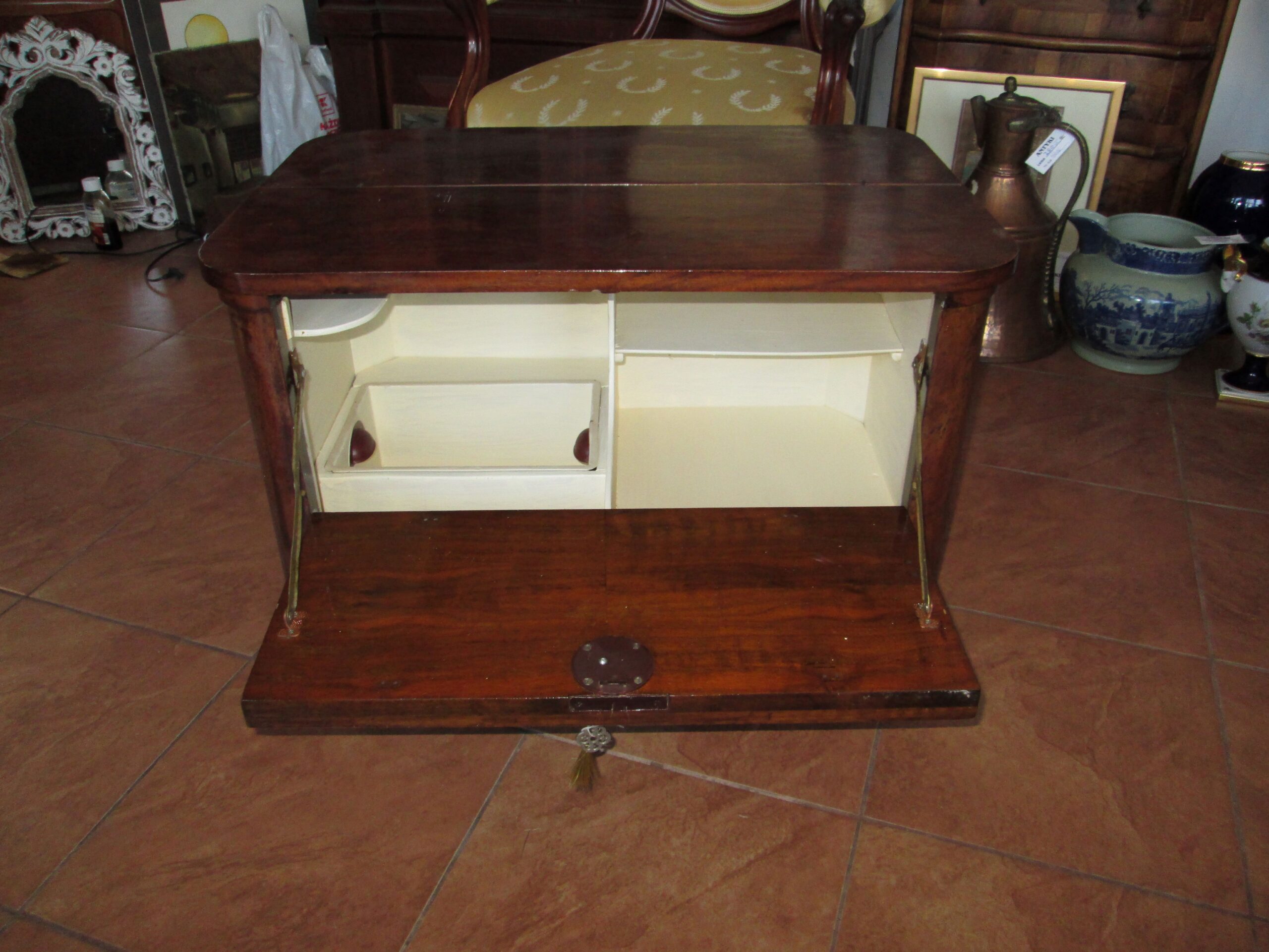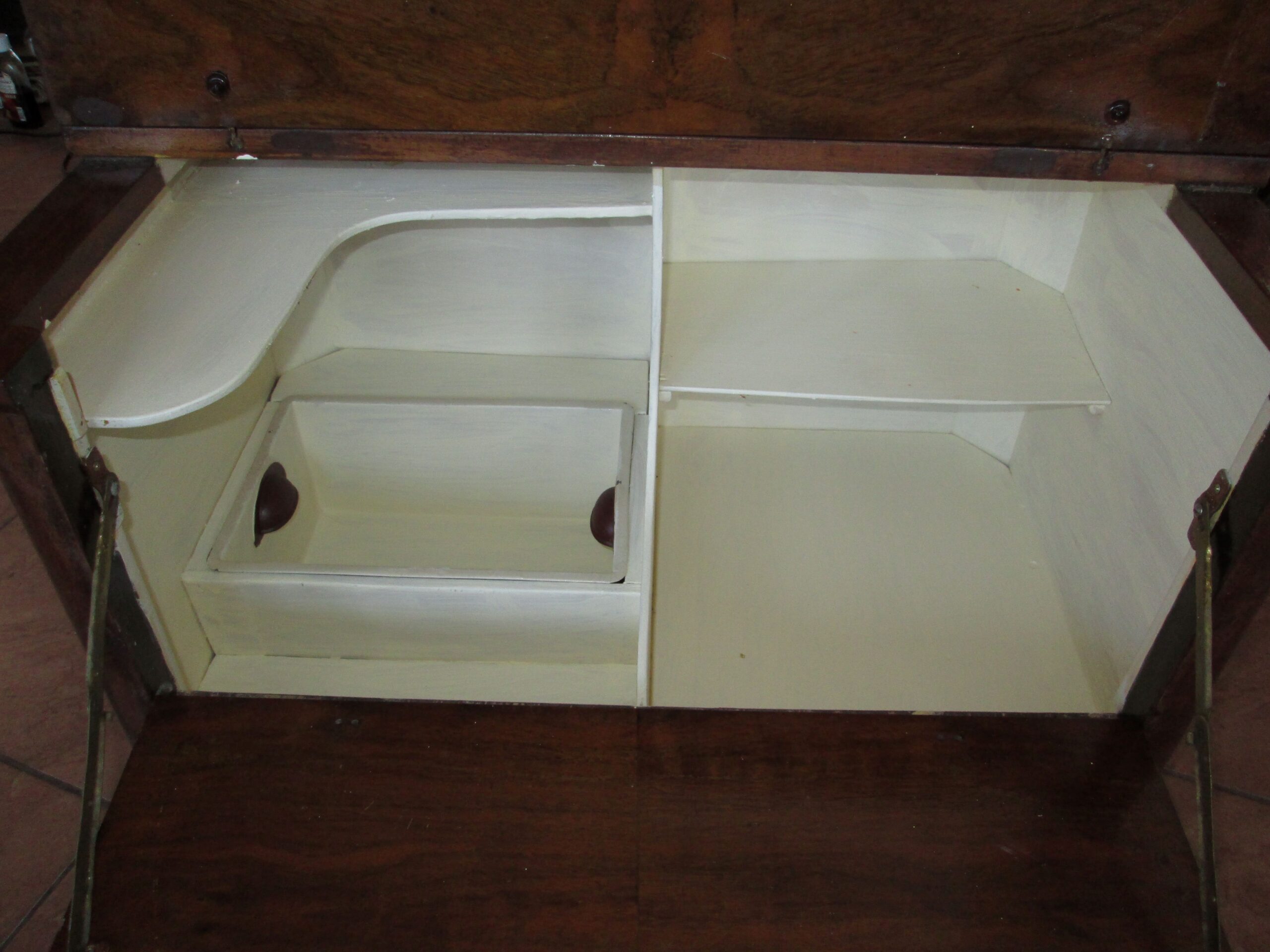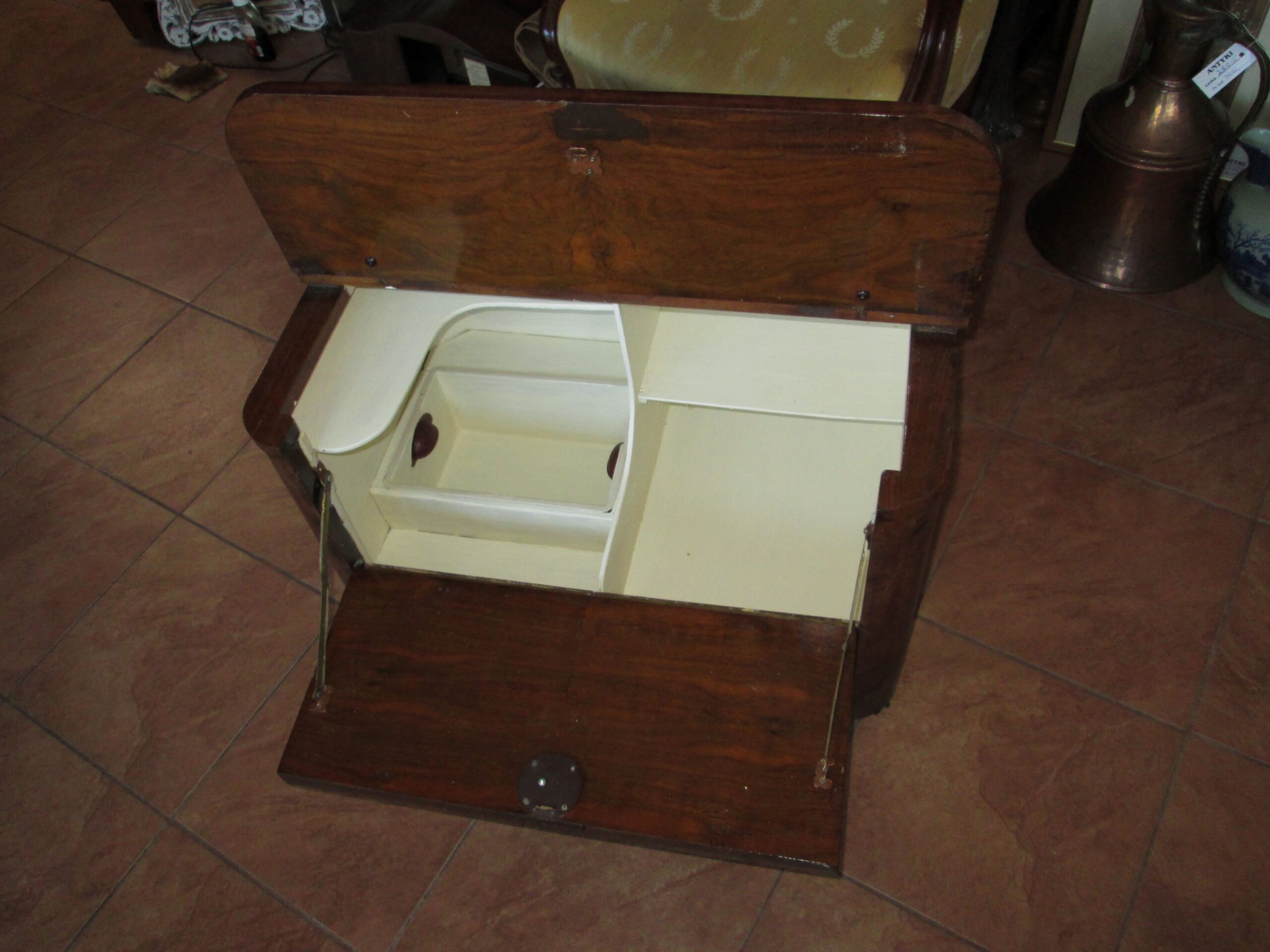 Ciekawostka mebel na kółkach wykonany w latach 30-40 tych ubiegłego wieku. Drewno w okleinie orzechowej. Górny blat uchylany do góry , przednia ścianka do przodu. W środku półeczki i jedna miseczka metalowa wkładana. Szerokość 70 cm , głębokość 50 cm , wysokość 48 cm. Stan oryginalny.Mebel został pokryty woskiem. Mebel w stylu Art deko.