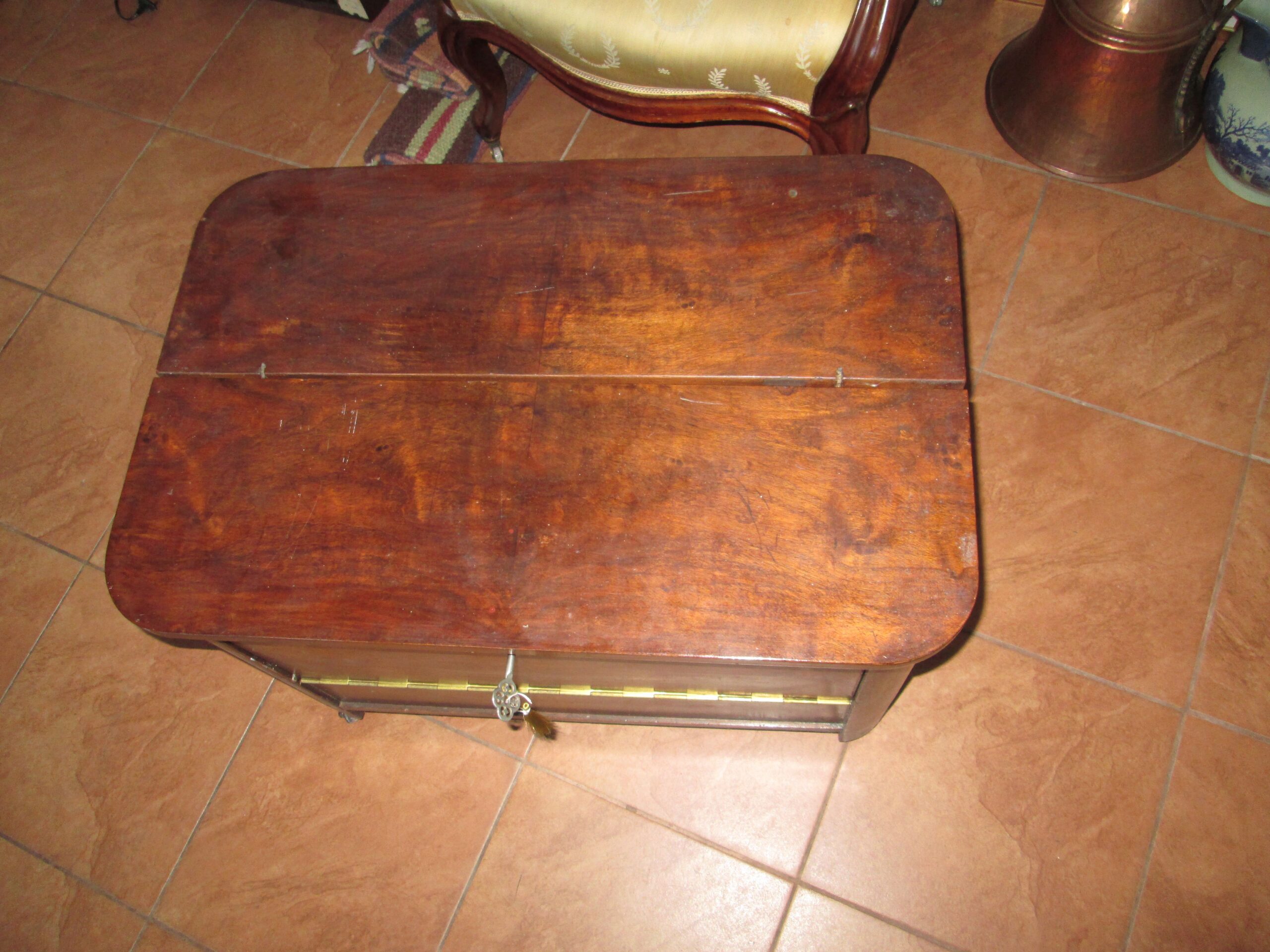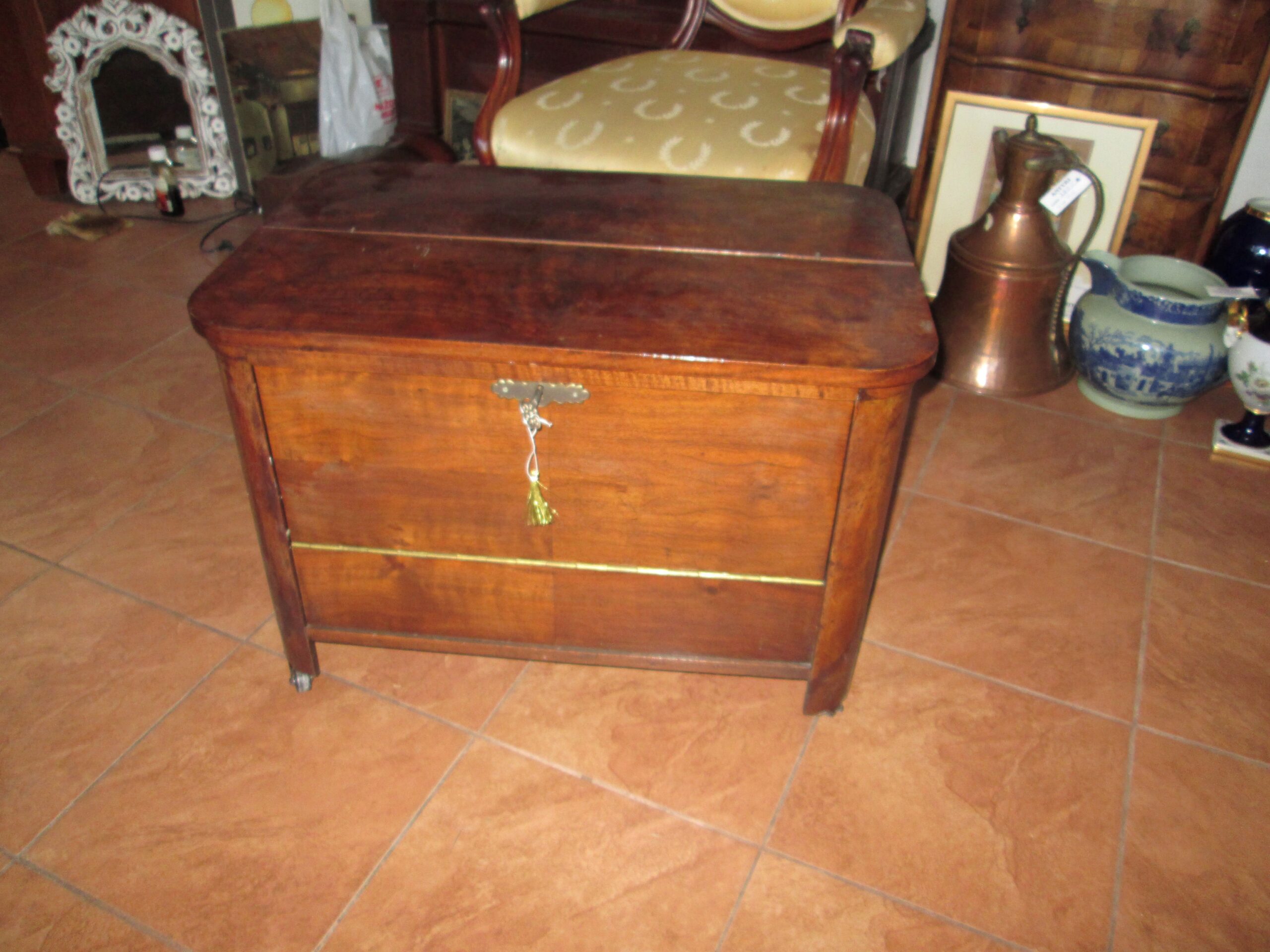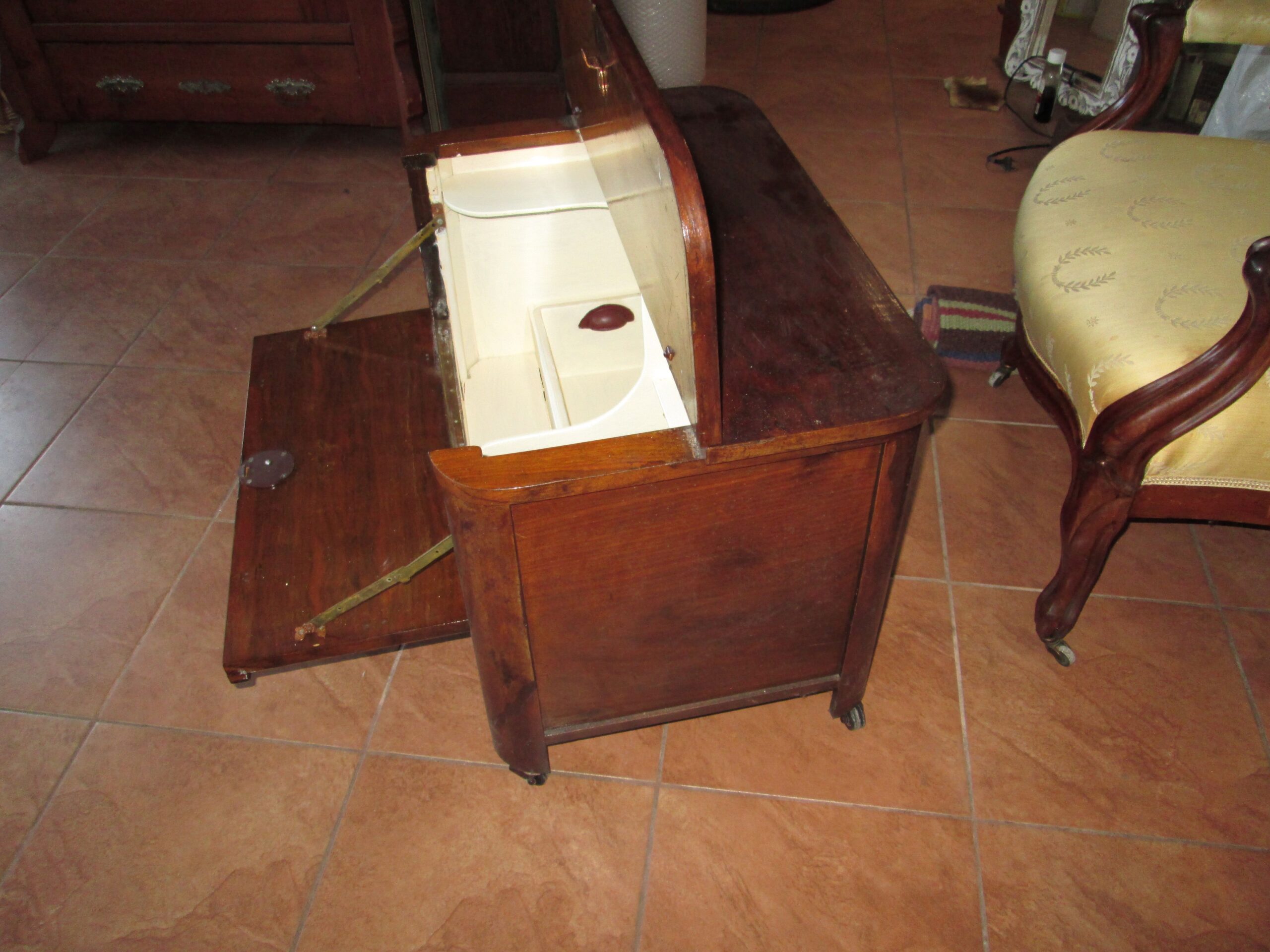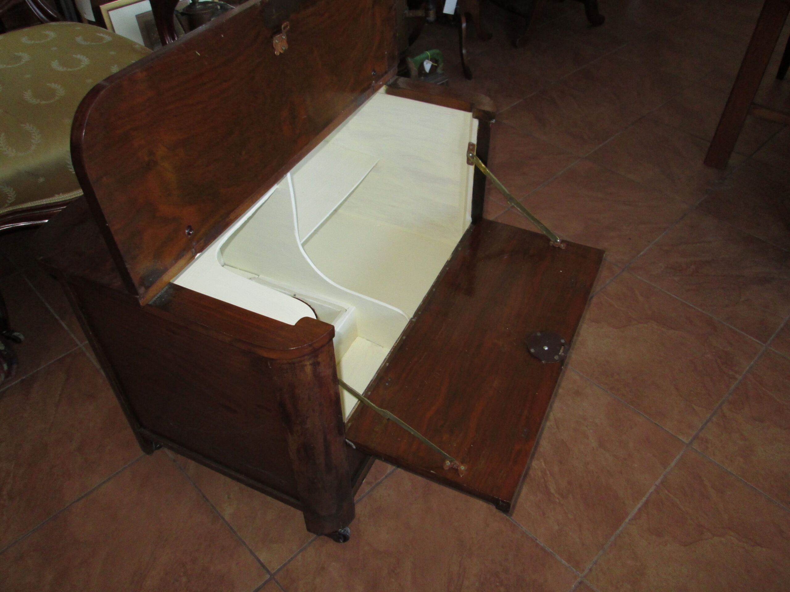 Ciekawostka mebel na kółkach wykonany w latach 30-40 tych ubiegłego wieku. Drewno w okleinie orzechowej. Górny blat uchylany do góry , przednia ścianka do przodu. W środku półeczki i jedna miseczka metalowa wkładana. Szerokość 70 cm , głębokość 50 cm , wysokość 48 cm. Stan oryginalny.Mebel został pokryty woskiem. Mebel w stylu Art deko.