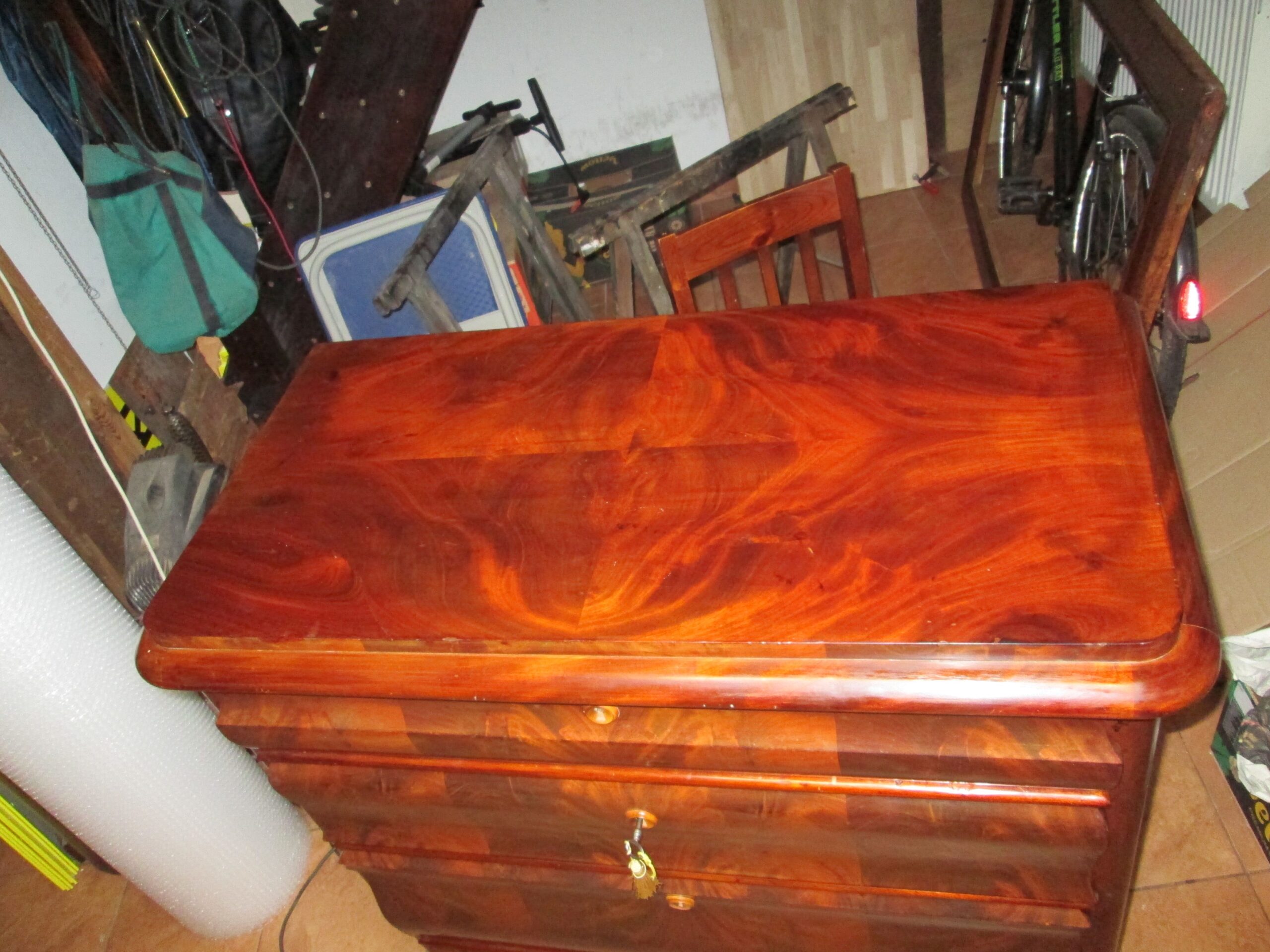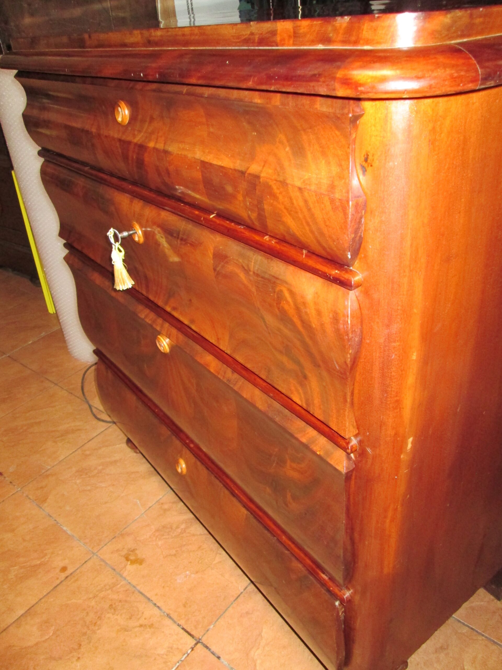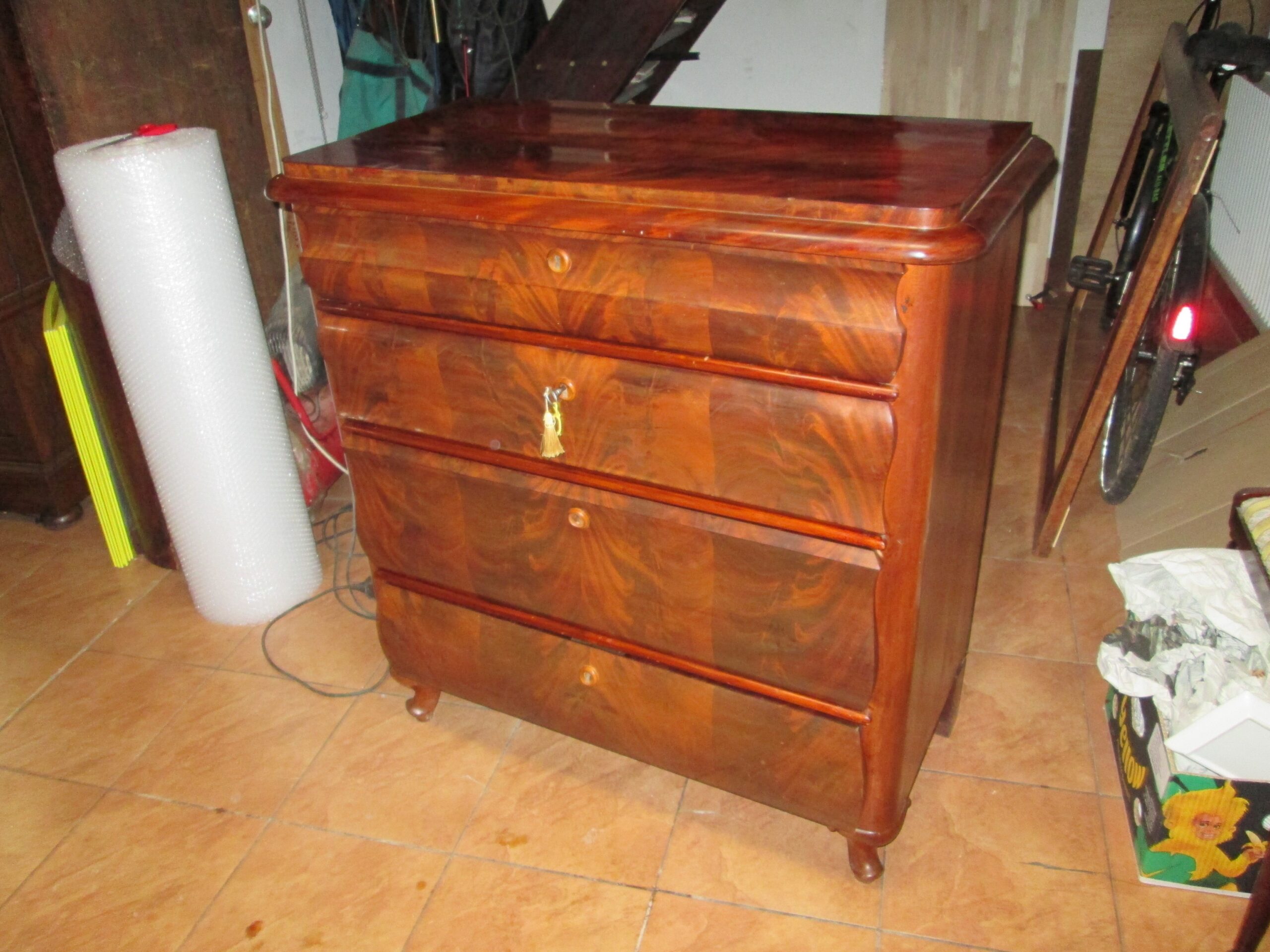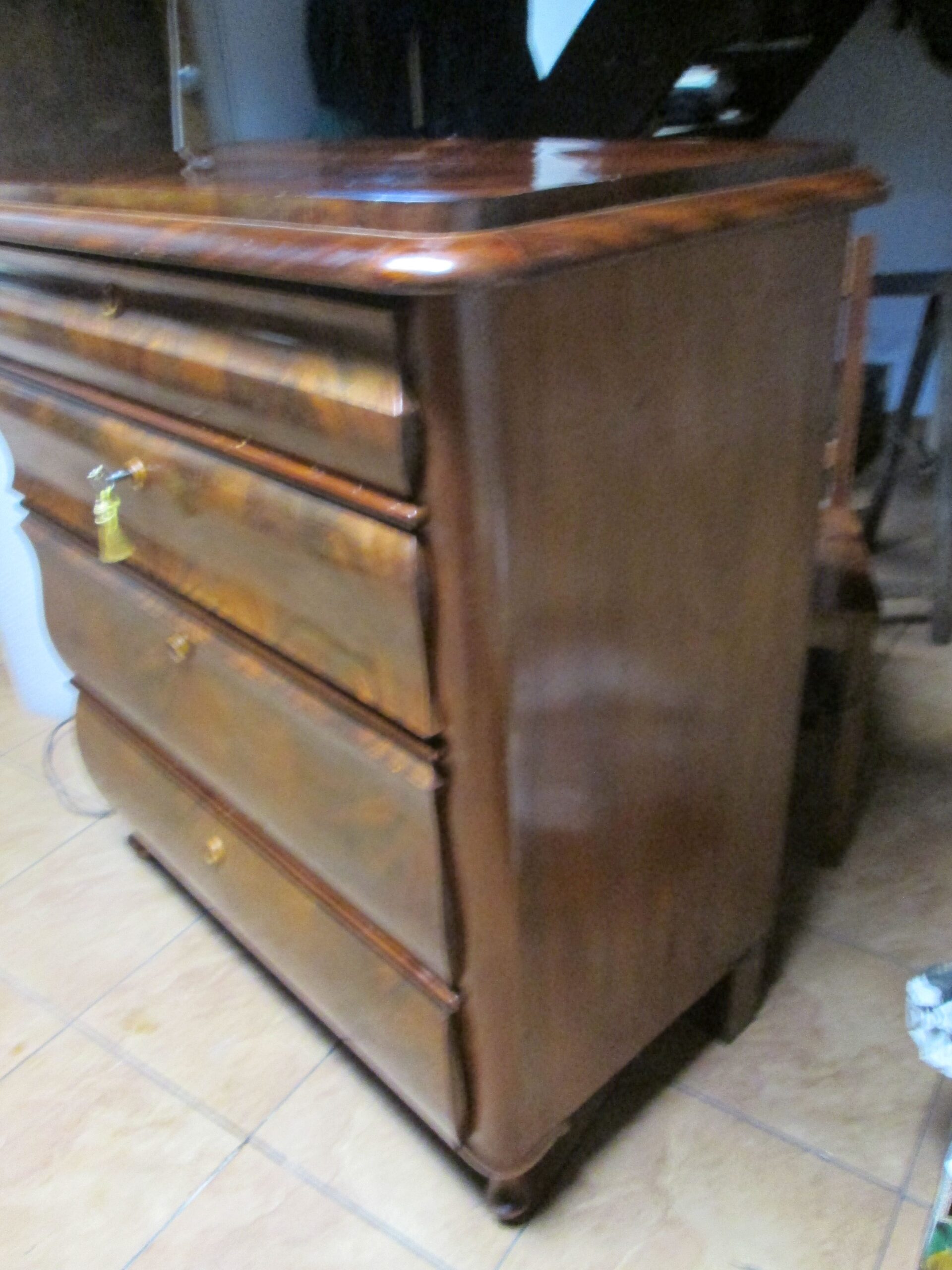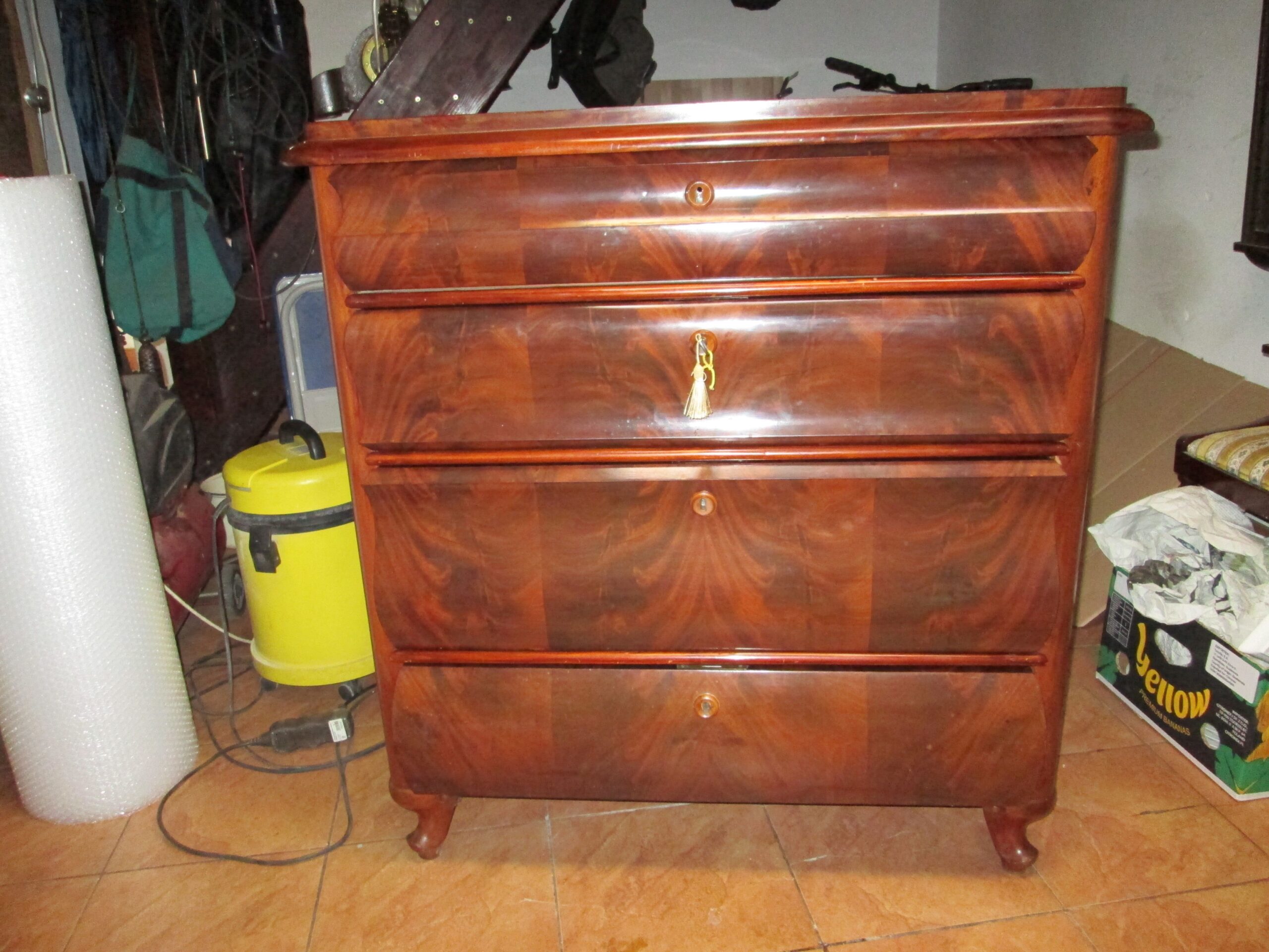 Oryginalna komoda z końca XIX wieku . Styl Ludwika Filipa. Konstrukcja z drewna iglastego okleinowana mahoniem.Mebel oryginalny z epoki. Szerokość 100 cm , wysokość 105 cm , głębokość 50 cm. 4 szuflady z zamkami sprawne. Mebel w dobrym stanie. Oryginalnie politurowany.