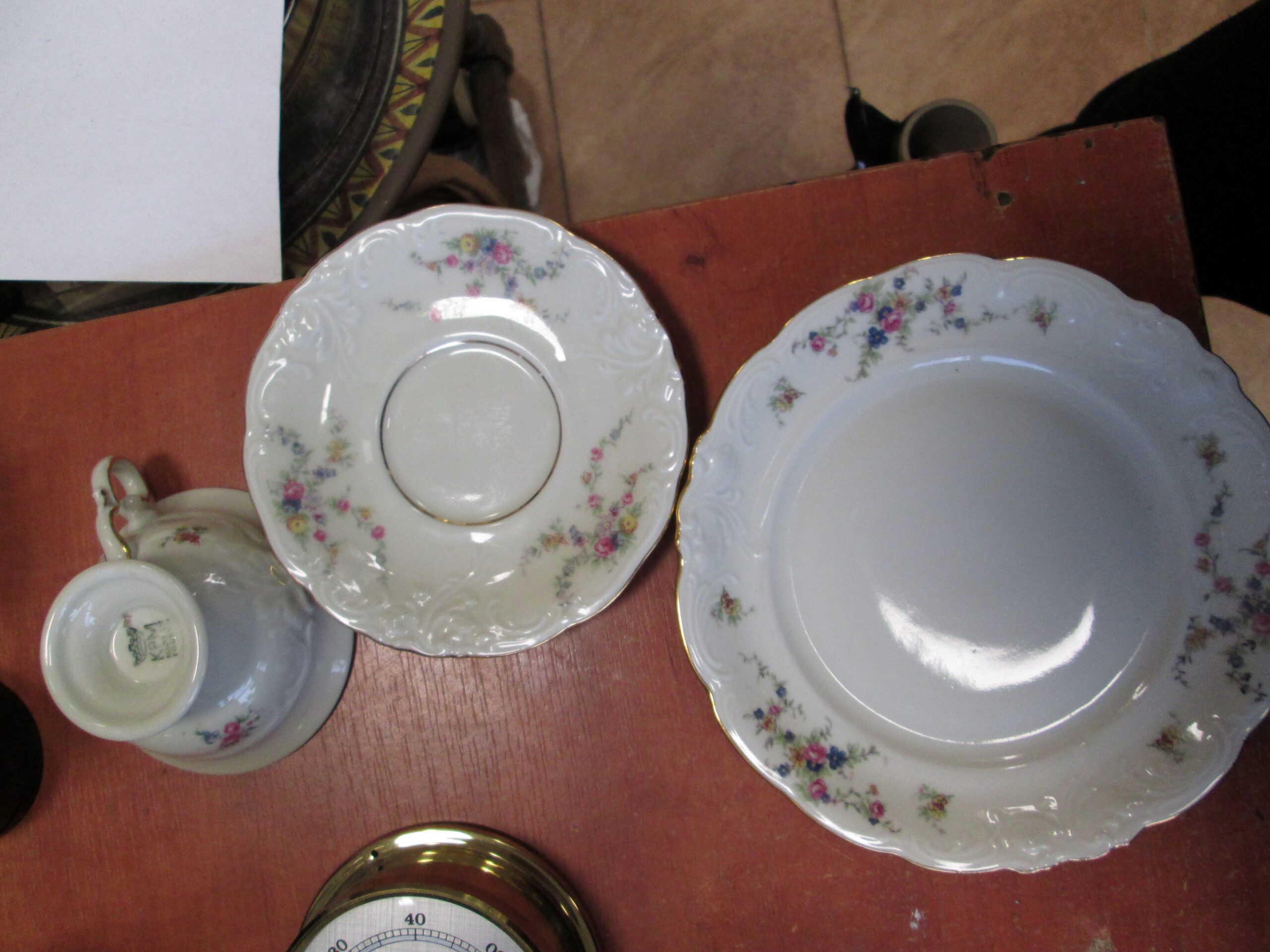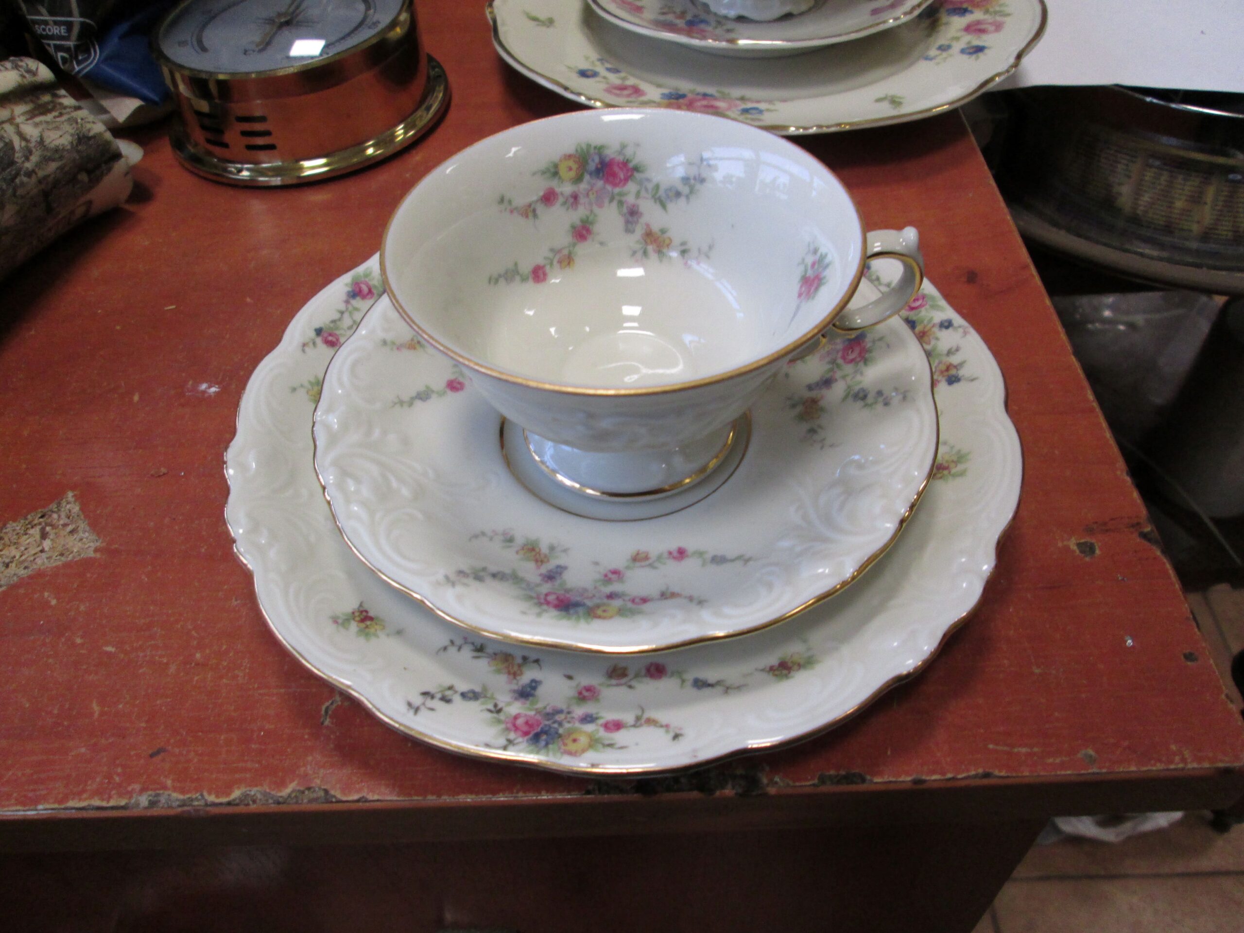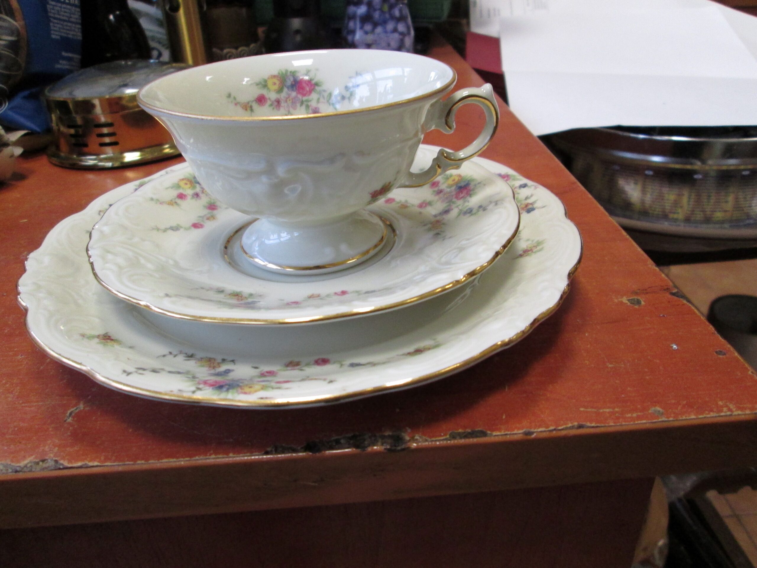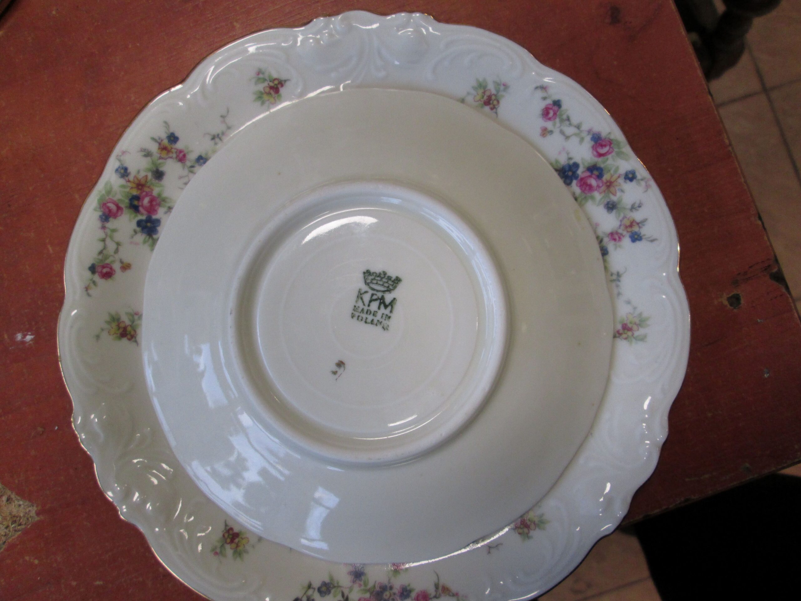 Porcelanowy komplet śniadaniowy. Wykonany w fabryce porcelany w Wałbrzychu w latach 50 tych. Sygnatura KPM Made in Poland. W skład kompletu wchodzi filiżanka , podstawka i talerzyk deserowy. Stan bardzo dobry.