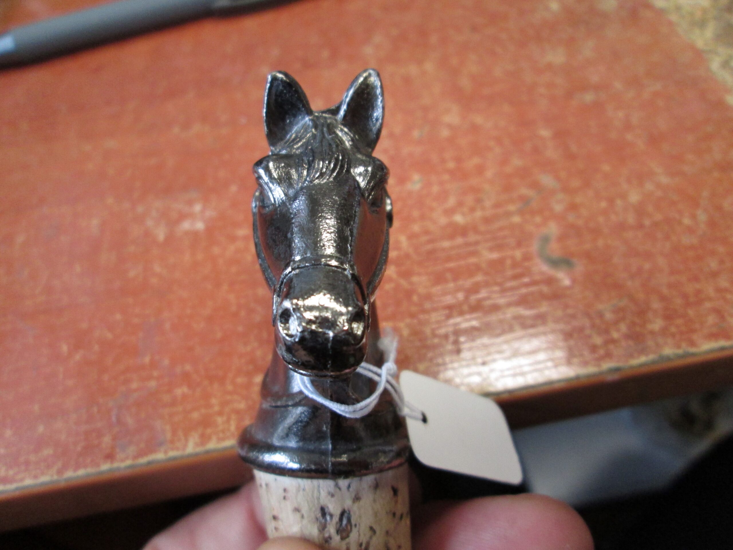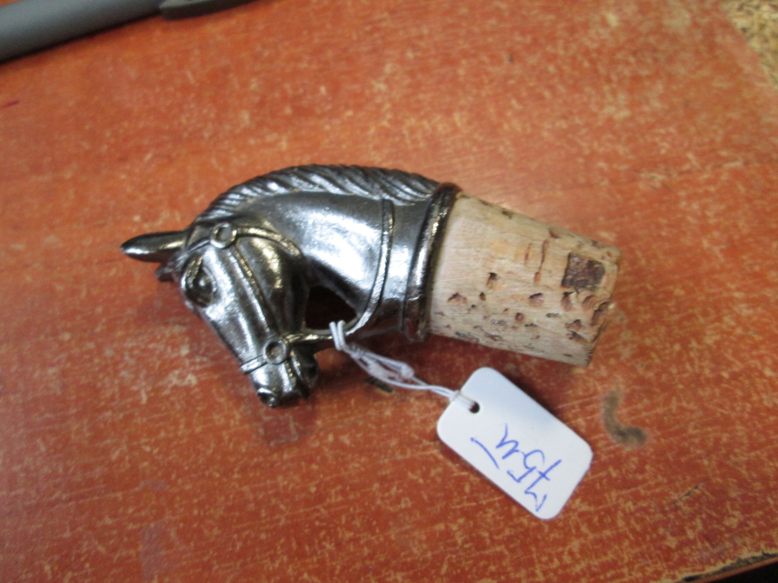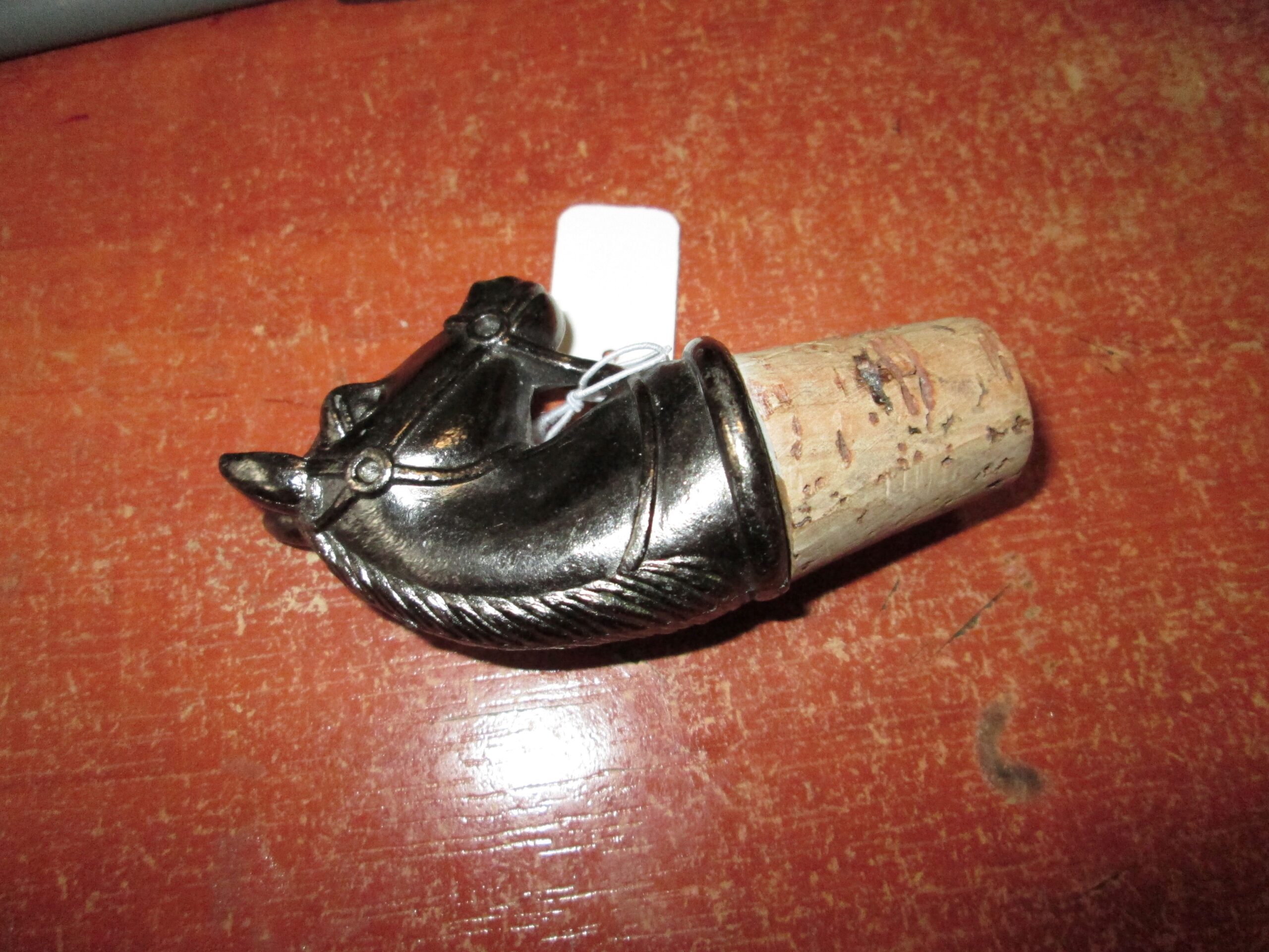Elegancka zatyczka do butelki wykonana z metalu srebrzonego .Głowa konia z uzdą . Długość 8.5 cm . Szerokość ok 4 cm. Stan bardzo dobry.
