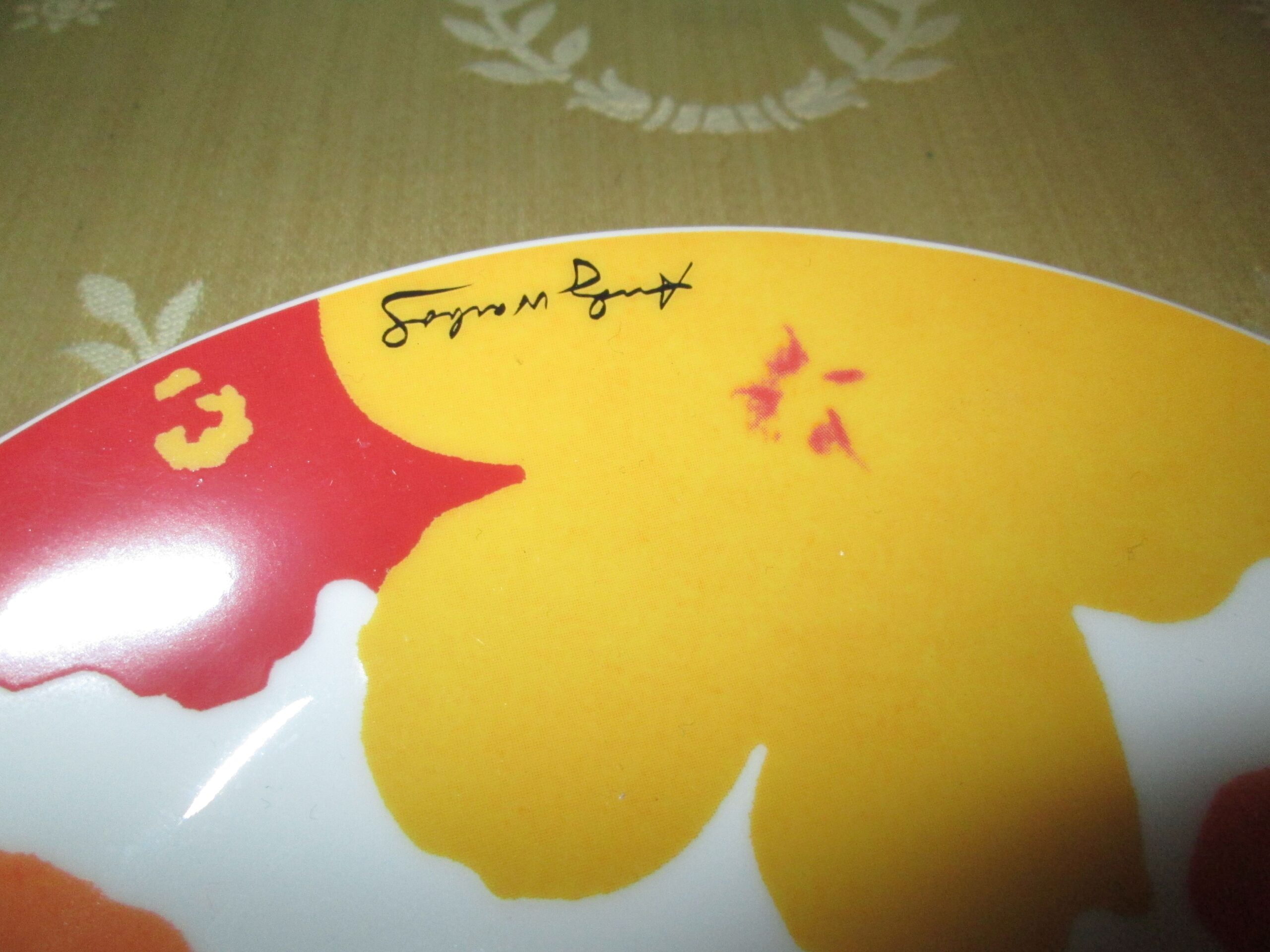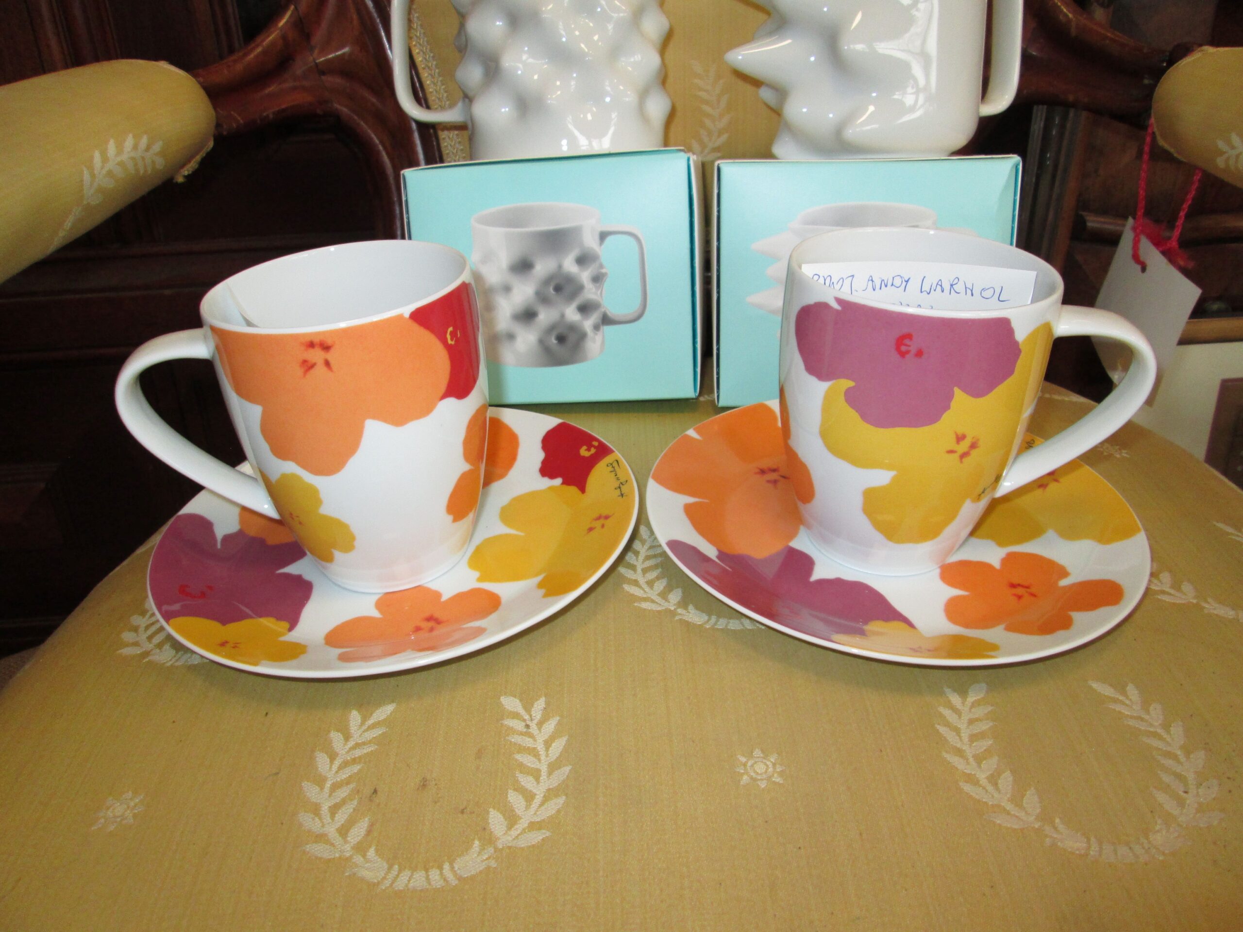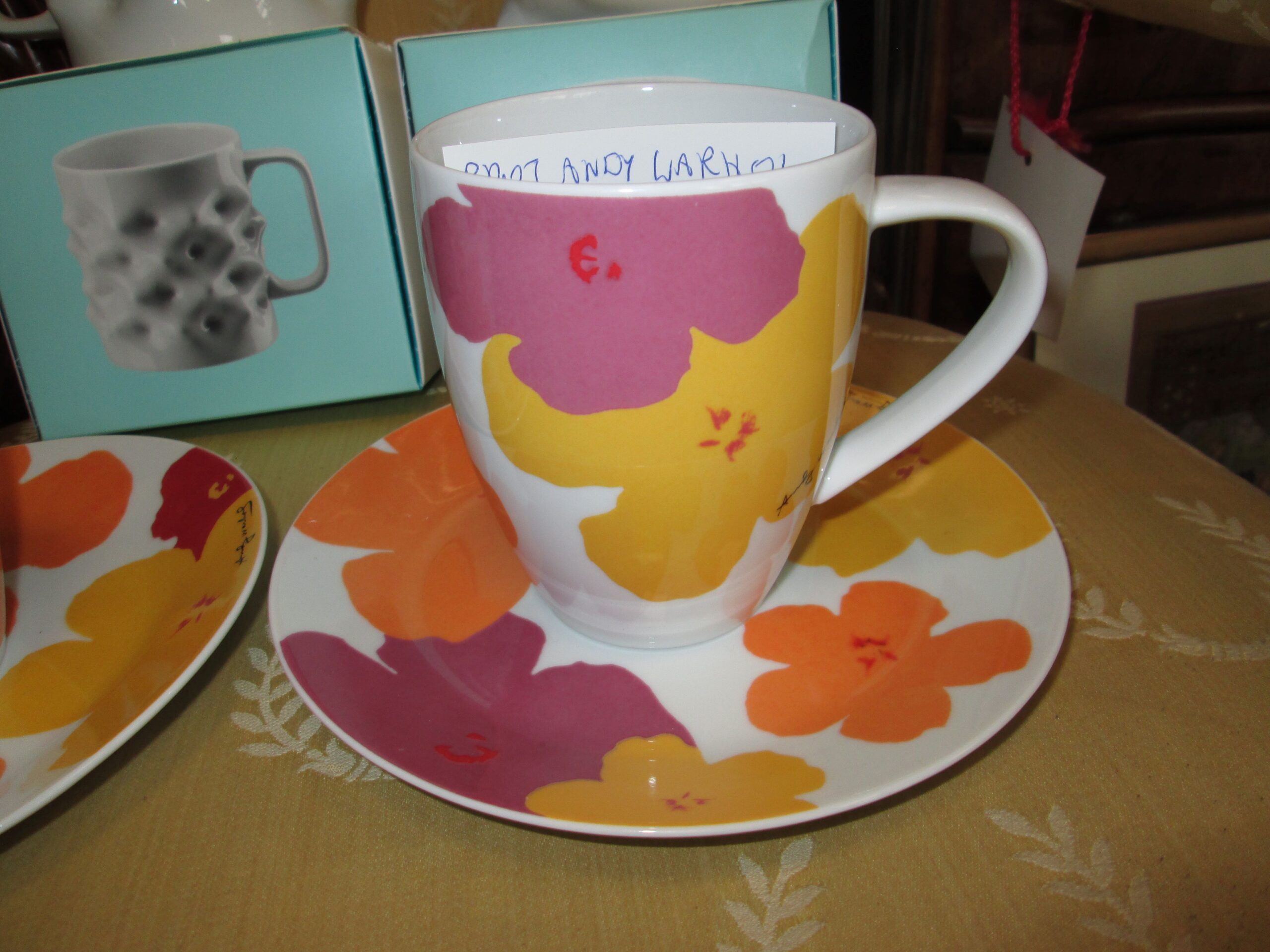 Porcelanowy kubek do kakao z talerzykiem deserowym. Wykonany w firmie Rosenthal. Dekoracje zaprojektował słynny artysta Pop artu Andy Warhol. Seria limitowana. Średnica kubka 8 cm, wysokość 10 cm , talerzyk o średnicy 17 cm. Na stanie posiadamy 2 komplety. Stan idealny.