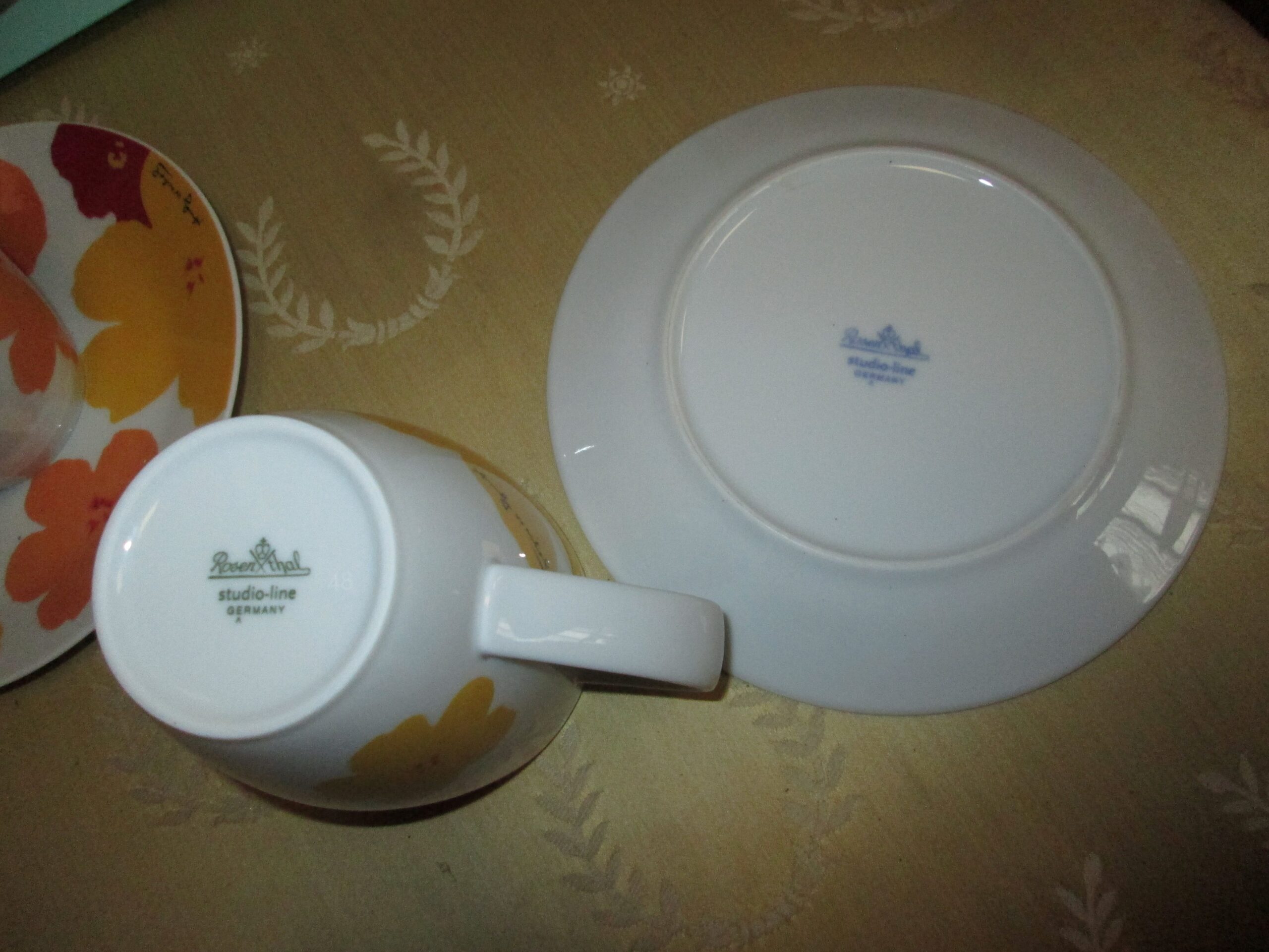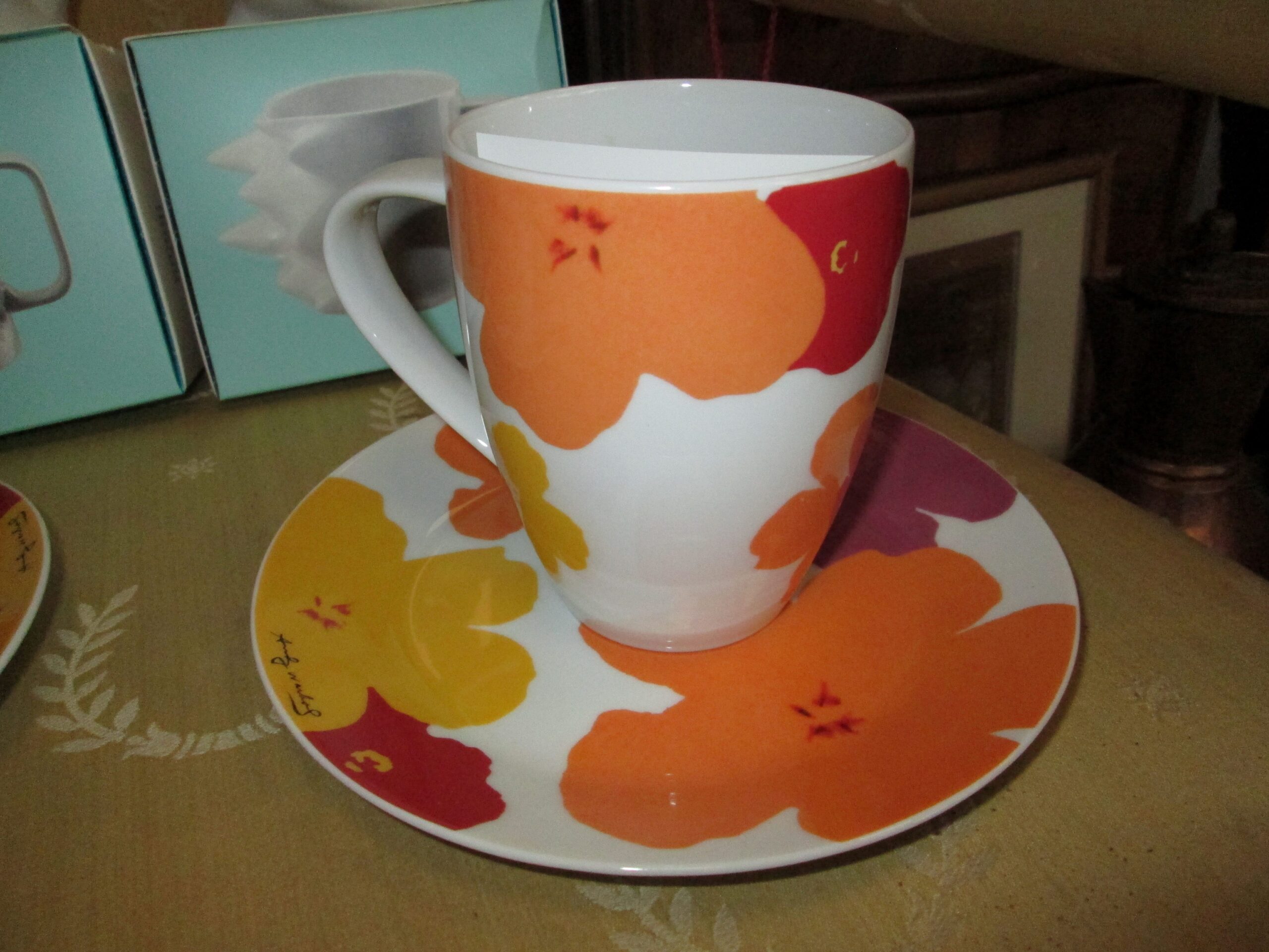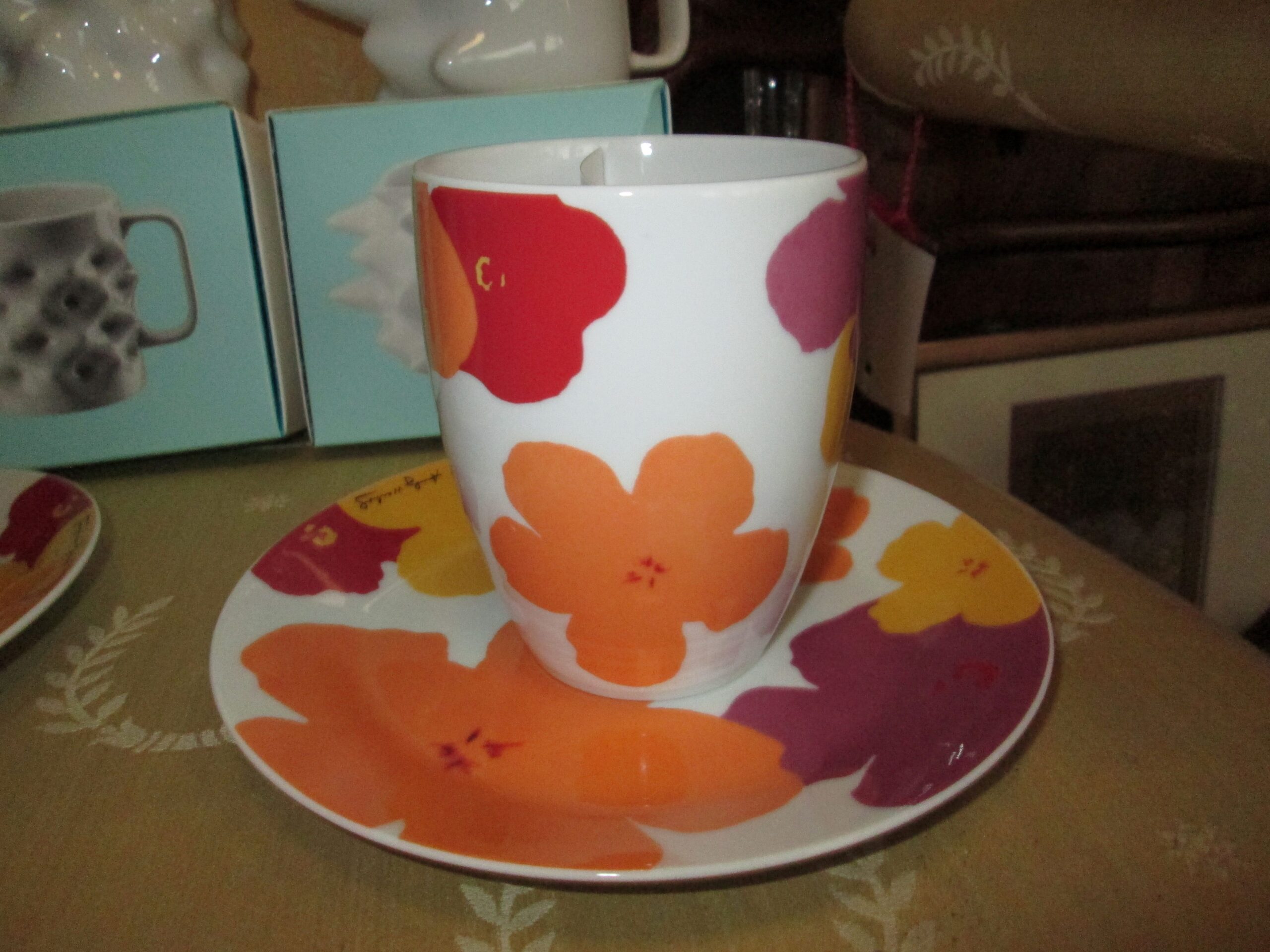 Porcelanowy kubek do kakao z talerzykiem deserowym. Wykonany w firmie Rosenthal. Dekoracje zaprojektował słynny artysta Pop artu Andy Warhol. Seria limitowana. Średnica kubka 8 cm, wysokość 10 cm , talerzyk o średnicy 17 cm. Na stanie posiadamy 2 komplety. Stan idealny.