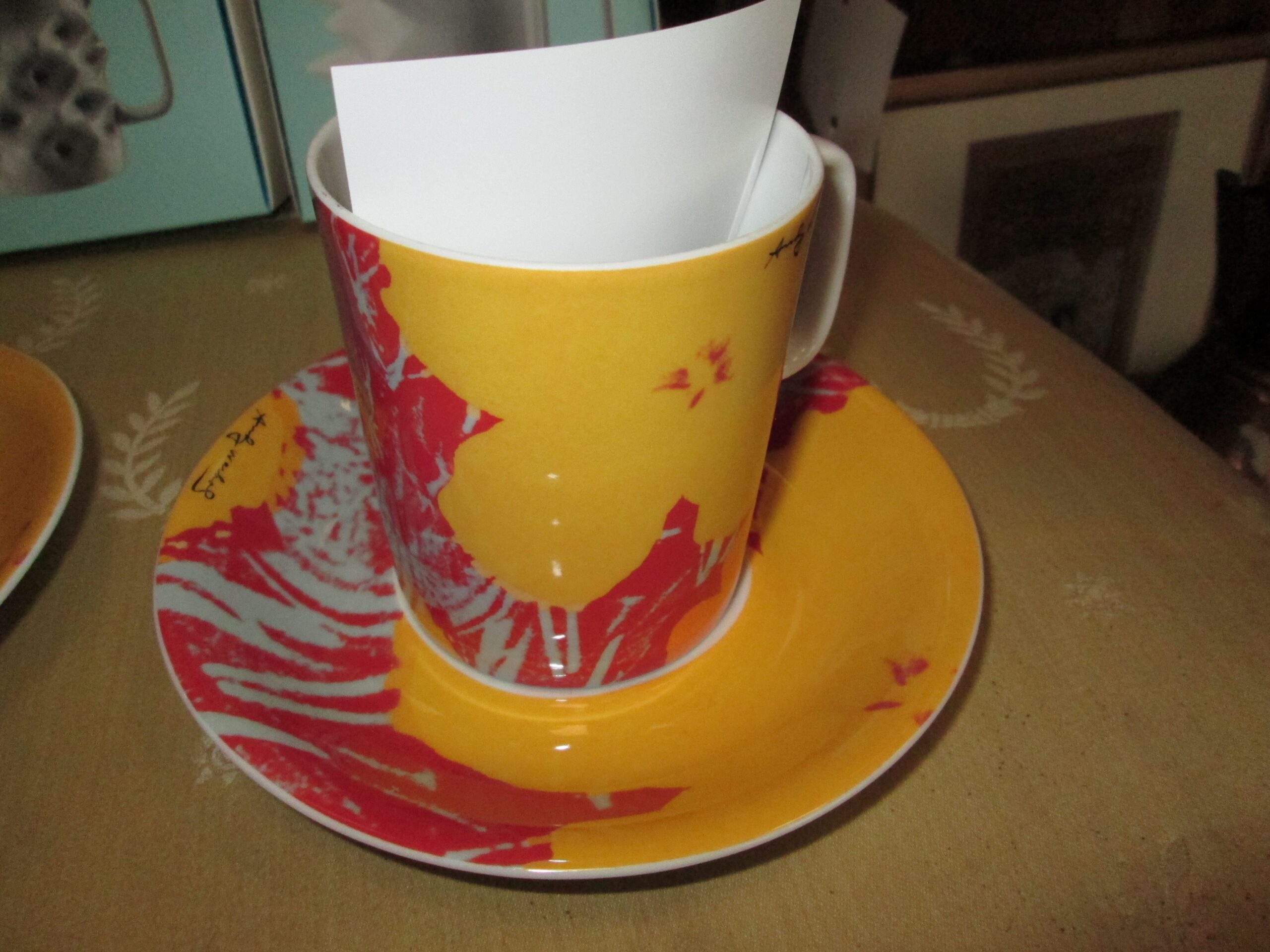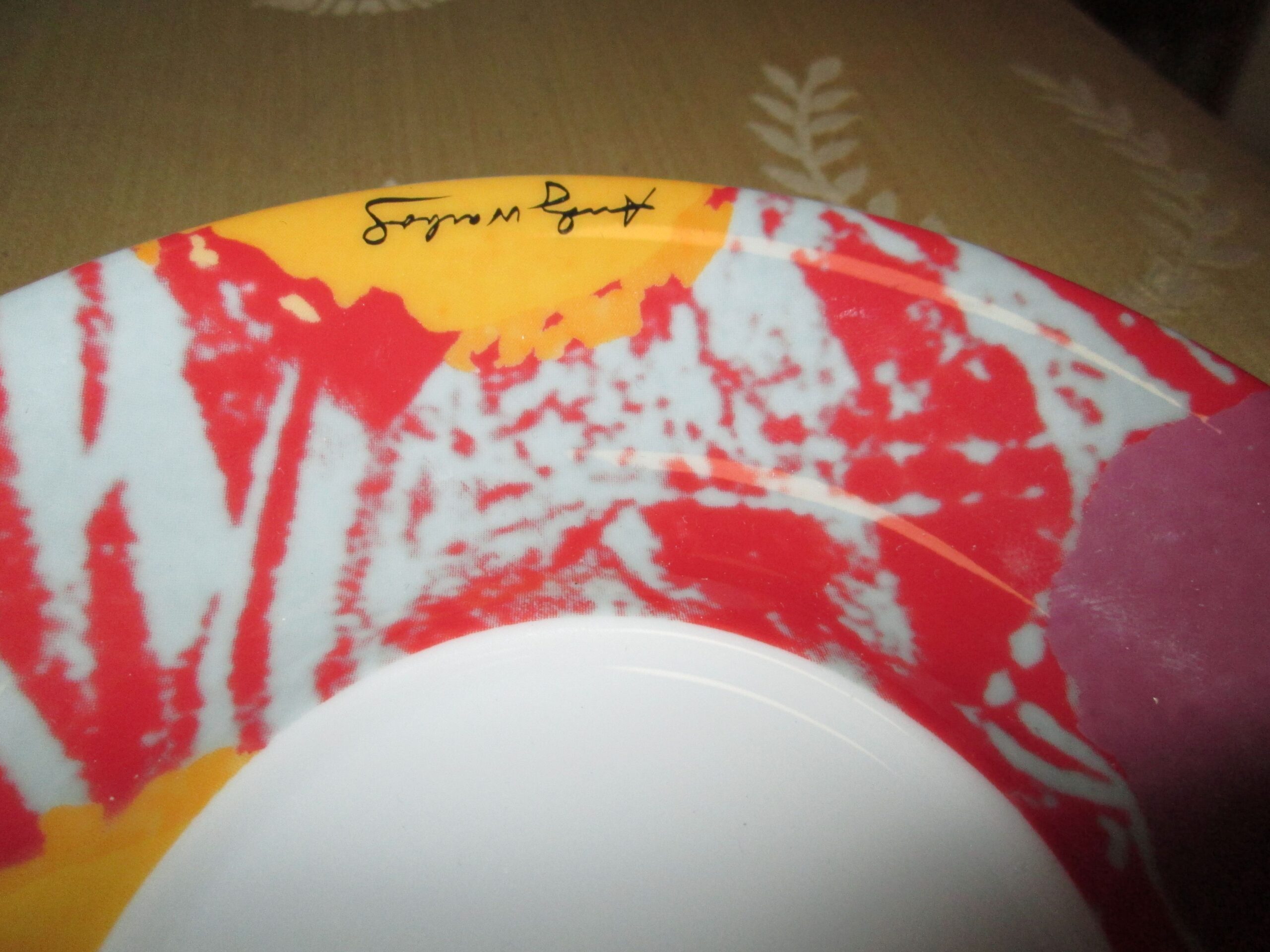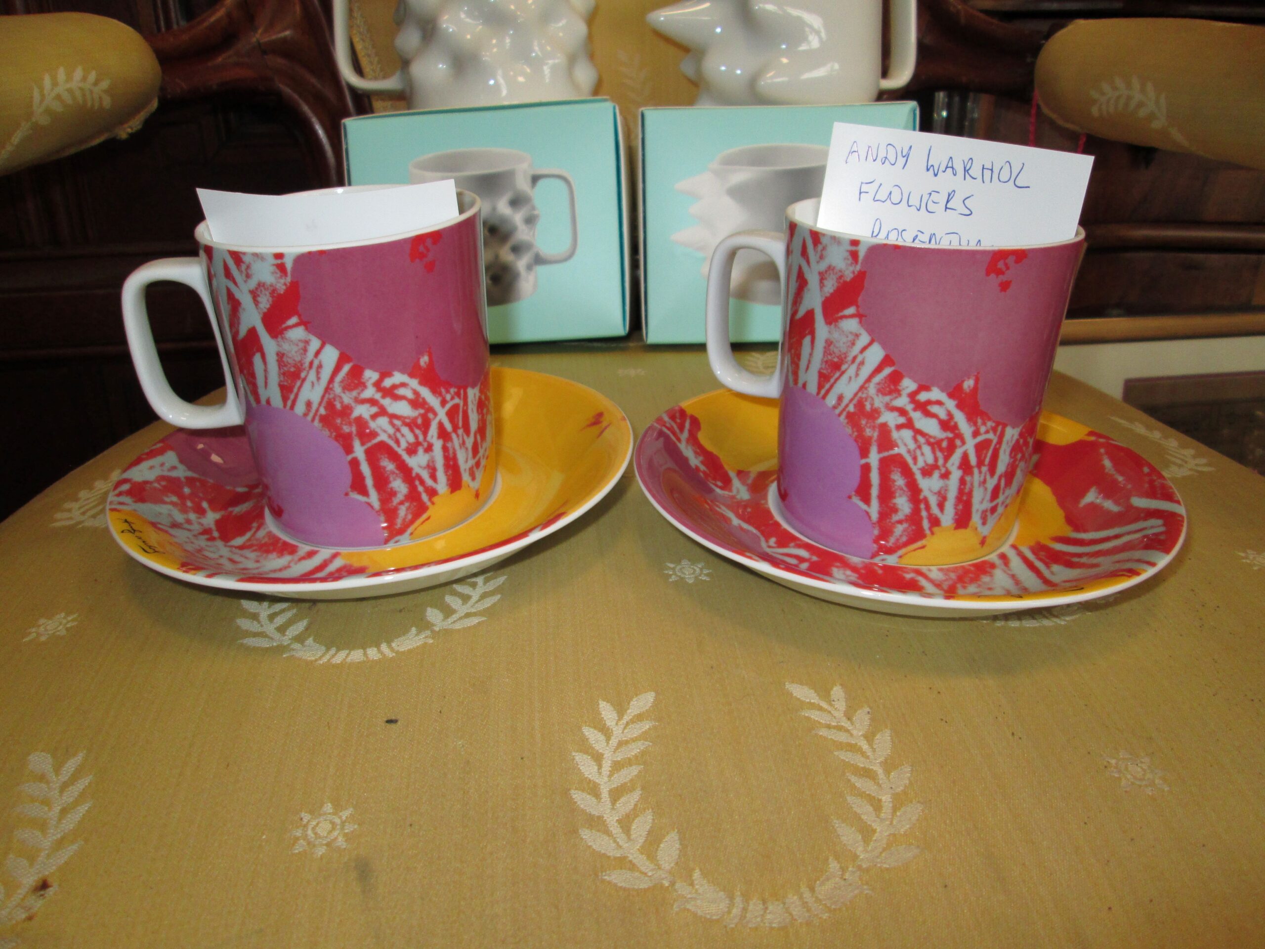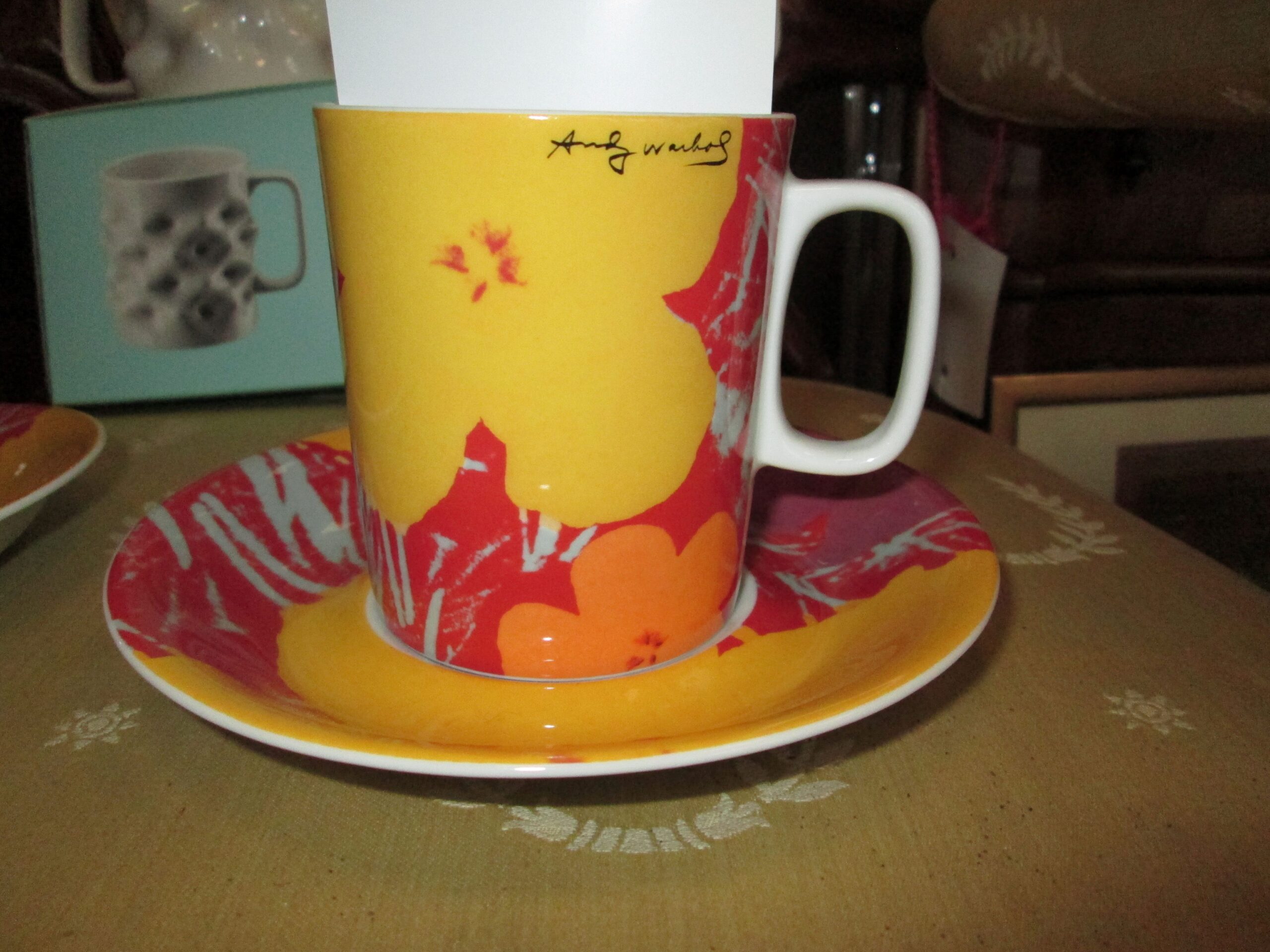 Porcelanowy kubek z talerzykiem do kawy lub herbaty.Wykonany w firmie Rosenthal. Projekt dekoracji zwany Kwiaty wykonał Andy Warhol , słynny artysta Pop Art. Średnica kubka 7.5 cm ,wysokość 9 cm , Średnica talerzyka 15.5 cm . Stan witrynowy idealny. Na stanie 2 komplety.