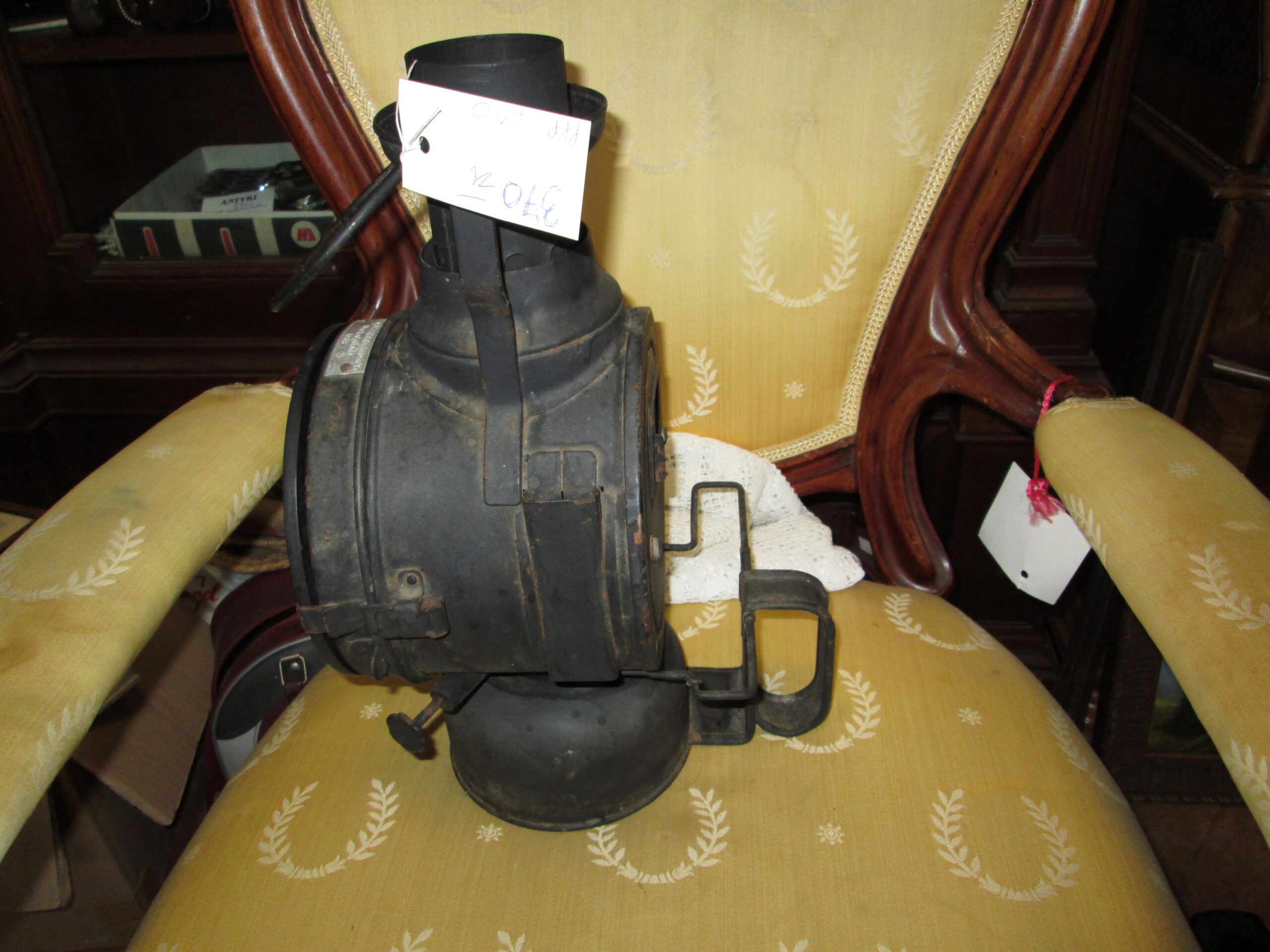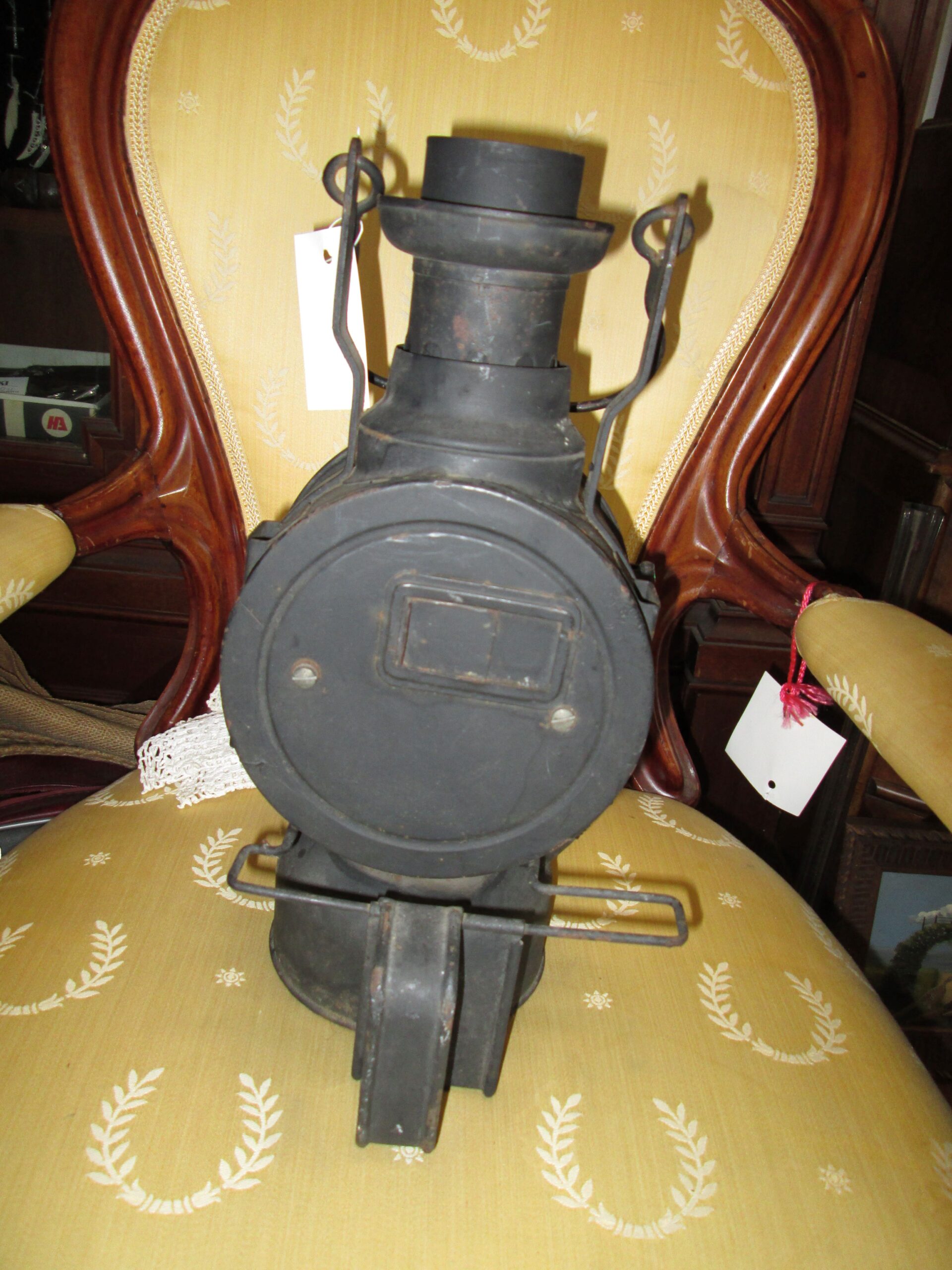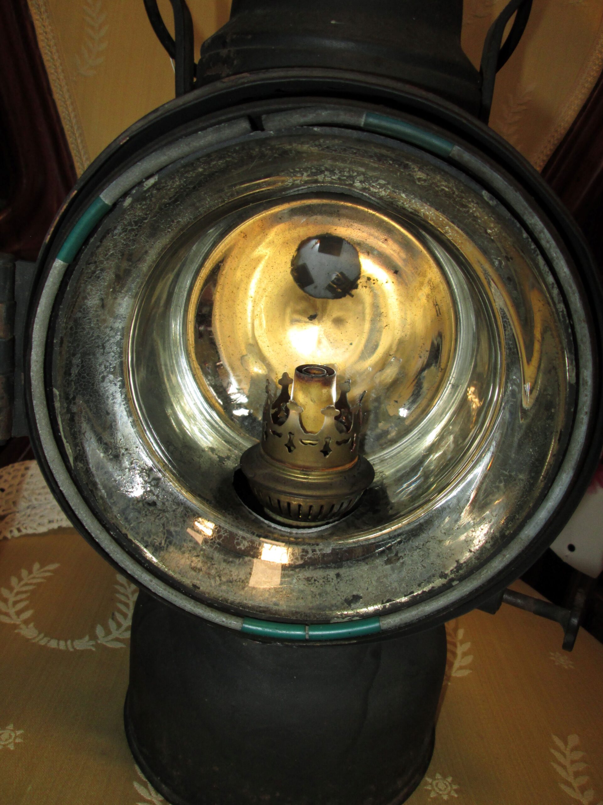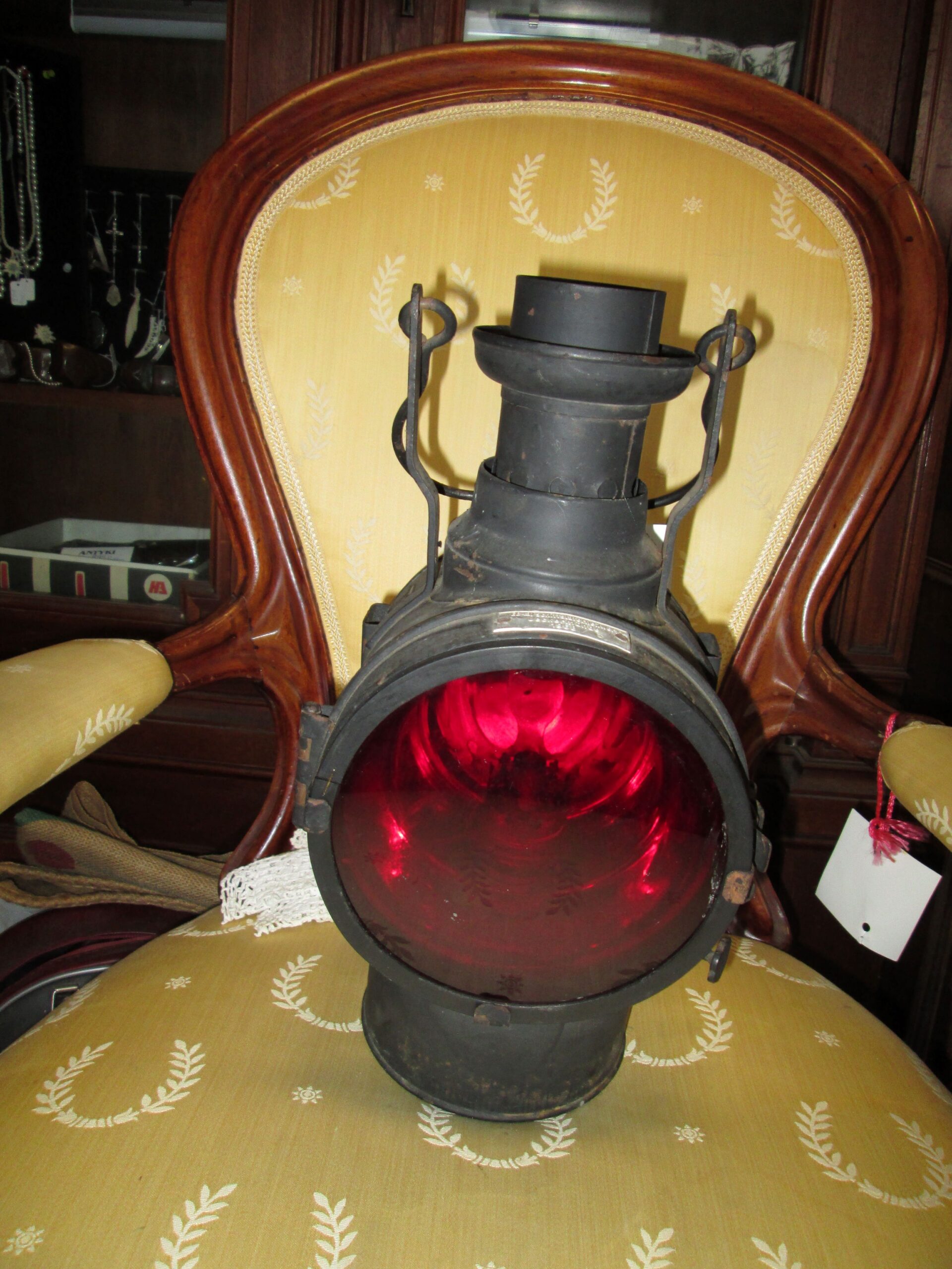 Lampa kolejowa z 1966 roku (tabliczka znamionowa). Wykonana z metalu malowanego na czarno. Posiada oryginalny wkład na naftę. Czerwone szkło. Uchwyty tylne do mocowania. Wysokość 37 cm , szerokość ok 20 cm , głębokość ok 24 cm. Gratka dla miłośników kolei.