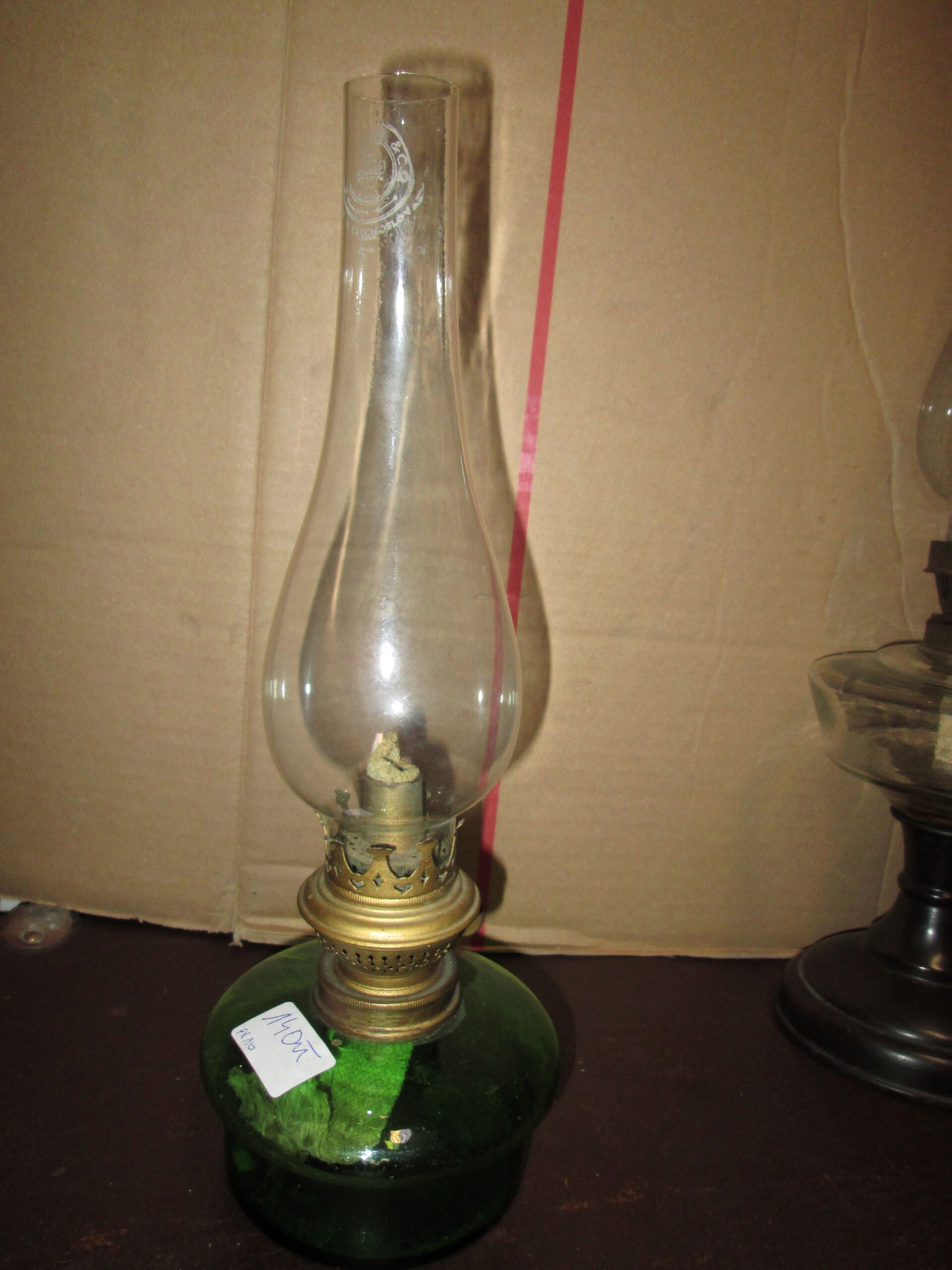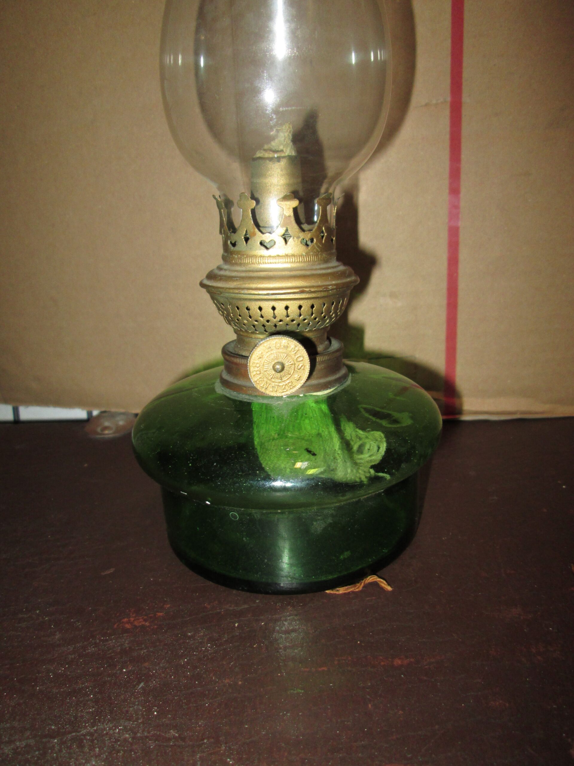 Niewielka lampa naftowa ze szklanym zbiornikiem w kolorze zieleni butelkowej, Brenner firmy Kosmos. Wykonana w latach 30 tych ubiegłego wieku. W pełni sprawna działająca. Cylinder oryginalny z epoki sygnowany. Wysokość lampy z cylindrem 31 cm ,średnica zbiornika ok 11 cm.