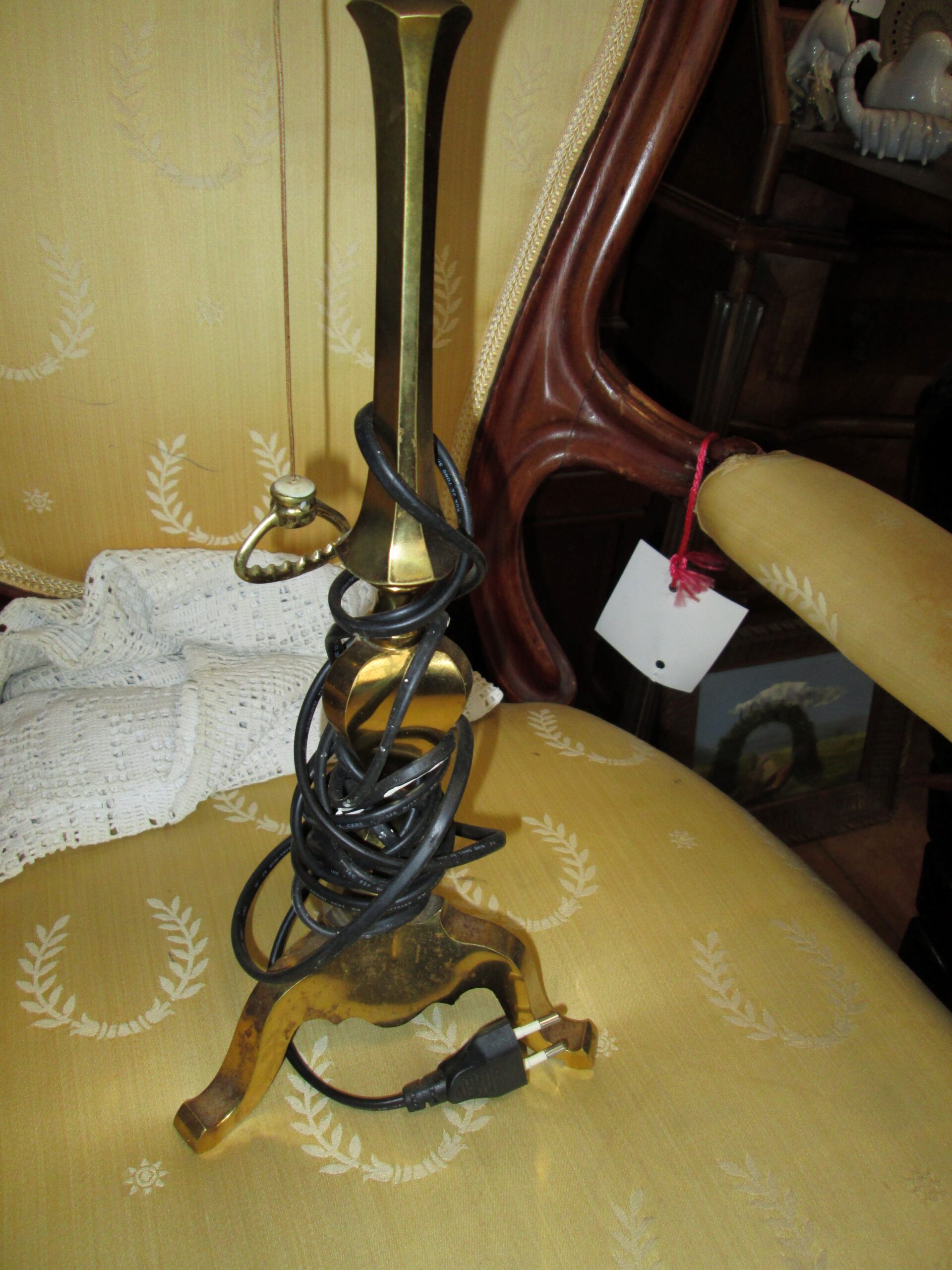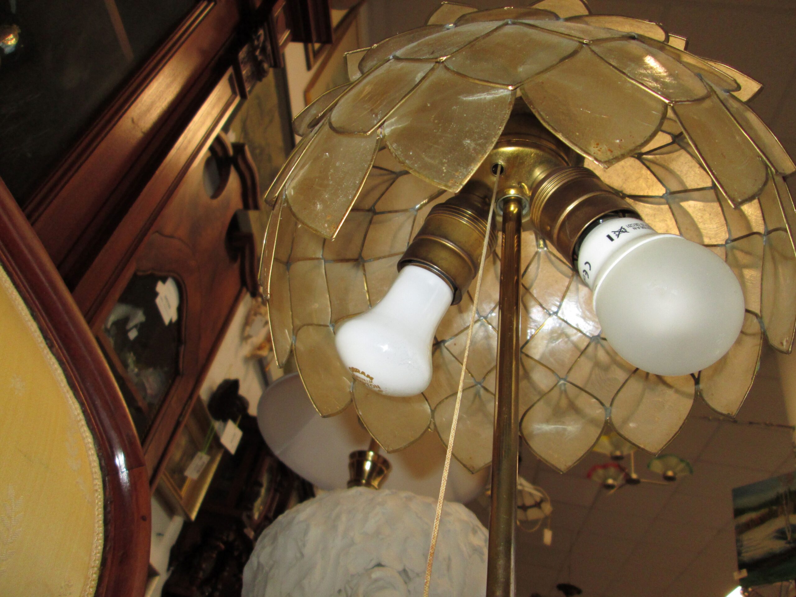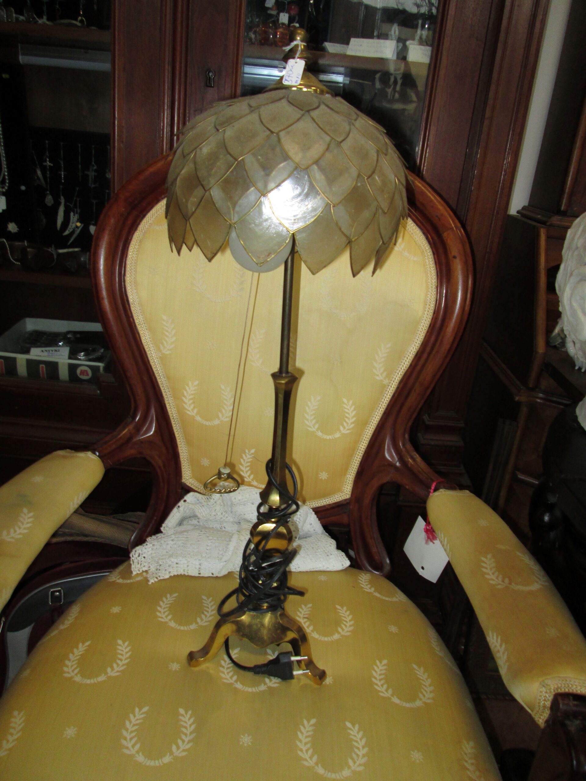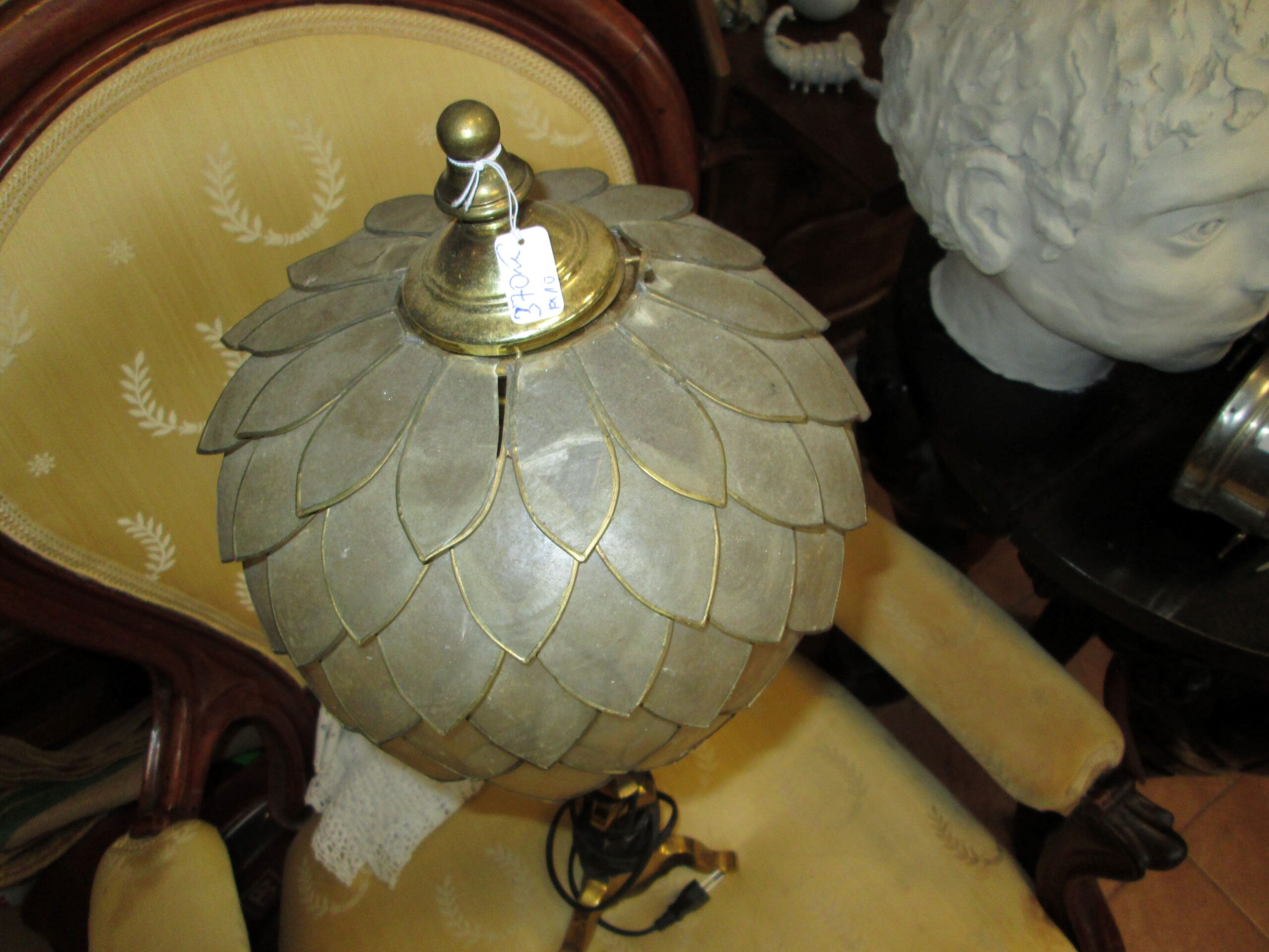 Lampa stojąca stołowa lub na komodę. Podstawa wykonana z mosiądzu. Klosz z rybiej łuski w ciekawym kształcie kuli. Oprawione w ramki mosiądzu. 2 żarówki włączane pojedynczo. Włącznik na sznureczku. Wysokość 65 cm ,średnica 22 cm. Świetny element uzupełniający do ładnego wnętrza.
