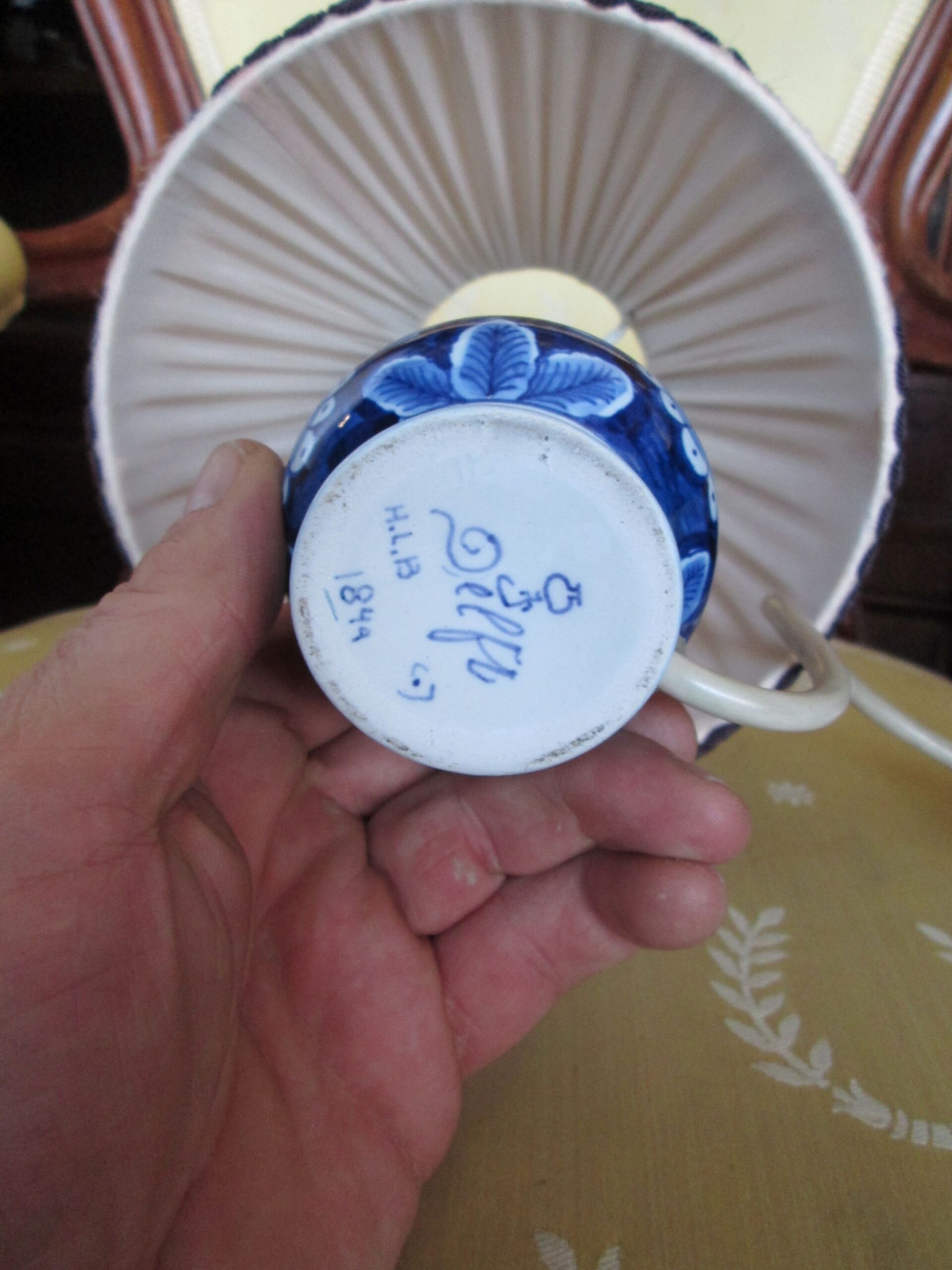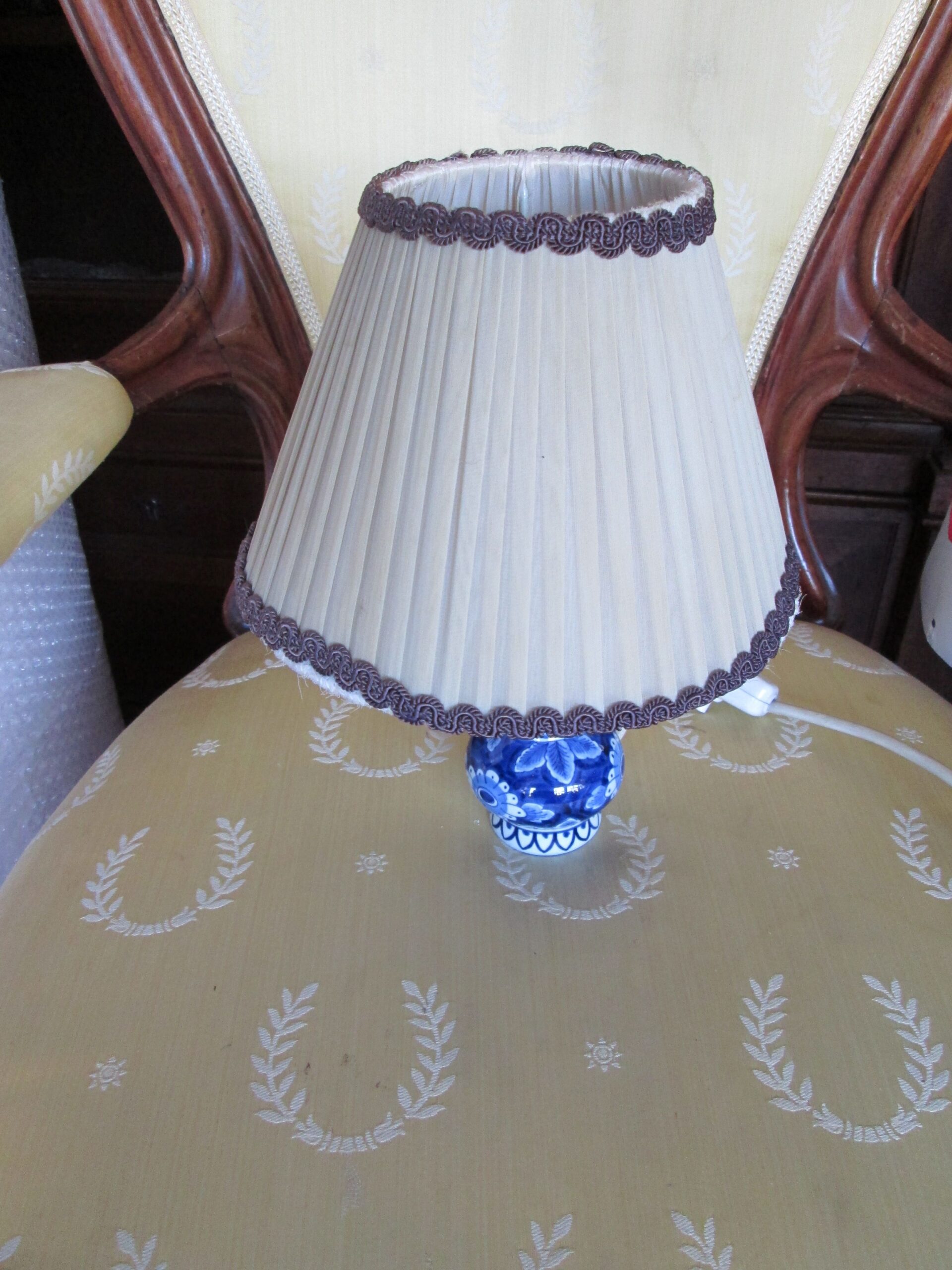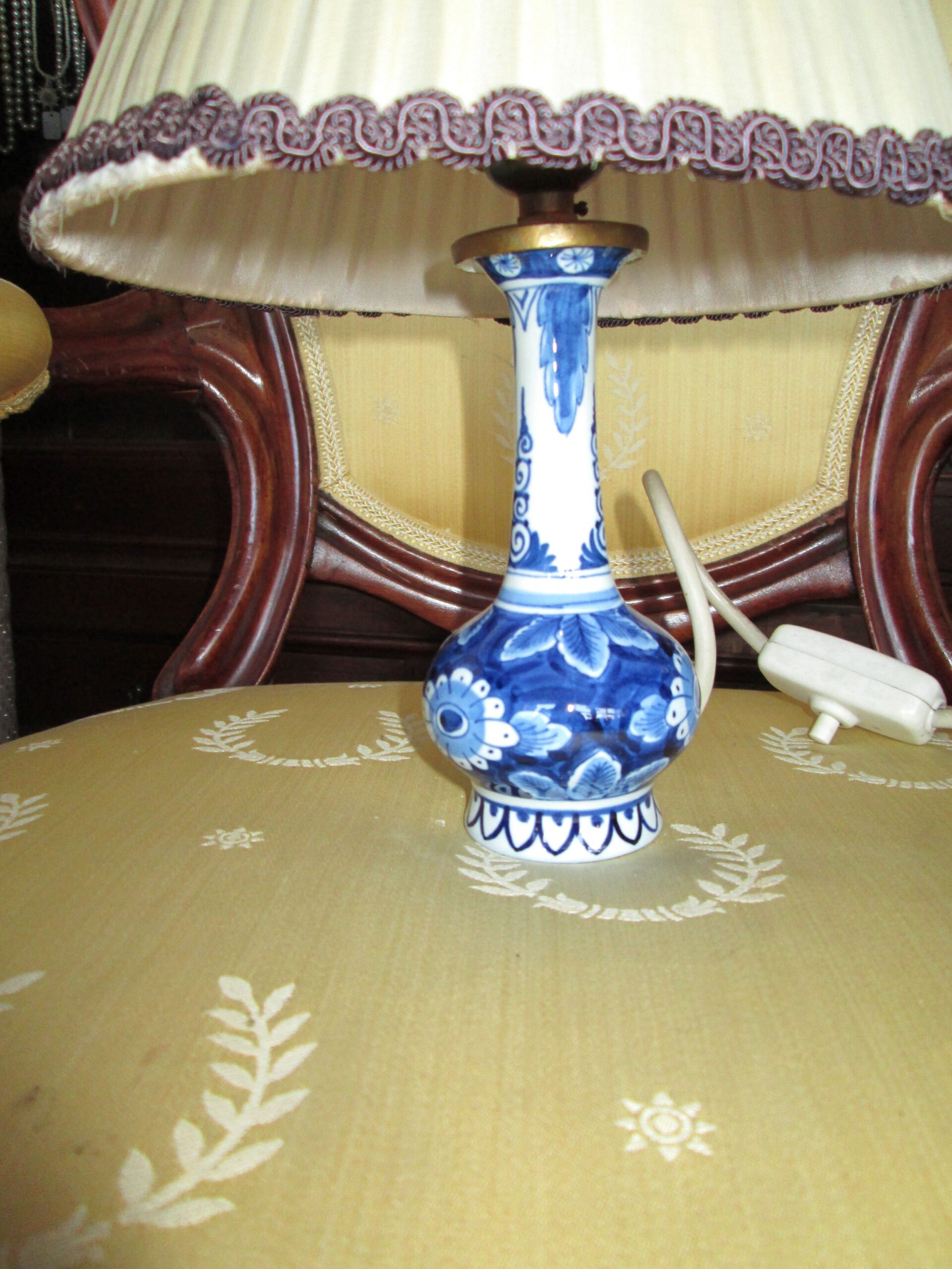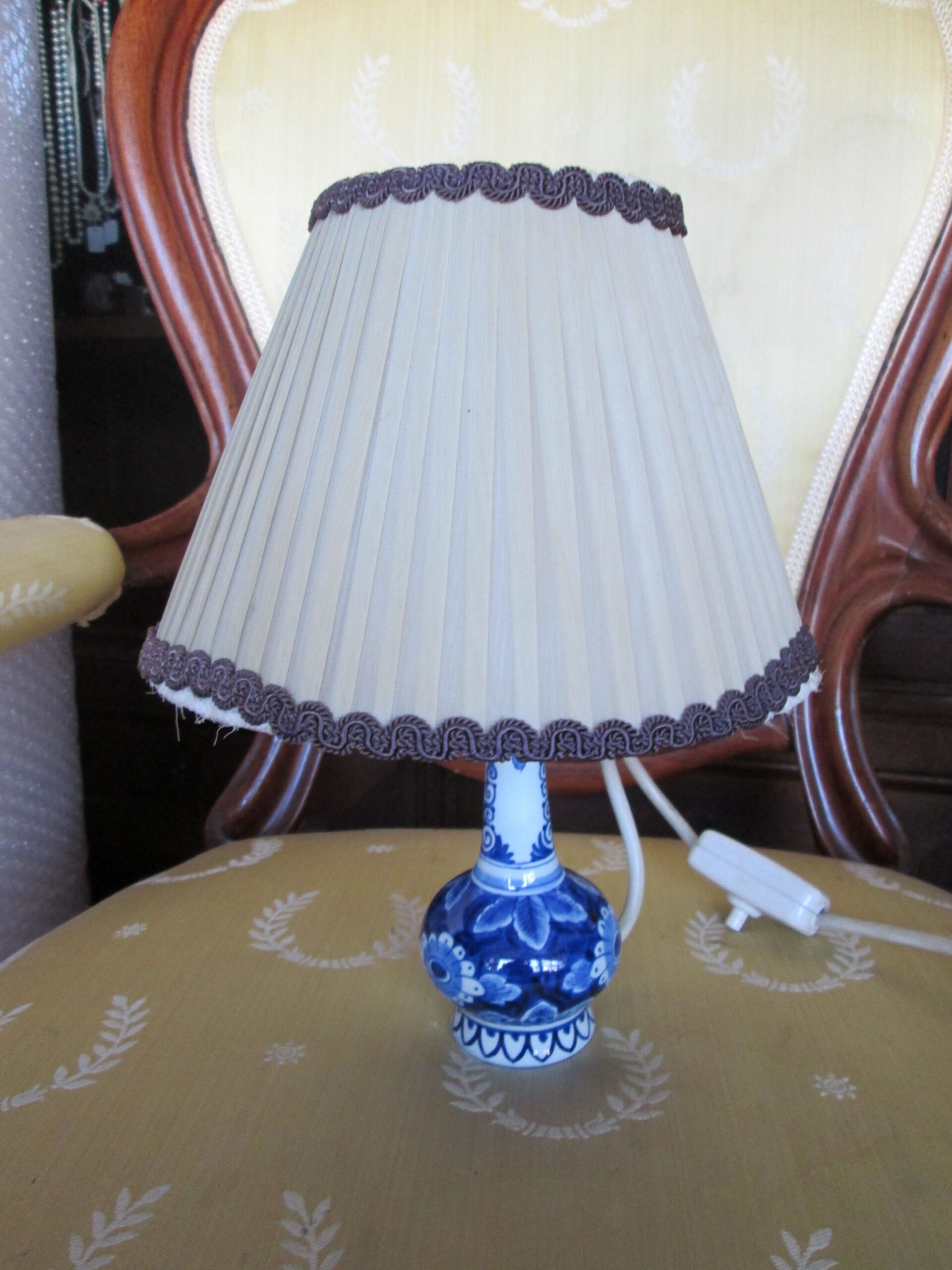 Lampa stołowa , podstawa wykonana w holenderskiej firmie Delft. Ręcznie malowana , klosz dopasowany do koloru nogi. Wysokość 27 cm , średnica klosza 20 cm. Sygnowana. Włącznik z kablem sprawny.