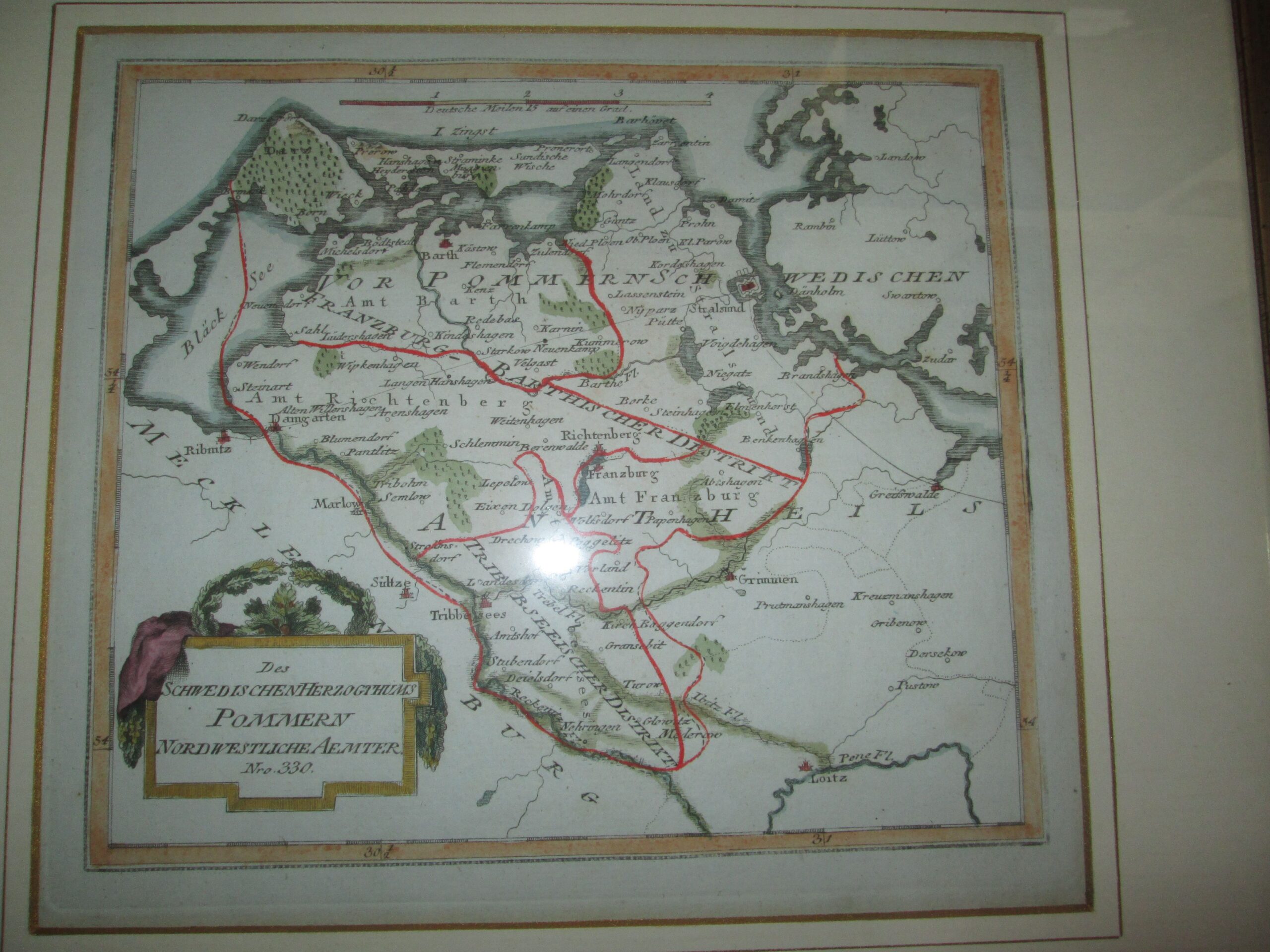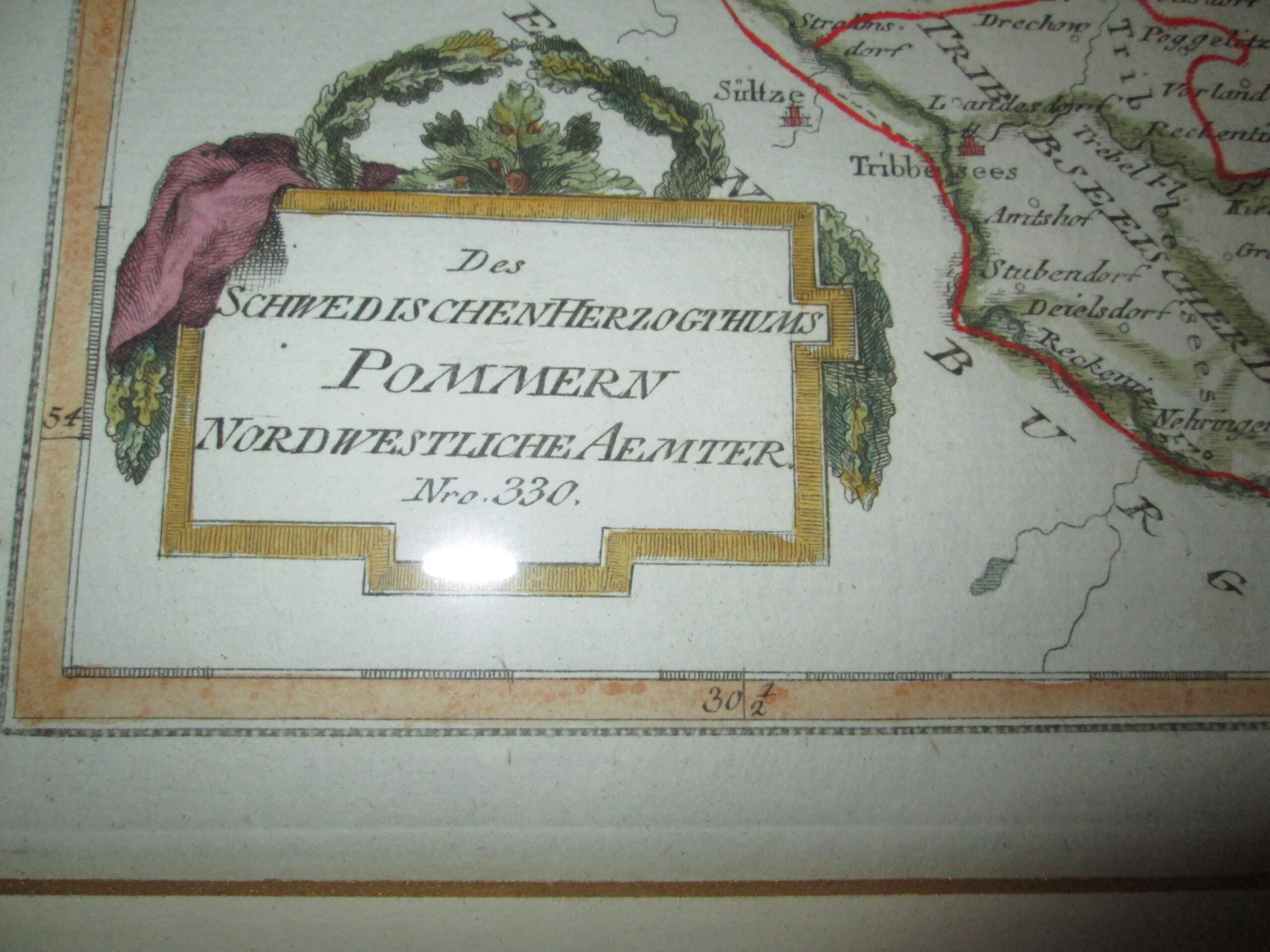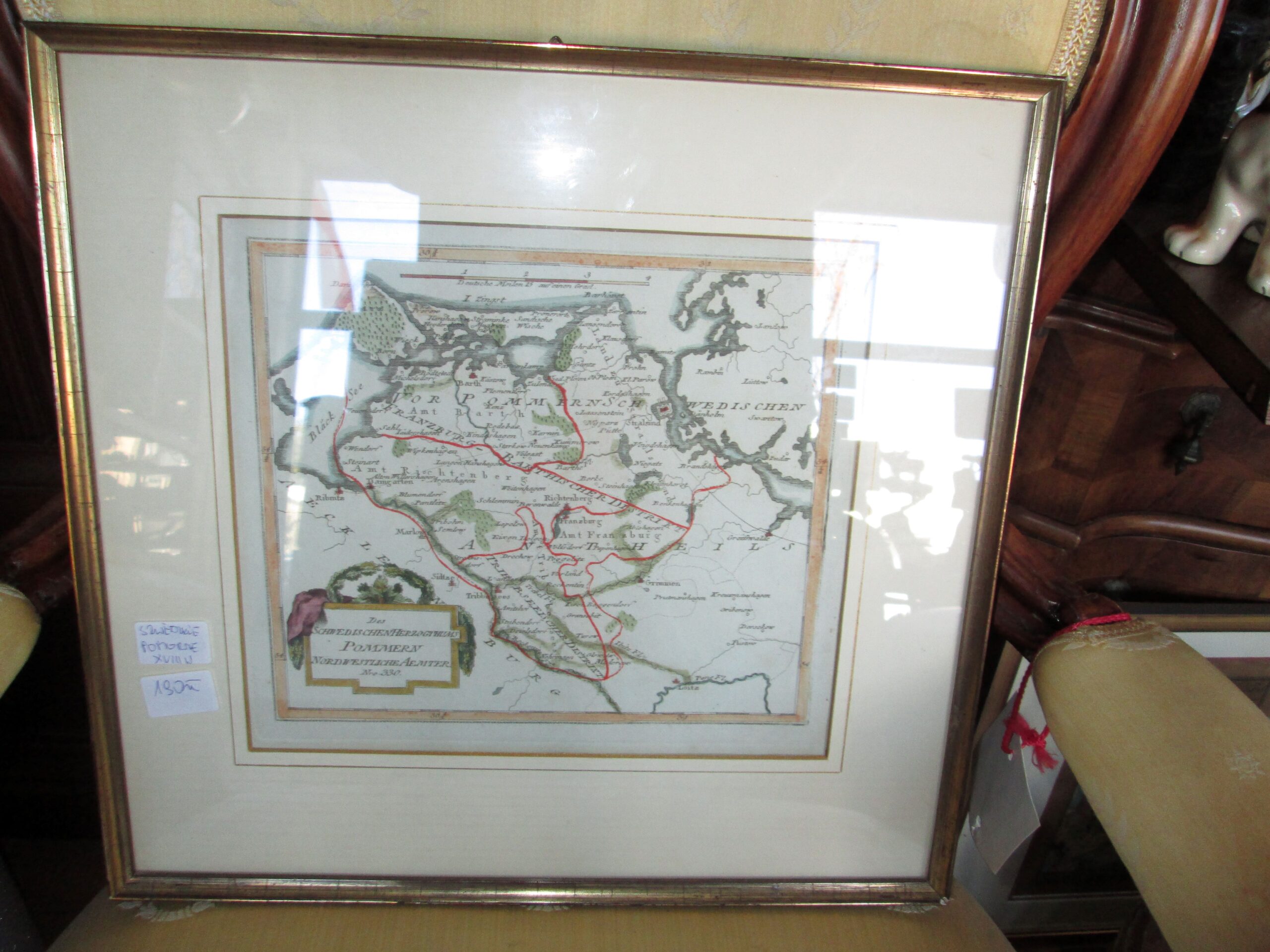 Mapa fragment Szwedzkiego Pomorza z XVIII wieku. Oprawione w ramę z paspartu. Szerokość z ramą 40 cm ,wysokość 38 cm. Litografia szerokość 26 cm ,wysokość 23 cm. Stan bardzo dobry.