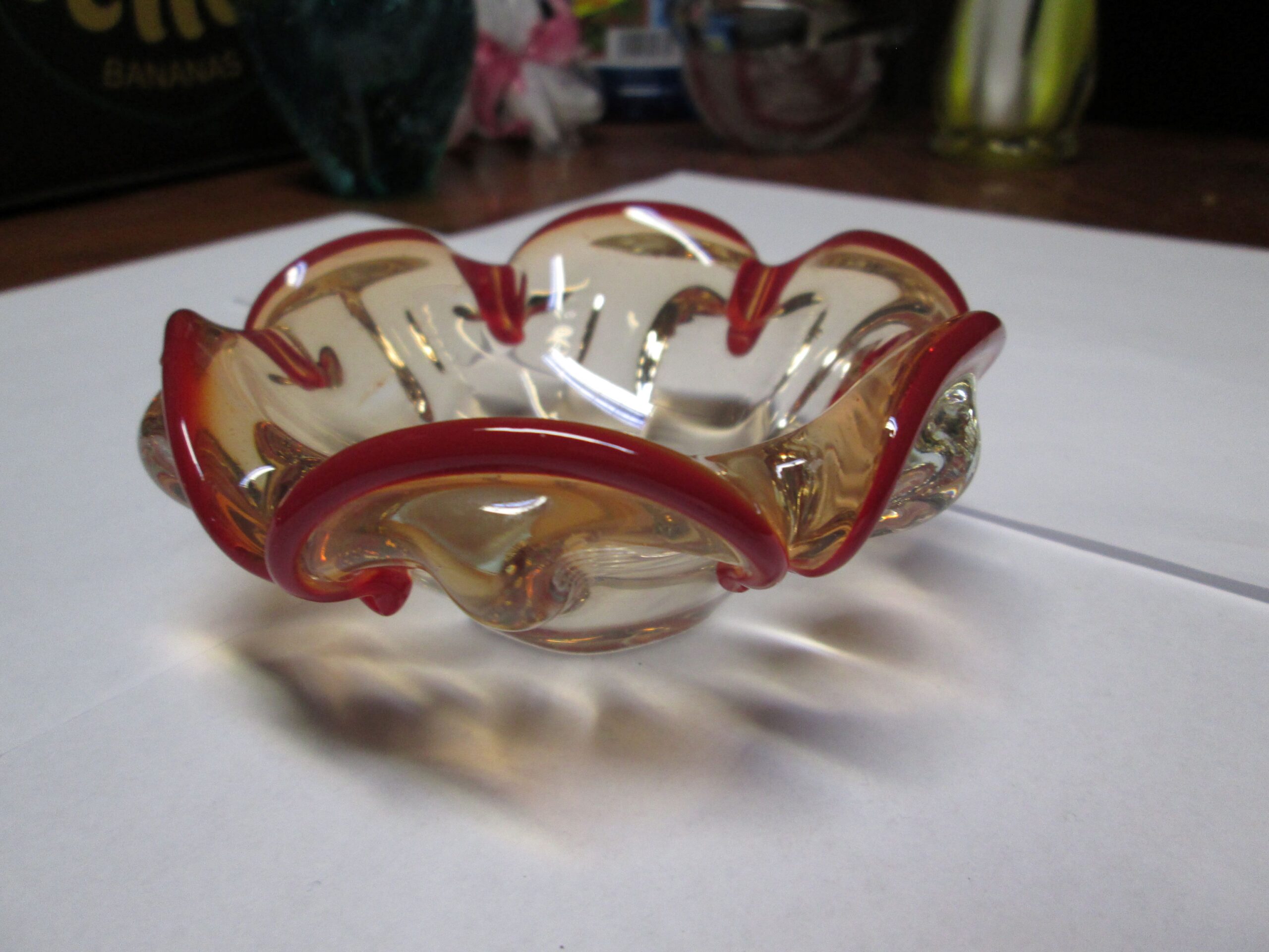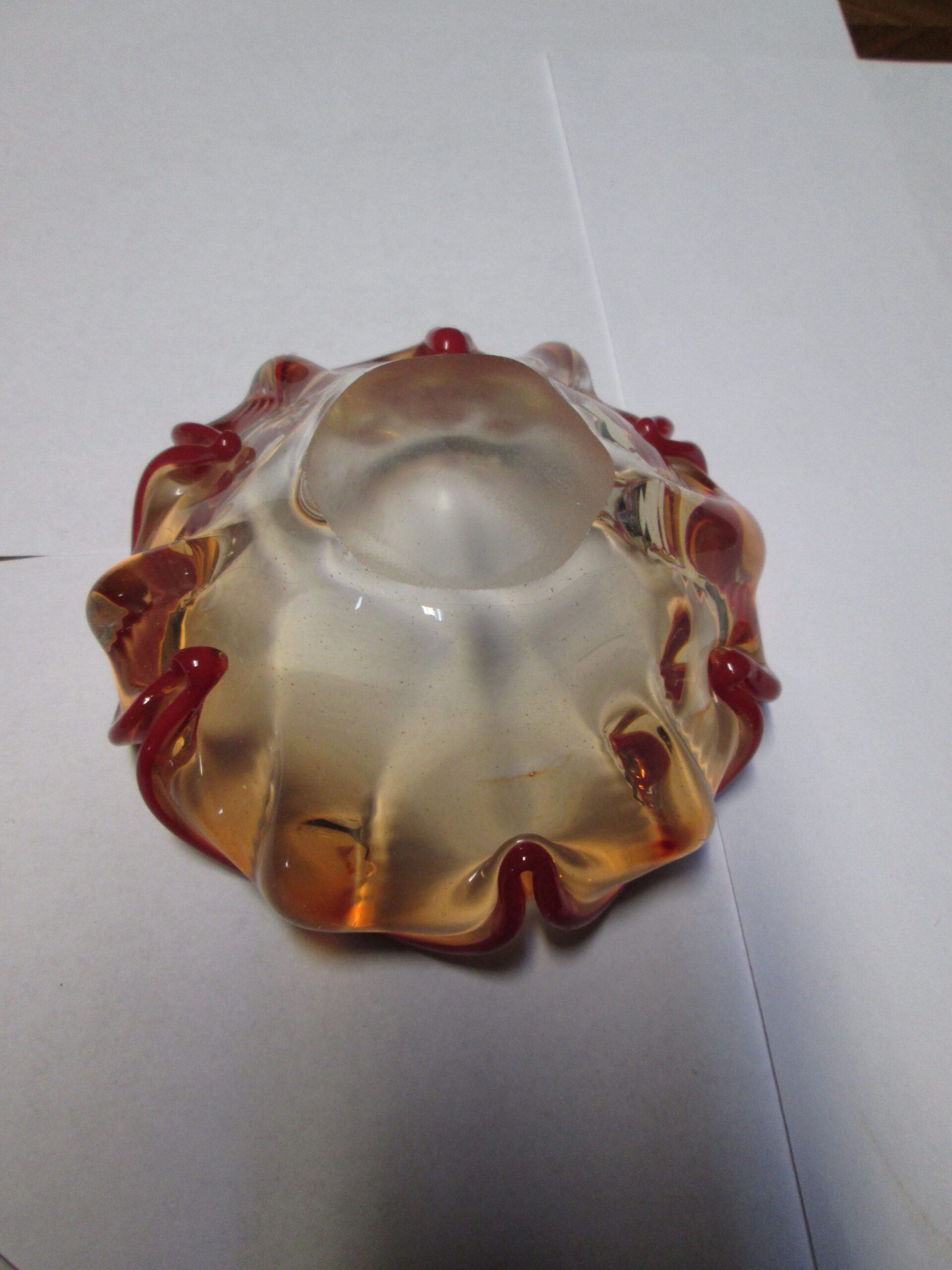 Mała paterka ze szkła Murano w stylu Vide Poche. Wykonana w latach 60-70 tych ubiegłego wieku. Brzegi wywinięte w kolorze czerwonym. Średnica 11 cm , wysokość 4.5 cm. Stan bardzo dobry.