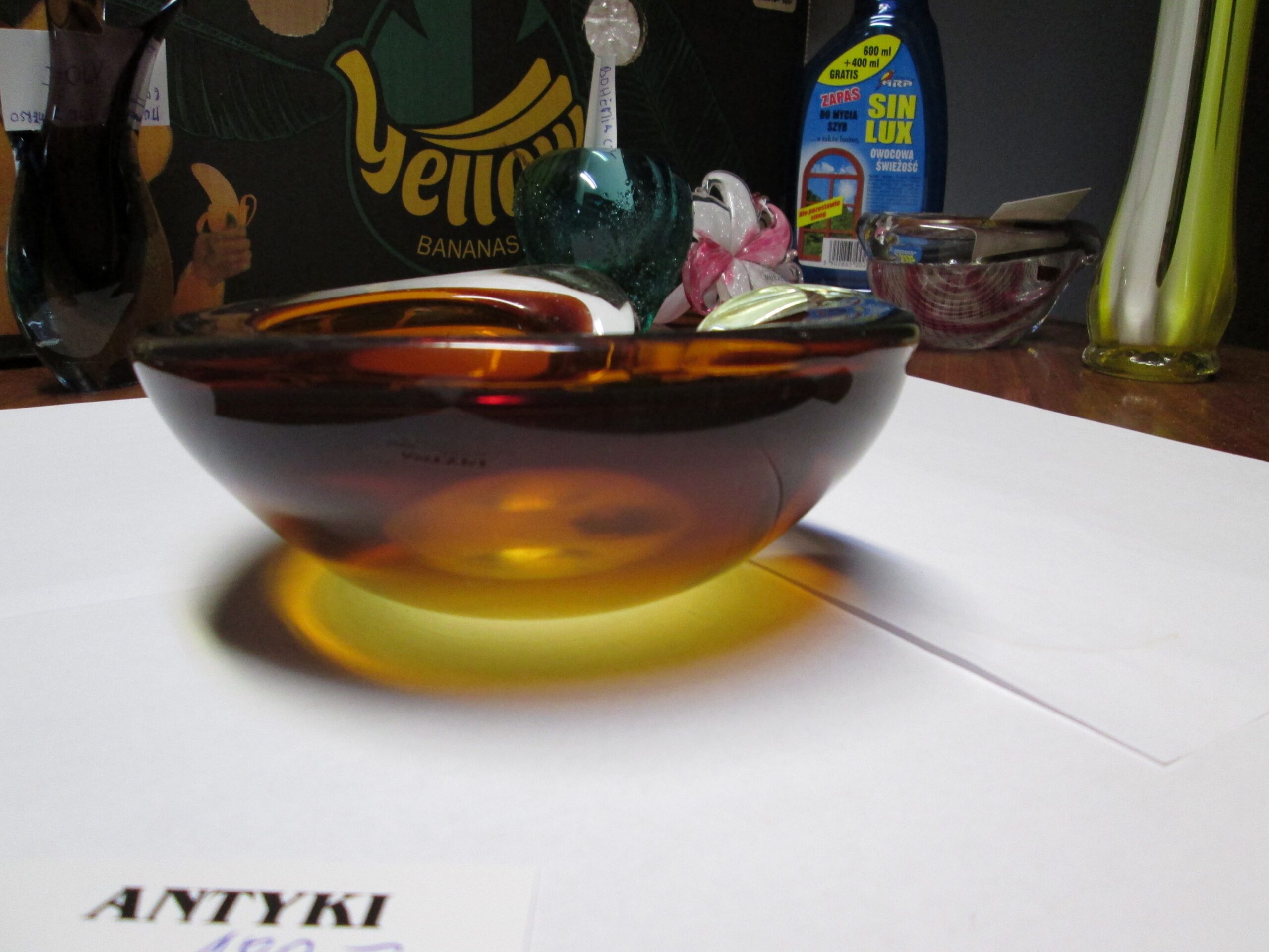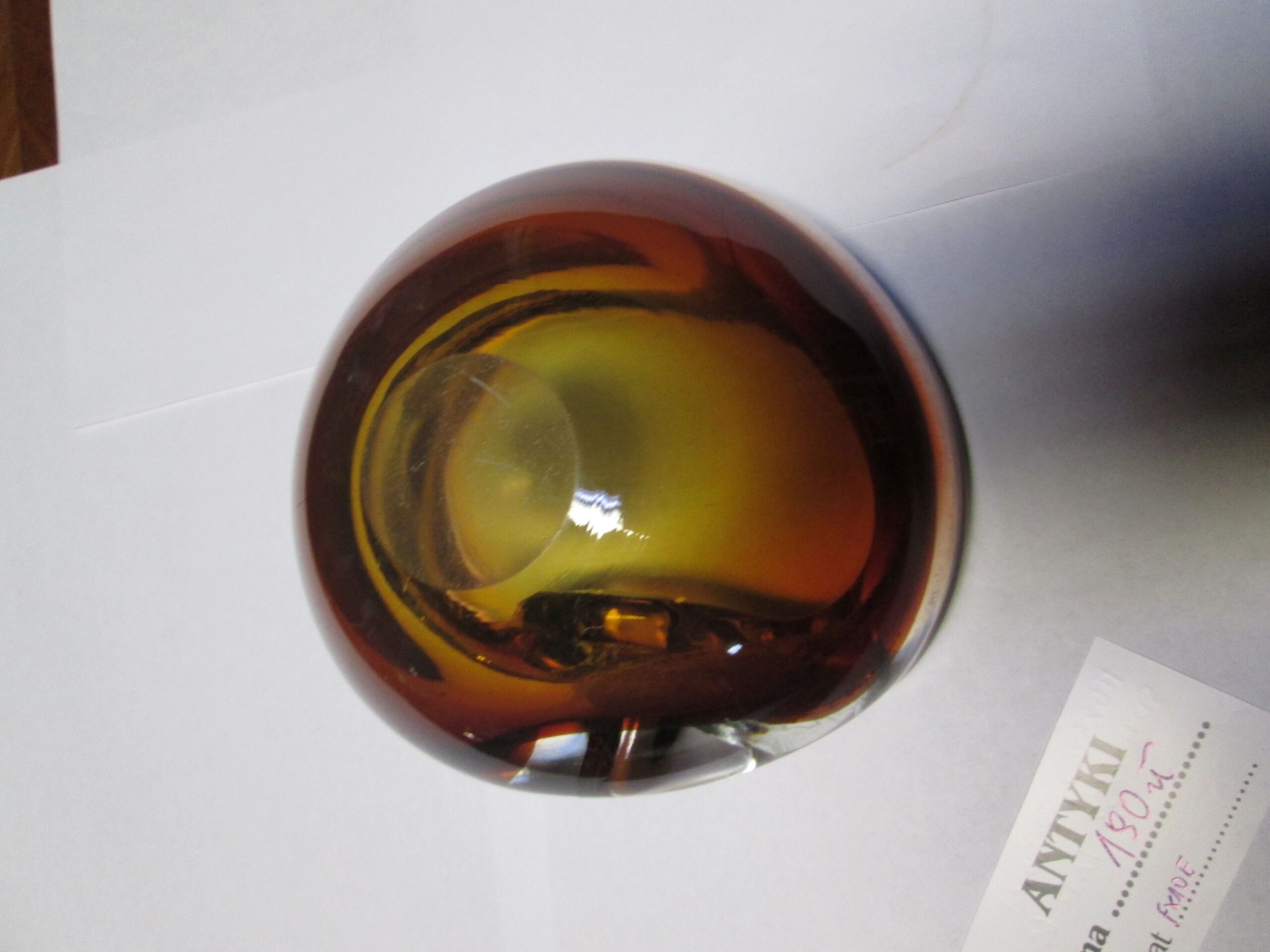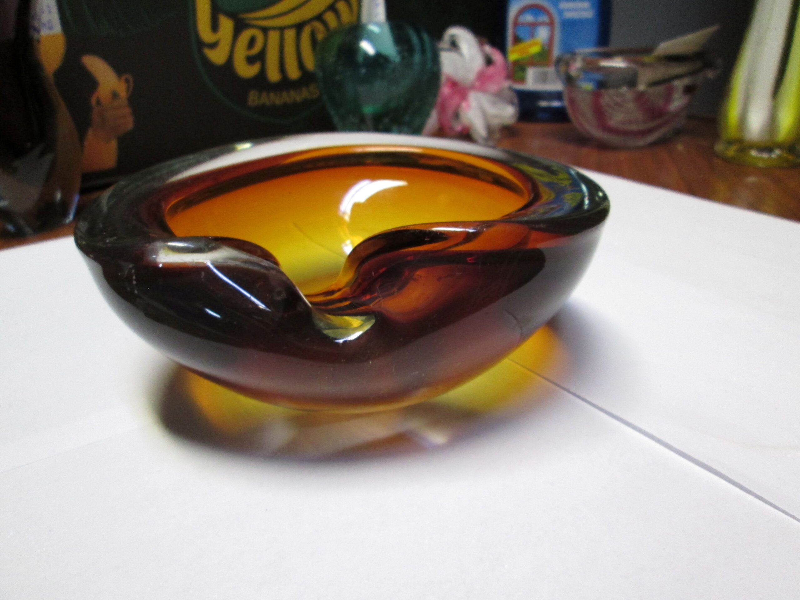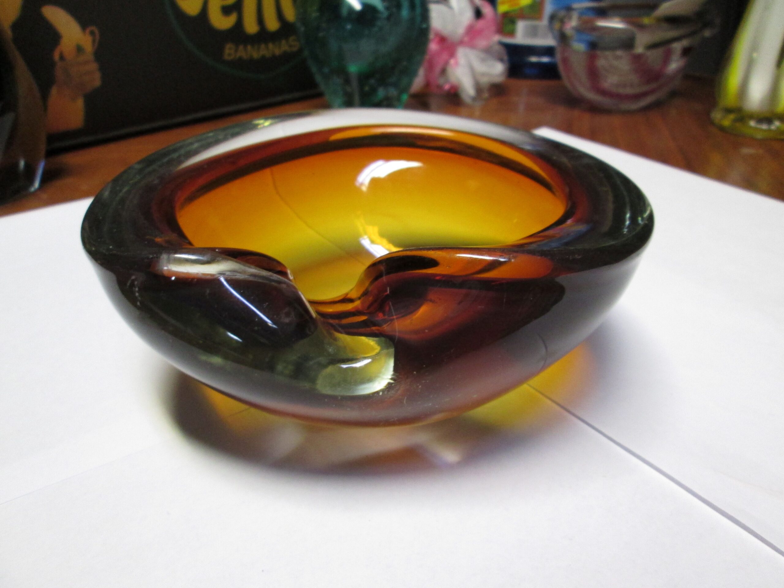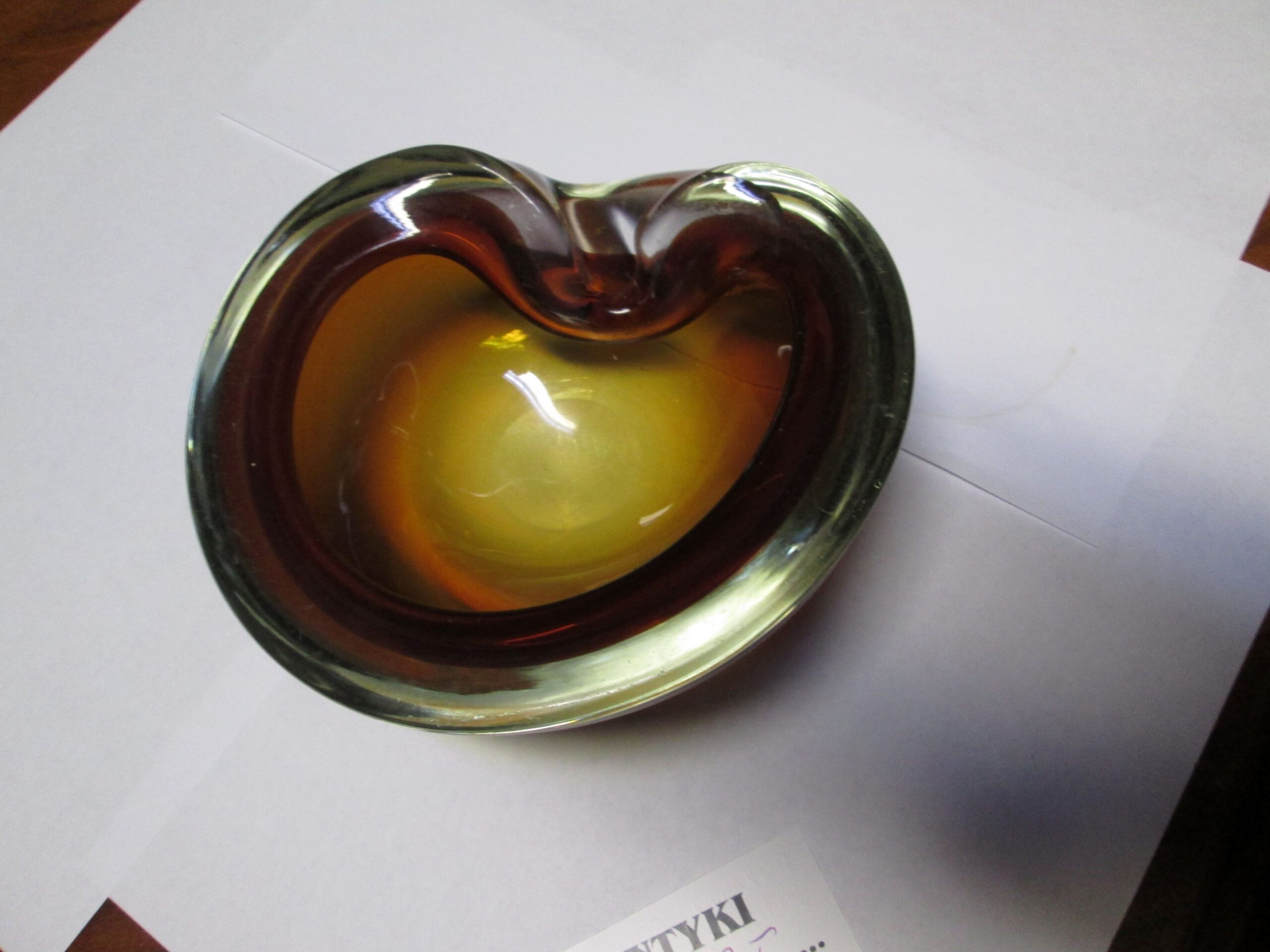 Patera z zawiniętym brzegiem ze szkła firmy Murano. Wykonana w technice Sommerso.(Technikasommerso (wł. „zanurzony”) to włoska metoda produkcji szkła artystycznego, głównie z Murano, polegająca na nakładaniu na siebie warstw kontrastujących kolorów szkła. Przezroczysty, gorący kryształ jest zanurzany w płynnym, kolorowym szkle, tworząc wielowarstwowe struktury o trójwymiarowej głębi i iluzji „unoszenia się” kolorów wewnątrz.) Grube wielo kolorowe szkło. Owal o wymiarach 16*14 cm , wysokość 6.5 cm. Stan bardzo dobry.