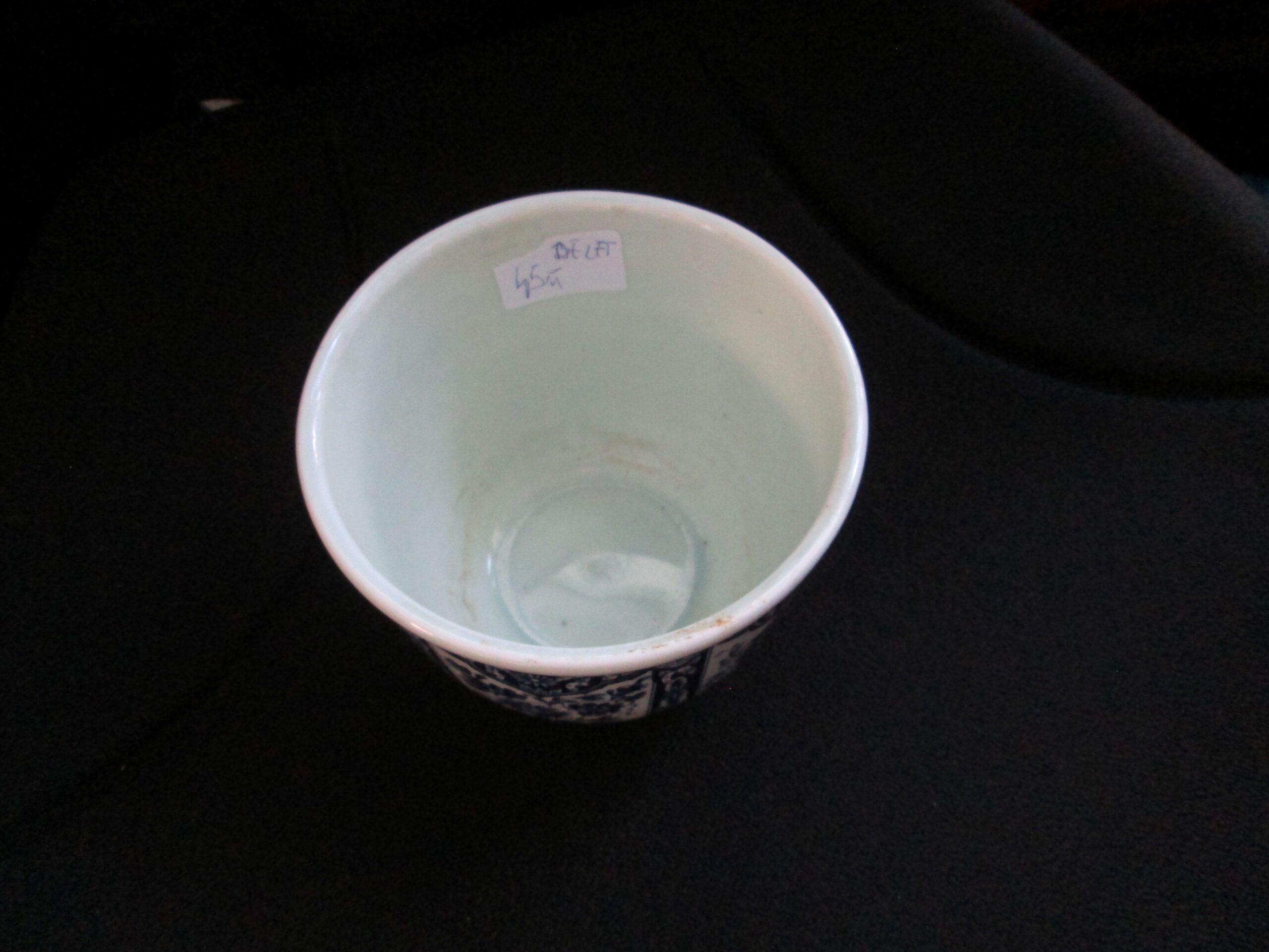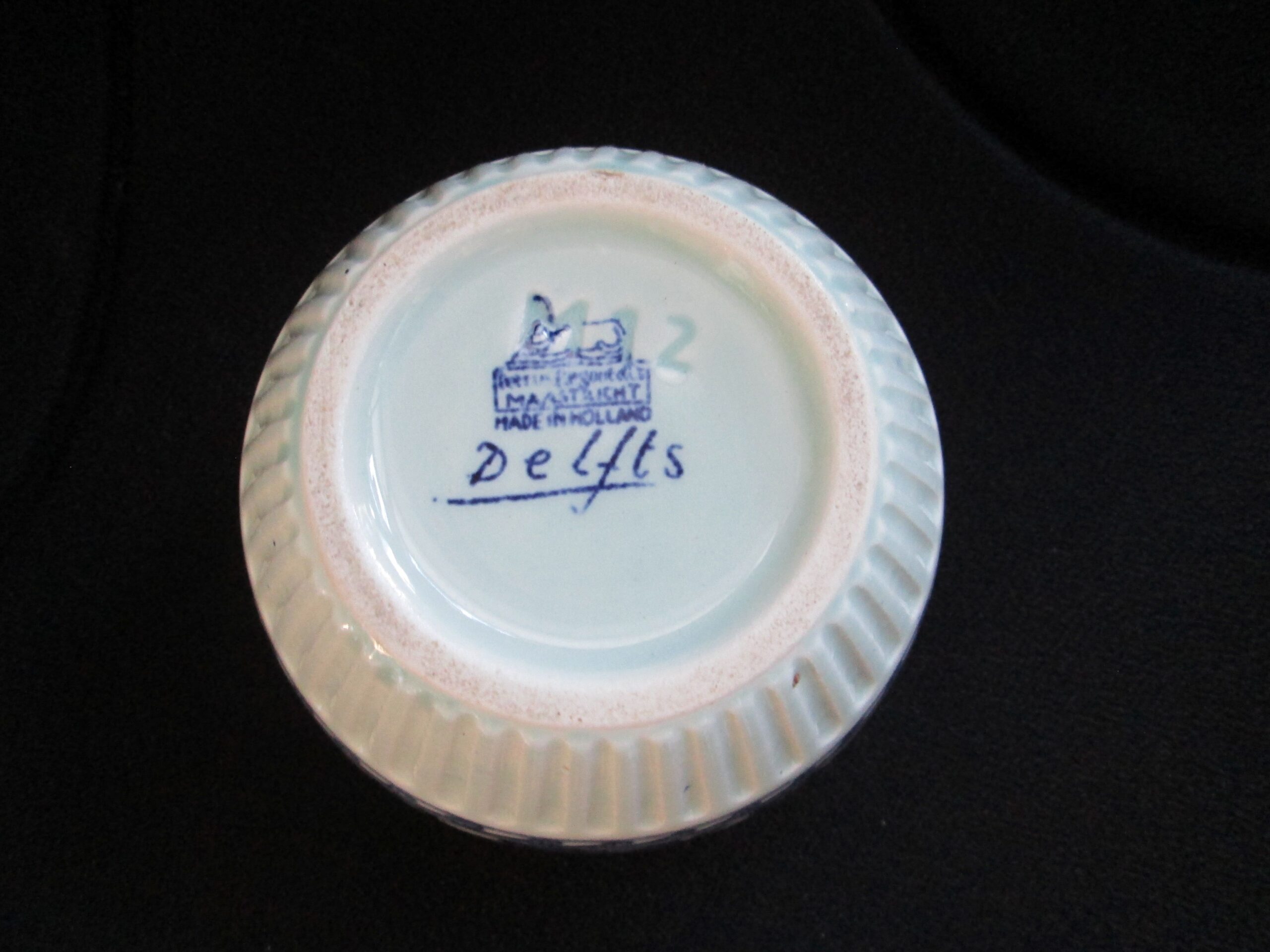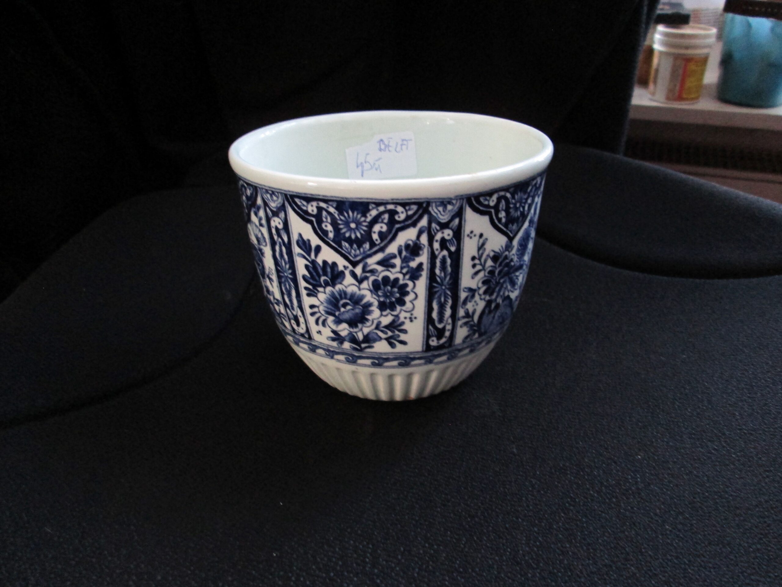 Osłonka do kwiatów wykonana z porcelany holenderskiej firmy Delft. Średnica 11.5 cm. Wysokość 9.5 cm. Stan bardzo dobry.
