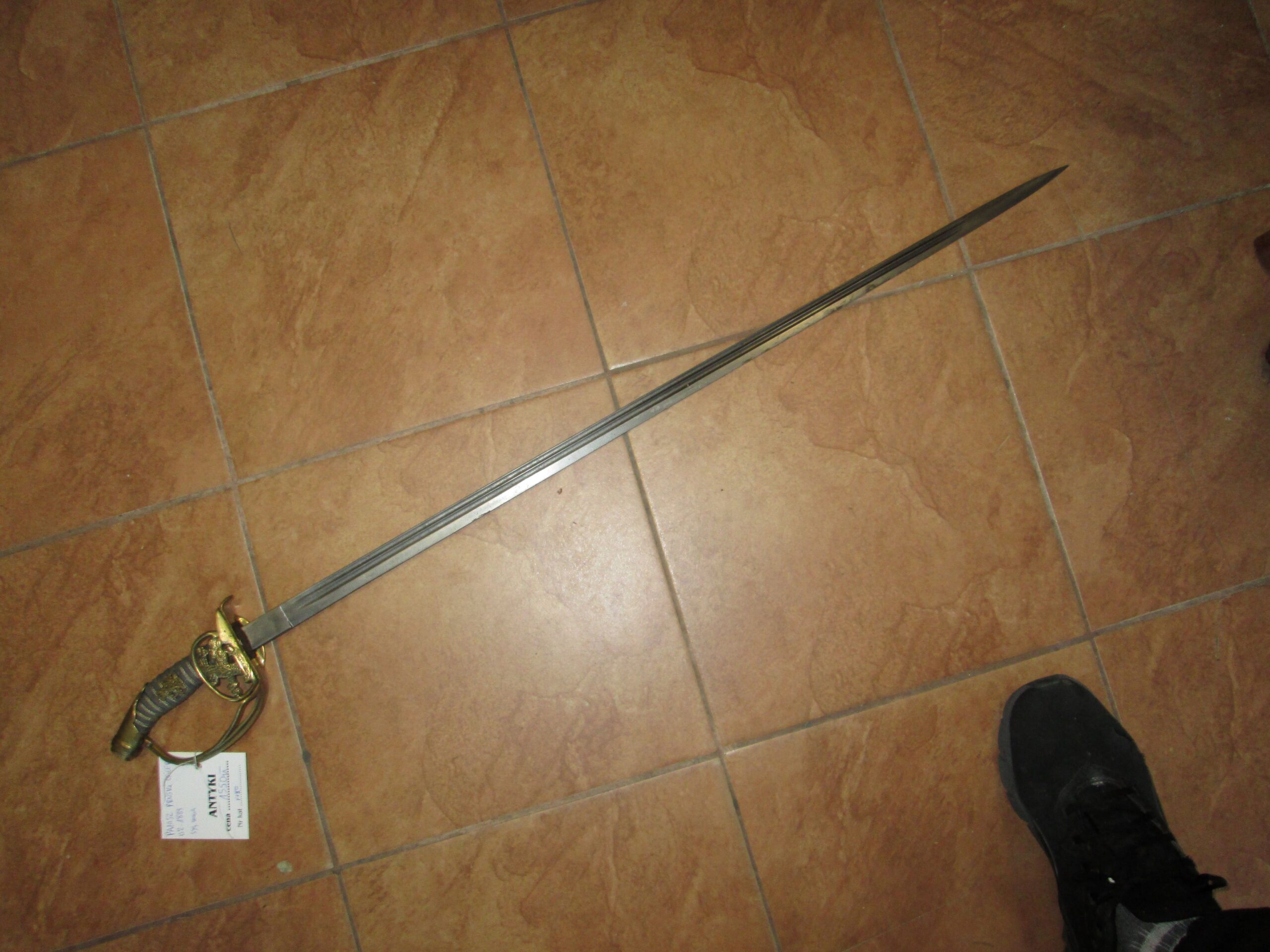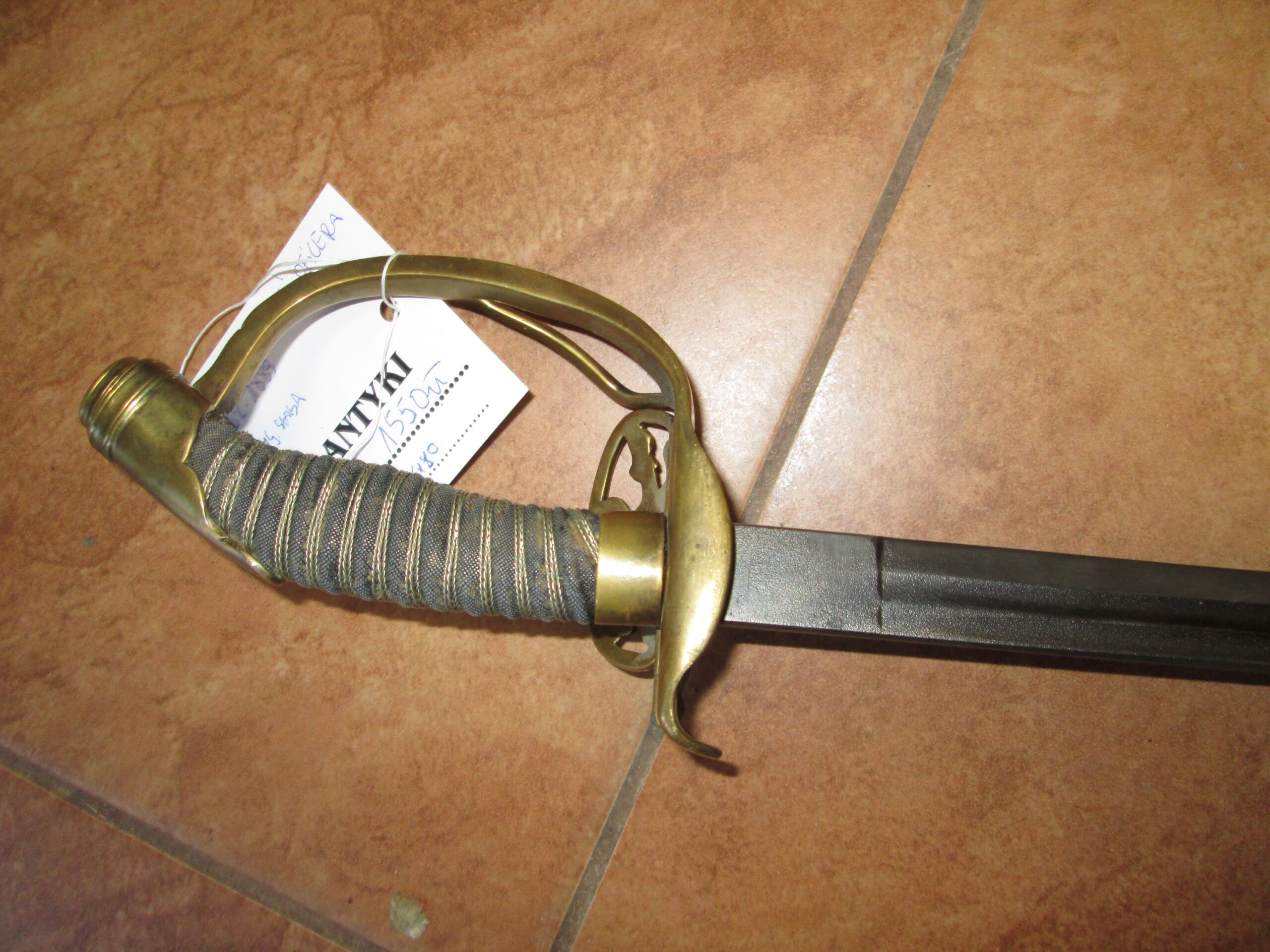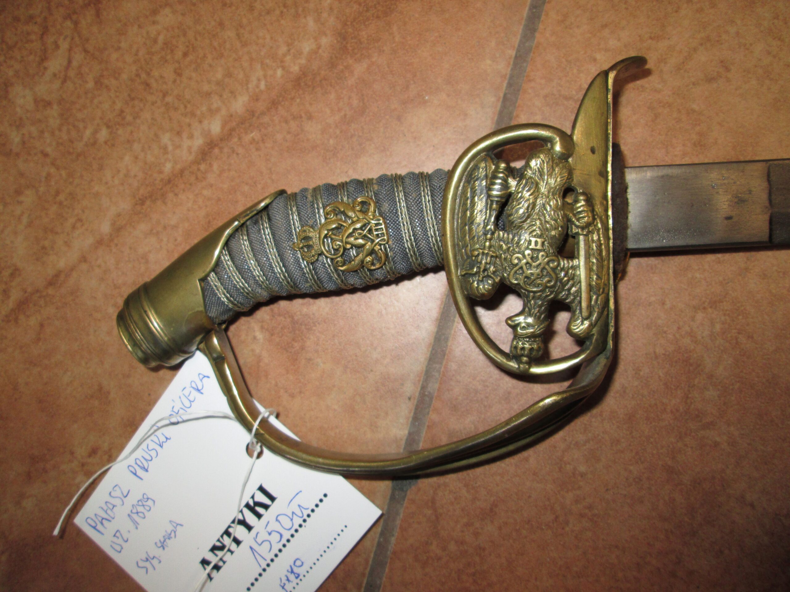 Pałasz oficera pruskiego ,wzór 1889 .Bez pochwy. Sygnatur słabo widoczna na ostrzu. Długość całości 98 cm , ostrza 83 cm. Insygnia na rękojeści. Przetarta skóra w uchwycie (minimalnie).