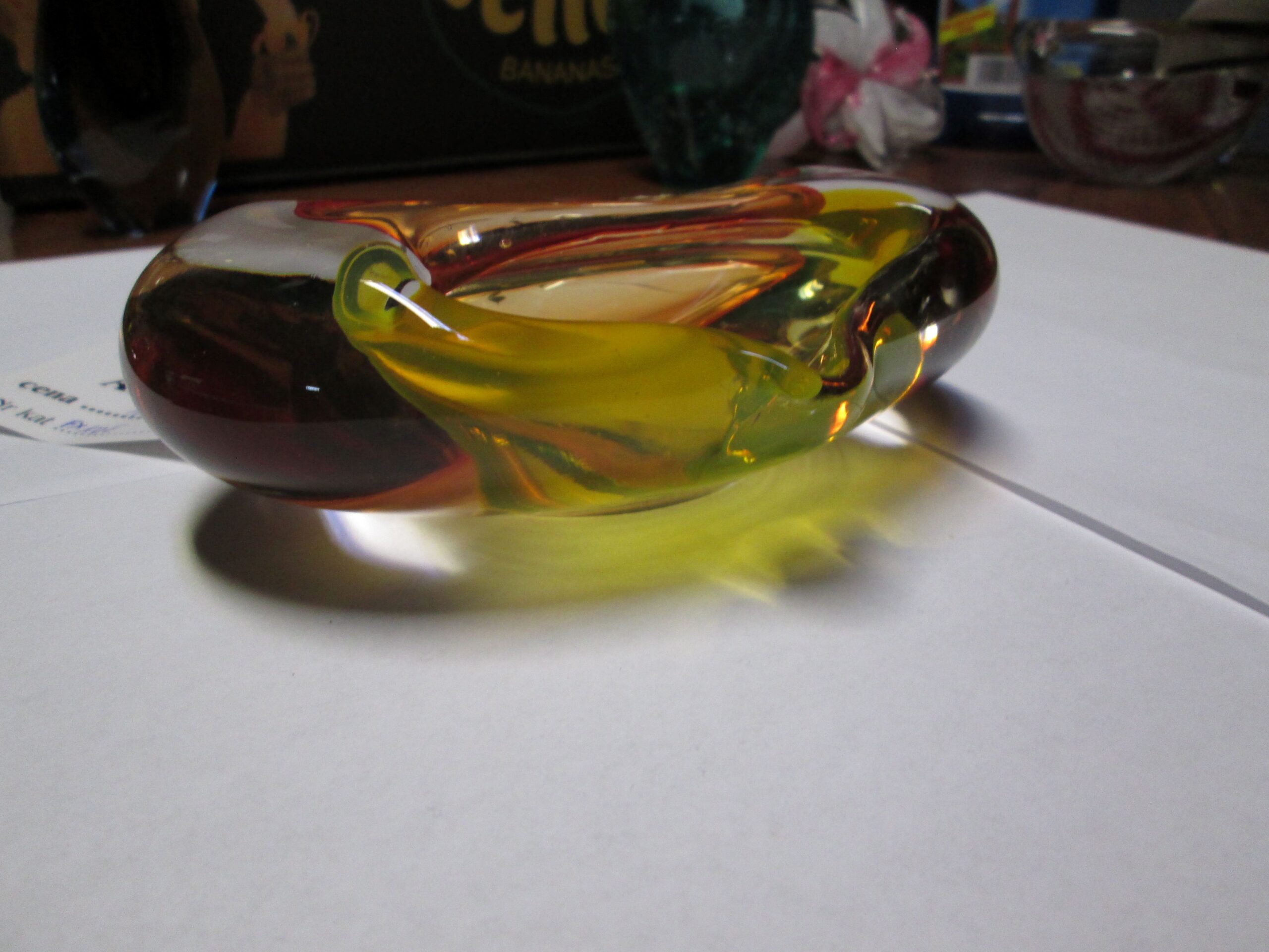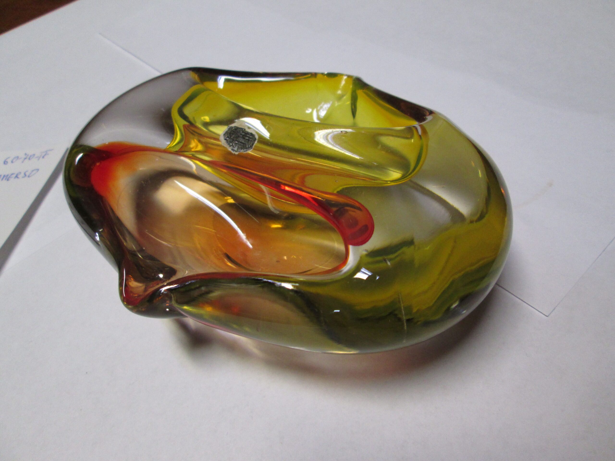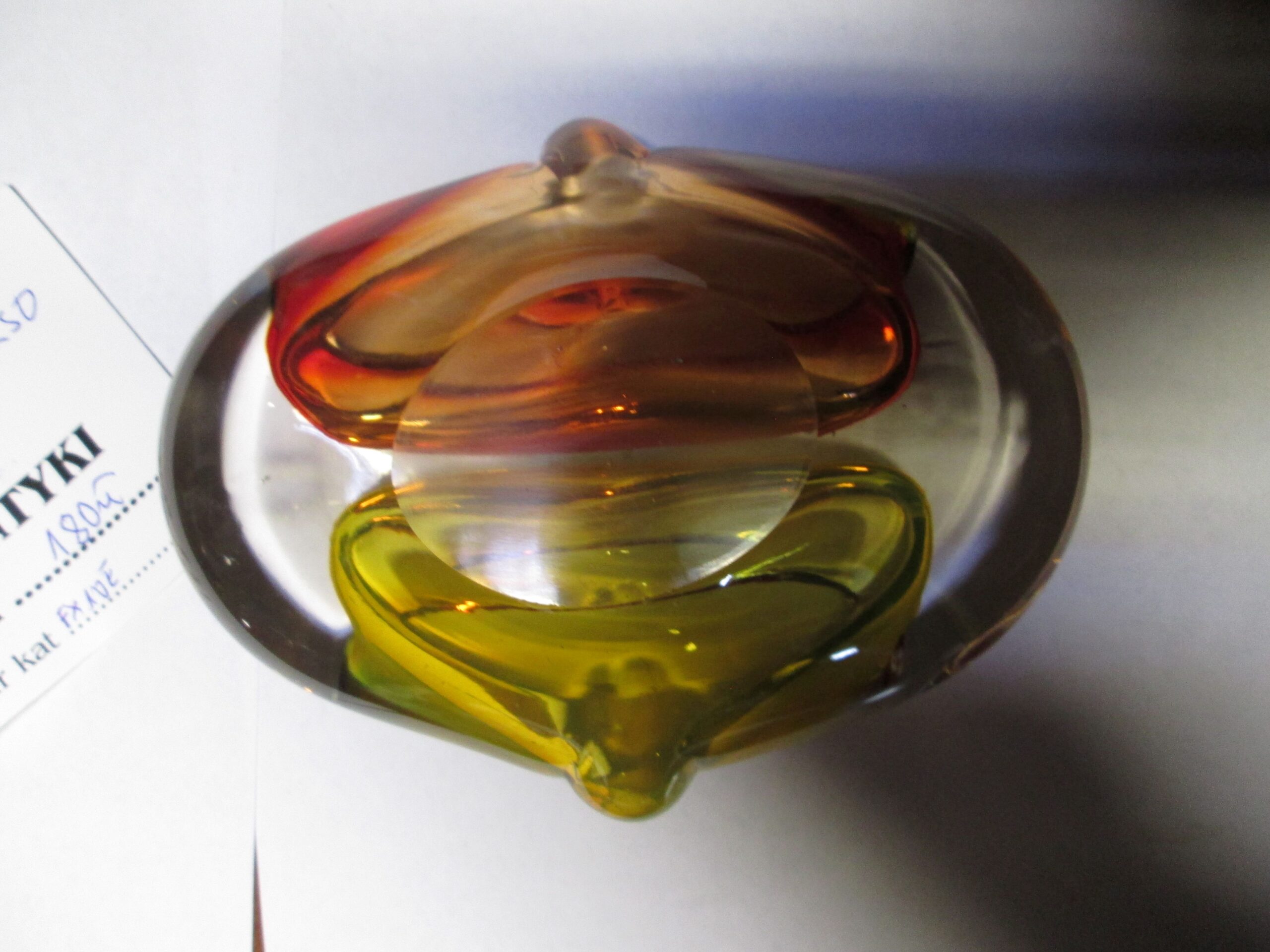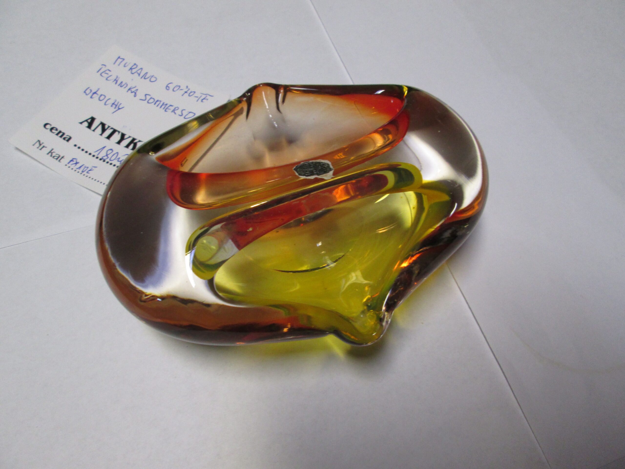 Szklana popielniczka dwu stronna , wykonana na wyspie Murano, w technice Sommerso (Technikasommerso (wł. „zanurzony”) to włoska metoda produkcji szkła artystycznego, głównie z Murano, polegająca na nakładaniu na siebie warstw kontrastujących kolorów szkła. Przezroczysty, gorący kryształ jest zanurzany w płynnym, kolorowym szkle, tworząc wielowarstwowe struktury o trójwymiarowej głębi i iluzji „unoszenia się” kolorów wewnątrz.). Owal o wymiarach 15*12 cm , wysokość 5 cm. Kolorowe szkło. Stan idealny.