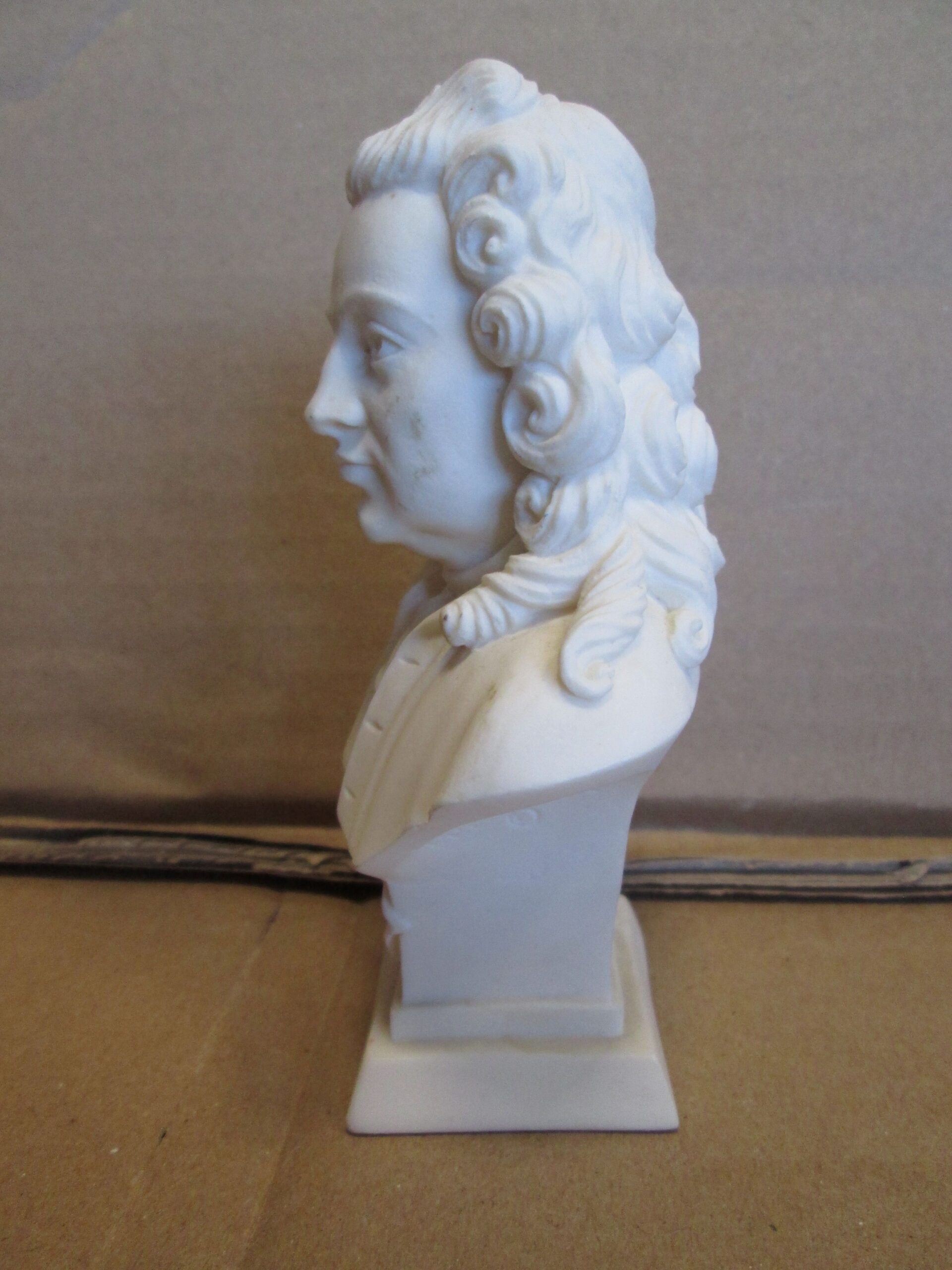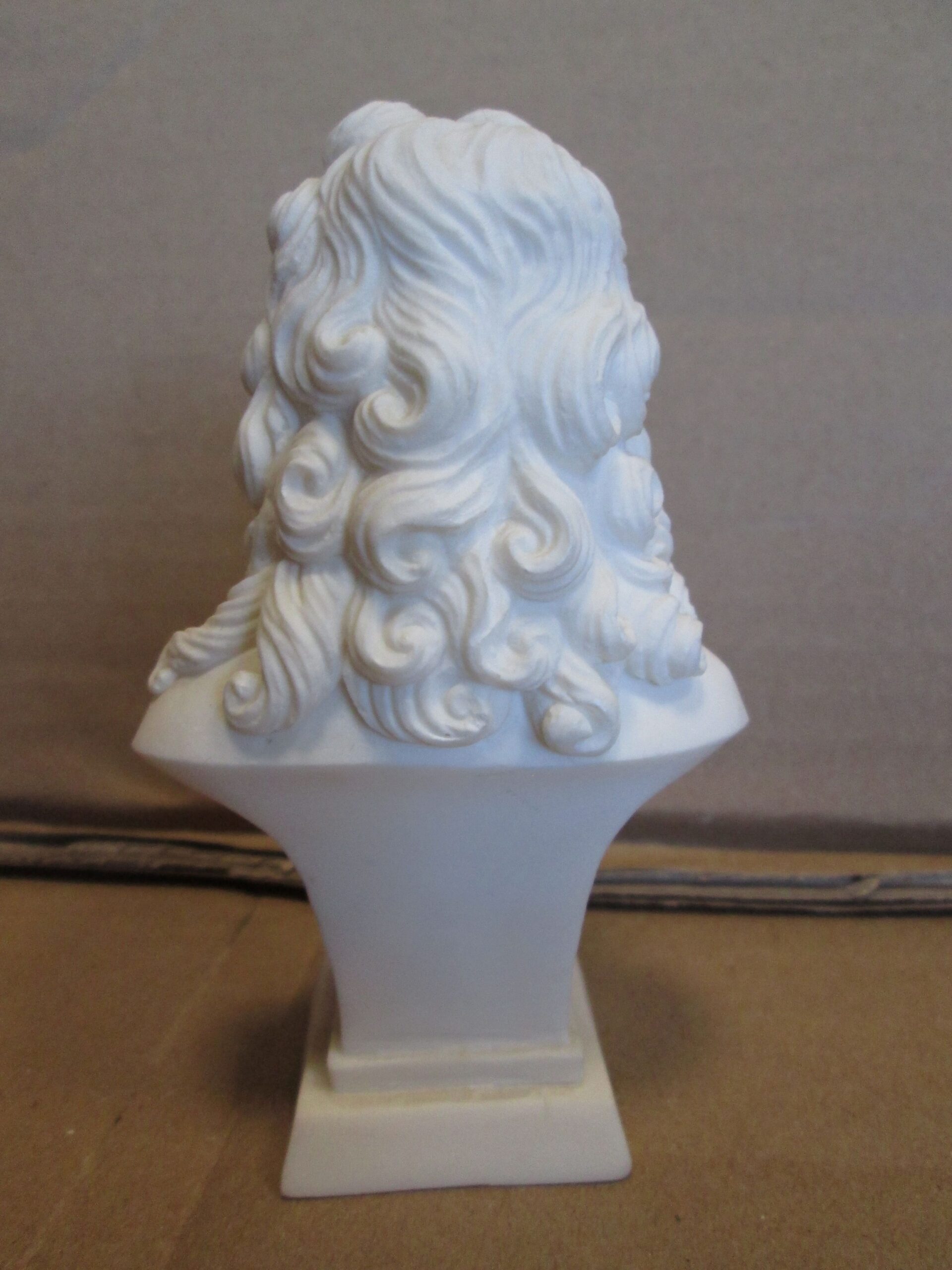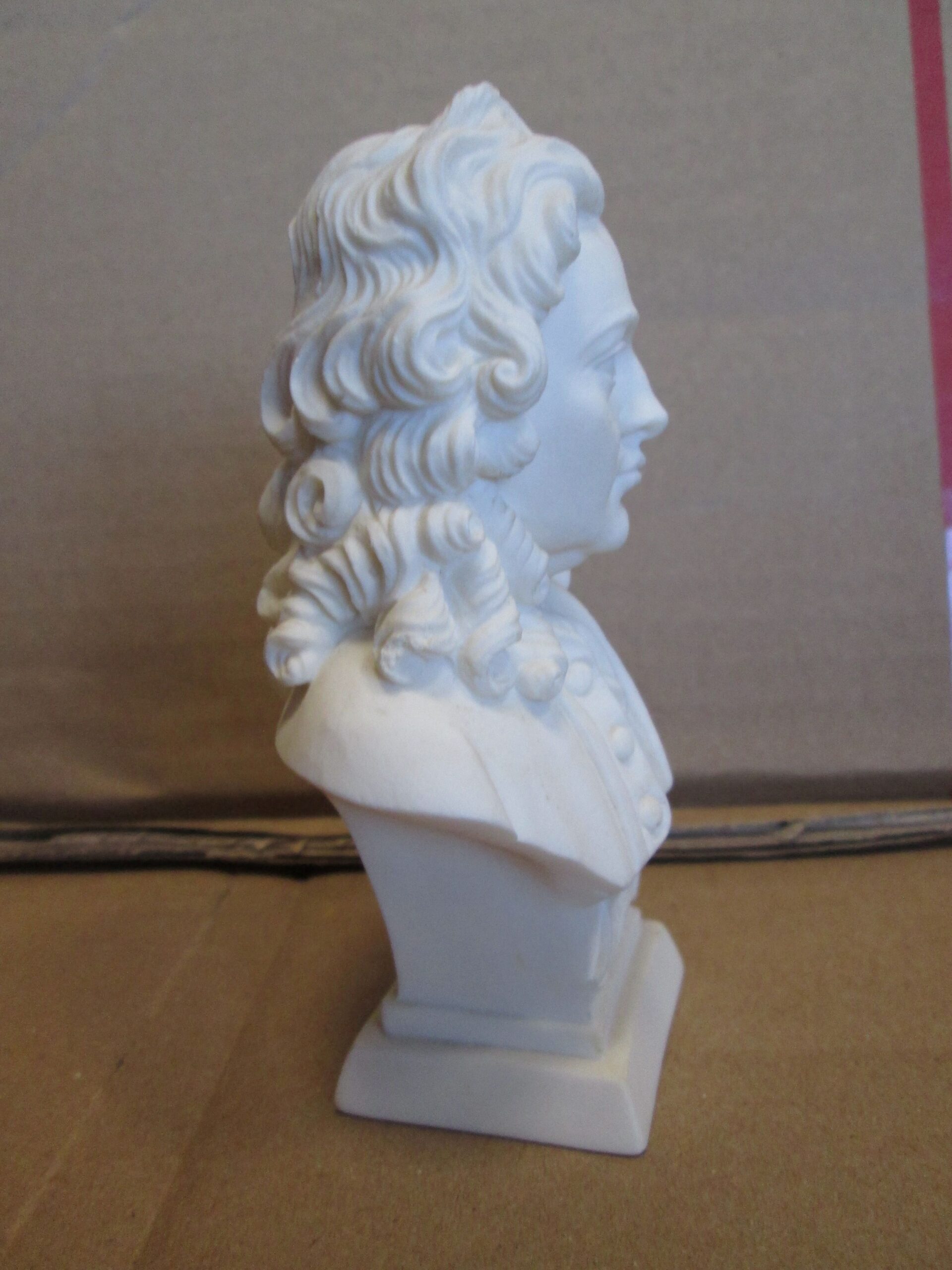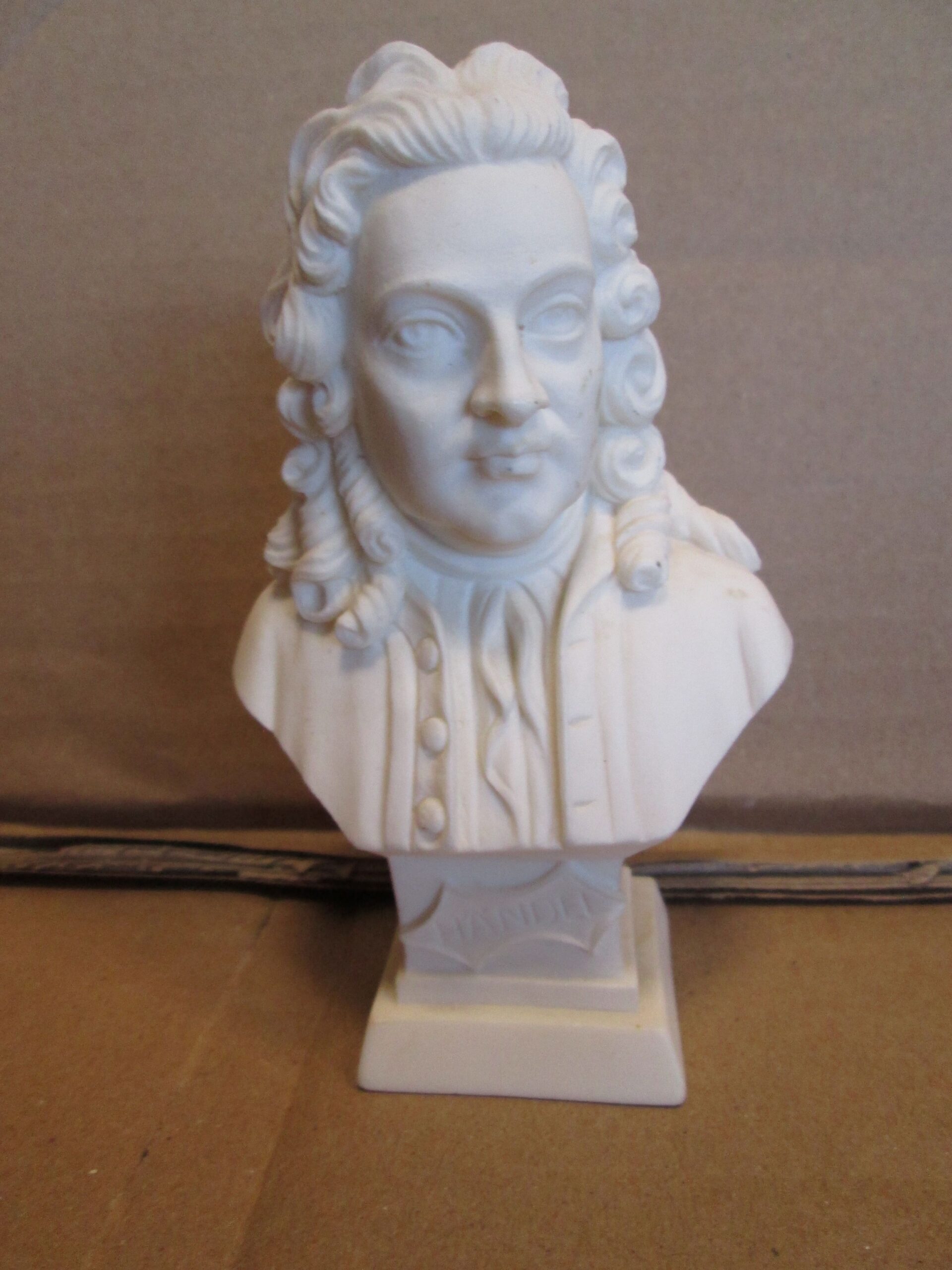 Popiersie Georga Fredricha Handel, słynnego kompozytora. Wykonane z masy żywicznej . Zaprojektowany przez włoskiego artystę A. Gianneli (sygnatura). Wysokość 12 cm , szerokość 7 cm.Stan bardzo dobry.