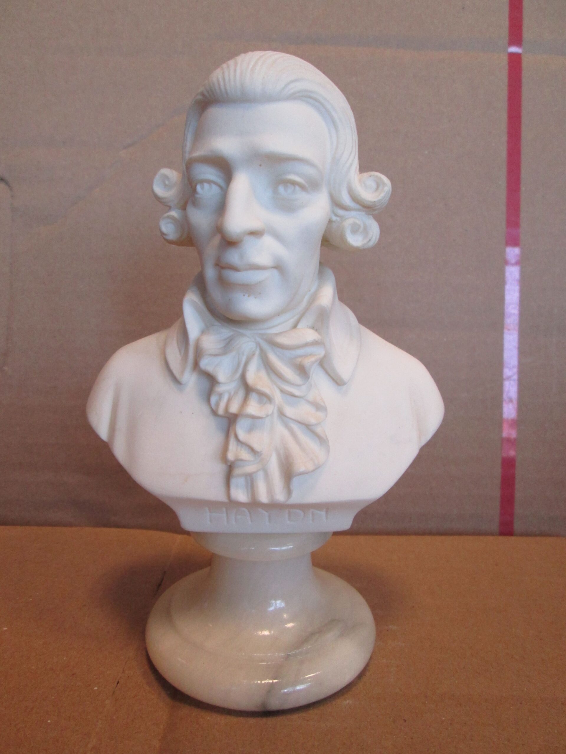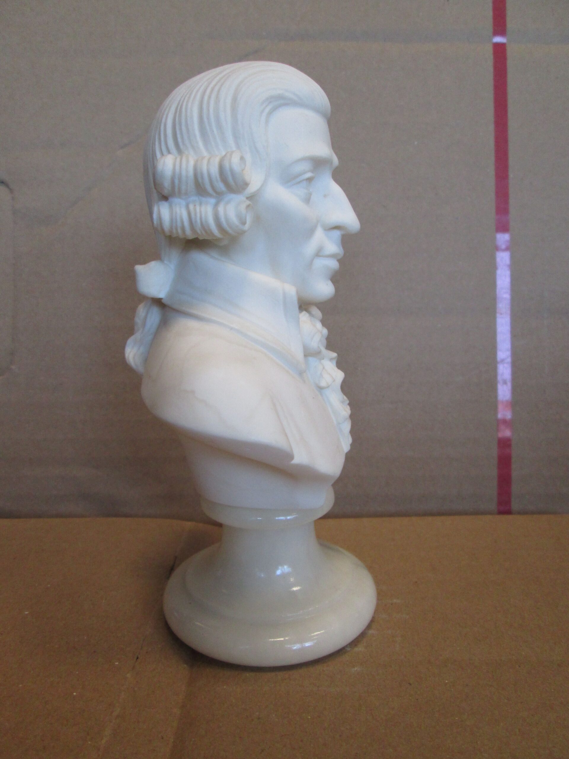 Popiersie słynnego kompozytora Jóżefa Haydna. Wykonane z alabastru z podstawką z marmuru. Projekt A.Giannelli z 1990 roku ,Włochy. Wysokość 15 cm ,szerokość 9.5 cm.Sygnowany. Stan bardzo dobry.