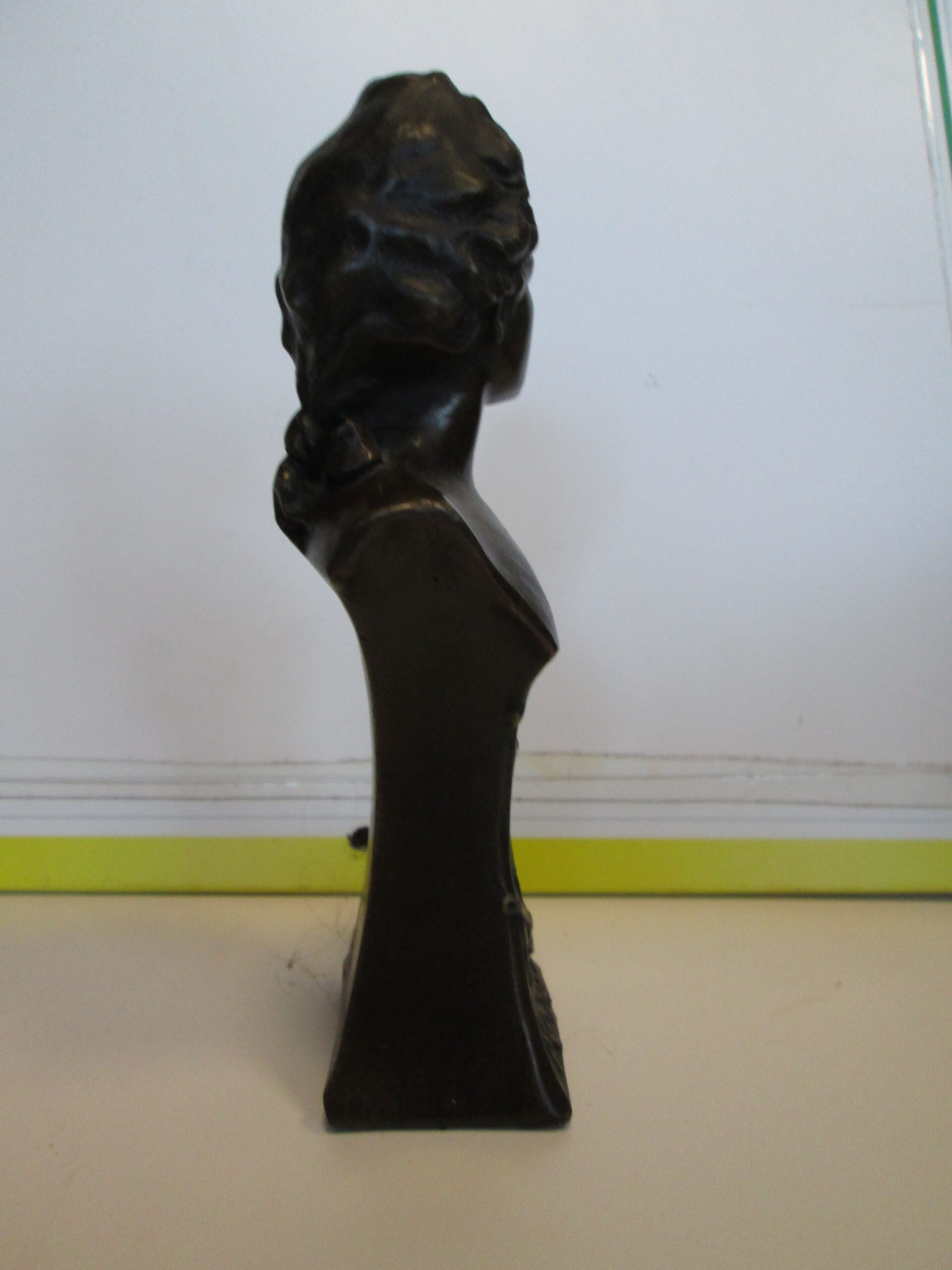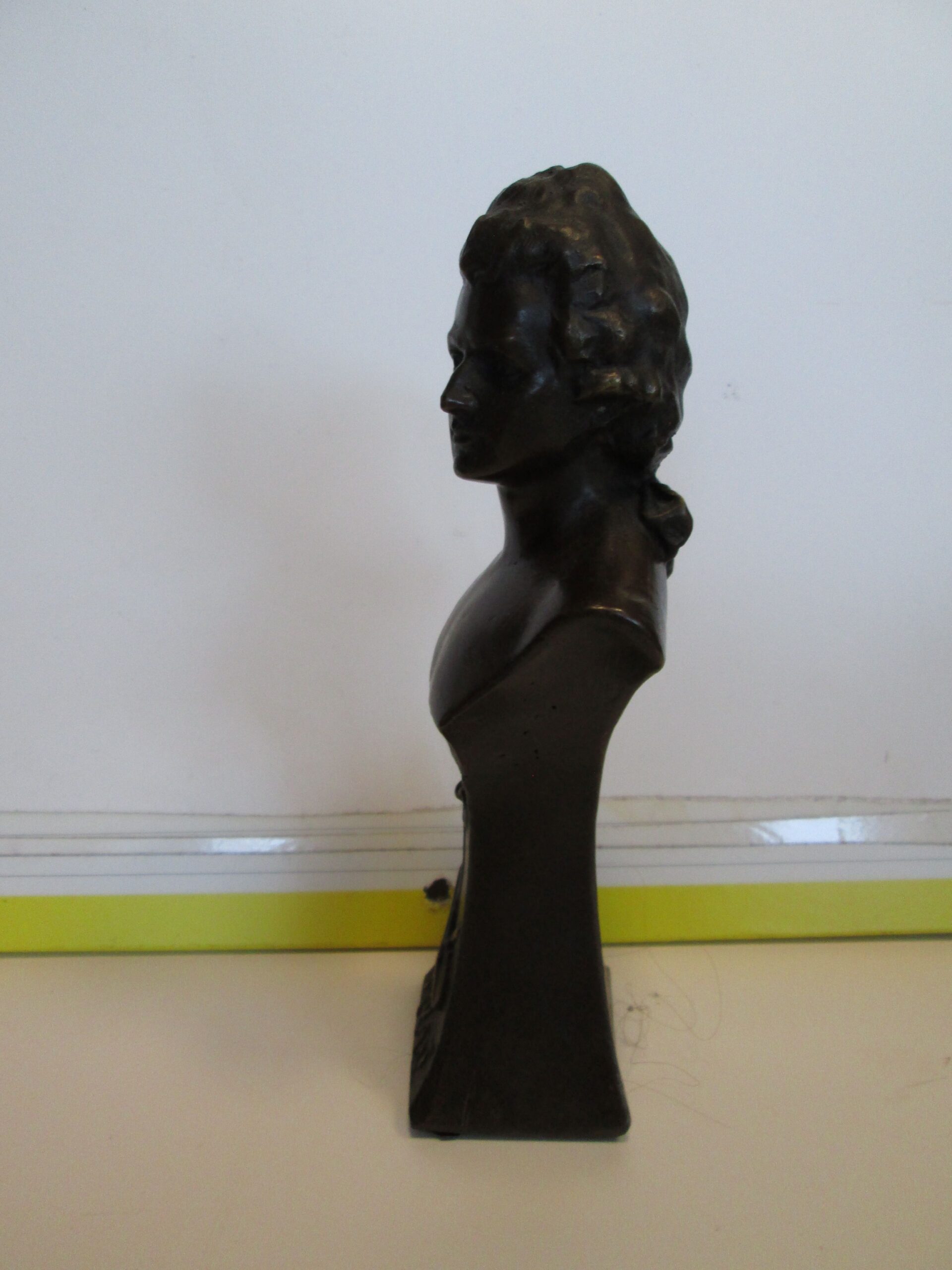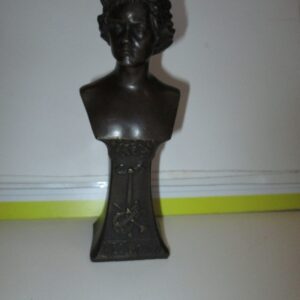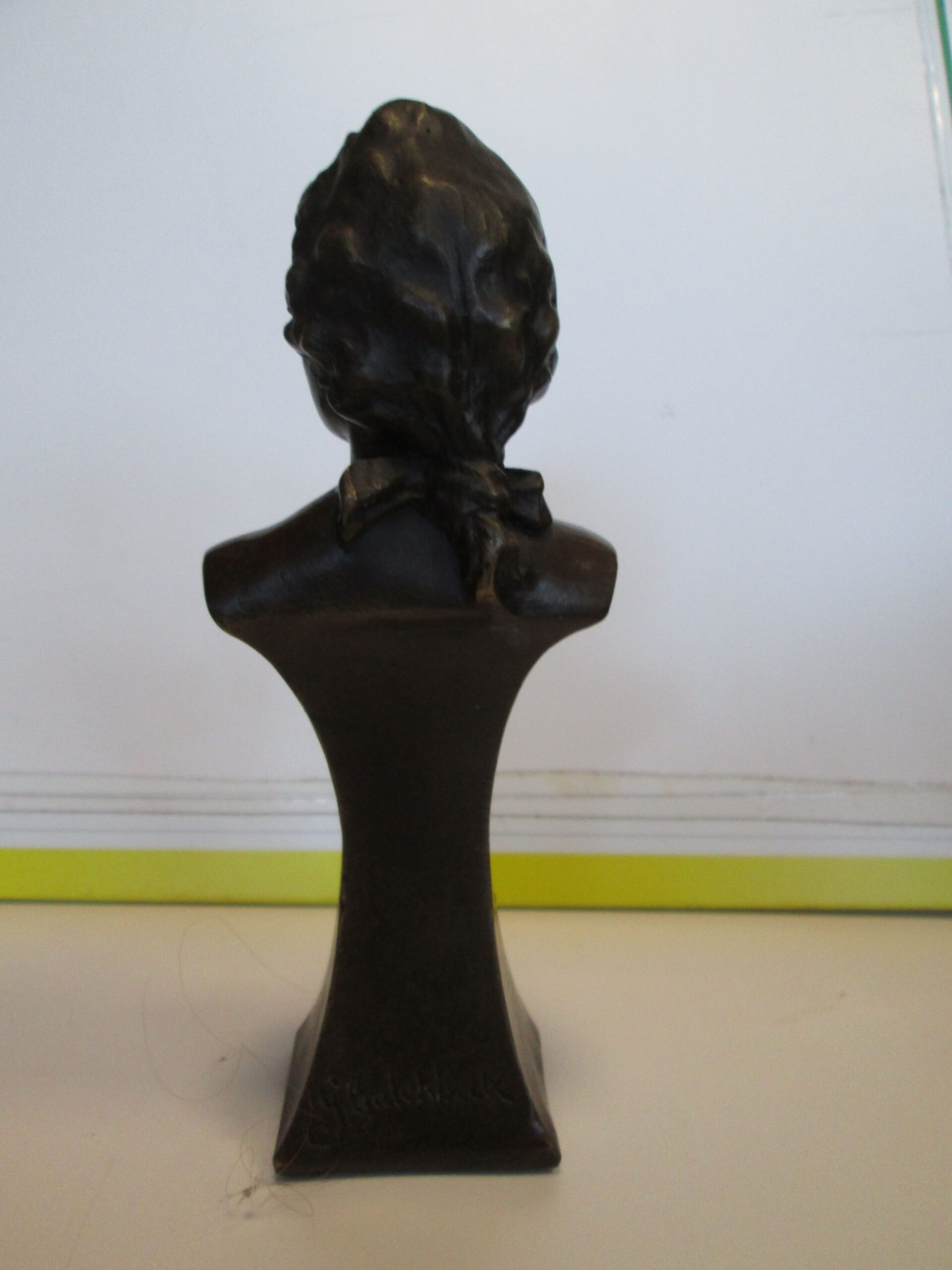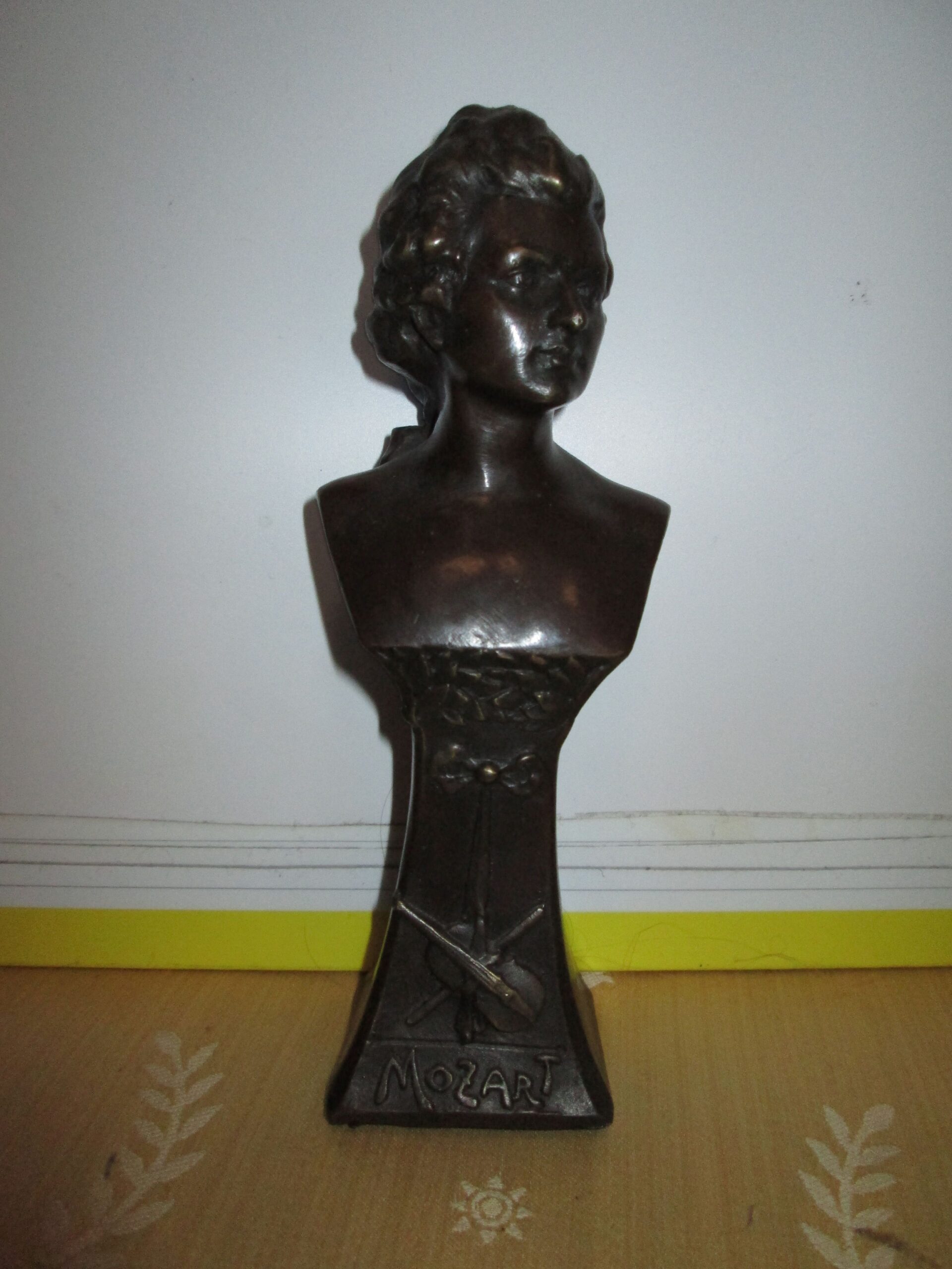 Piękne popiersie wykonane z brązu przedstawiające słynnego kompozytora Mozarta. Wykonane na początku XX wieku przez niemiecką firmę Gladehbeck. Wysokośc 18 ccm, szerokość 6.5 cm. Wykonany z wielką dokładnością.