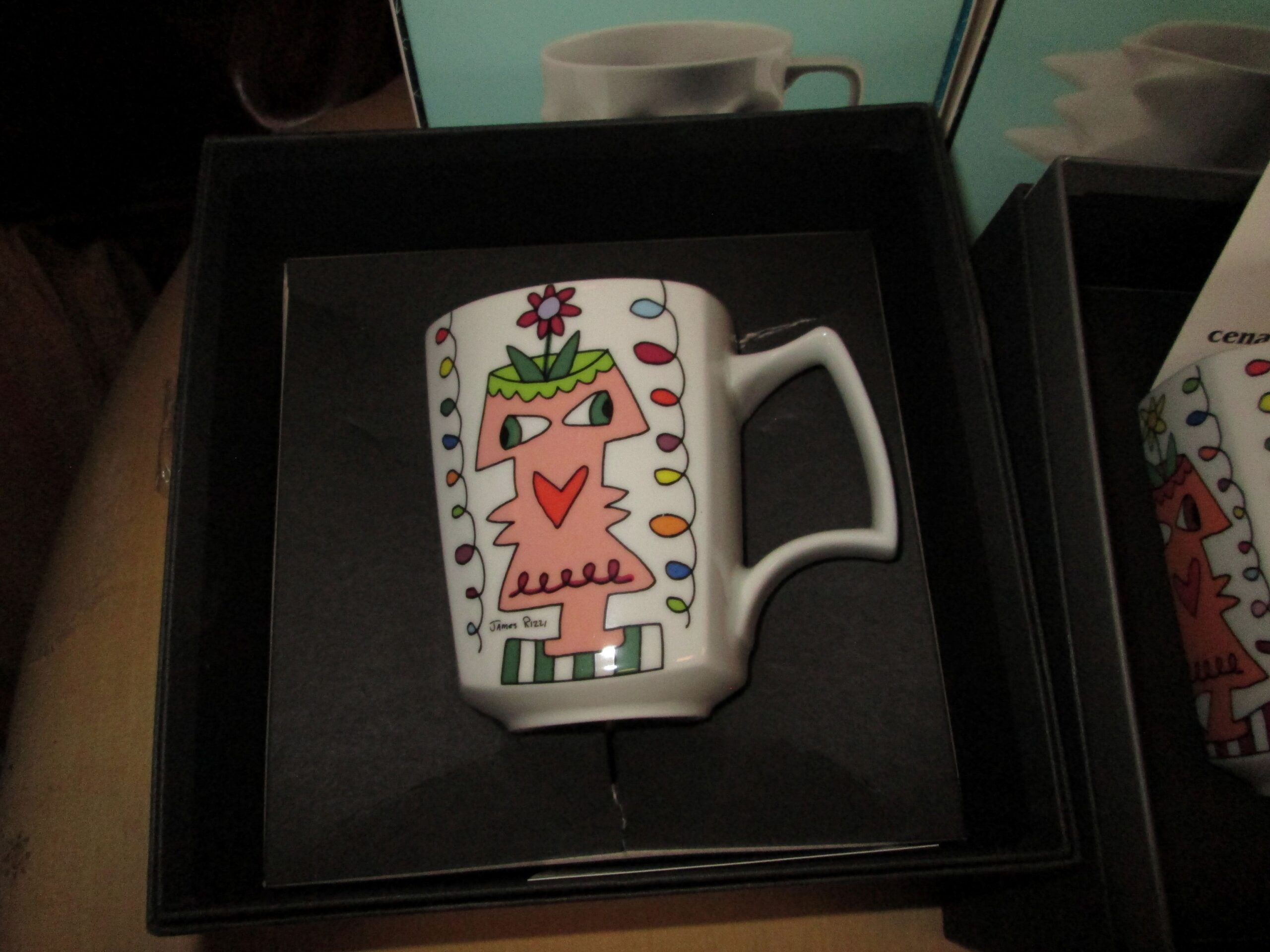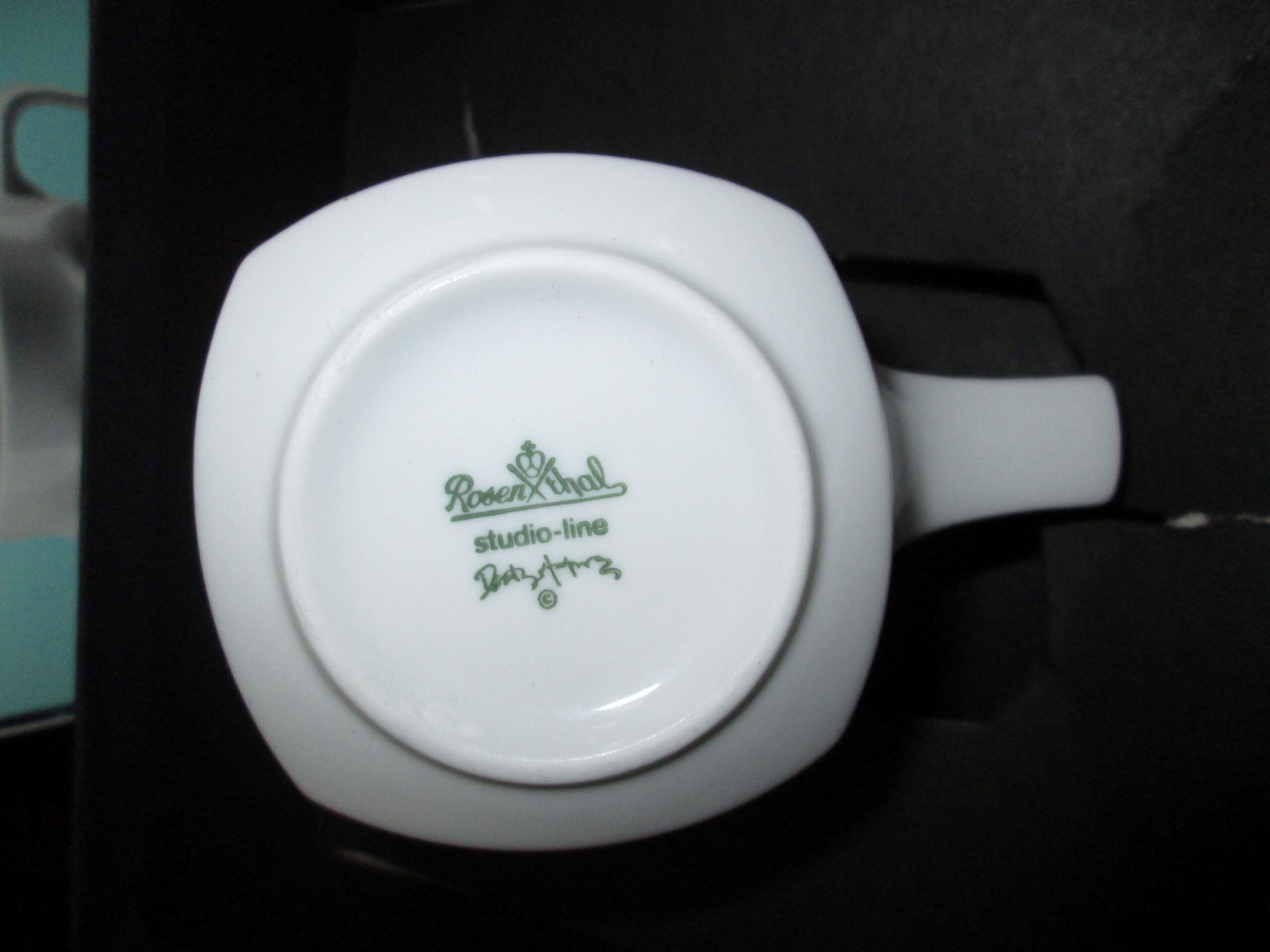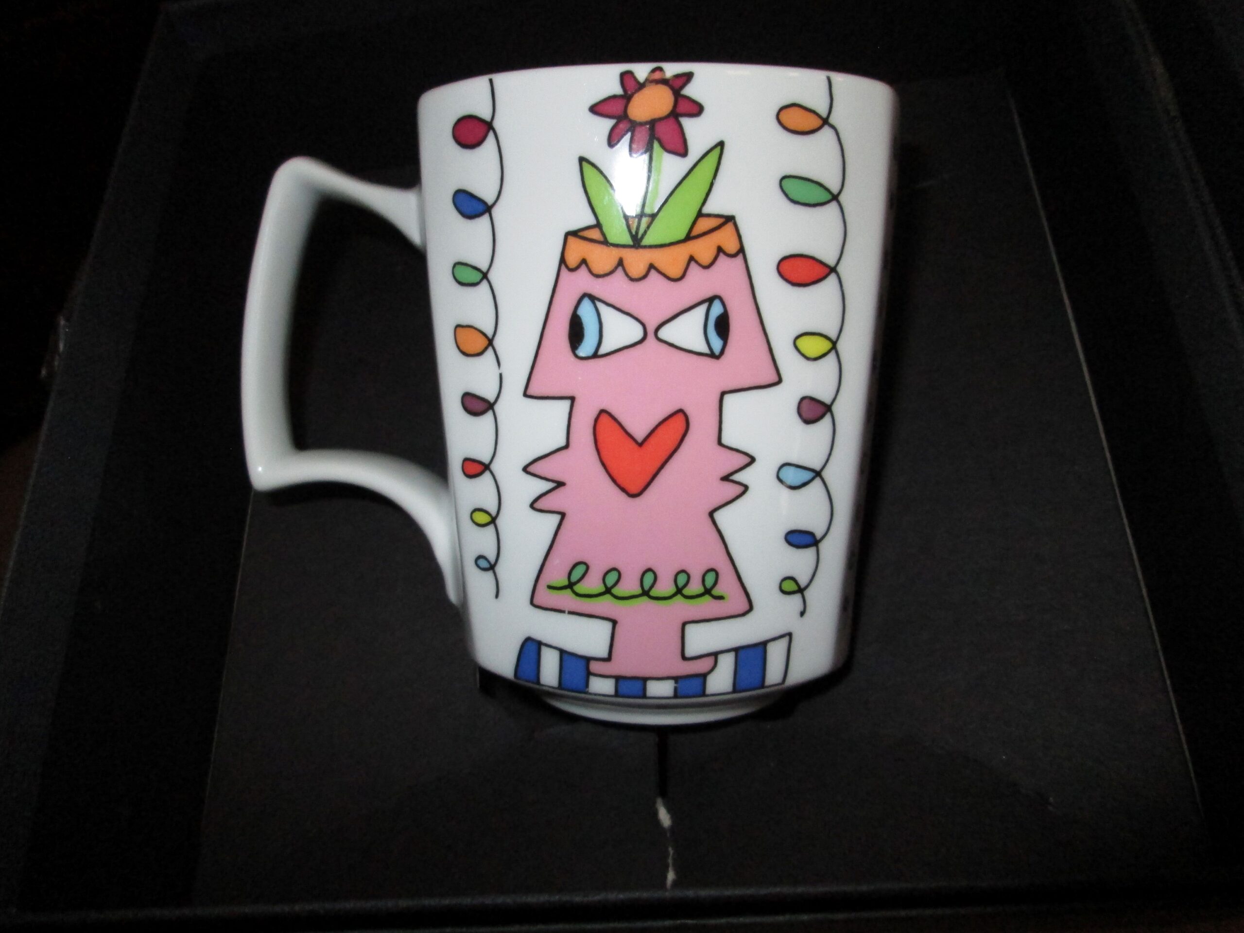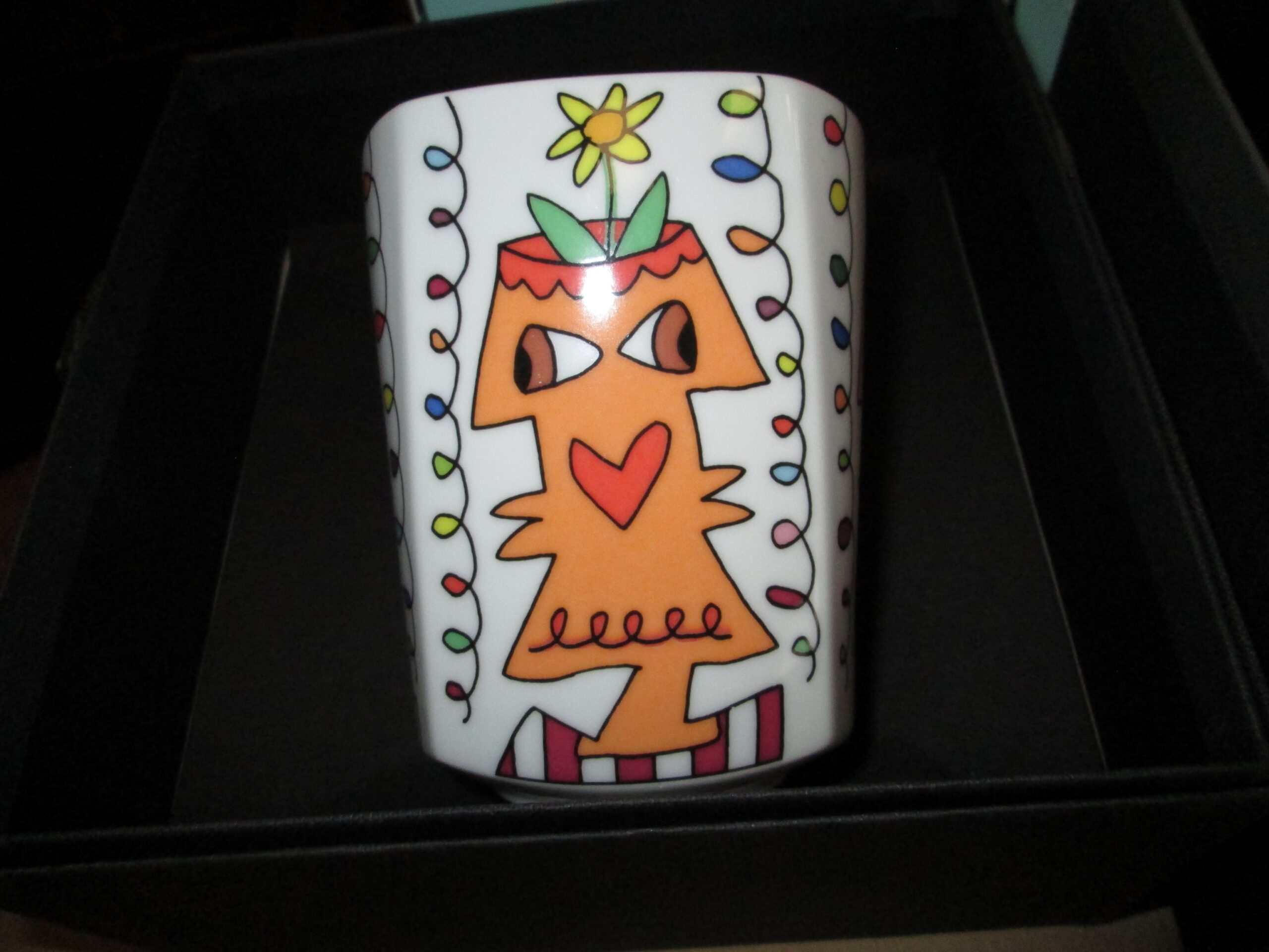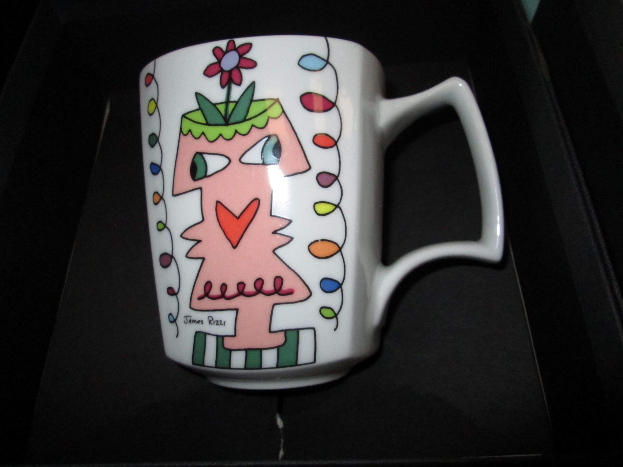 Porcelanowy kubek firmy Rosenthal.Seria limitowana. Zdobienia zaprojektował słynny projektant Pop artu James Rizzi. Oryginalne opakowanie .Średnica 8 cm, wysokość 9 cm.Stan witrynowy.  Na stanie 2 sztuki.