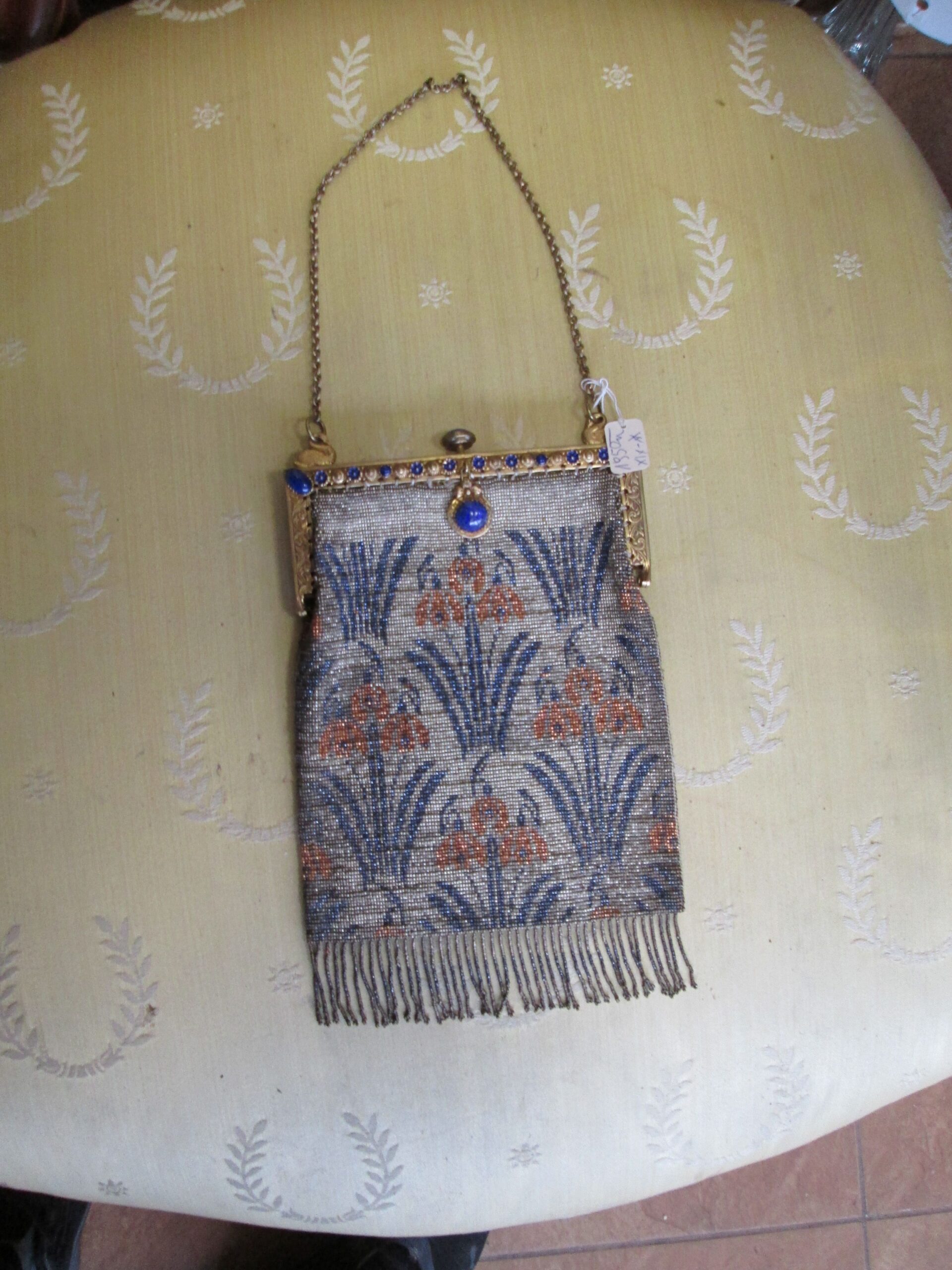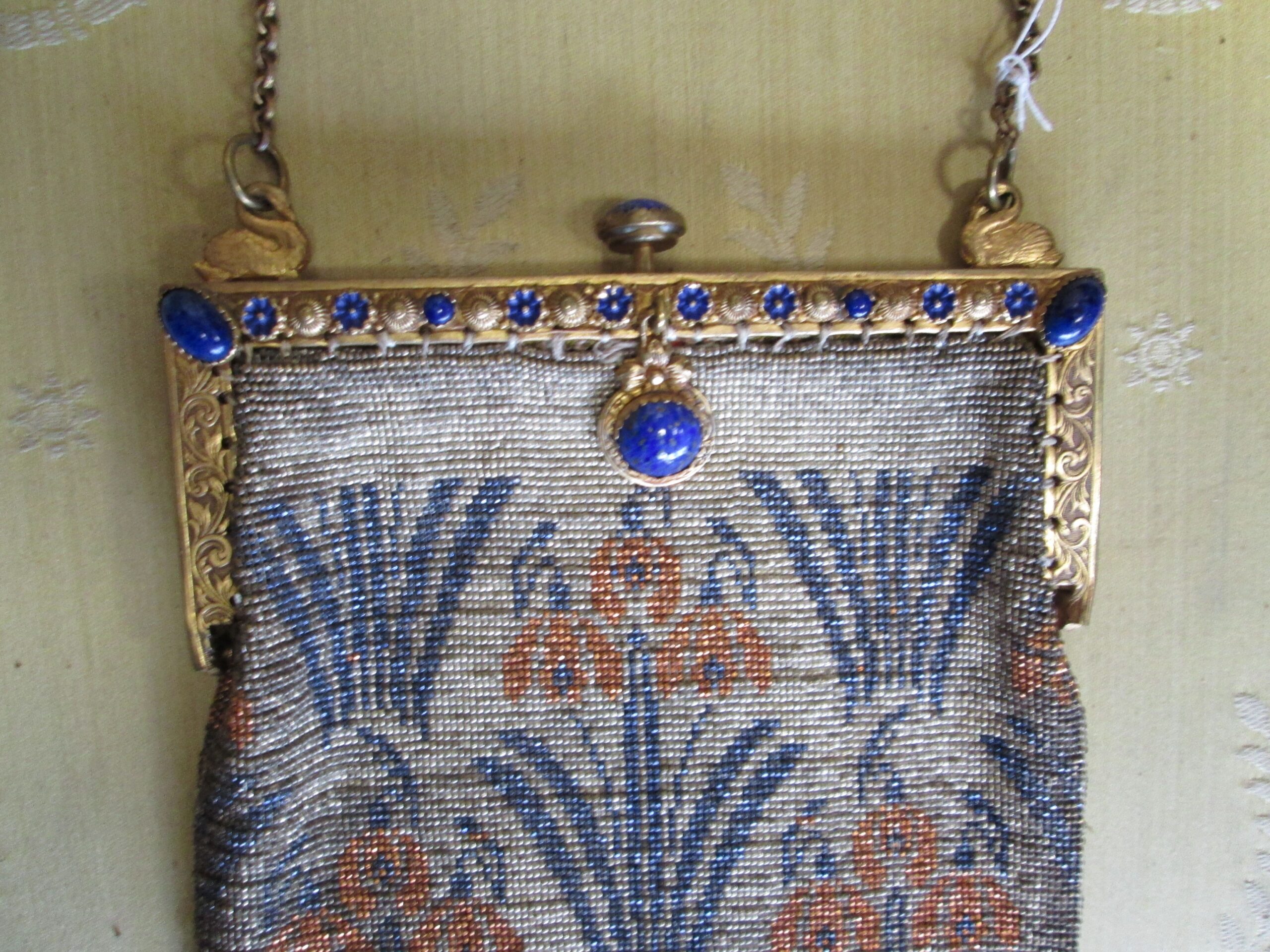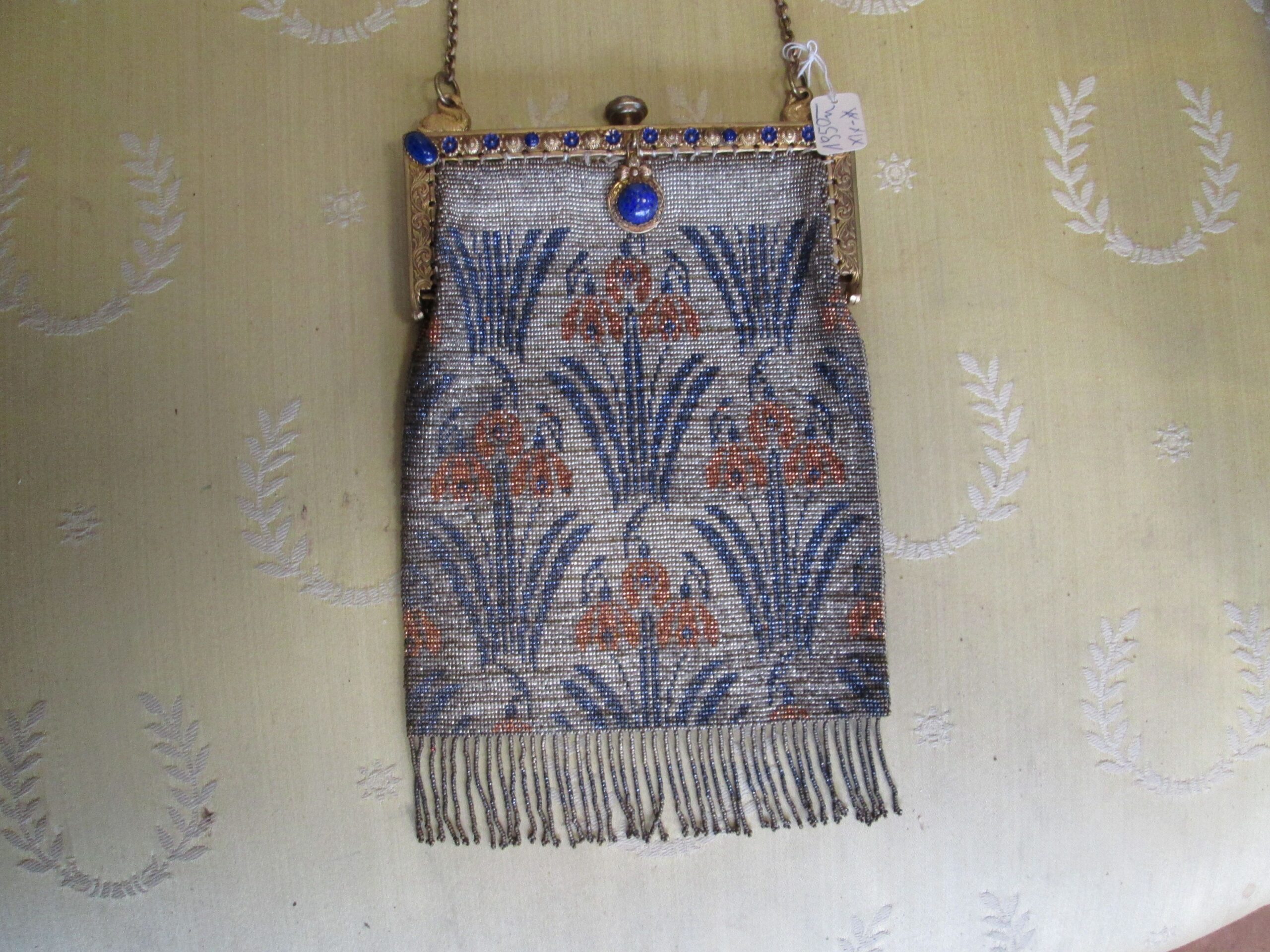 Piękna secesyjna torebka ,ręcznie wykonana z koralików. Zapięcie sprawne w stylu Empir. Górne wykończenie naturalnymi kamieniami lapis lazuli. Oryginalny łańcuszek pozłacany. Podobne torebki pokazują się na ekskluzywnych aukcjach za granicą i osiągają wysokie ceny. Prawdziwa gratka dla znawców tematu. Wysokość 19 cm , szerokość 14 cm.