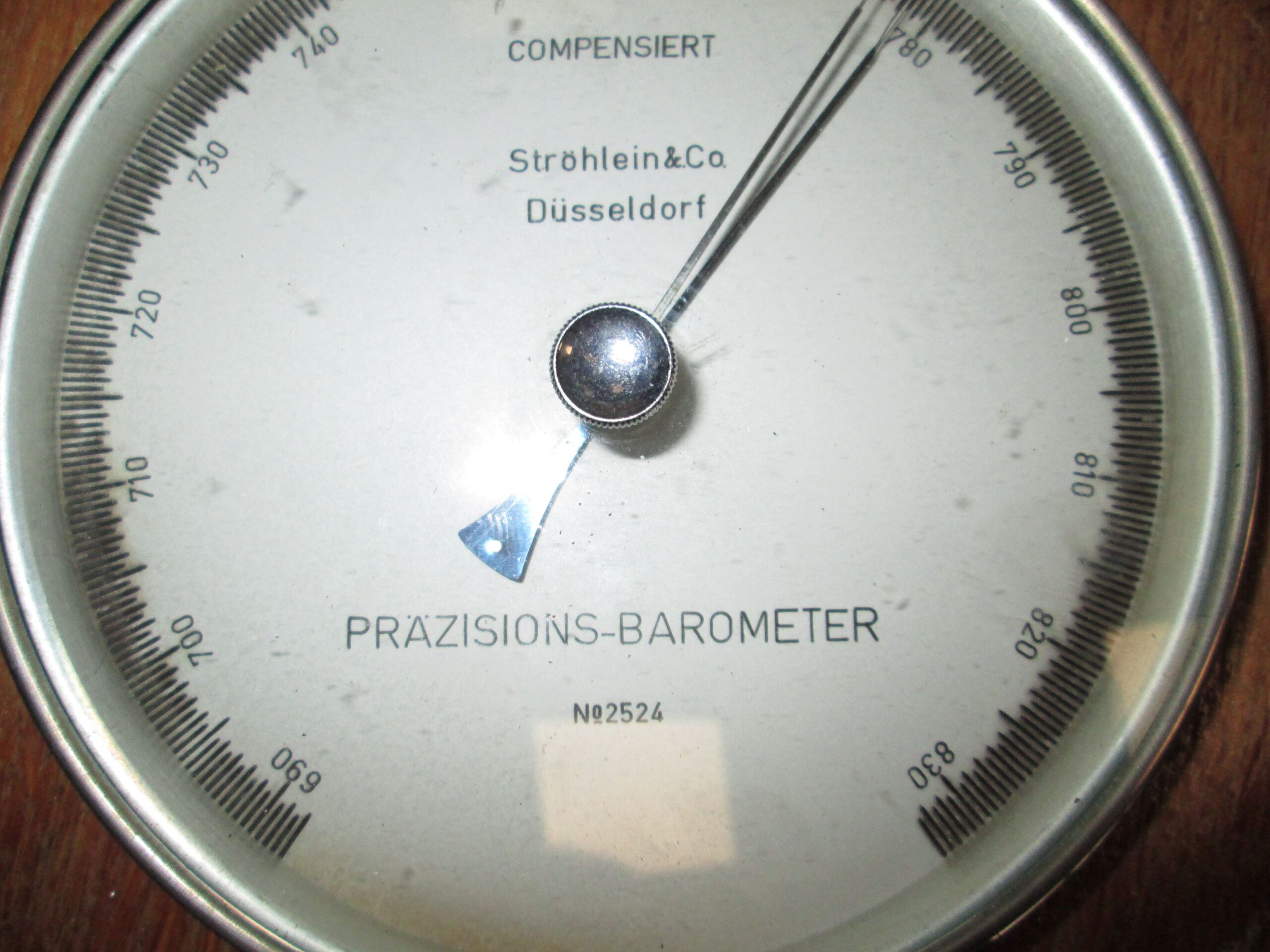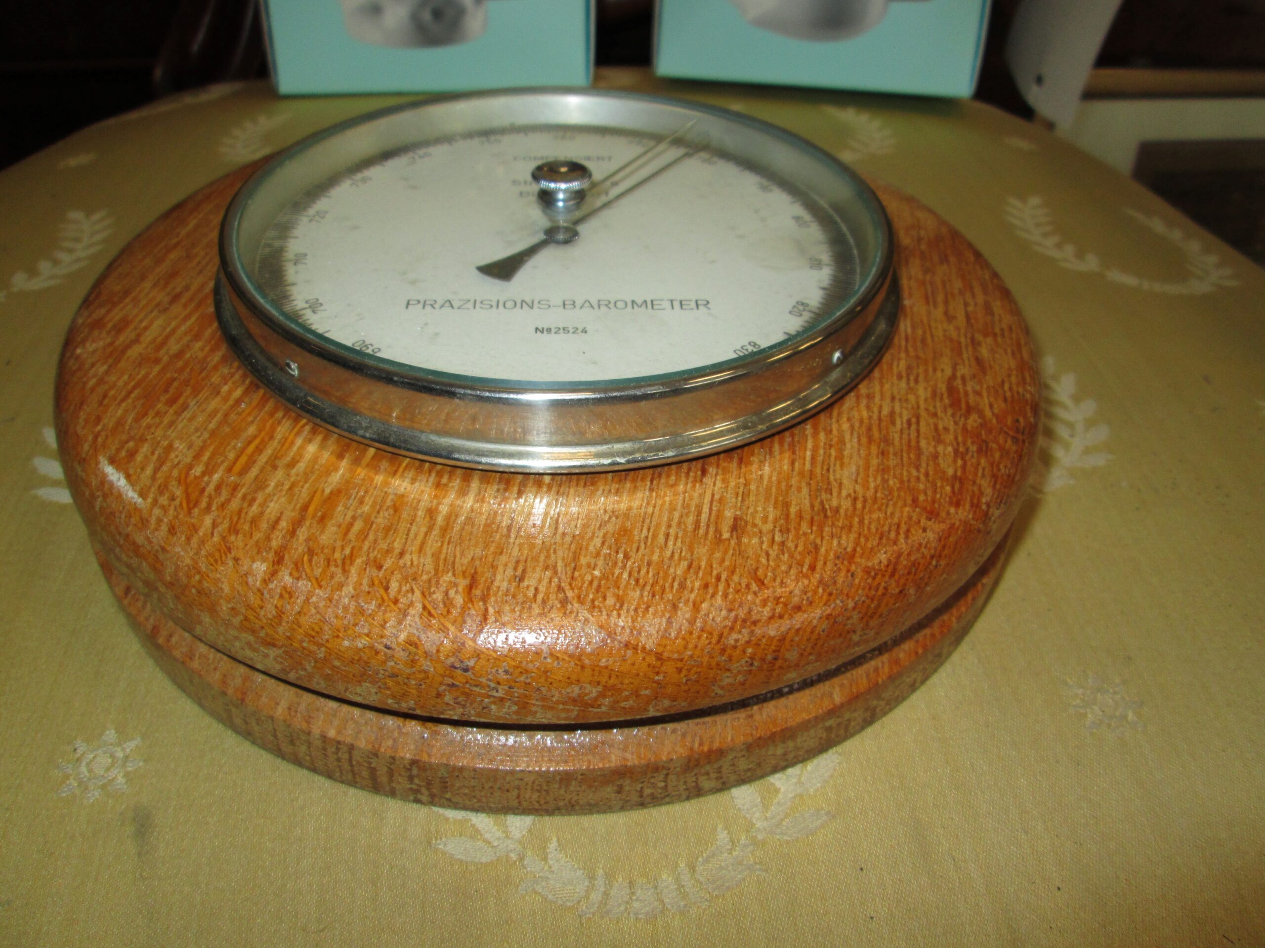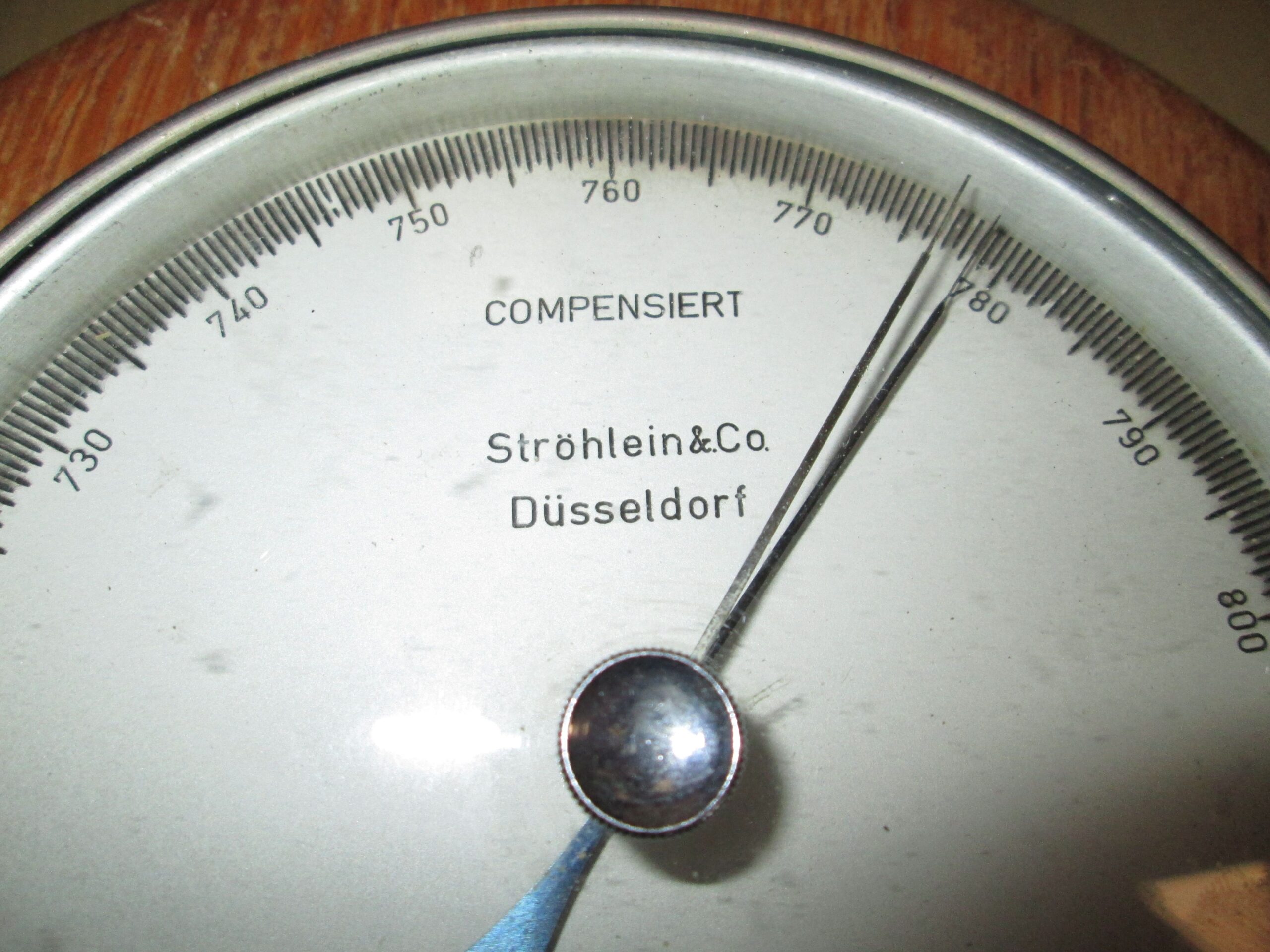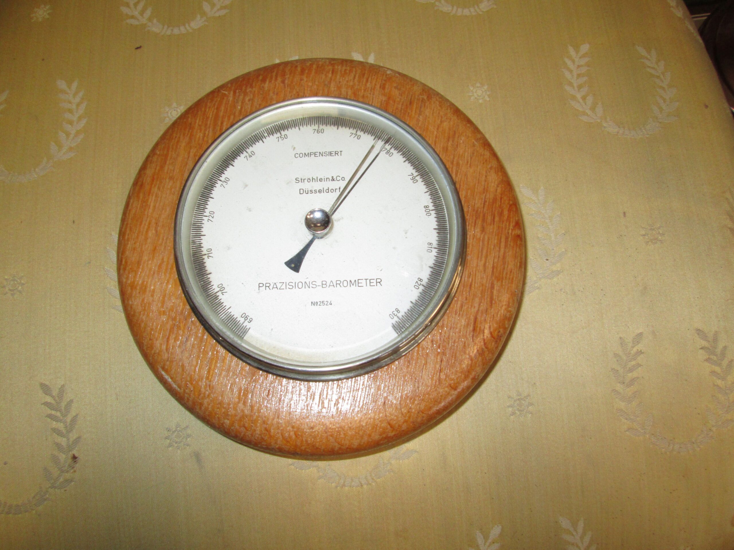 Stary barometr wykonany w firmie Strohlein&Co. w Dusseldorf , Niemcy. Podstawa z drewna dębowego. Średnica 20 cm, grubość 6 cm. Stan bardzo dobry ,w pełni sprawny.