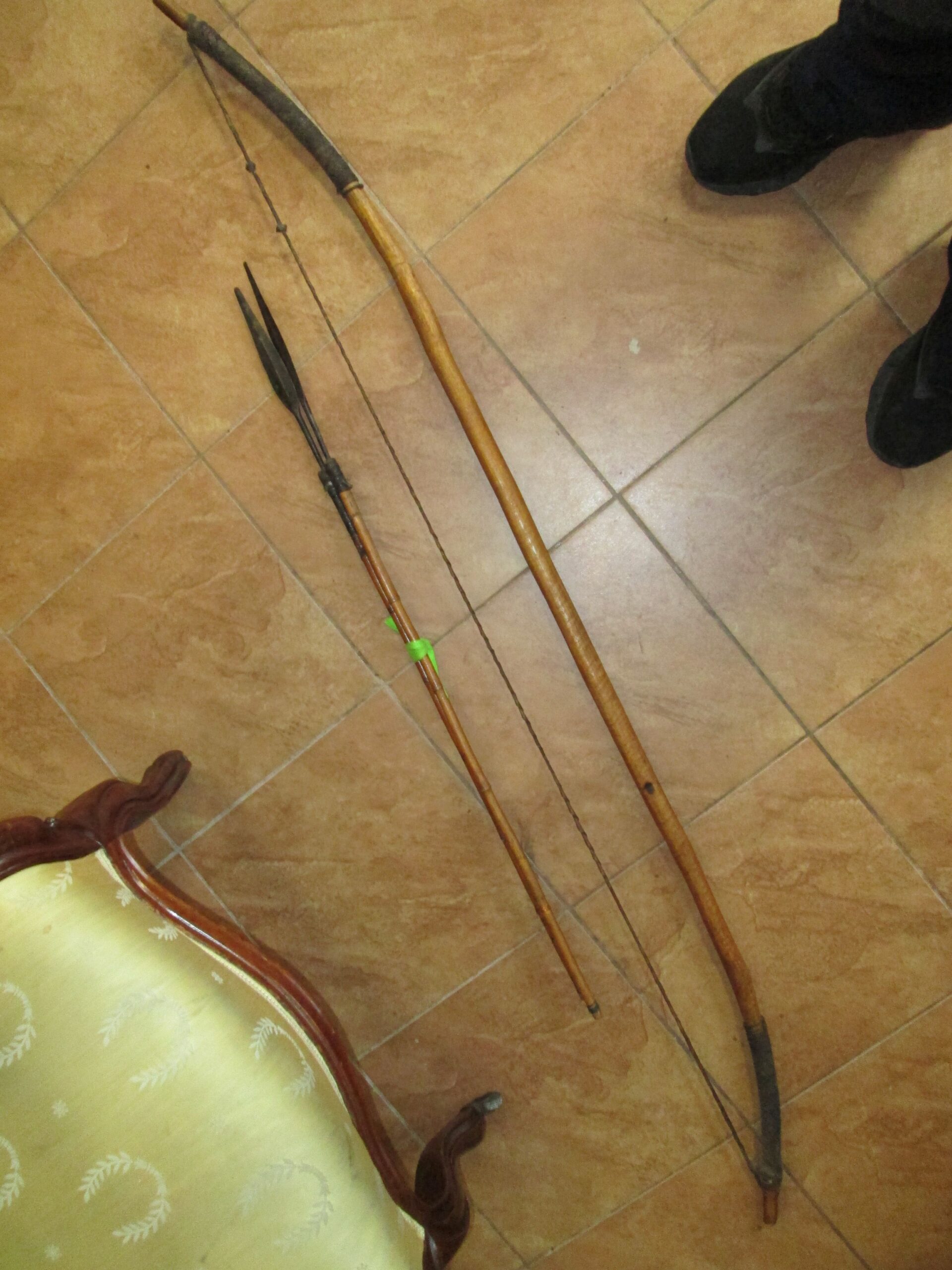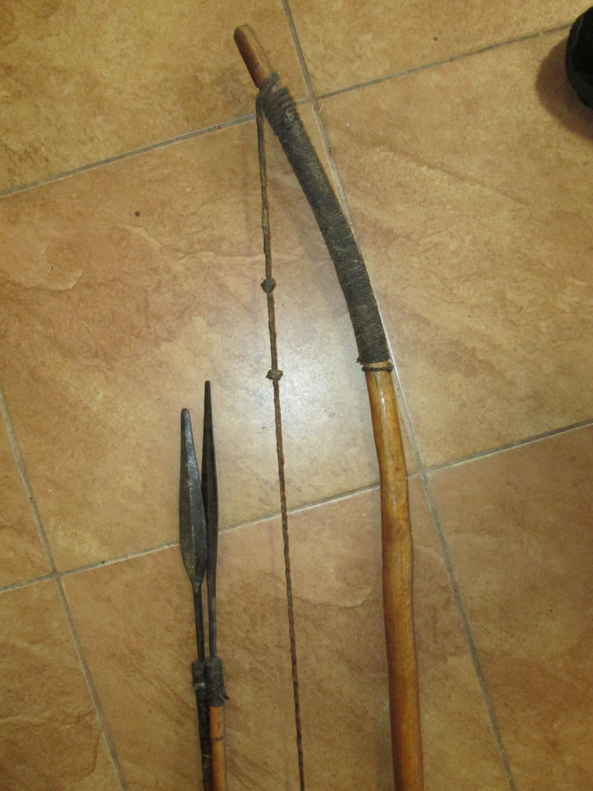 Stary drewniany łuk i strzały wykonane w Afryce Środkowej . Strzały mają groty żelazne ręcznie wykute. Długość łuku ok 160 cm , długość strzał ok 90 cm. Ciekawostka na naszym rynku antykwarycznym.