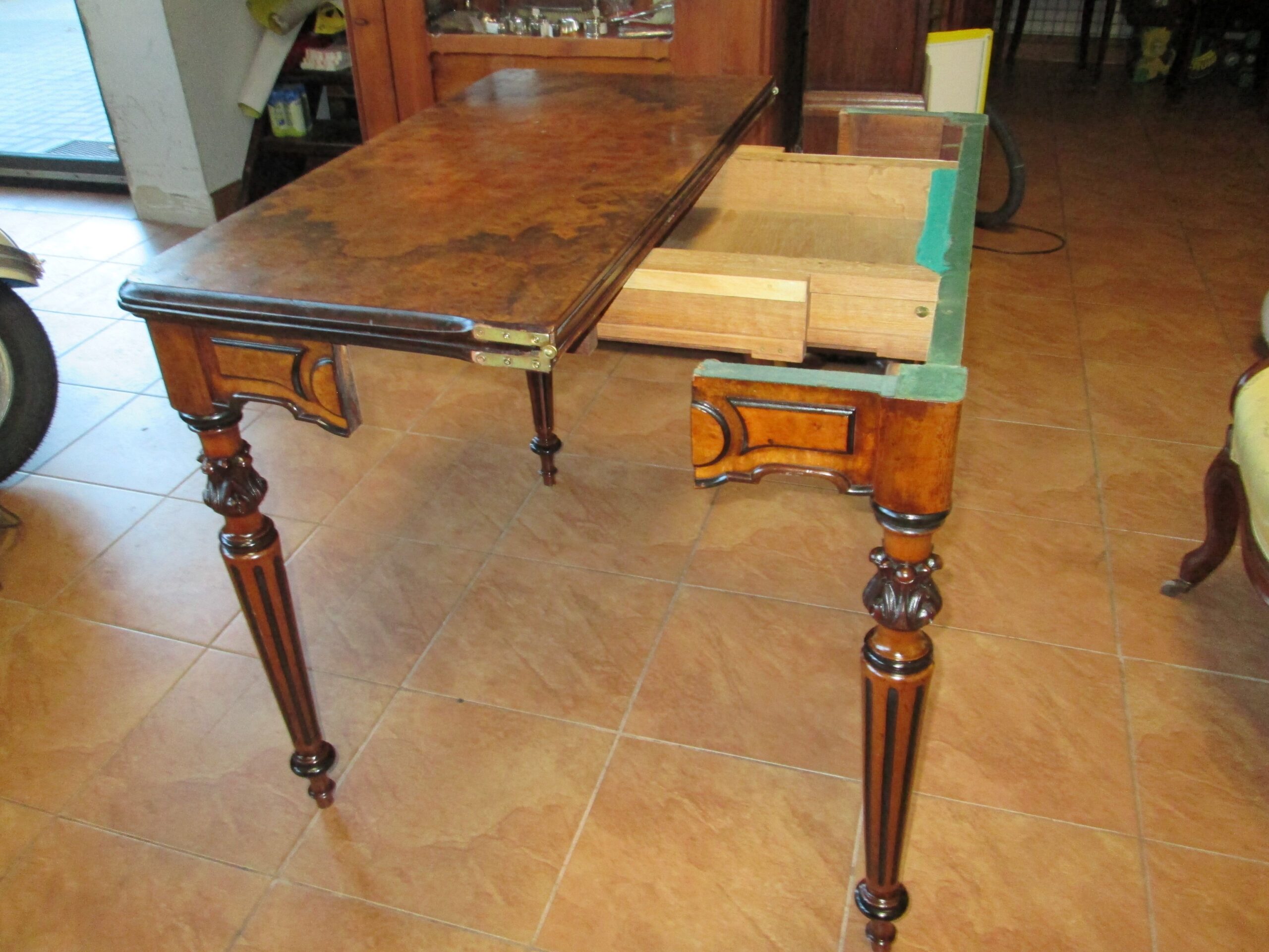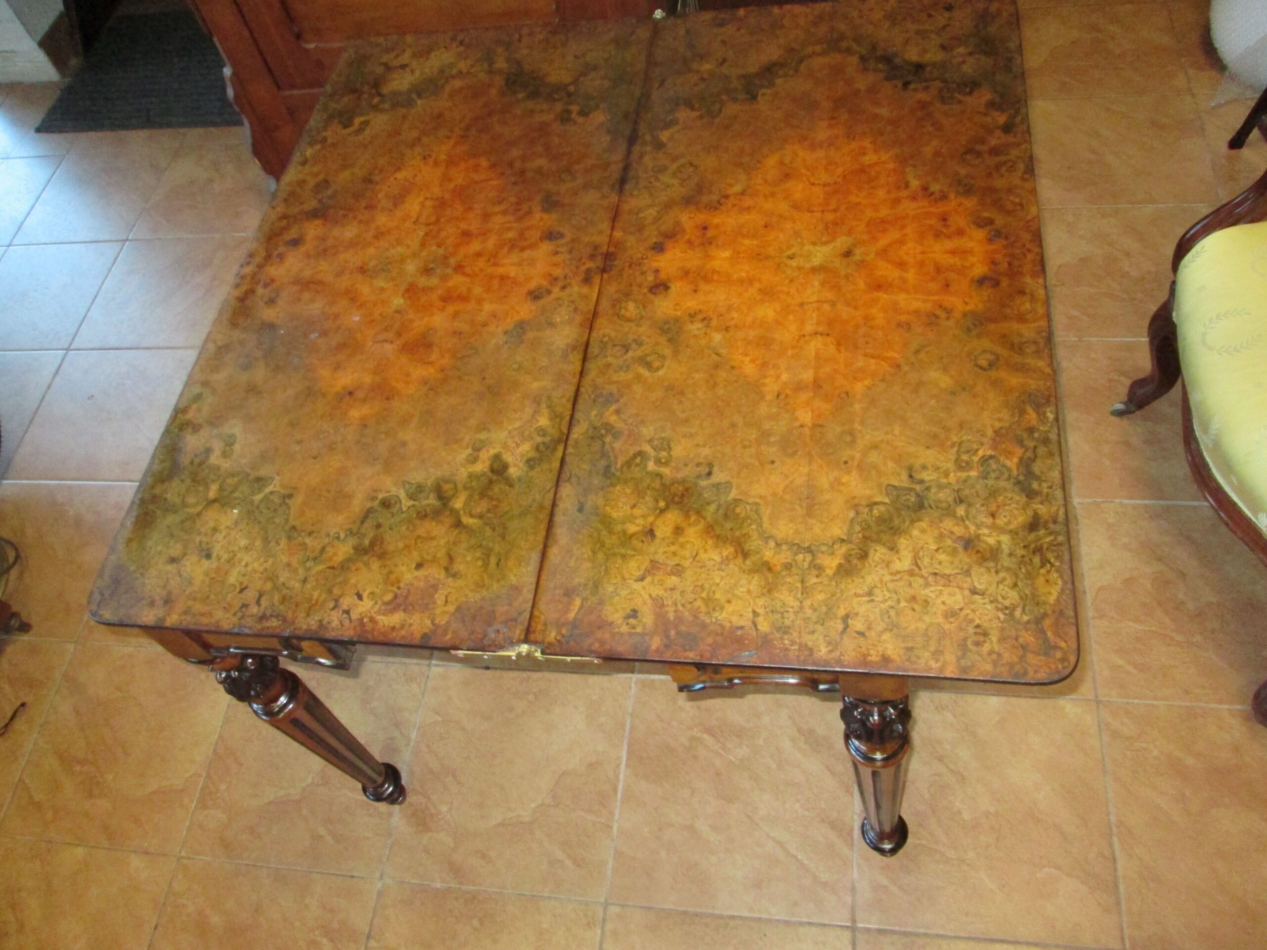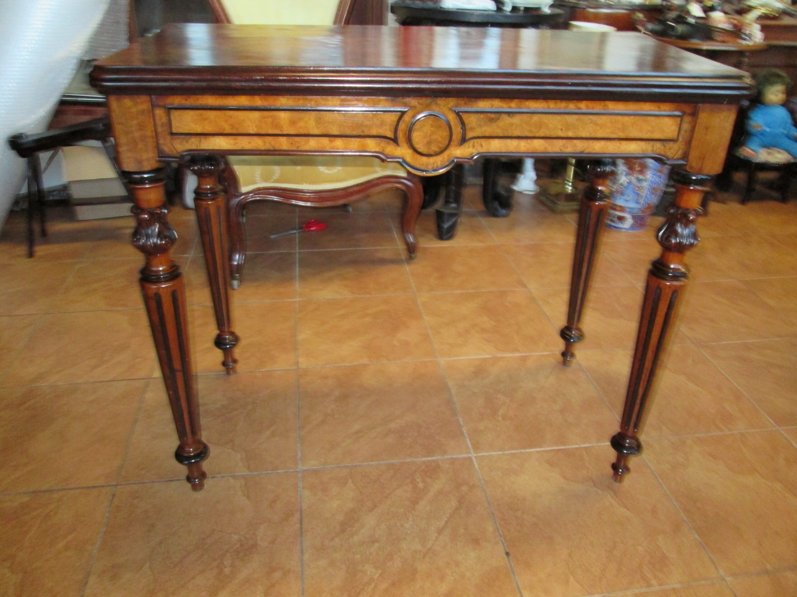 Ciekawy stolik z końca XIX wieku (okresu eklektyzmu). Wykonany z drewna orzechowego ,blat oklejony czeczotą orzechową. Stolik rozkładany zwany pomocniczym. Szerokość przed rozłożeniem 88 cm , głębokość 43 cm , wysokość 75 cm. Po rozłożeniu blat 88*87 cm. W środkowej części pod blatem szuflada. Stan dobry z plusem.