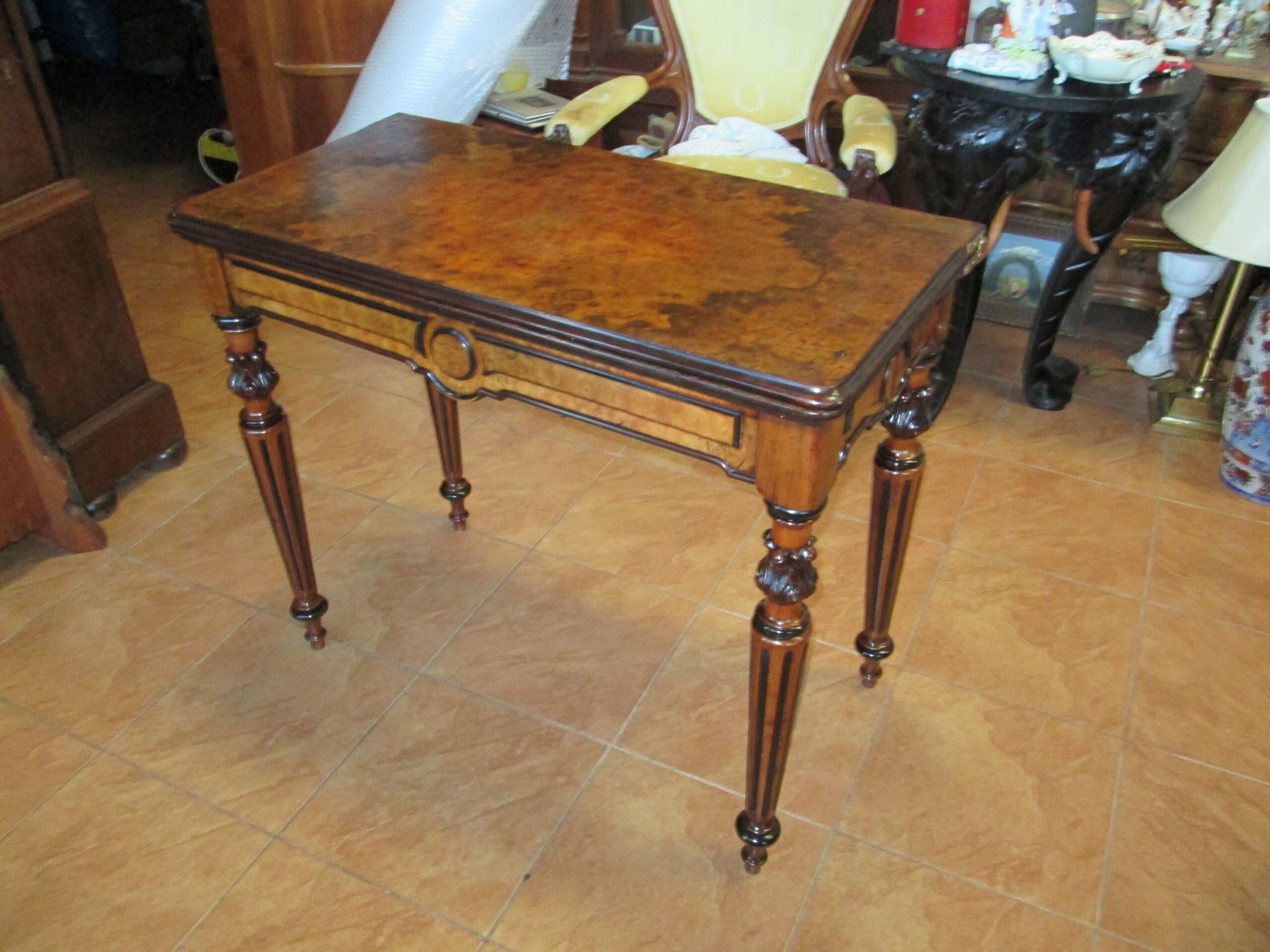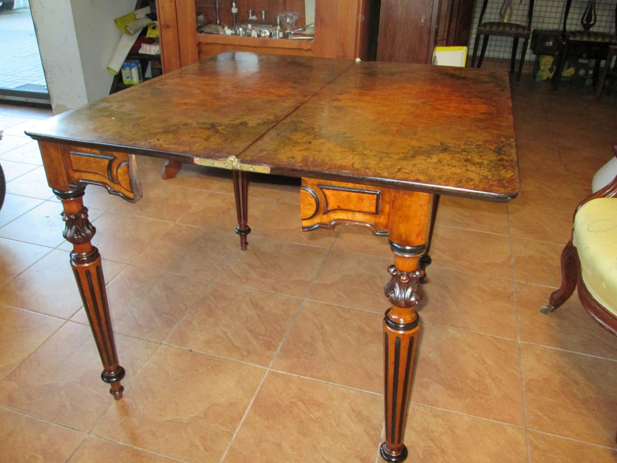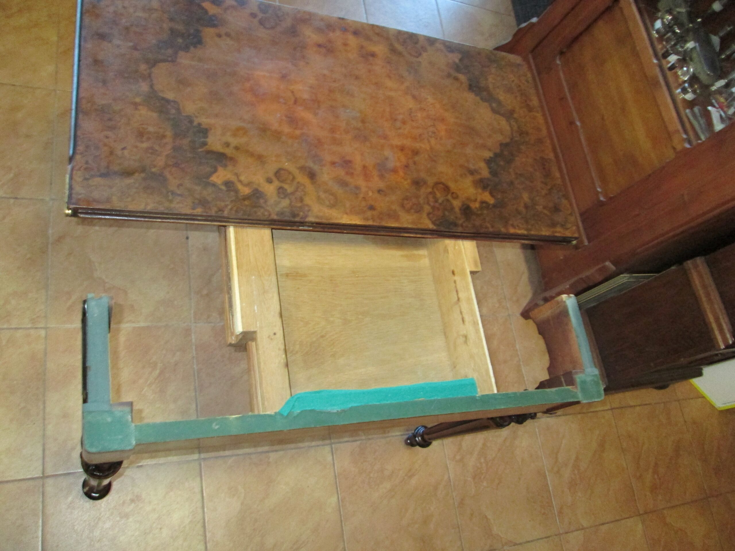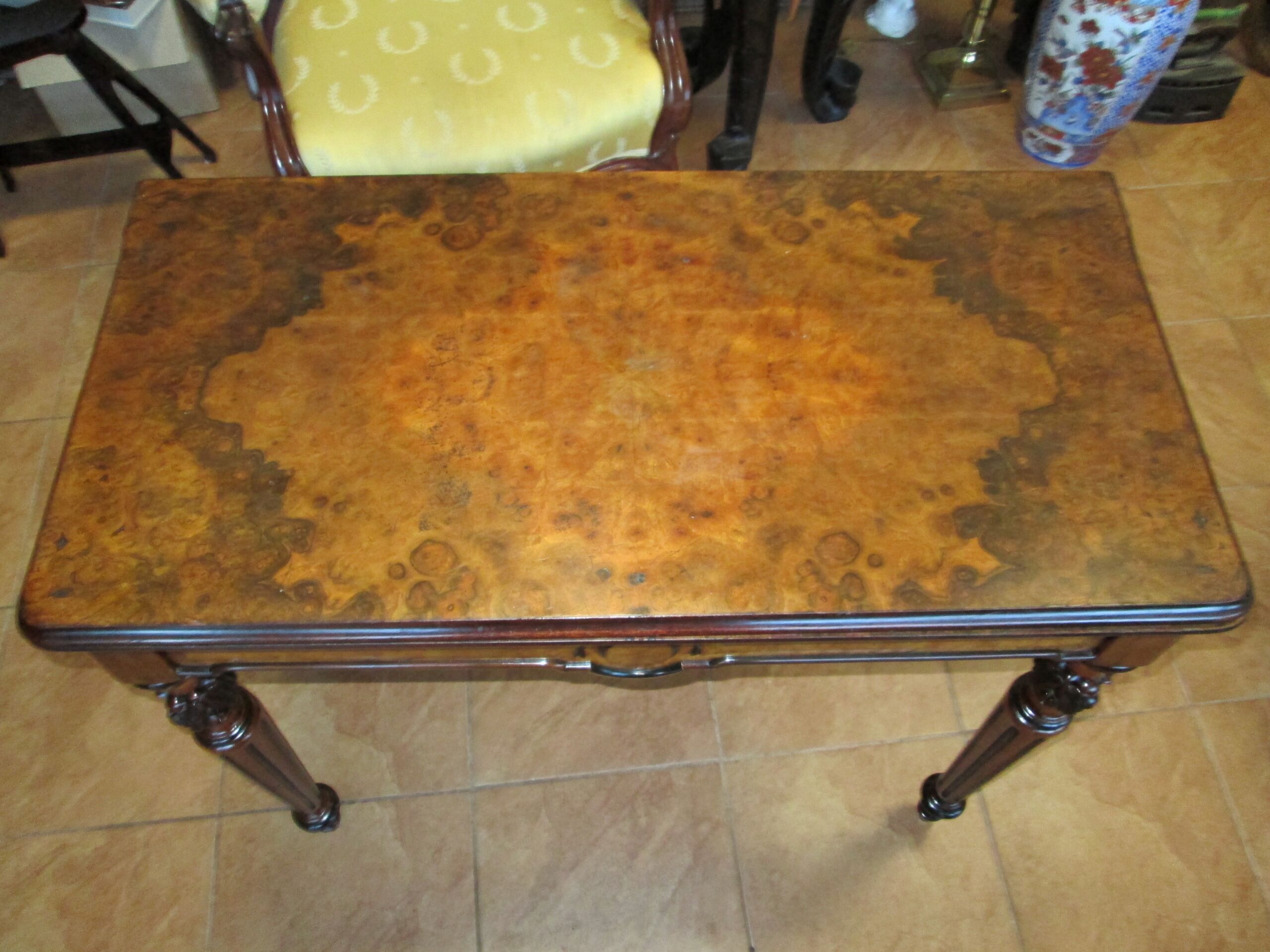 Ciekawy stolik z końca XIX wieku (okresu eklektyzmu). Wykonany z drewna orzechowego ,blat oklejony czeczotą orzechową. Stolik rozkładany zwany pomocniczym. Szerokość przed rozłożeniem 88 cm , głębokość 43 cm , wysokość 75 cm. Po rozłożeniu blat 88*87 cm. W środkowej części pod blatem szuflada. Stan dobry z plusem.