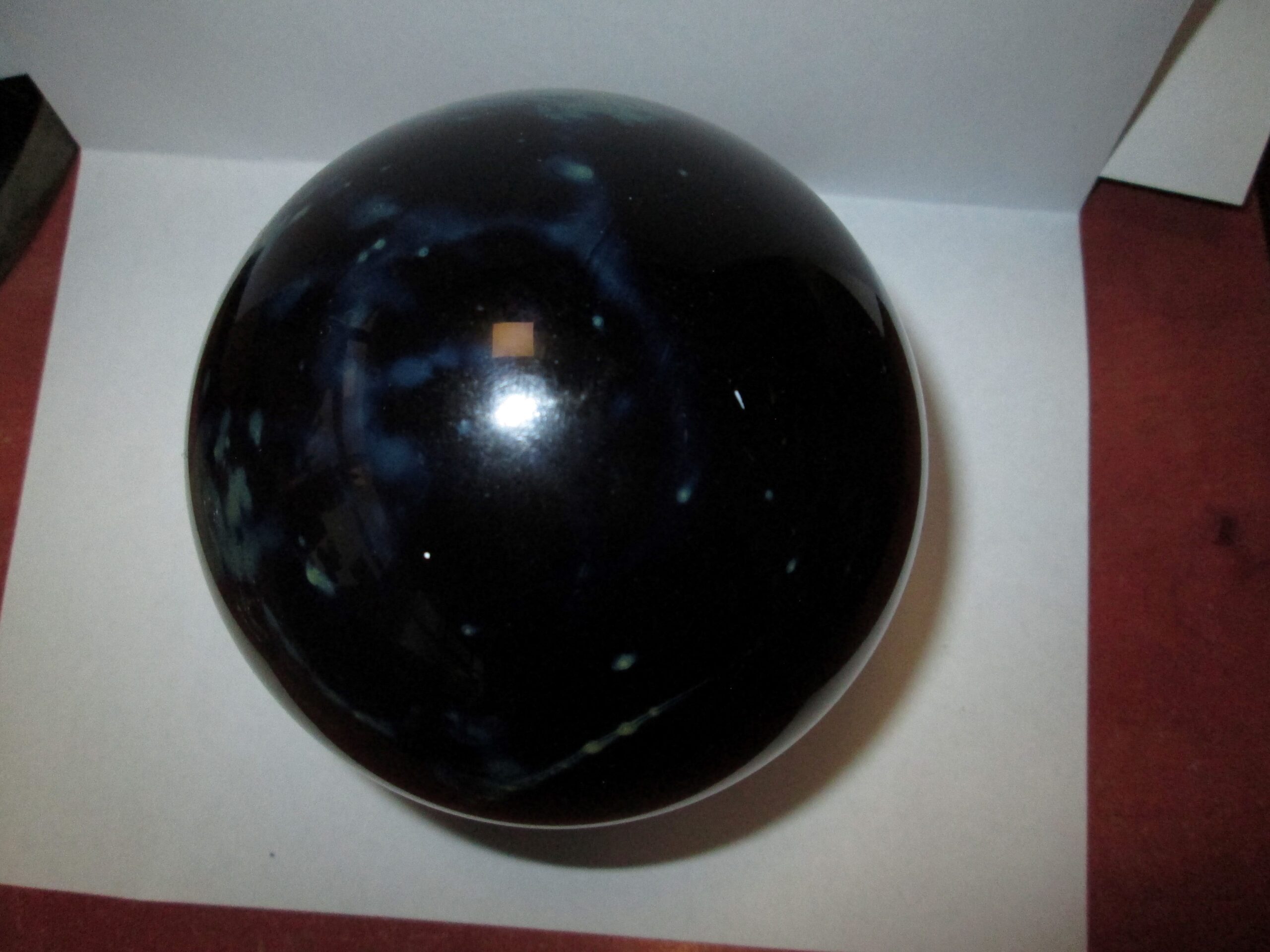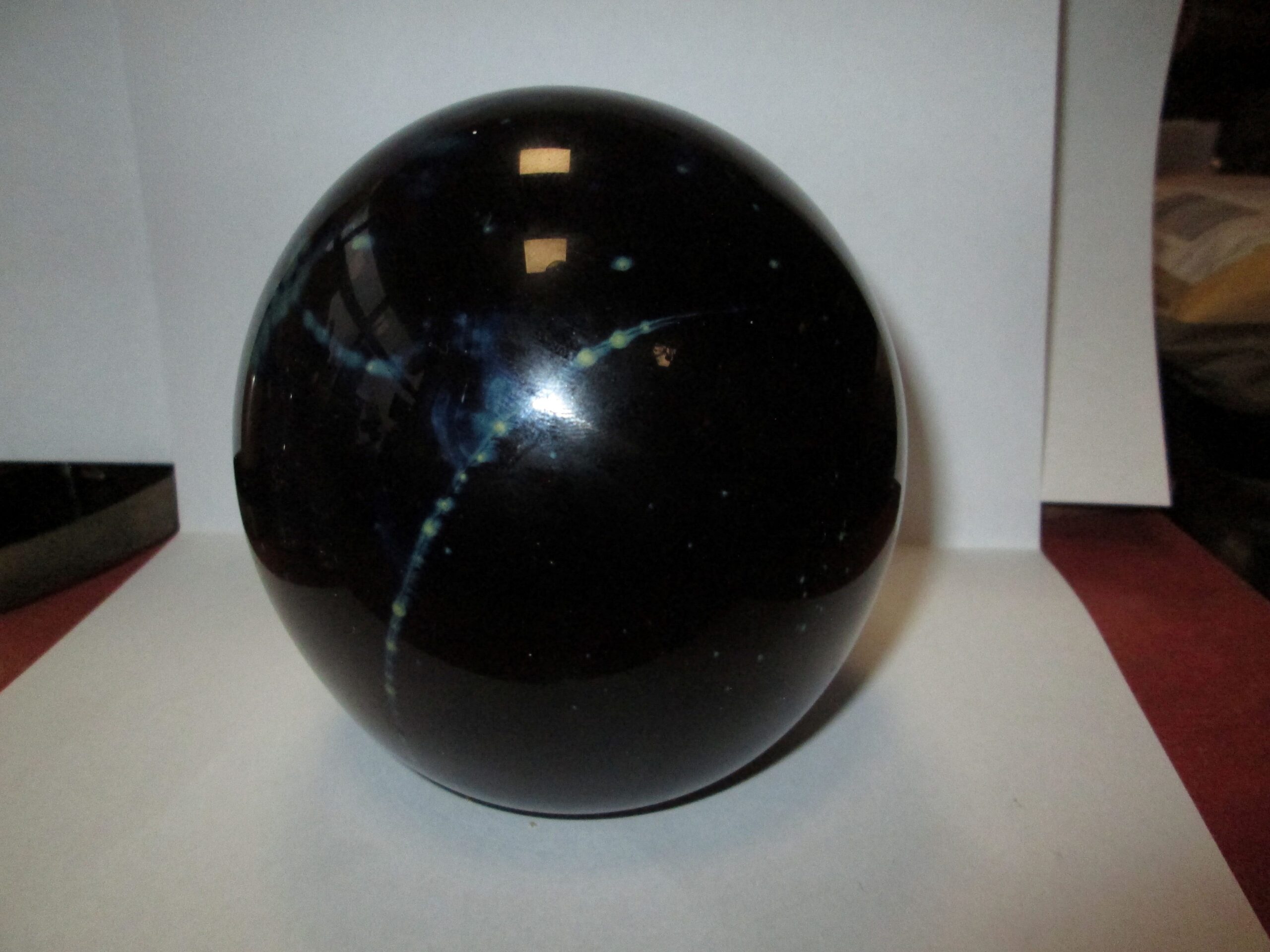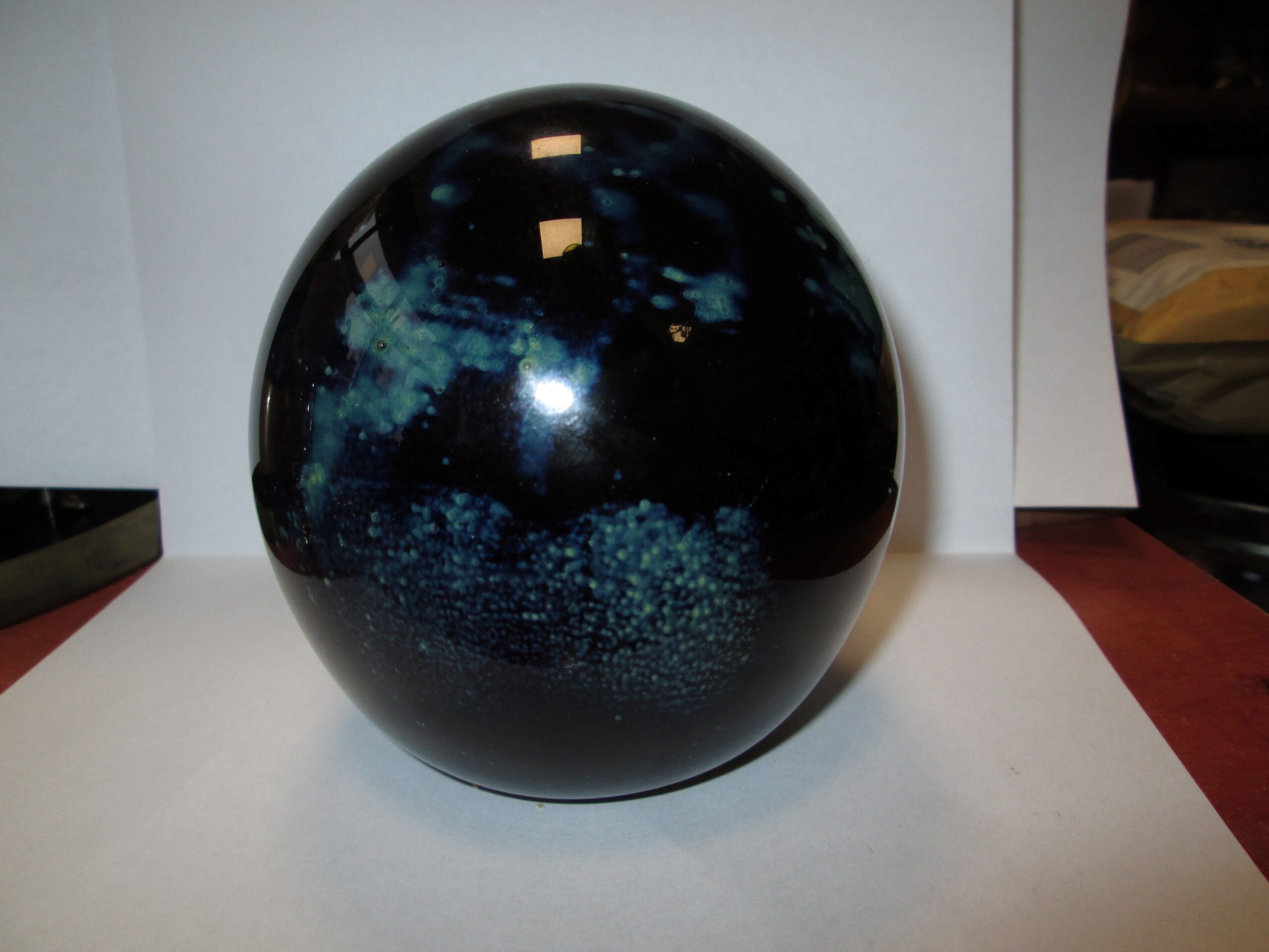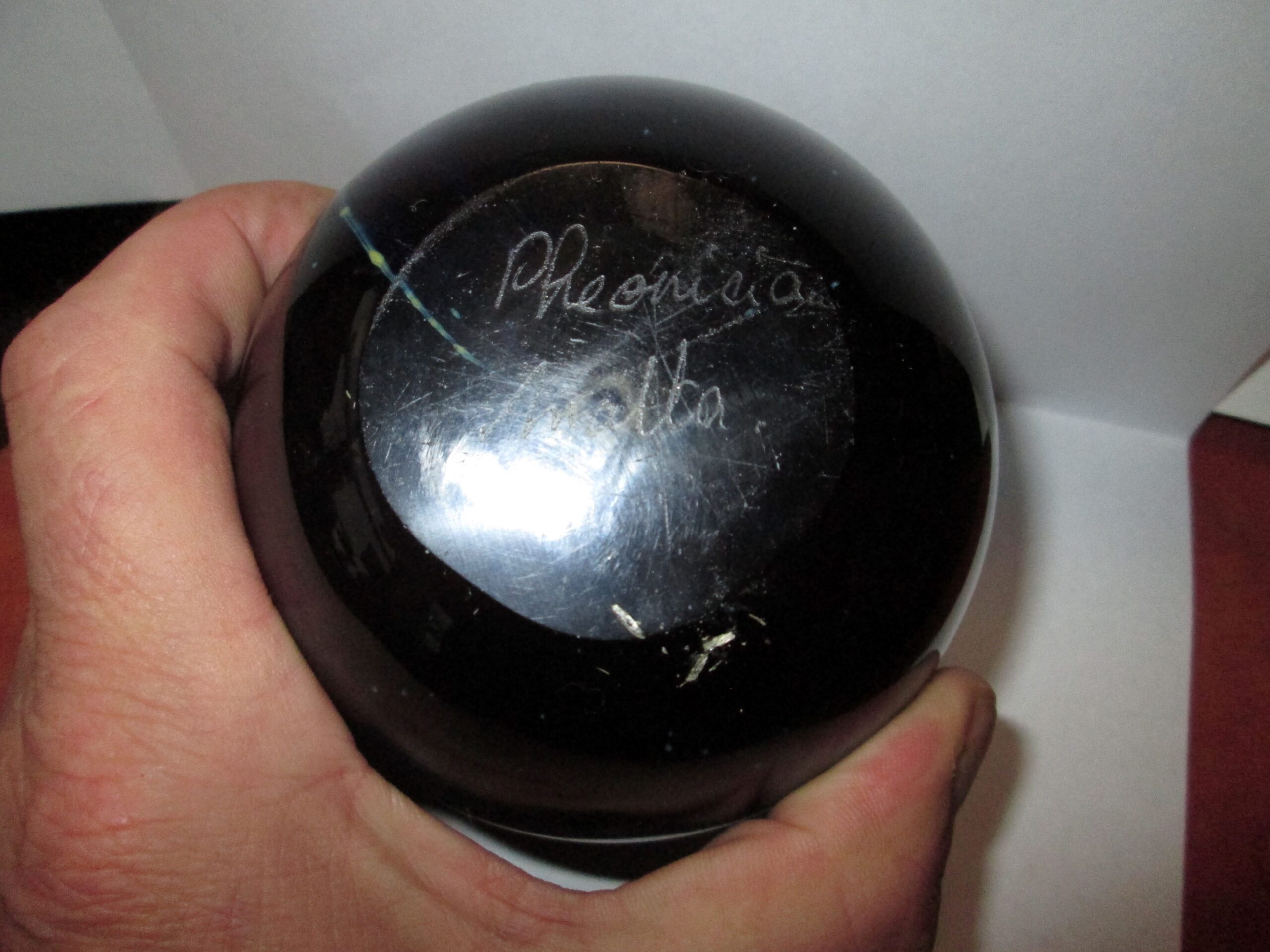 Duża kula o średnicy 10 cm ręcznie wykonana ze szkła barwionego w masie zwane fenickim. Od spodu sygnowana nazwiskiem i nazwą Malta. Stan bardzo dobry.