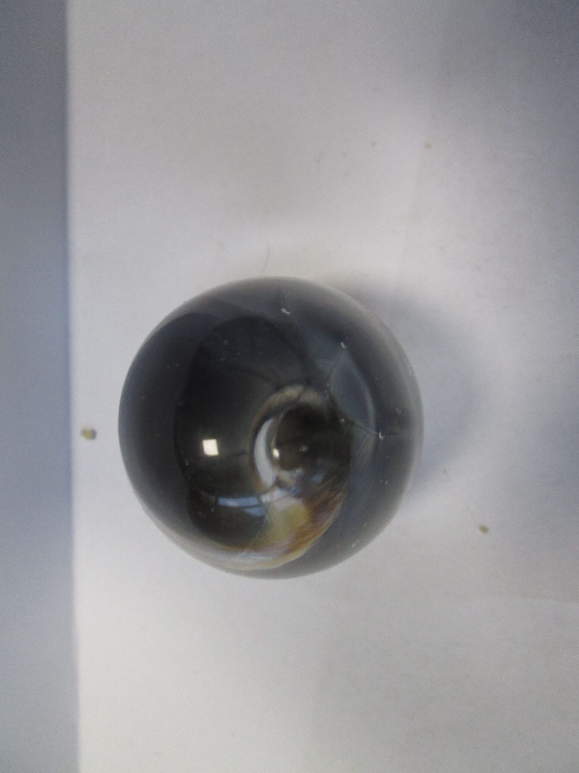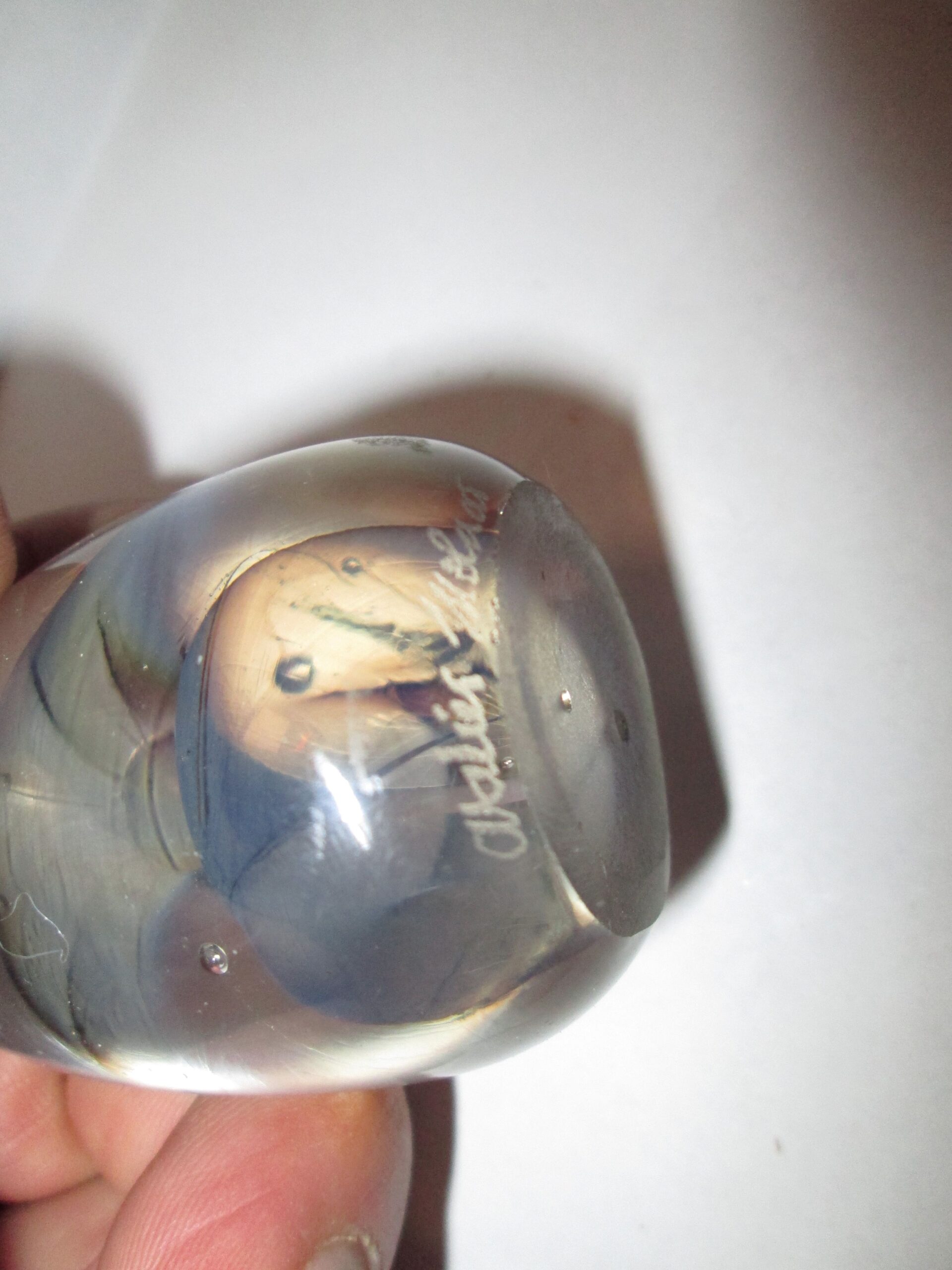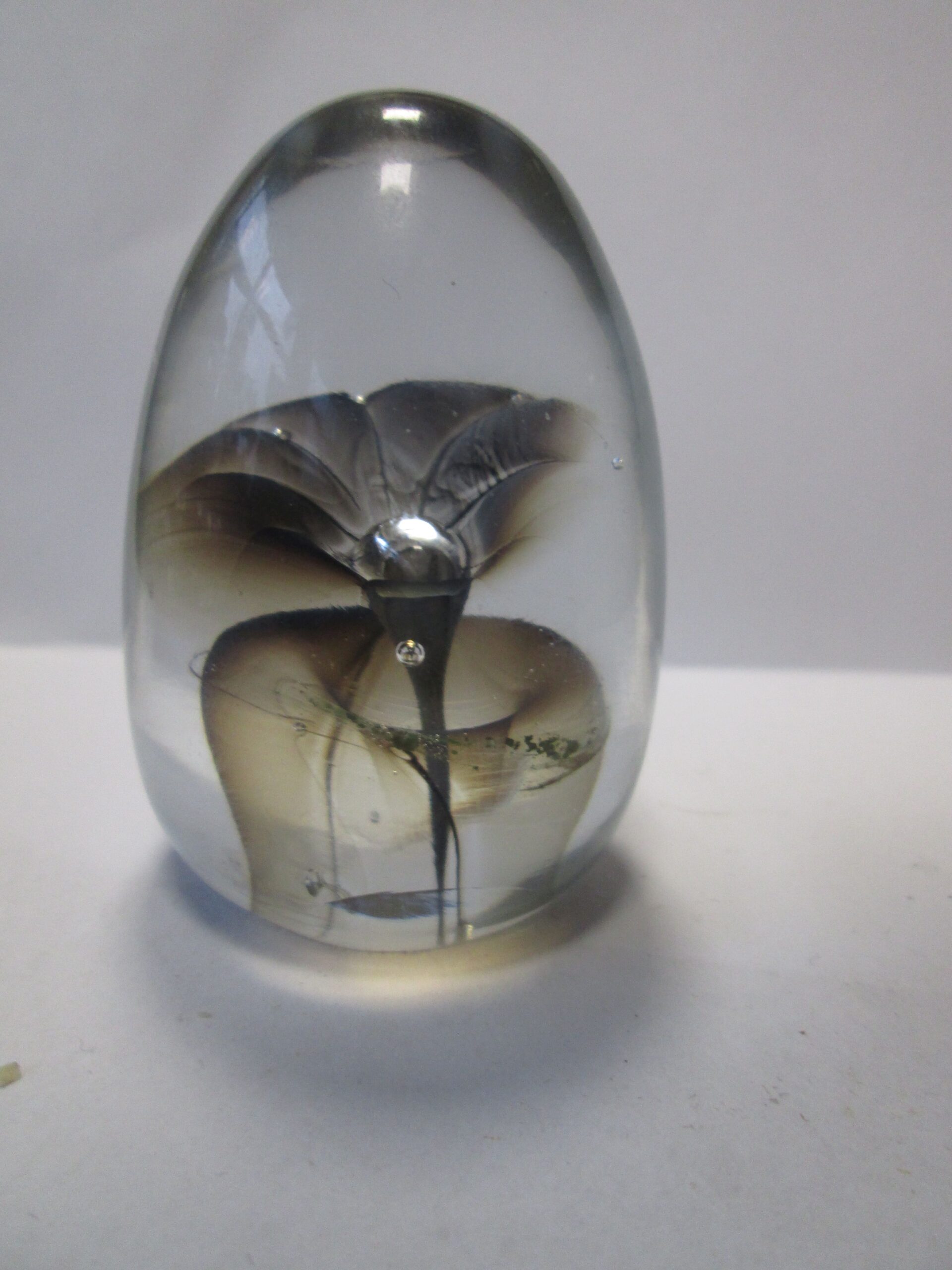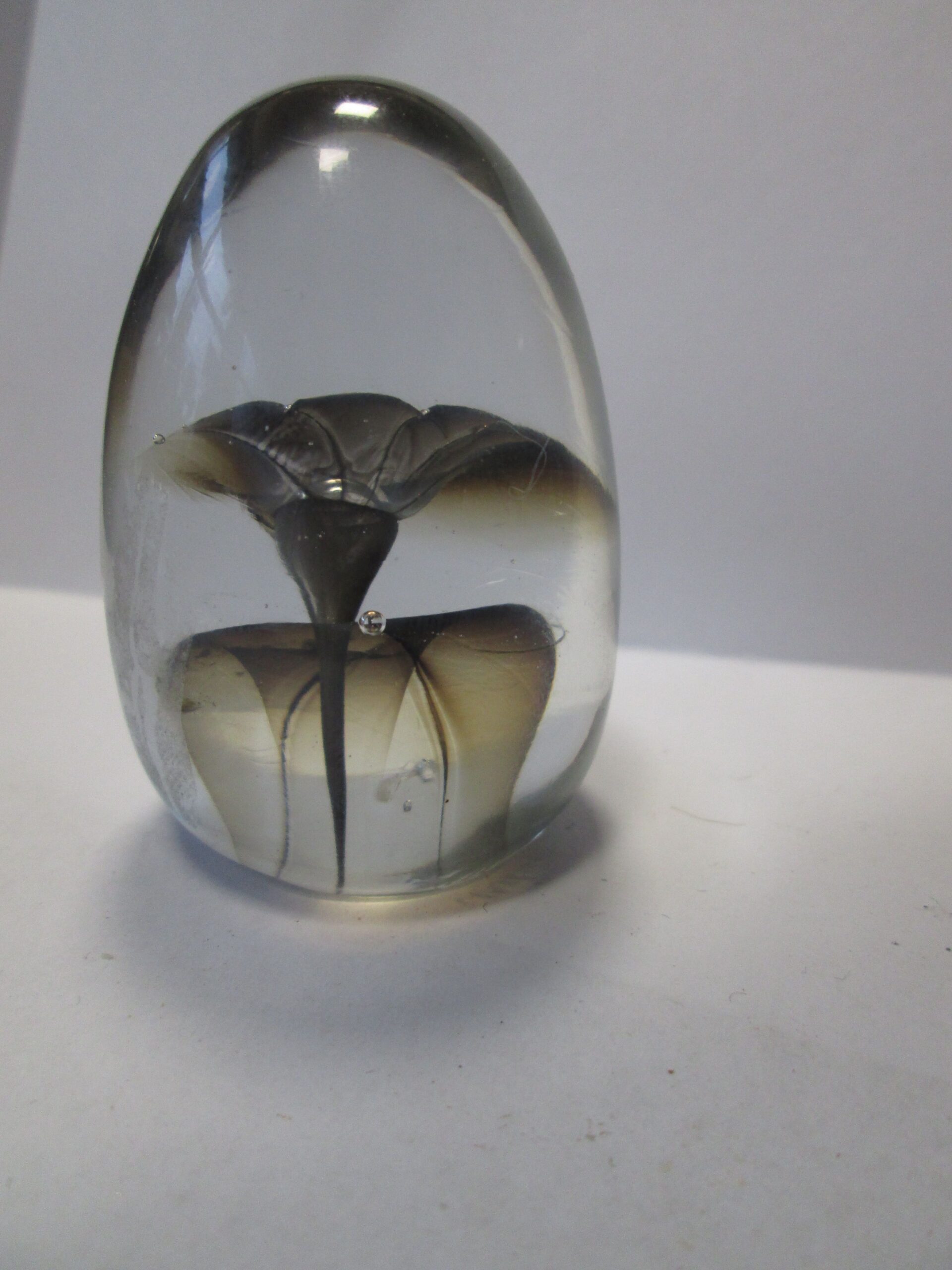 Ciekawy kształtem szklany przycisk .Kształt jajka uciętego w środku podwójny kwiat. Wysokość 6 cm, średnica 4 cm.Stan bardzo dobry. Podpis przy rancie. Atelier Molvar.