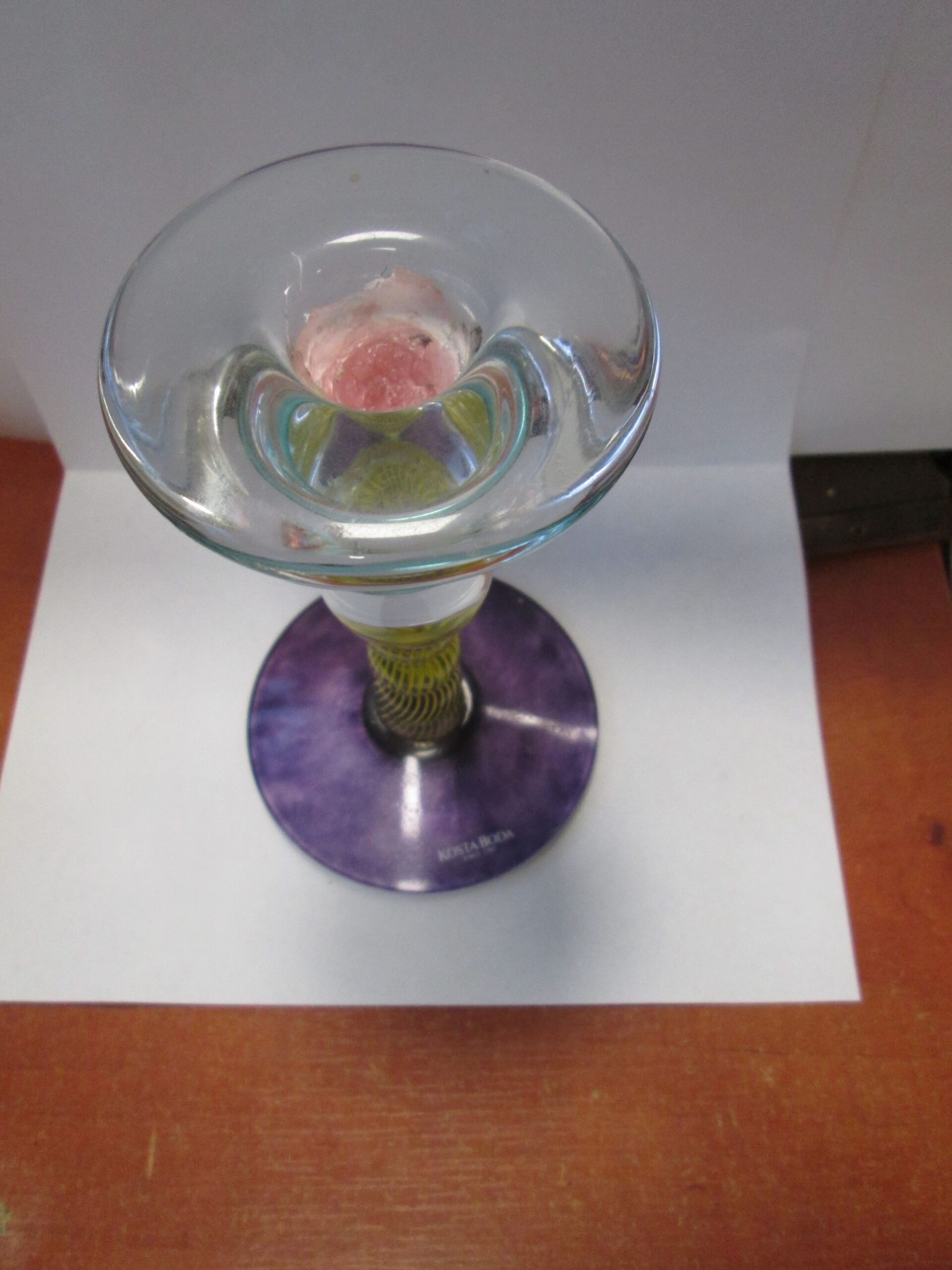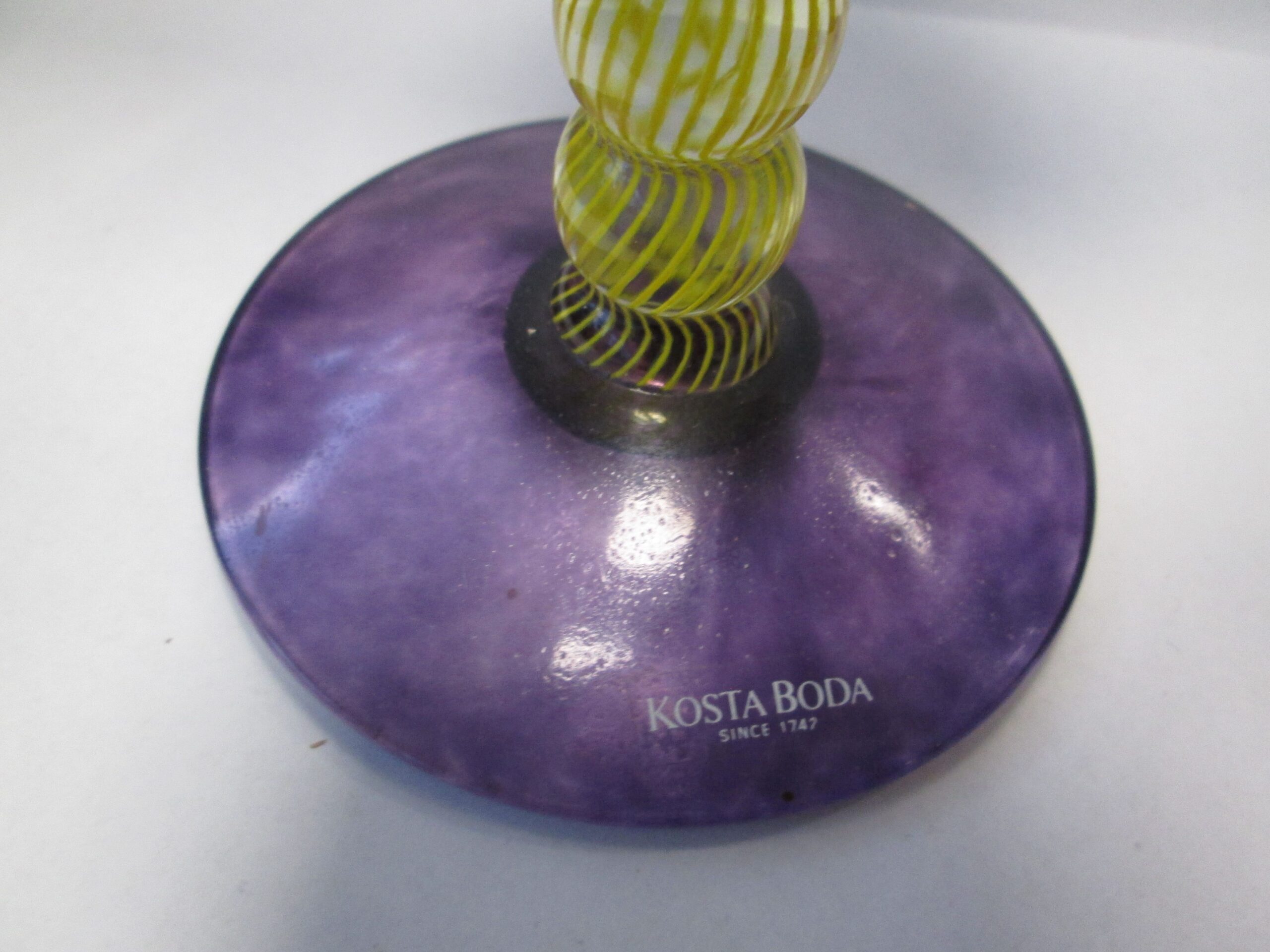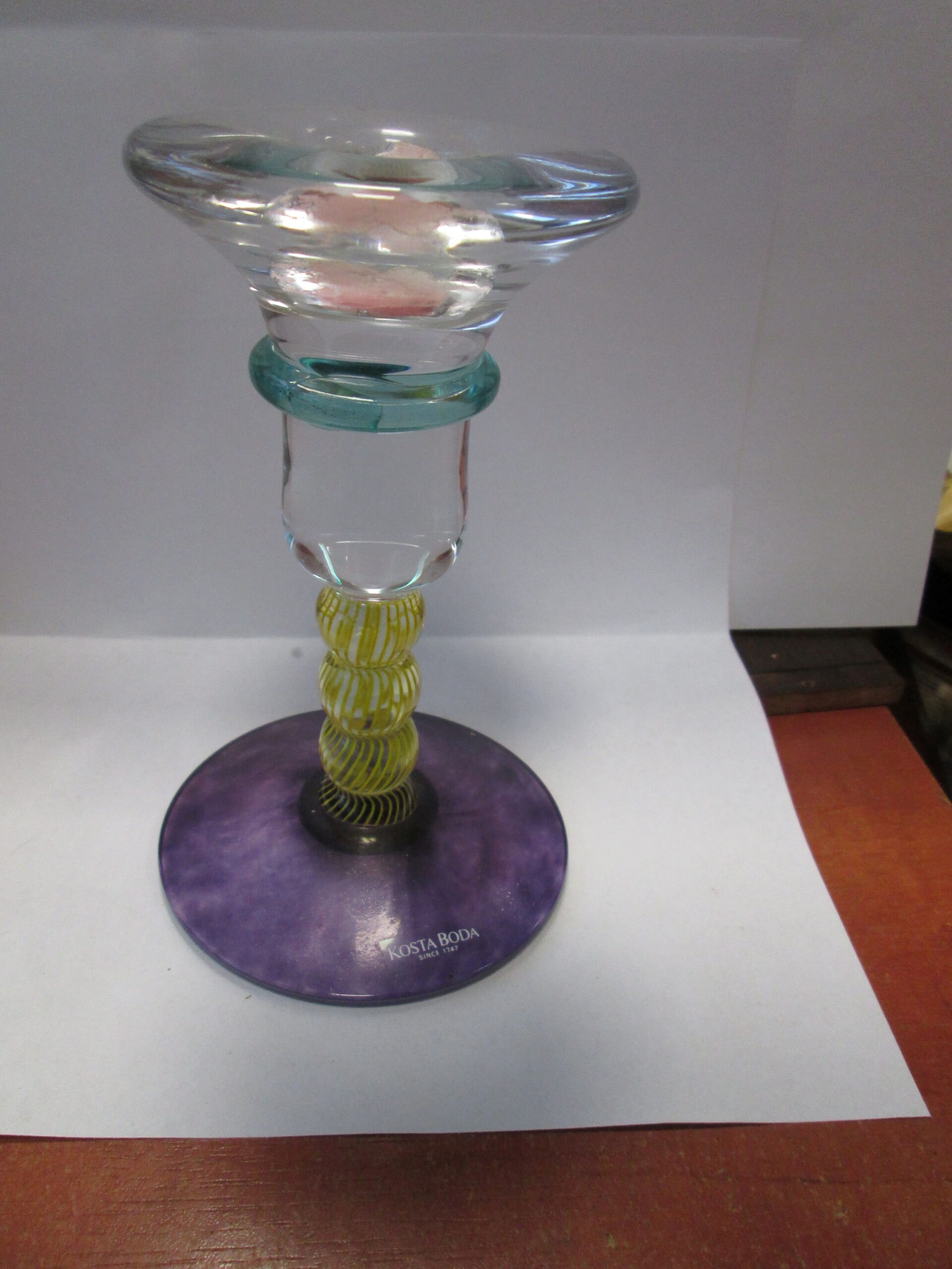 Szklany świecznik ze znanej szwedzkiej manufaktury szkła ,która tworzy ciekawe wielobarwne formy szkła artystycznego i użytkowego. Średnica podstawy świecznika 8.5 cm , wysokość 14.5 cm. Oryginalna naklejka na stopie firmy. Stan bardzo dobry.