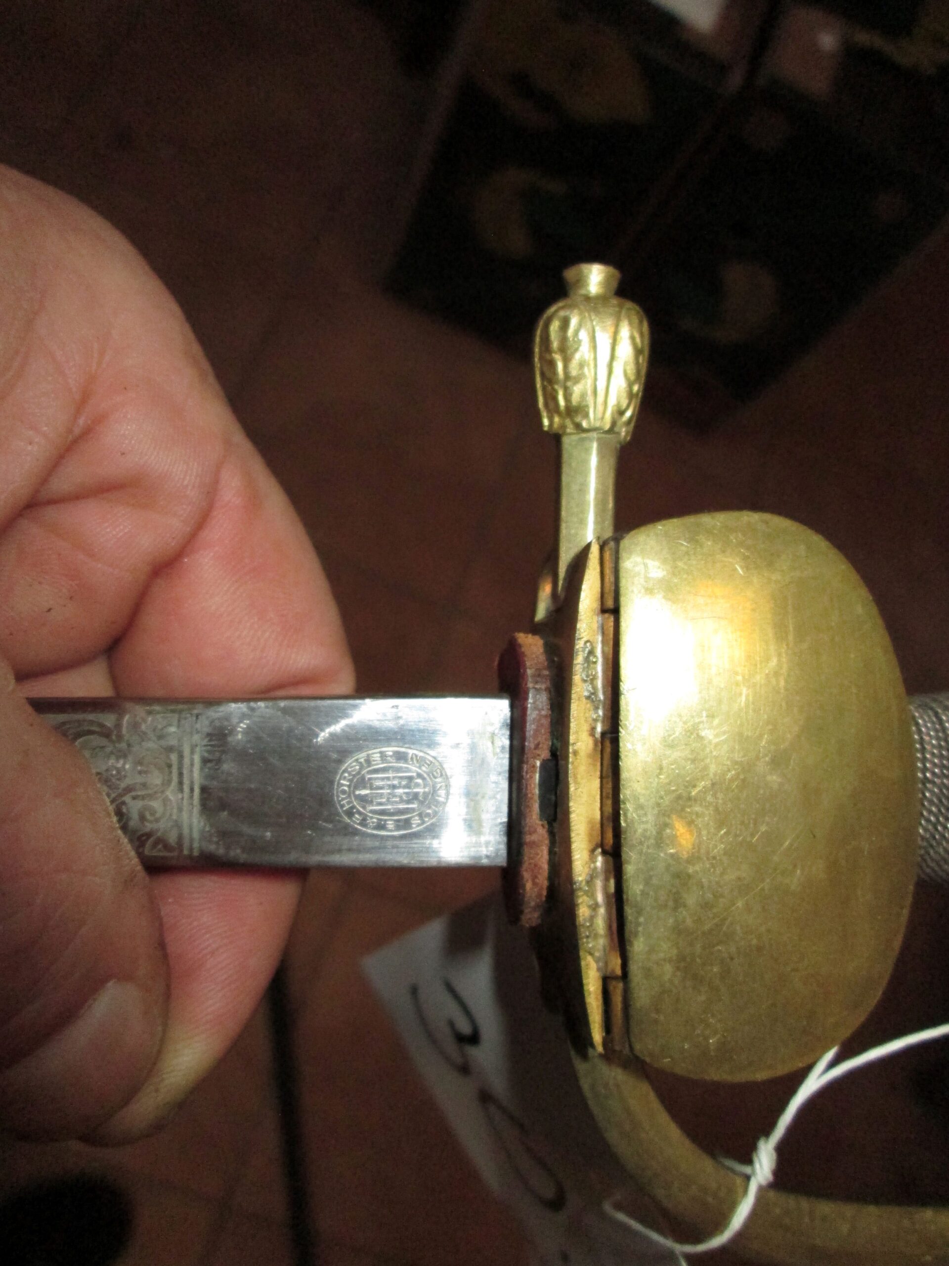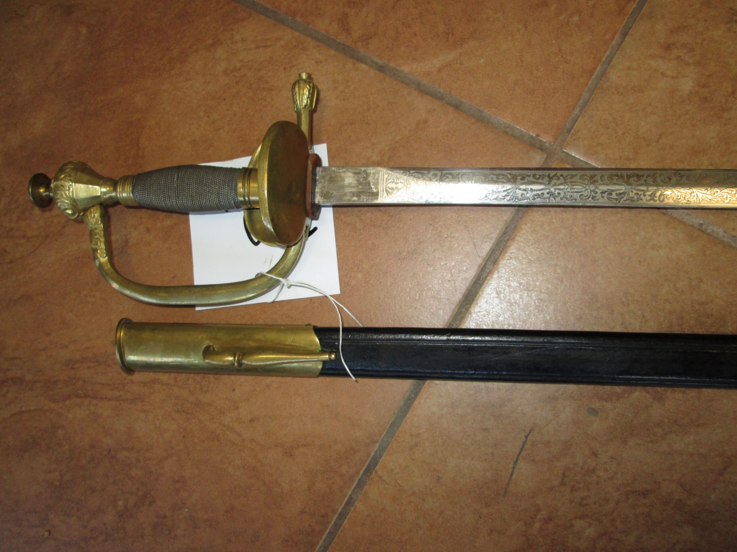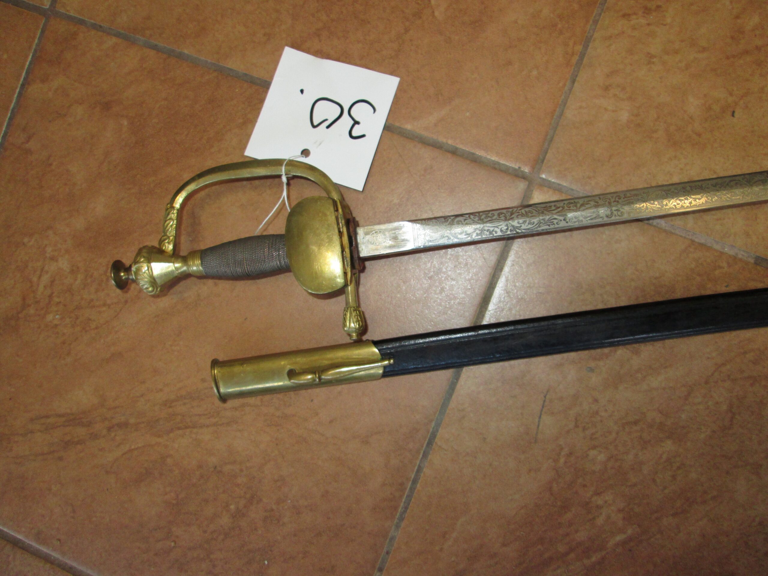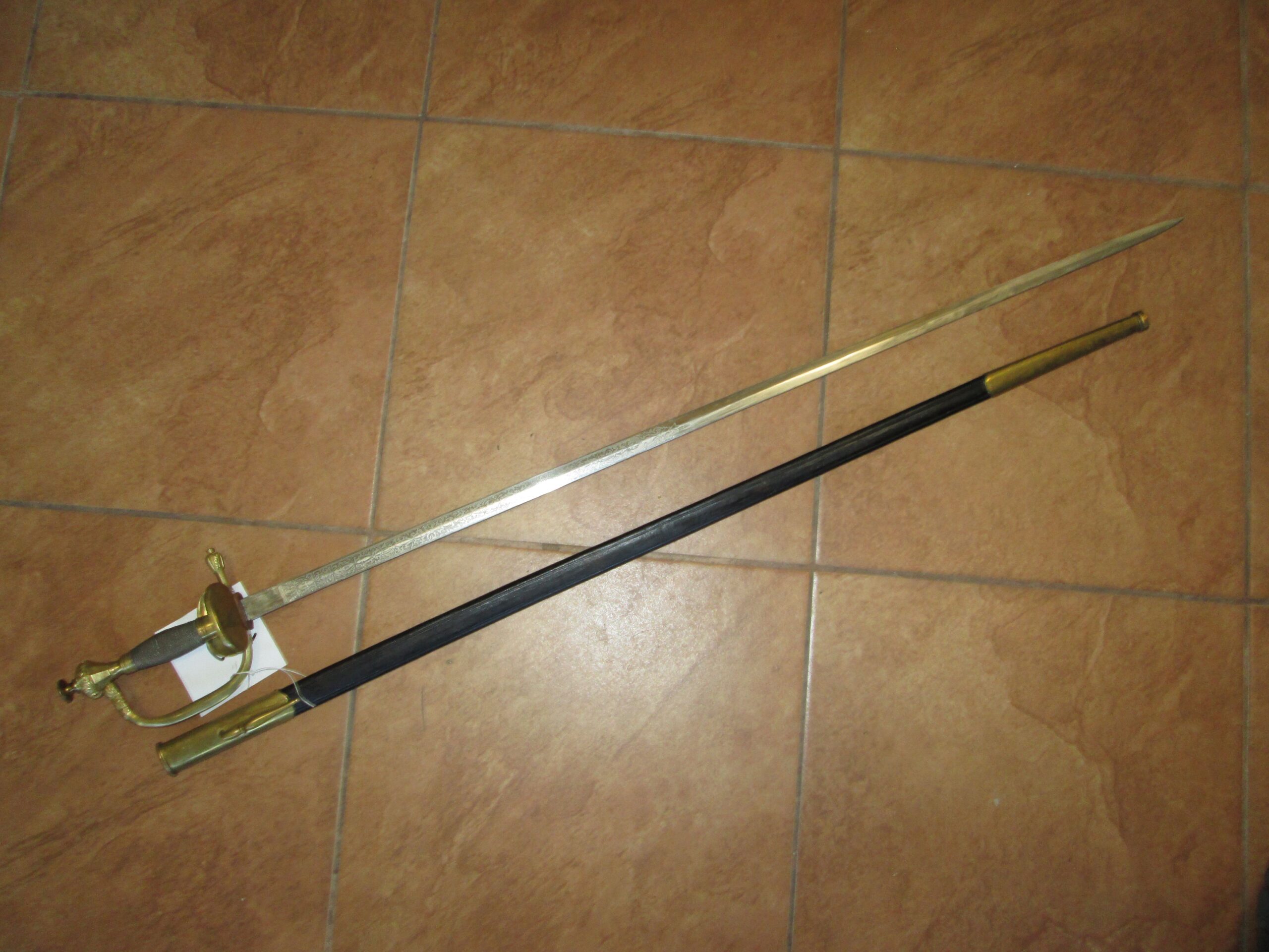 Piękna szpada oficera pruskiej armii. Wzór 1889 . Wykonana w Solingen. Sygnowana. Ostrze trawione z obu stron. Długość w pochwie 97 cm , szpady 94 cm, ostrza 80 cm. Pochwa skórzana obita mosiądzem. Jedna osłona rękojeści ruchoma na zawiasie.Stan bardzo dobry.
