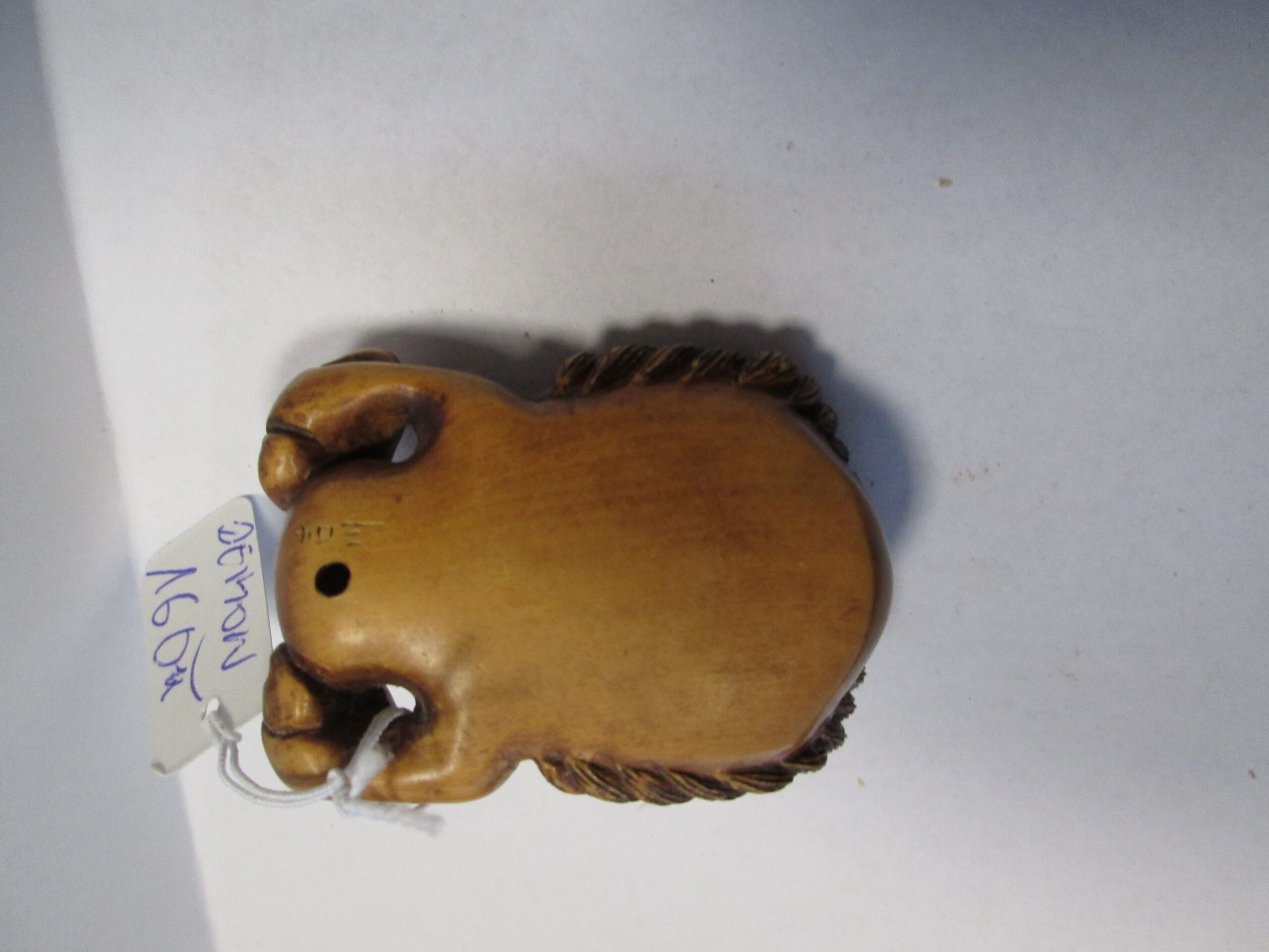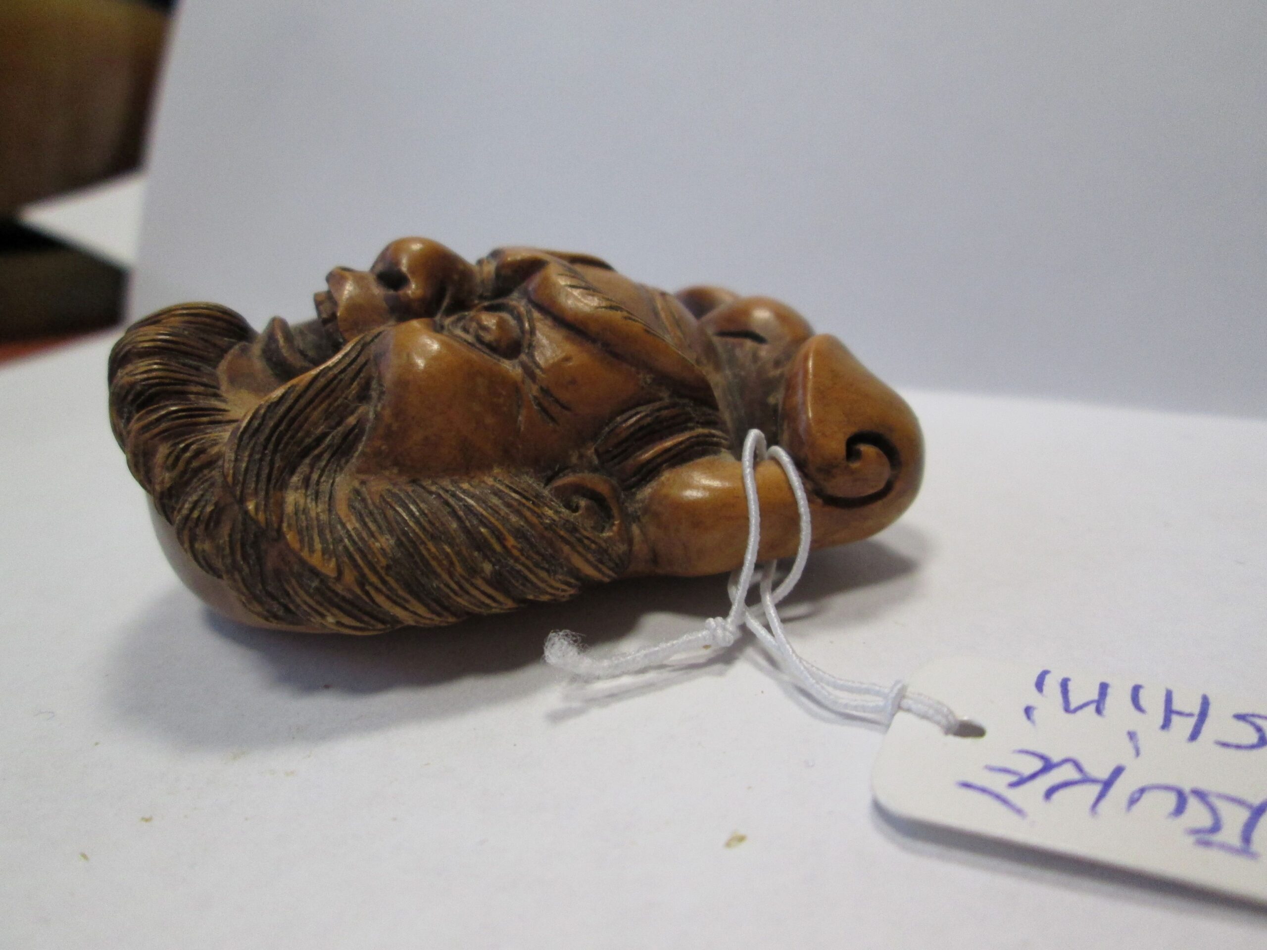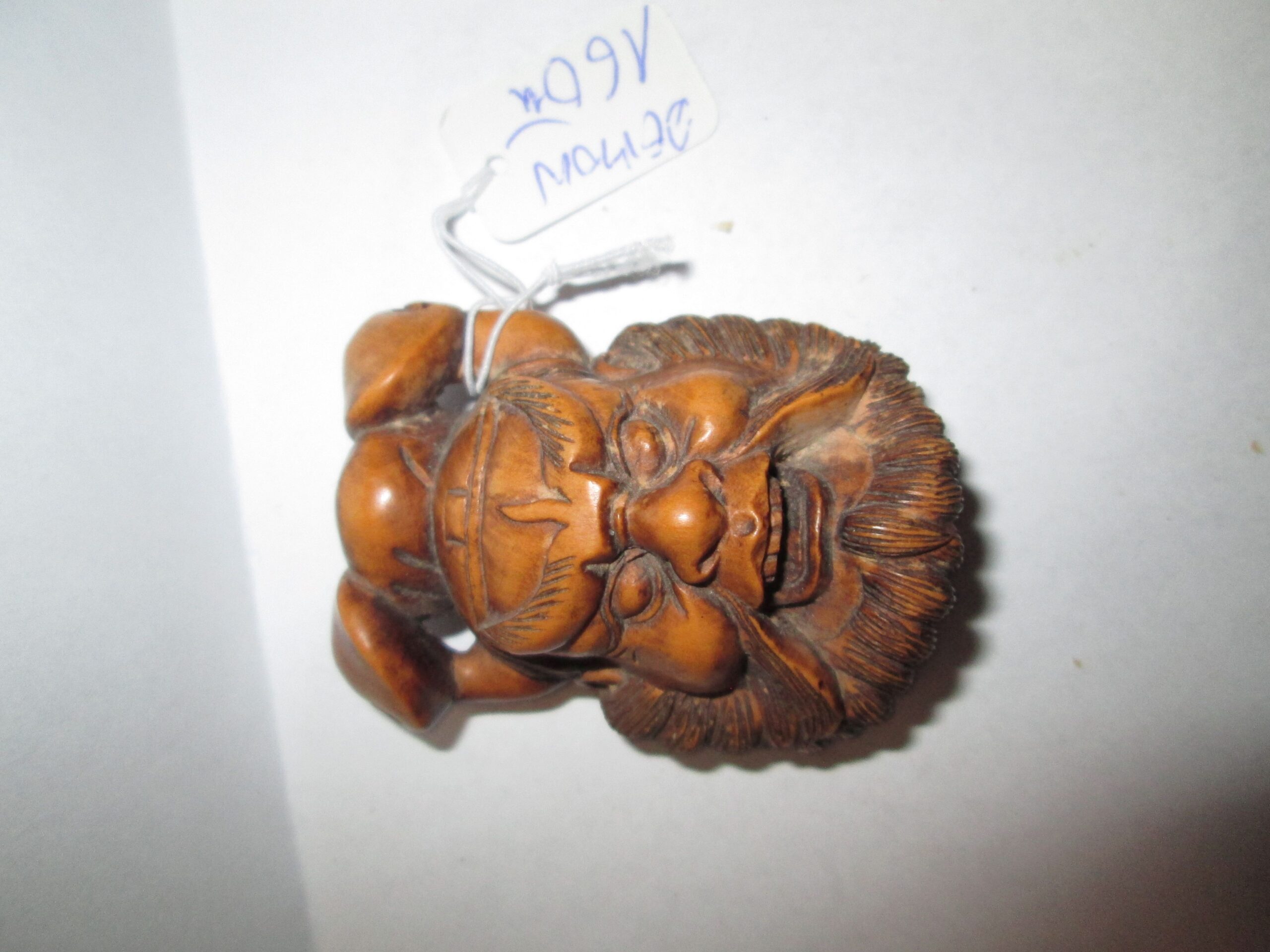 Rzeźba głowy Demona Beshimi. Sztuka Netsuke. Wykonana z drewna egzotycznego z pięknymi detalami (wąsy,mimika,oczy,zęby). Wysokość 5 cm , szerokość 3.5 cm. Stan bardzo dobry.