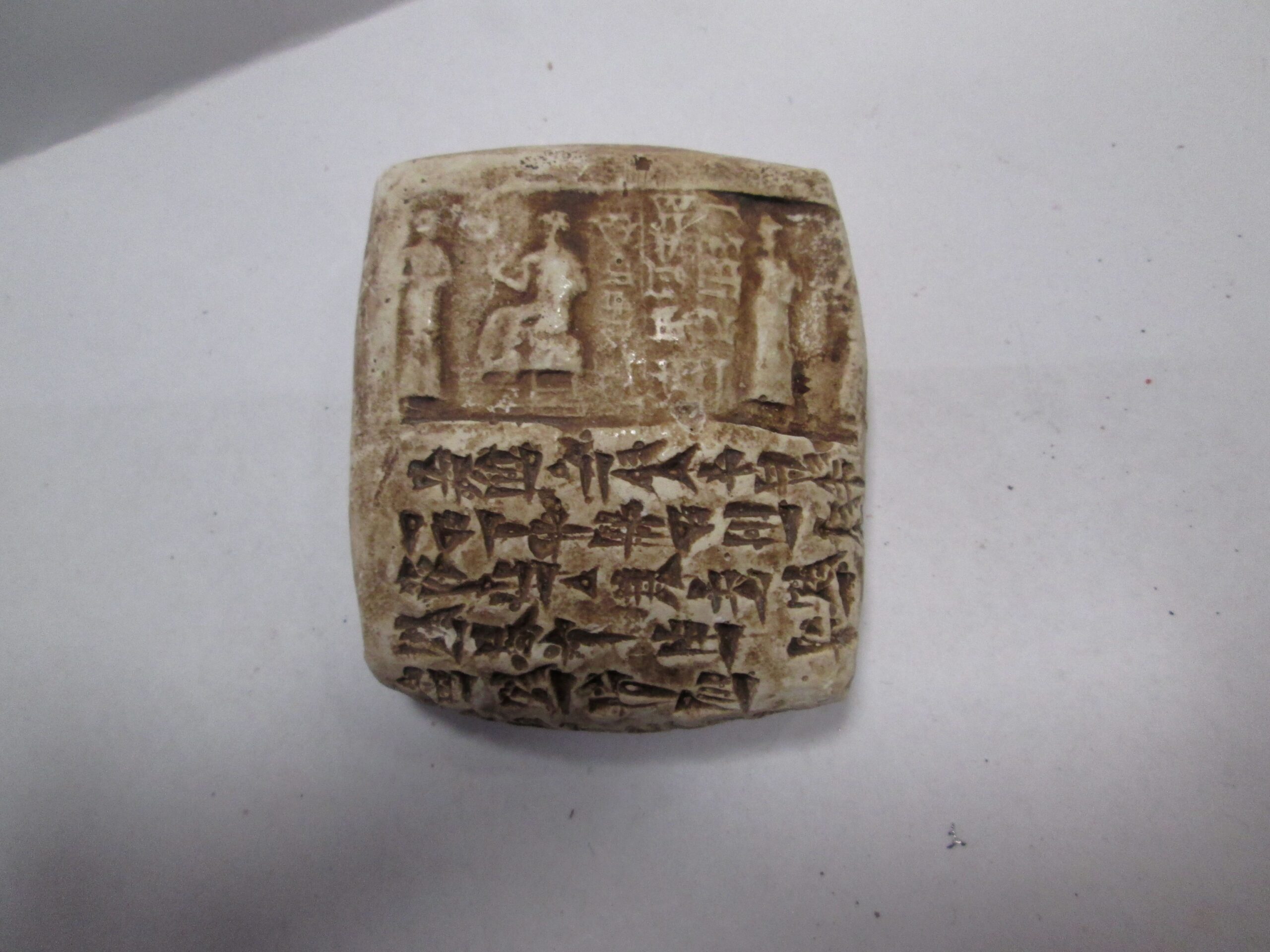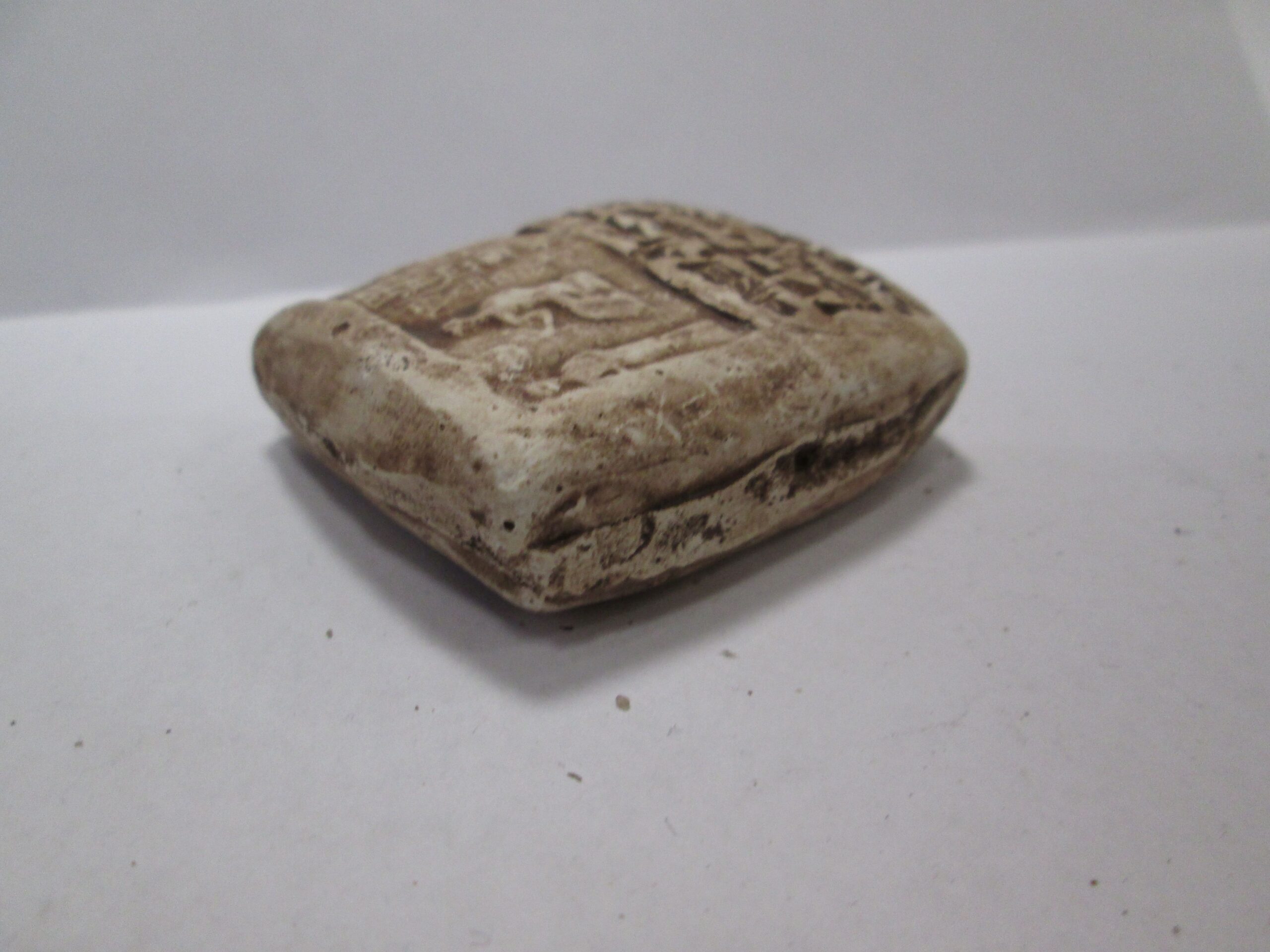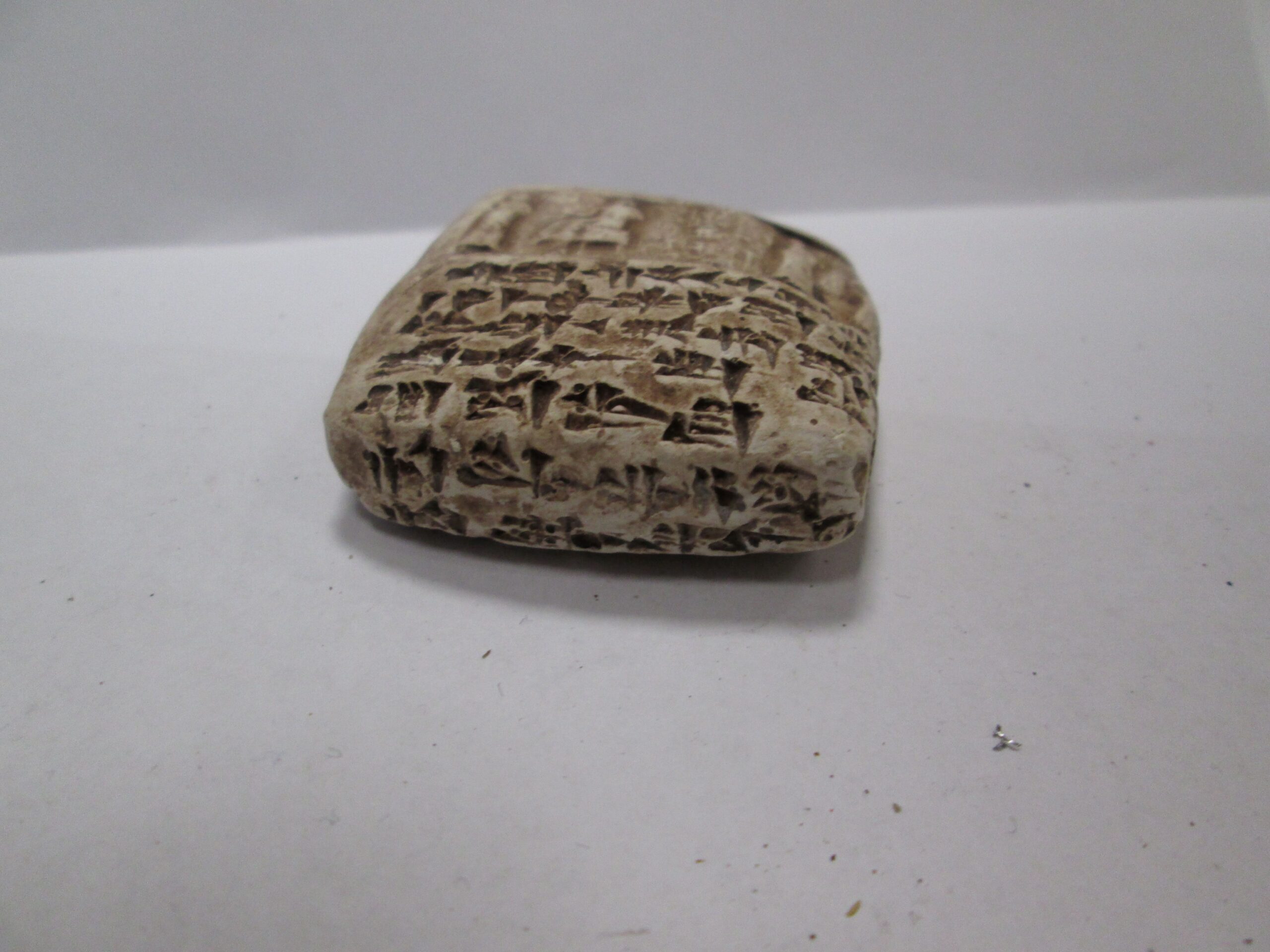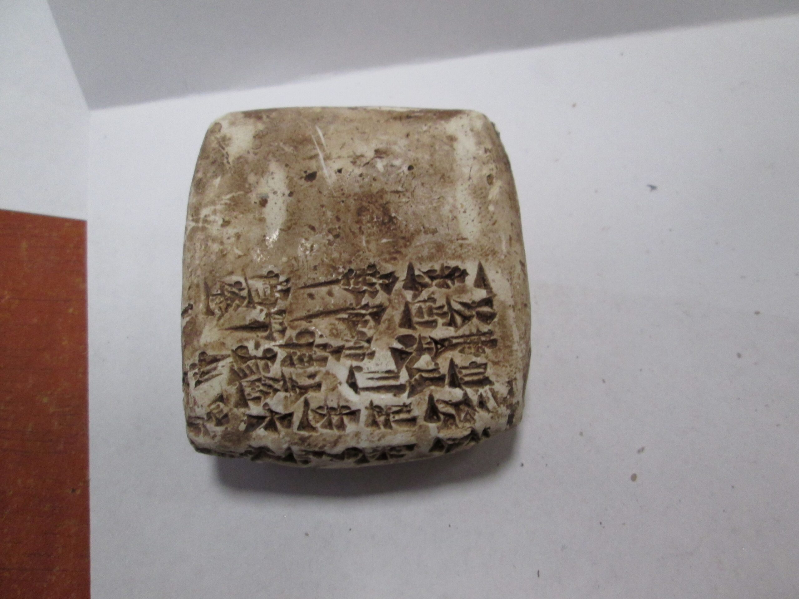 Tabliczka z pismem klinowym (replika ze skały wapiennej). Język ugarycki należał do wymarłego języka z rejonów Syrii. Alfabet tego języka zawiera 30 odrębnych liter. Ciekawostka dla archeologów i znawców sztuki półwyspu arabskiego. Wymiary to 5*5.5 cm ,grubość ok 2 cm. Ciekawostka na naszym rynku antykwarycznym.