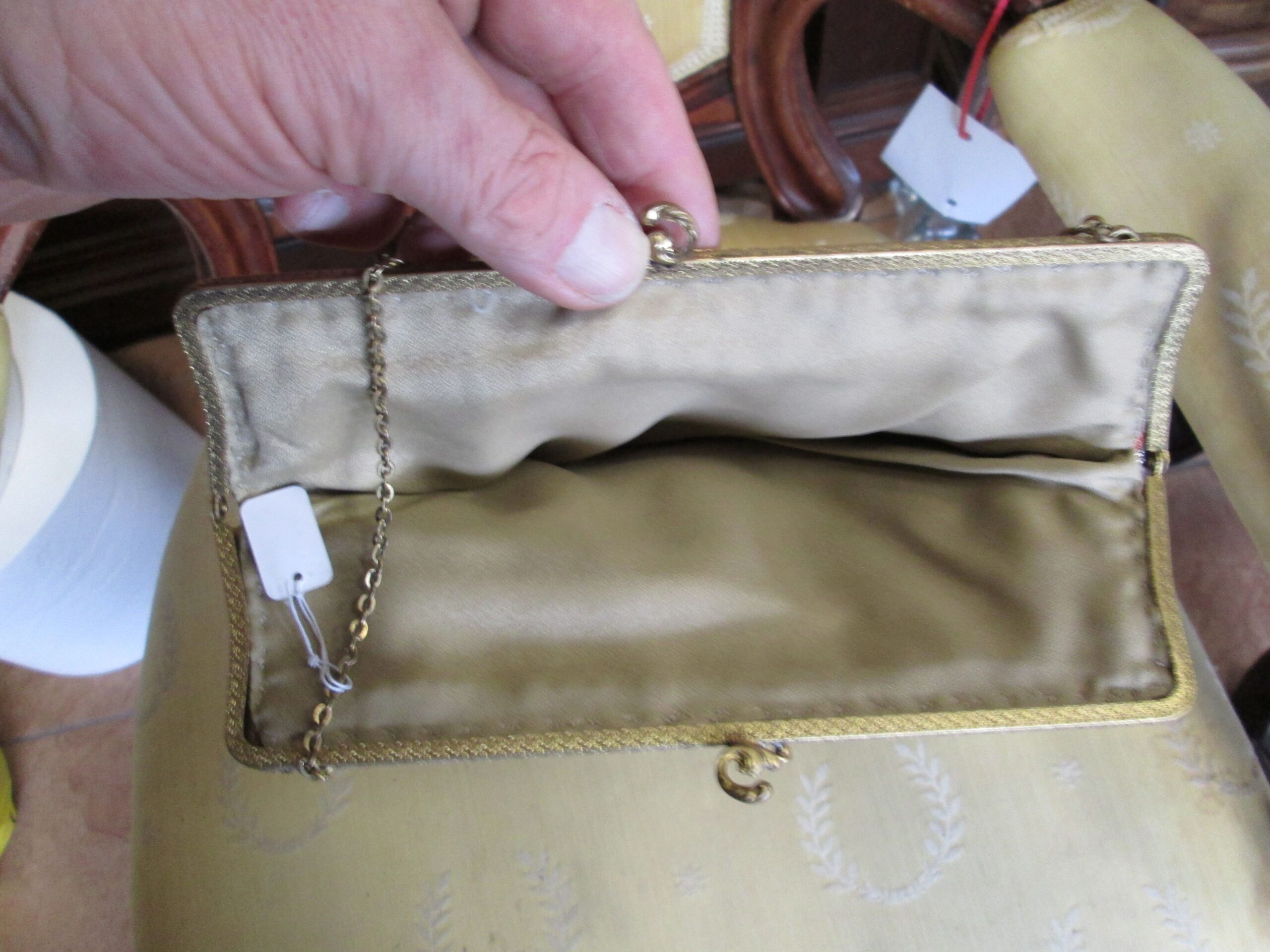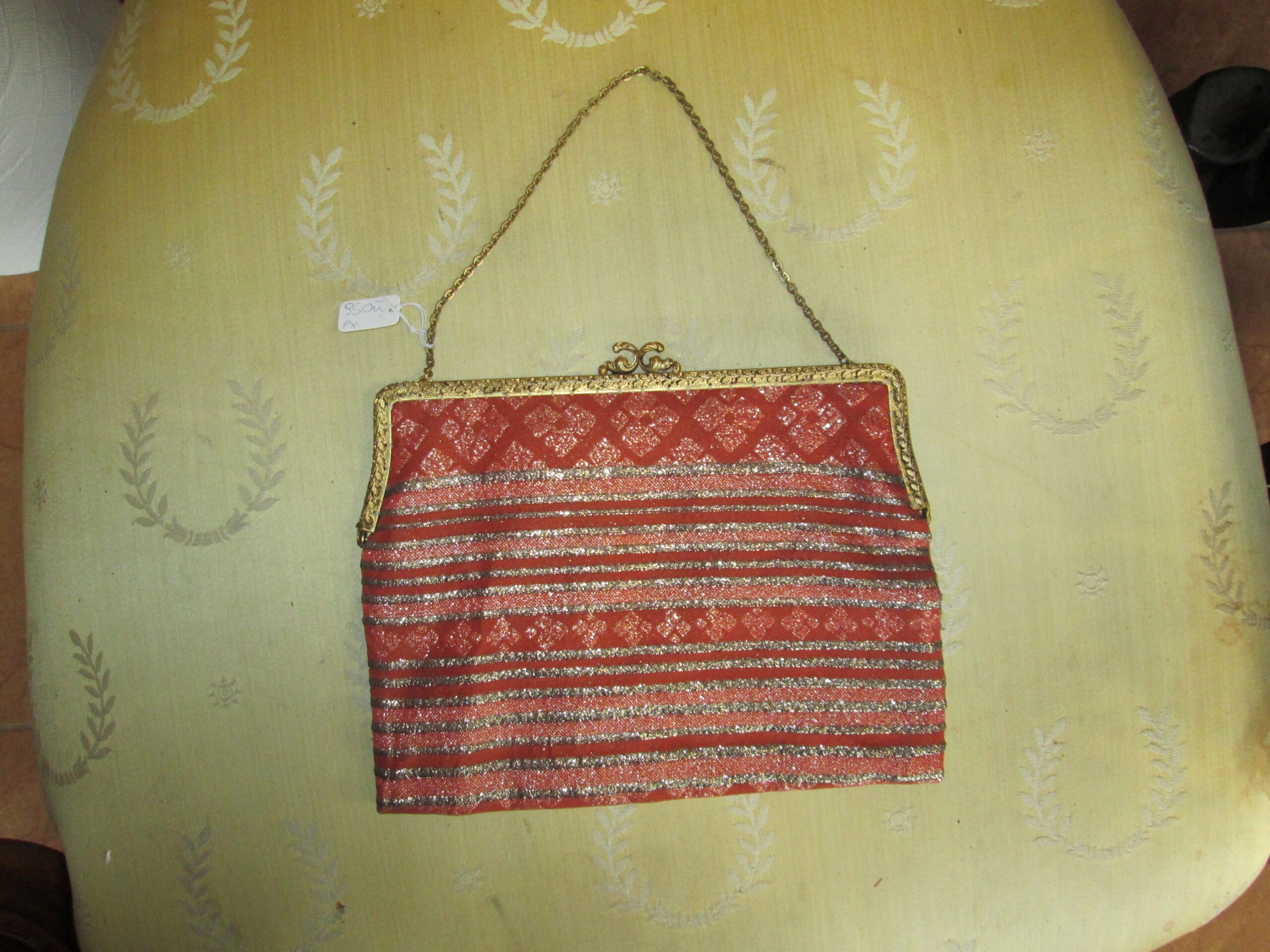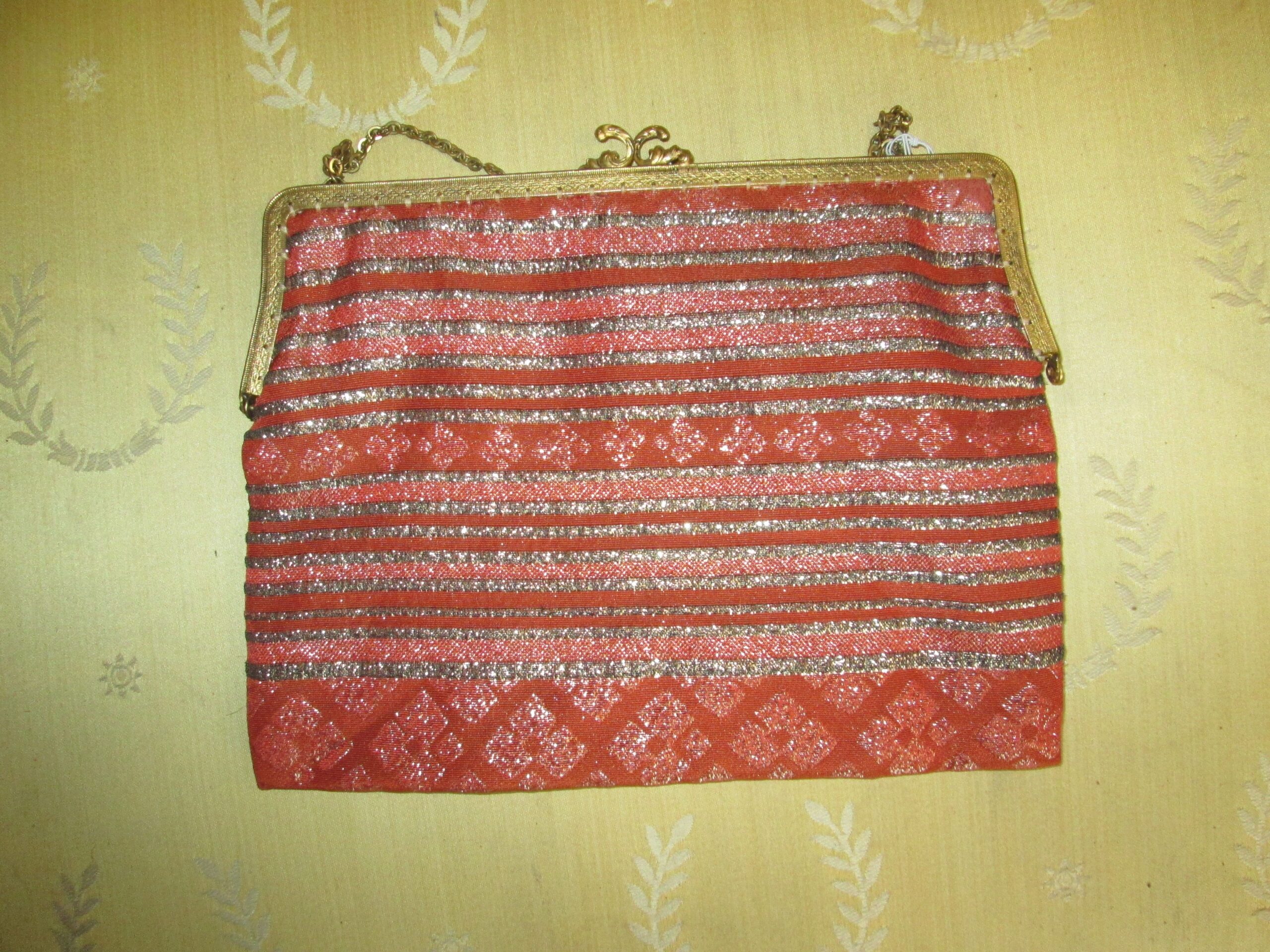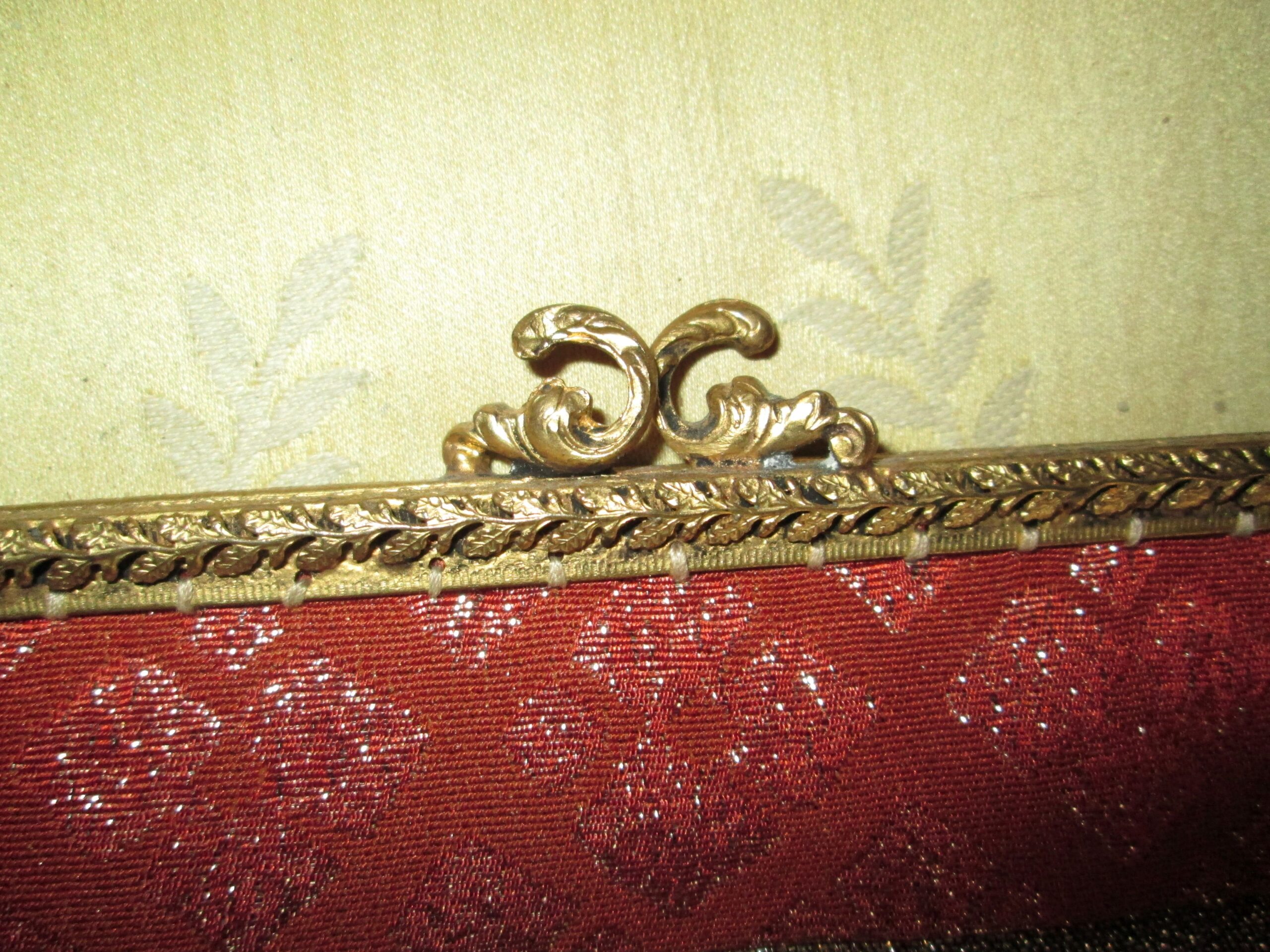 Piękna torebka z epoki art deko , wykonana z materiału plisowanego srebrnymi nićmi. Zapięcie wykonane z mosiądzu polerowanego na złoto. Zapięcie sprawne działające wykończone ciekawym stylowym reliefem. Wewnątrz podszewka z innego materiału w bardzo dobrym stanie. Szerokość 22 cm , wysokość 17 cm. Stan bardzo dobry.